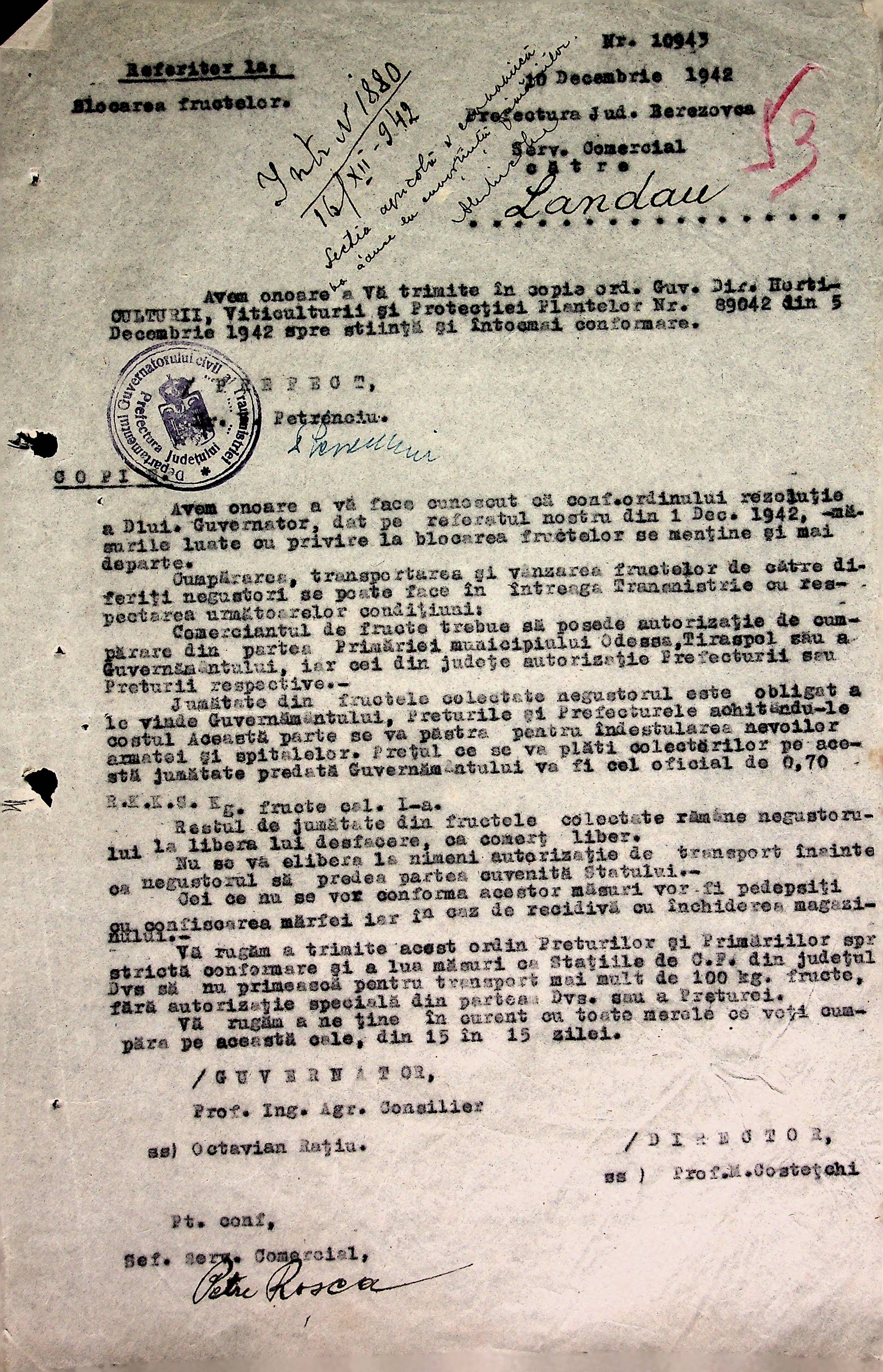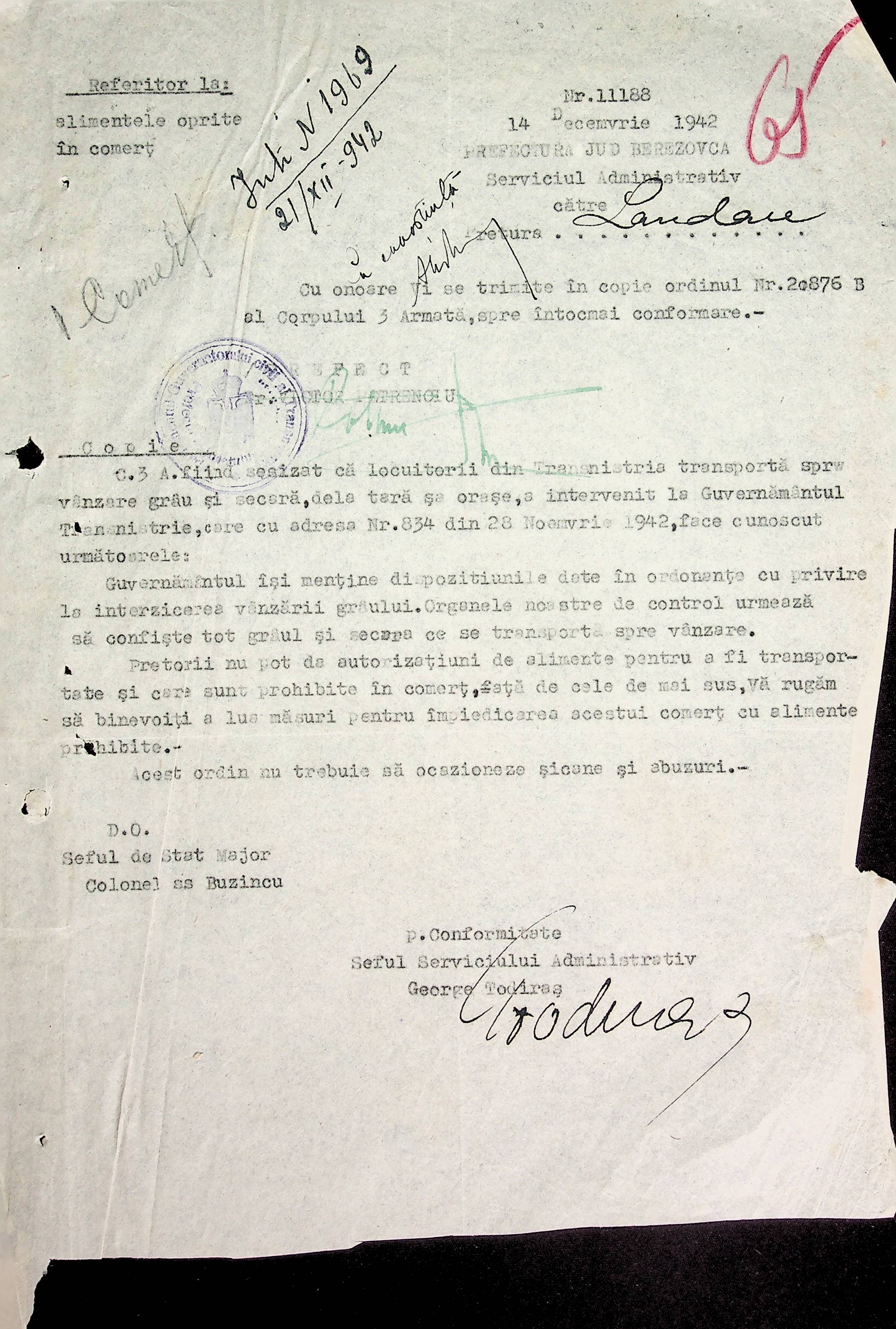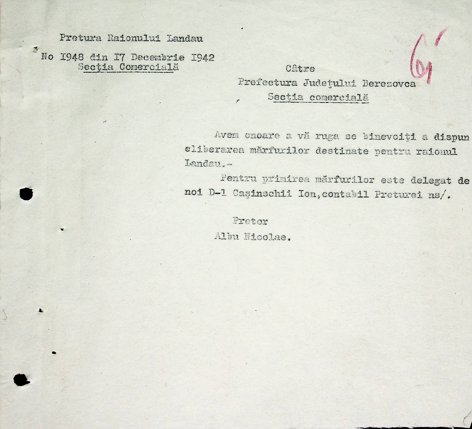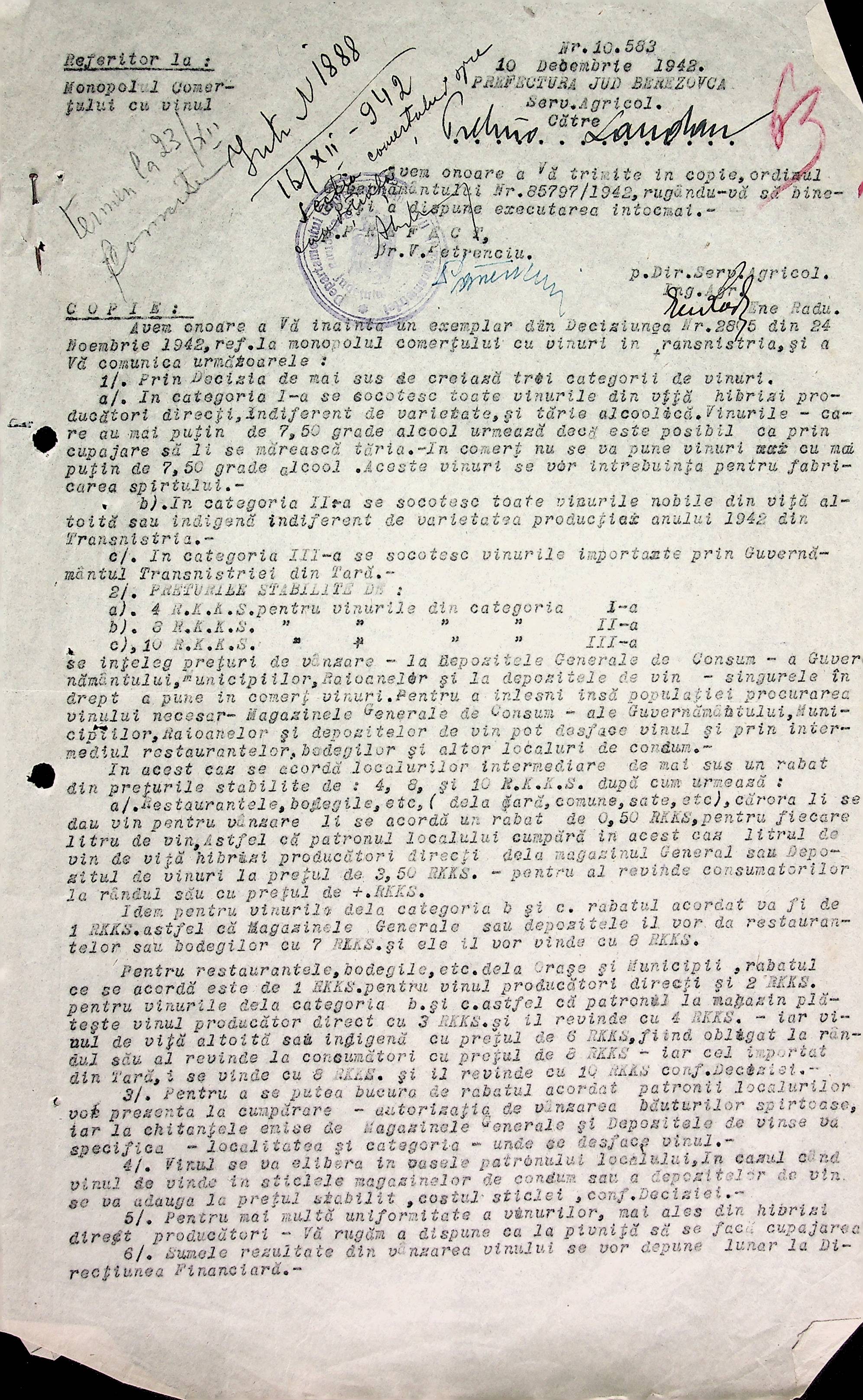 • • • • Справа № 66 Копії інструкцій, накази та постанови цивільного губернатора Трансністрії, листування з комерційним відділом префектури Березівського повіту про організацію торгівлі в районі, списки необхідних продуктів для забезпечення Ландауського району