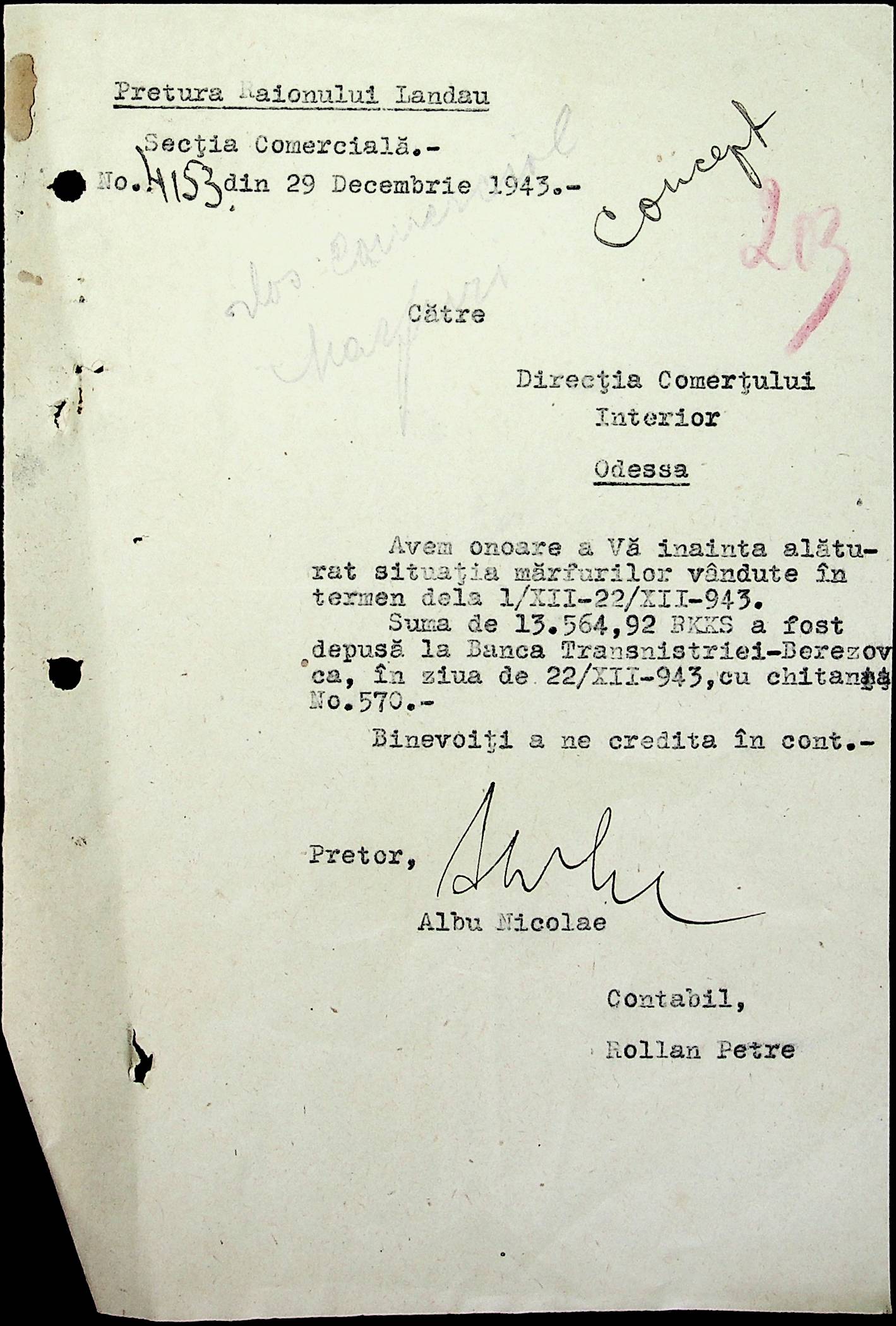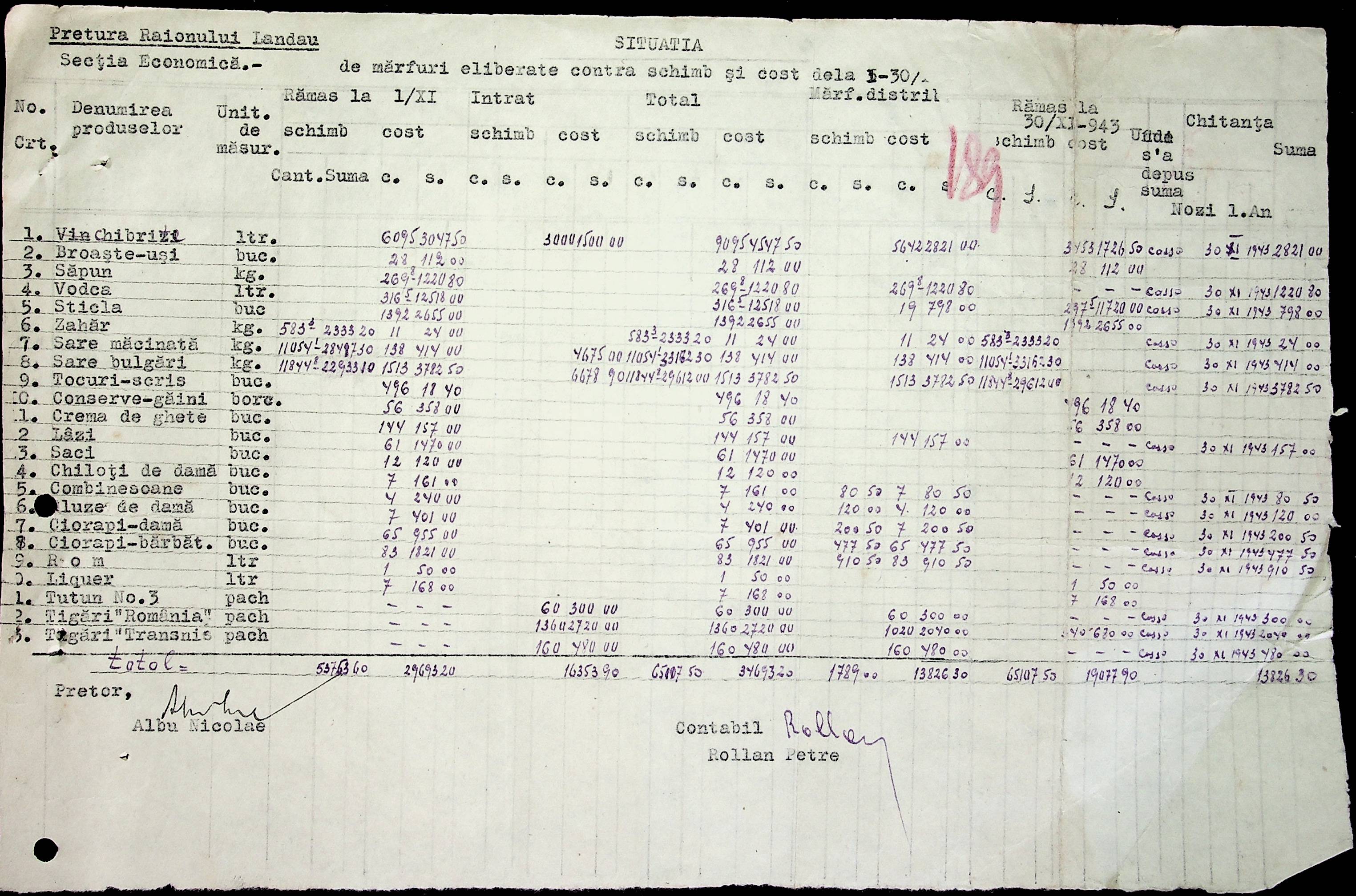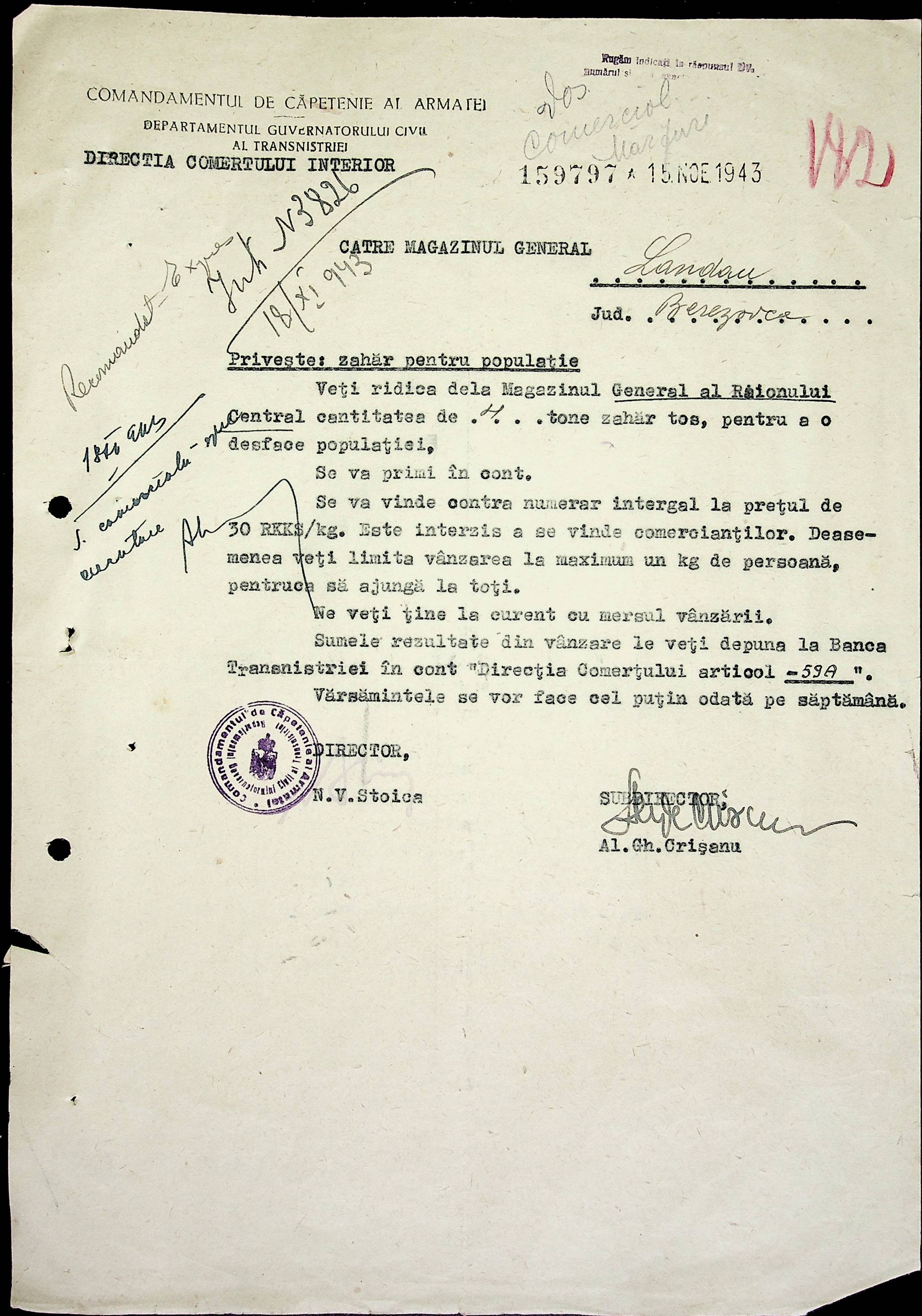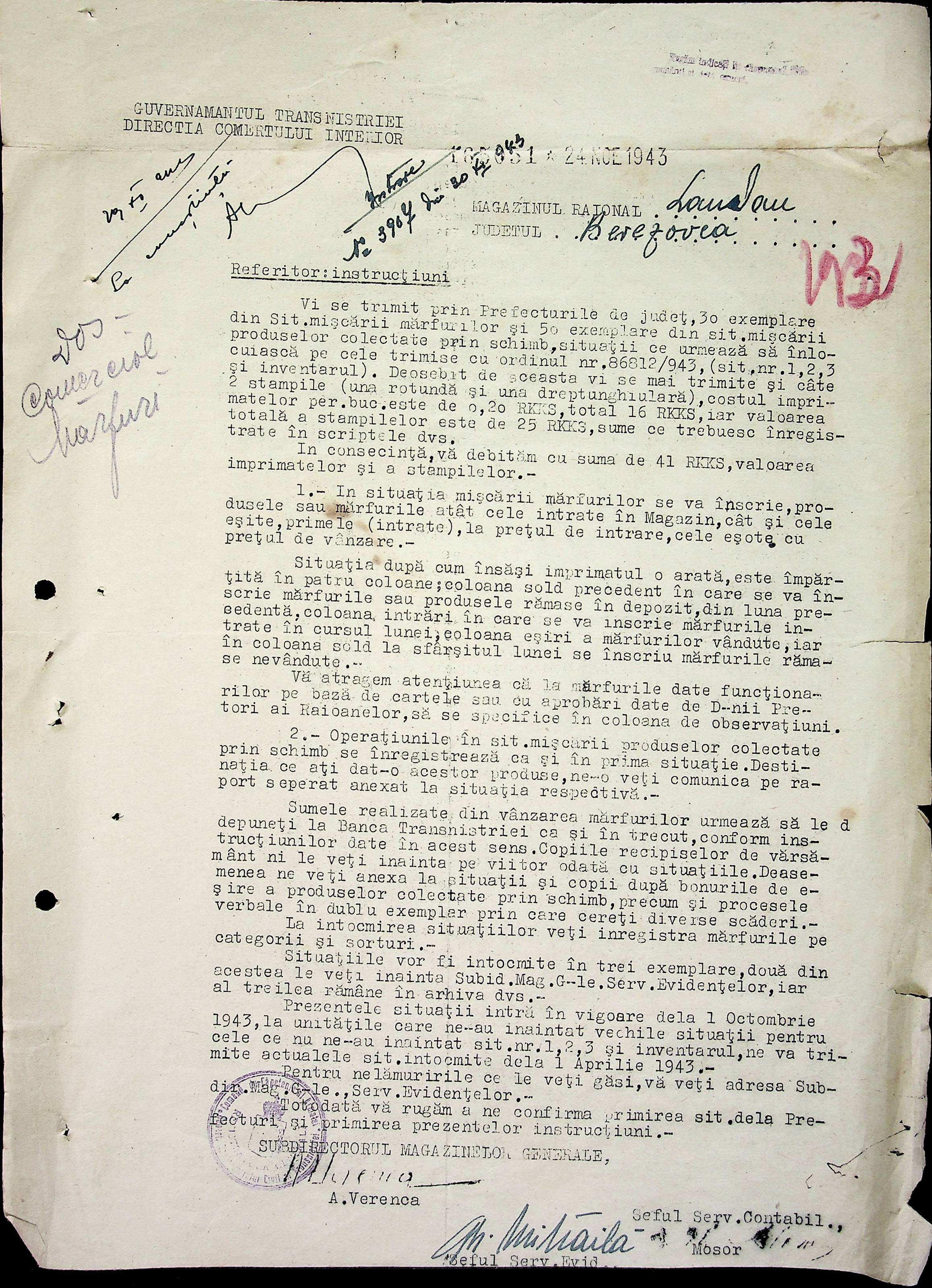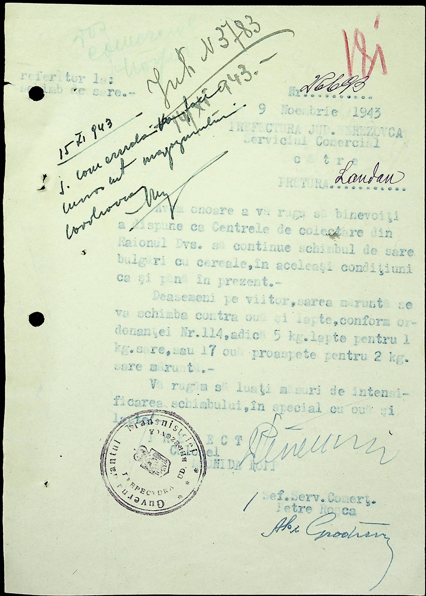 • • • • Справа № 69 Листування з комерційним відділом префектури Березівського повіту про видачу солі службовцям, продаж тютюну і цигарок в районному магазині; про перерахування до держбанку Трансністрії інкасованих коштів за продані товари. Список службовців Ландауської претури