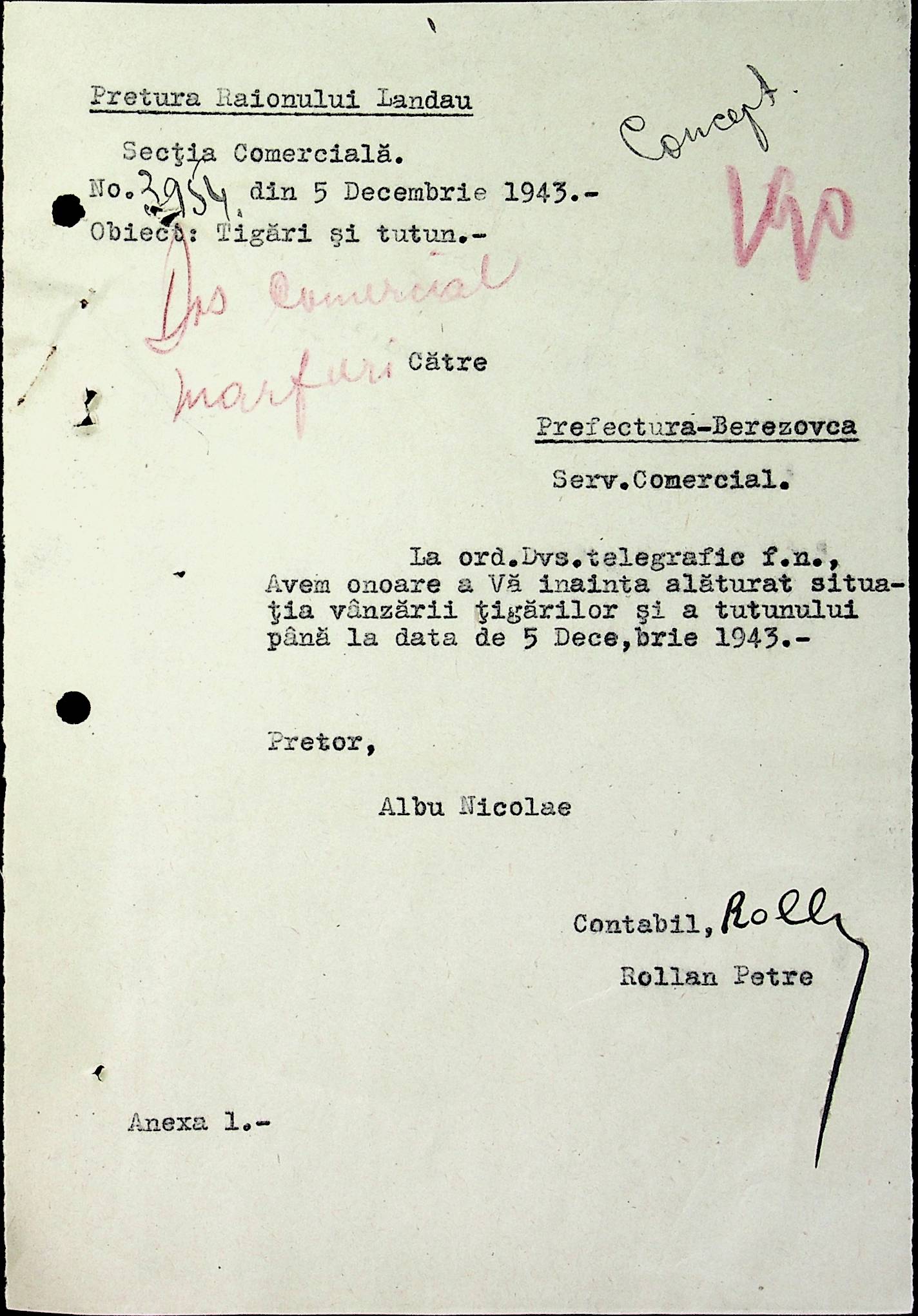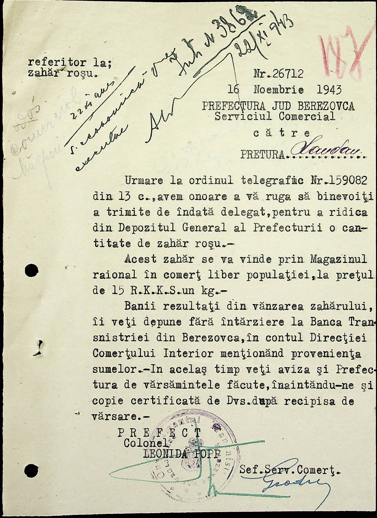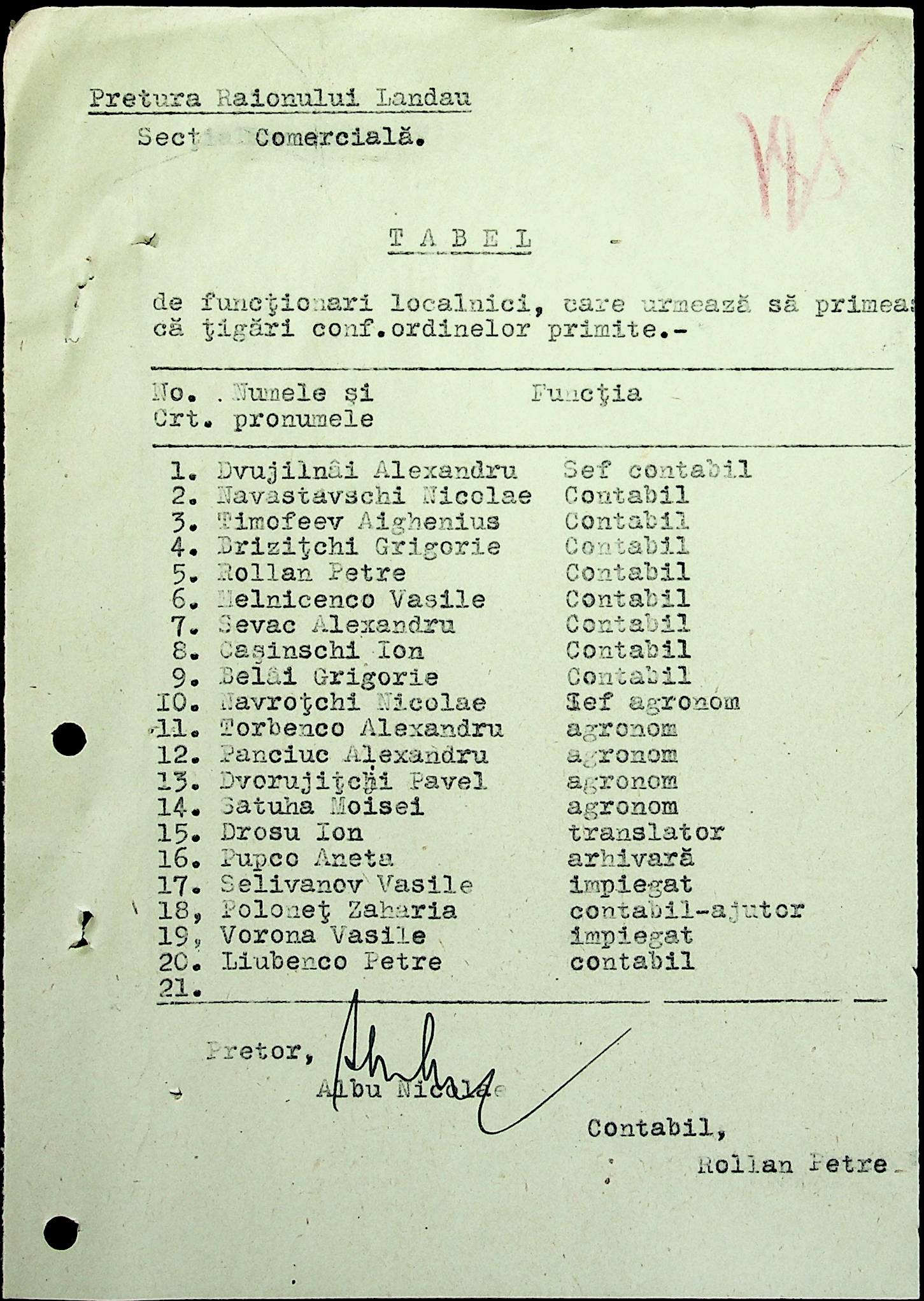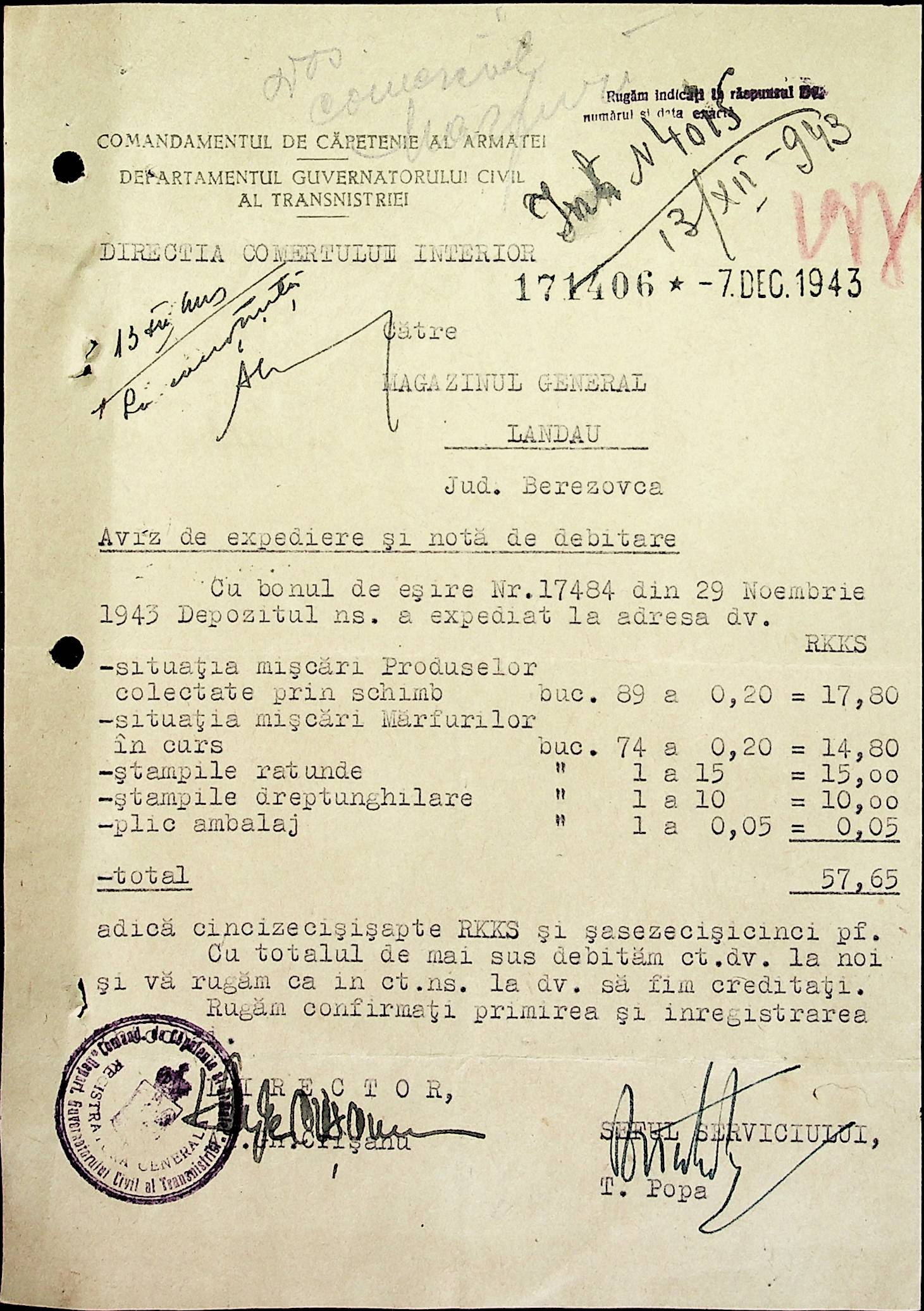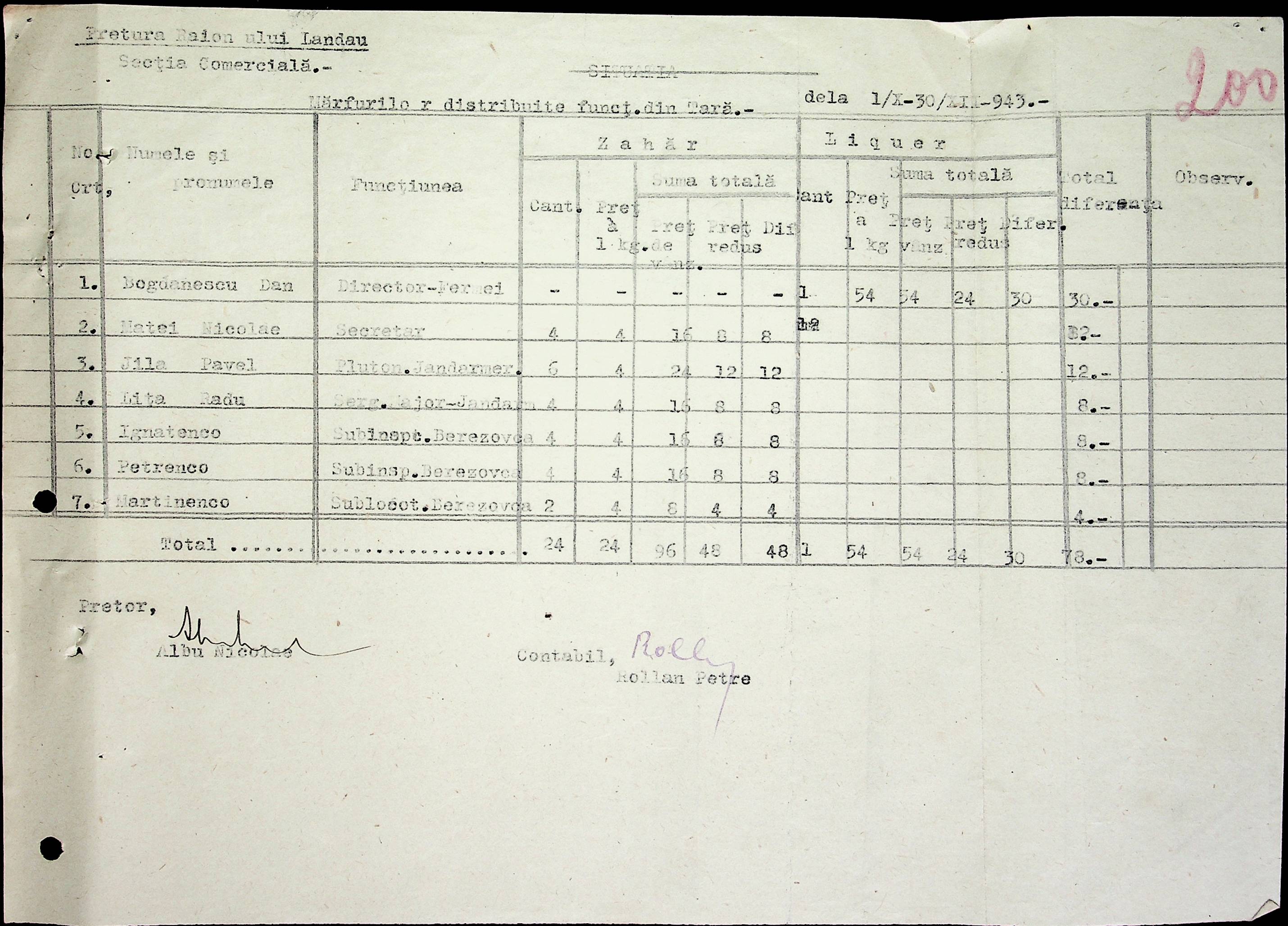 • • • • Справа № 69 Листування з комерційним відділом префектури Березівського повіту про видачу солі службовцям, продаж тютюну і цигарок в районному магазині; про перерахування до держбанку Трансністрії інкасованих коштів за продані товари. Список службовців Ландауської претури