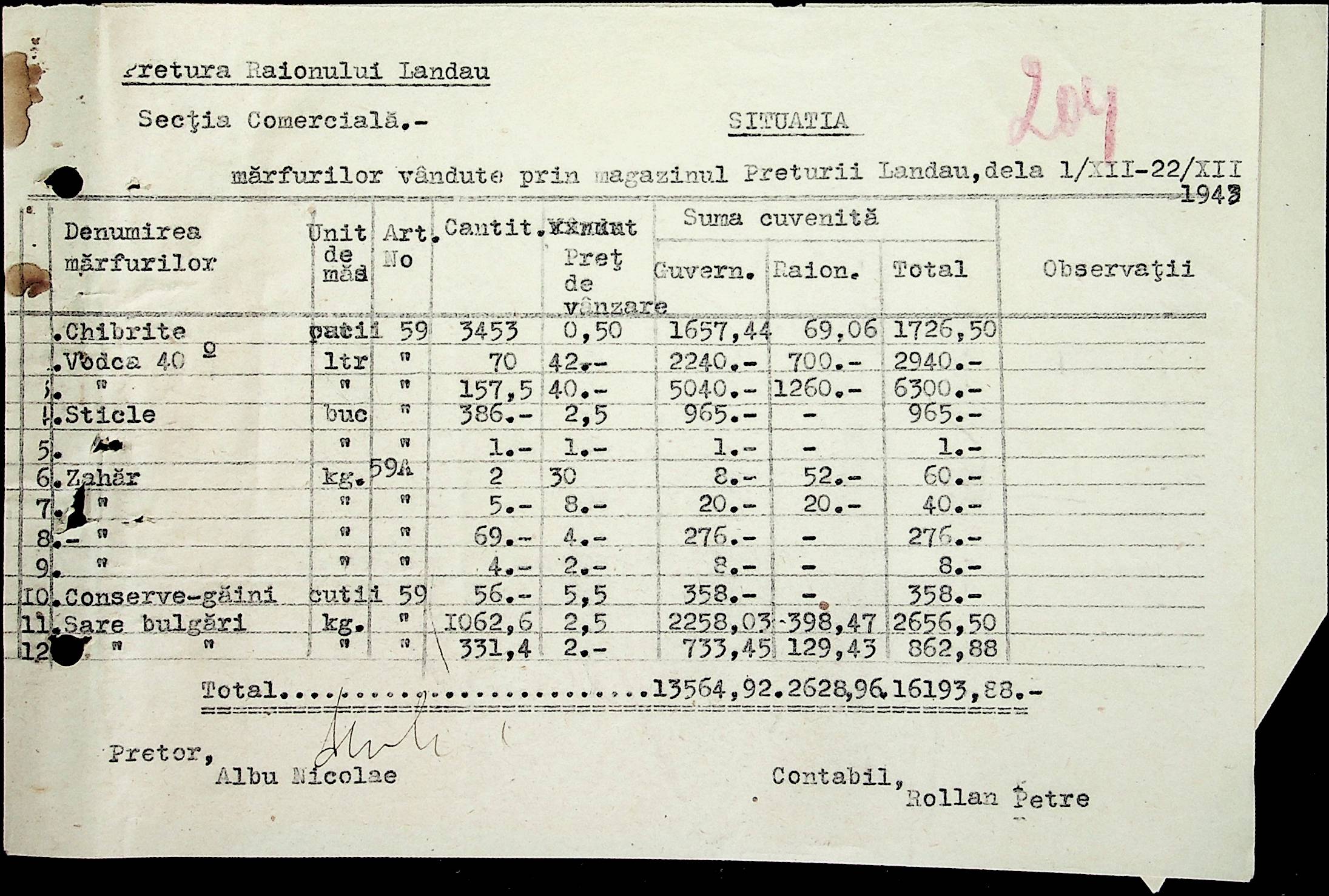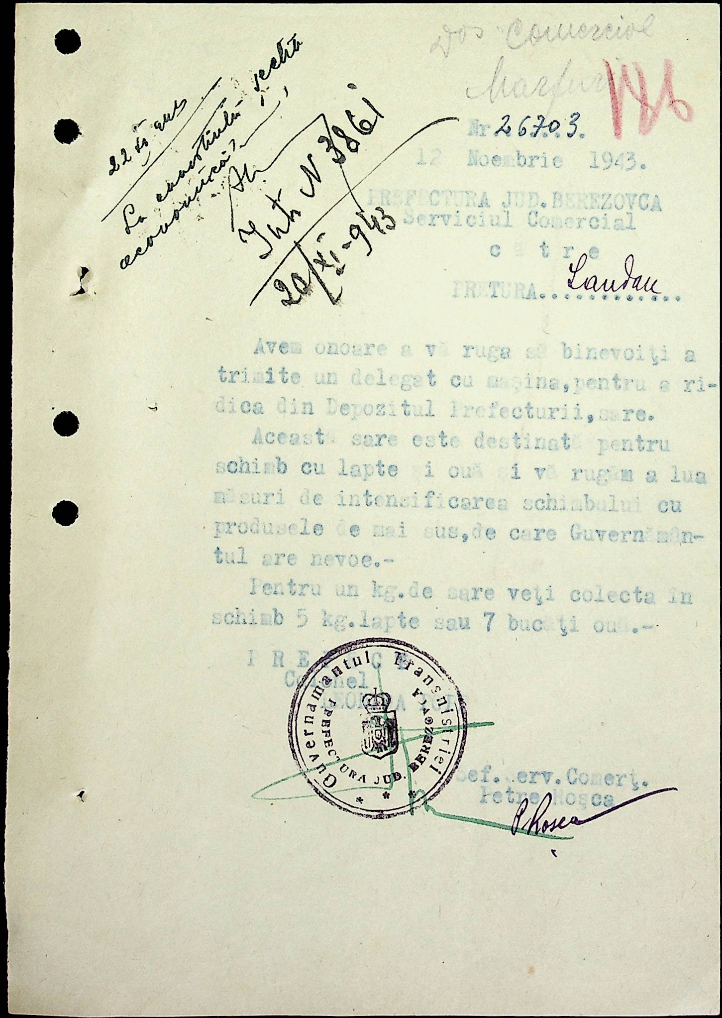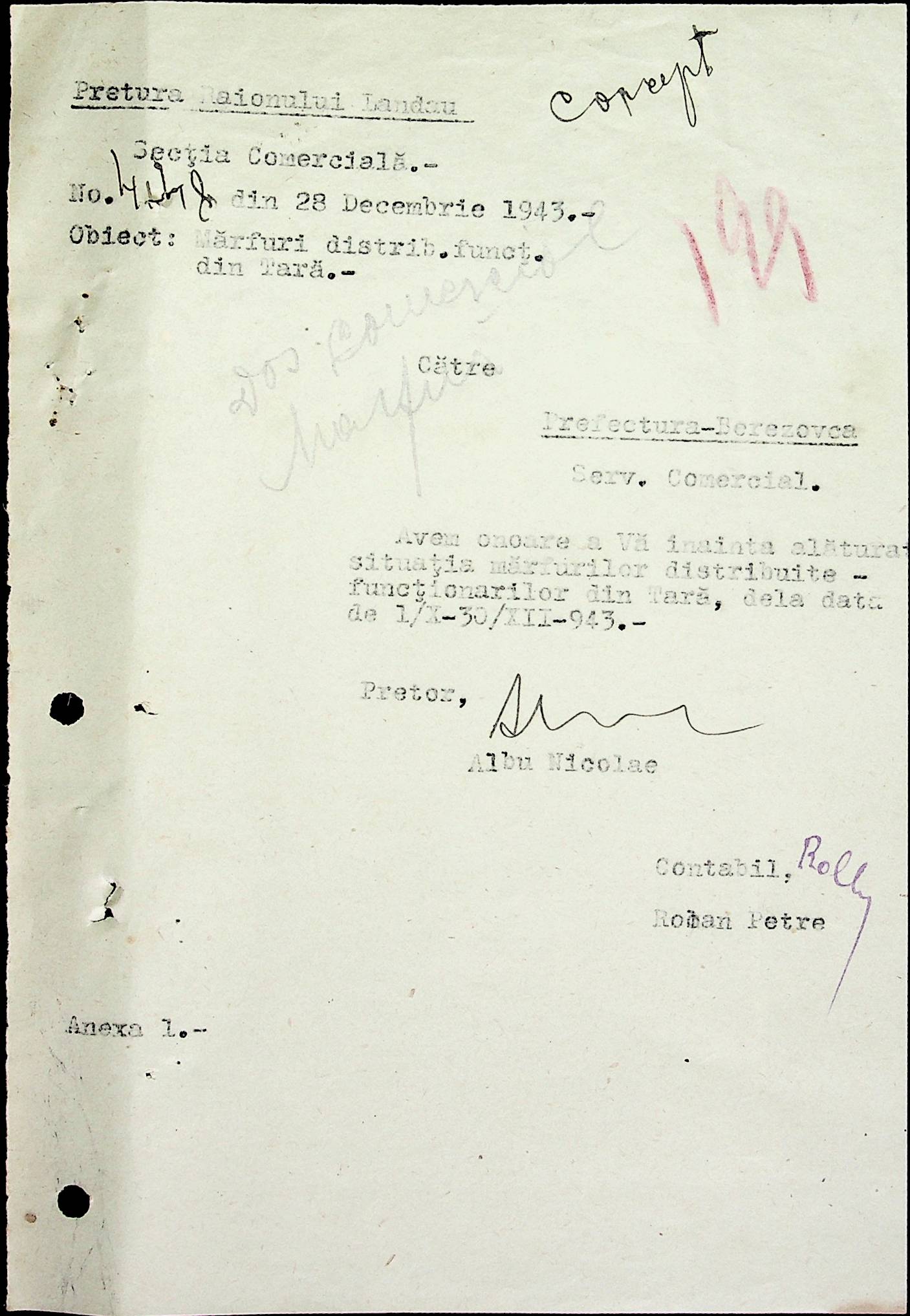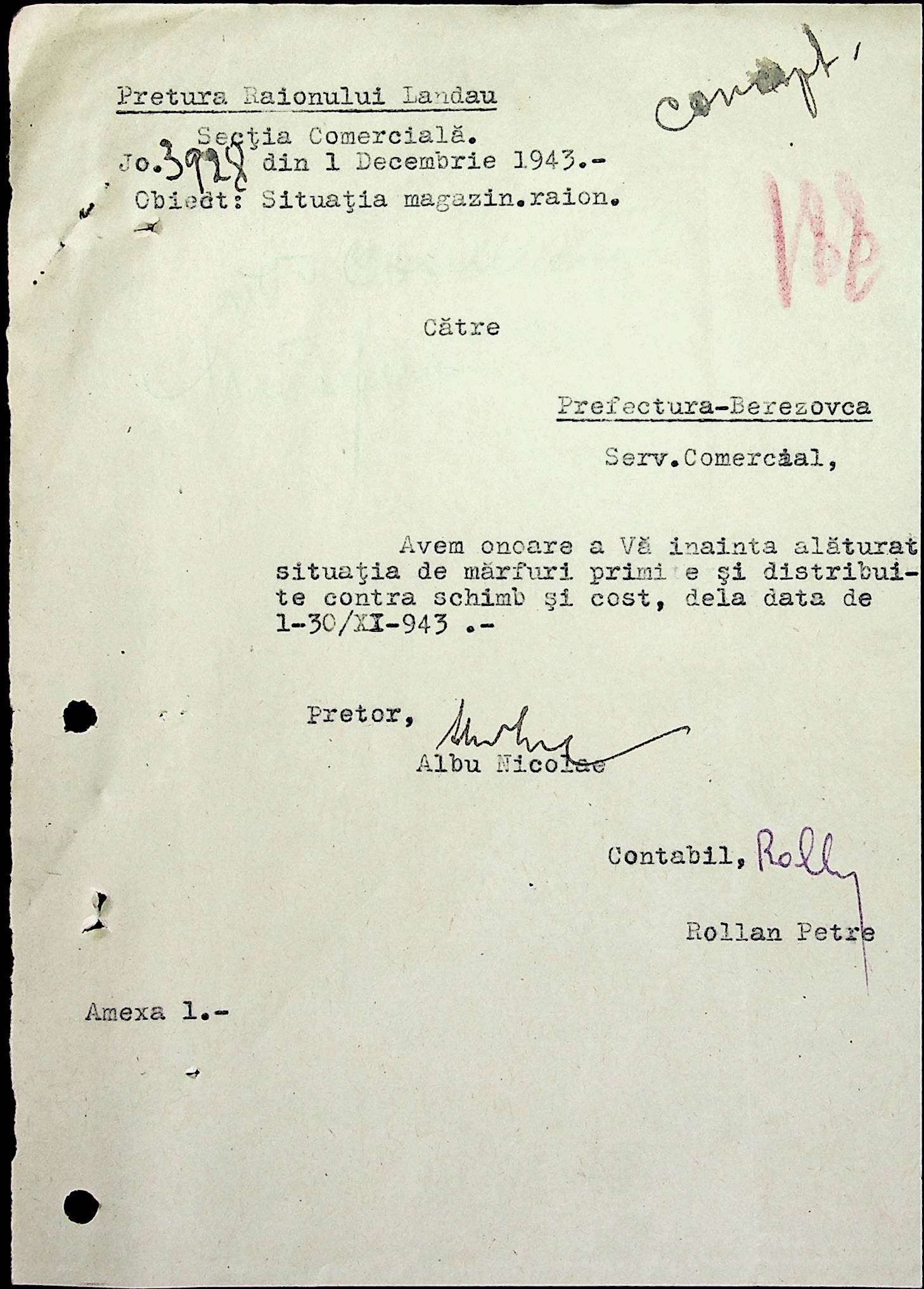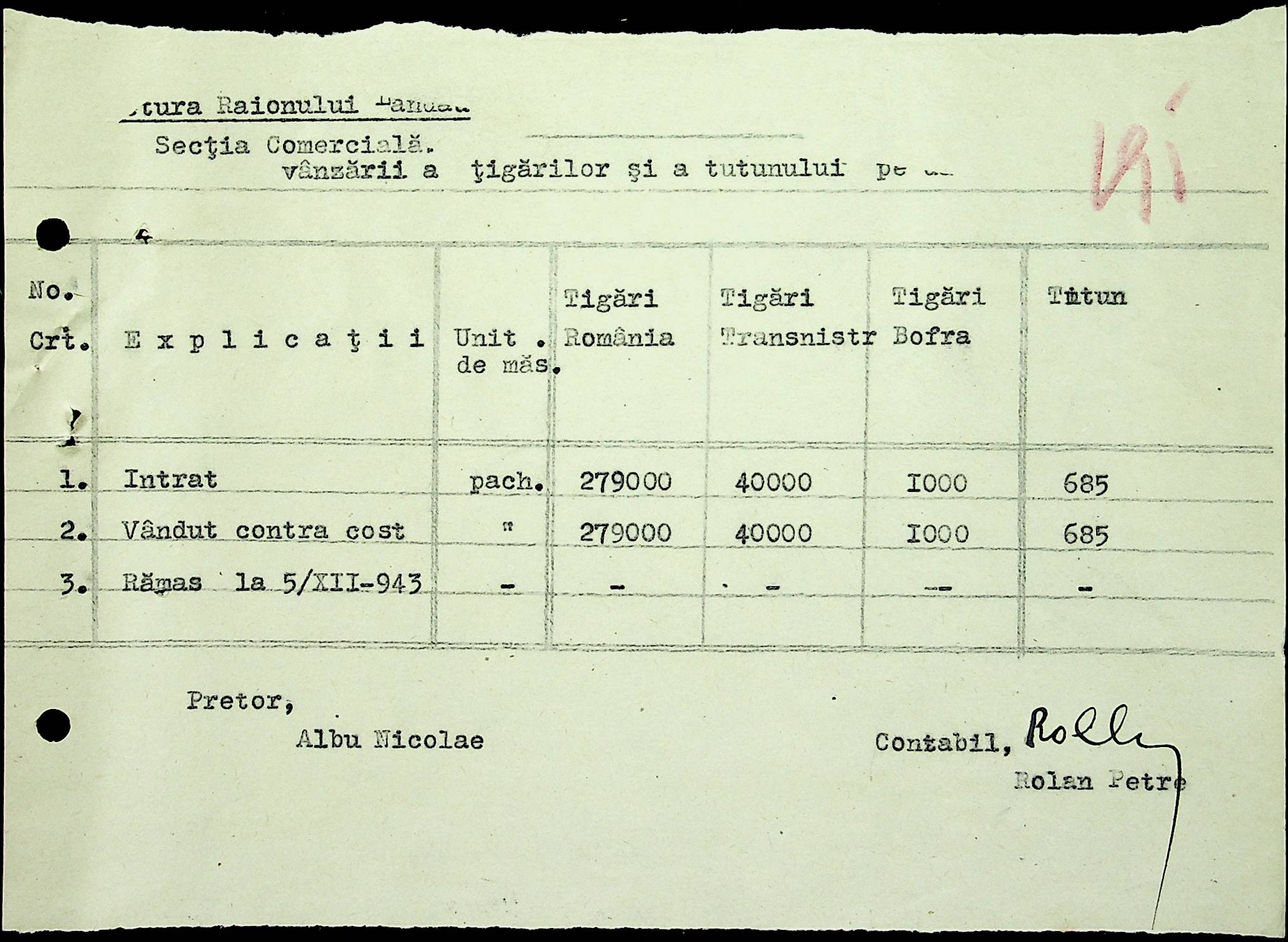 • • • • Справа № 69 Листування з комерційним відділом префектури Березівського повіту про видачу солі службовцям, продаж тютюну і цигарок в районному магазині; про перерахування до держбанку Трансністрії інкасованих коштів за продані товари. Список службовців Ландауської претури