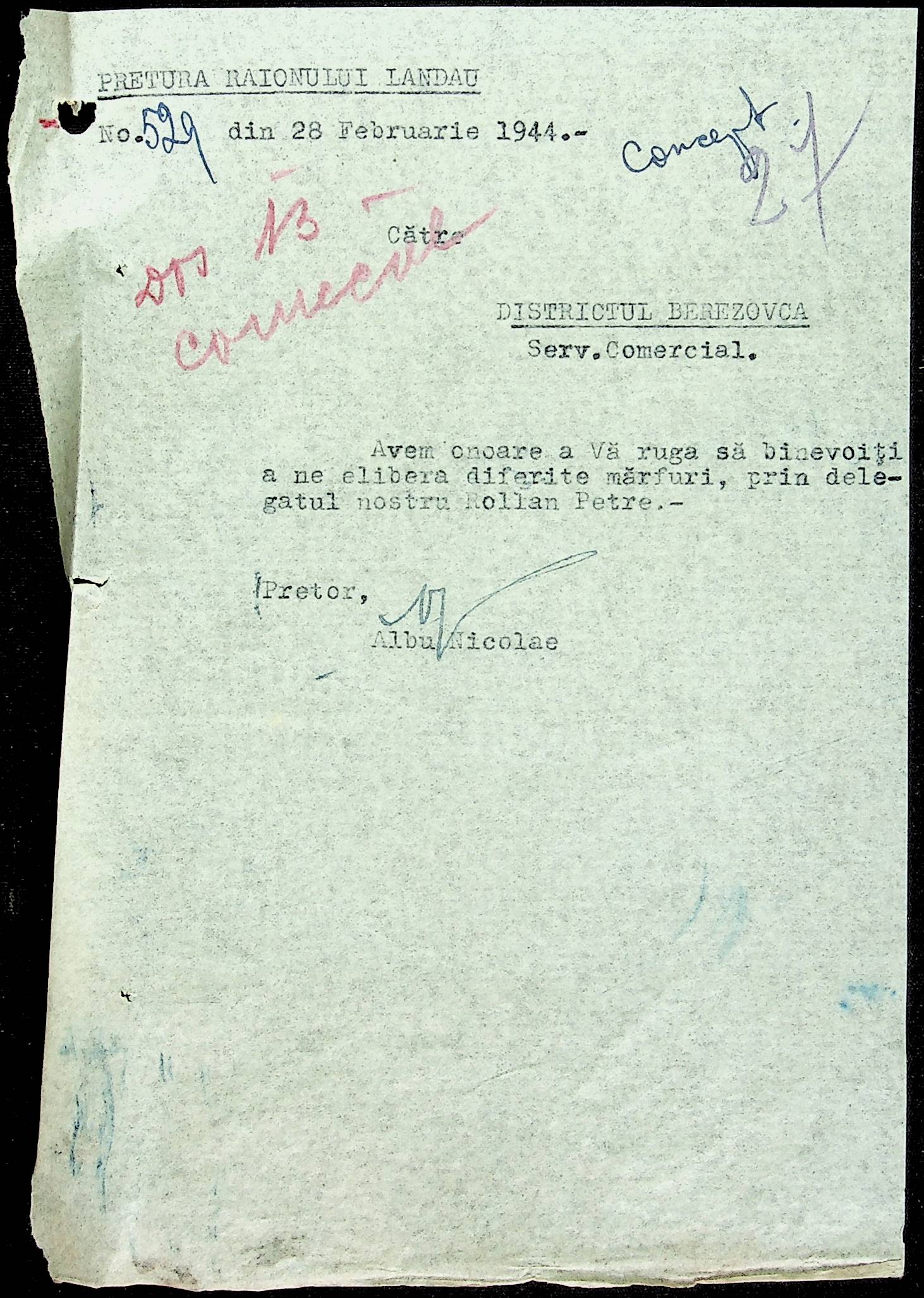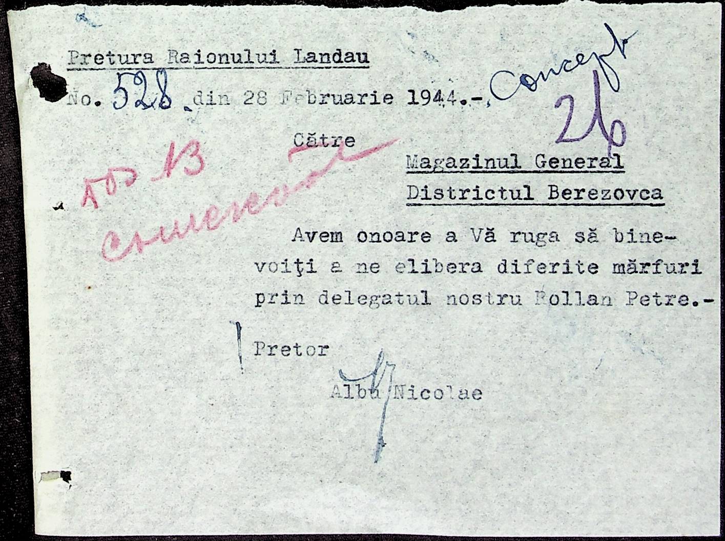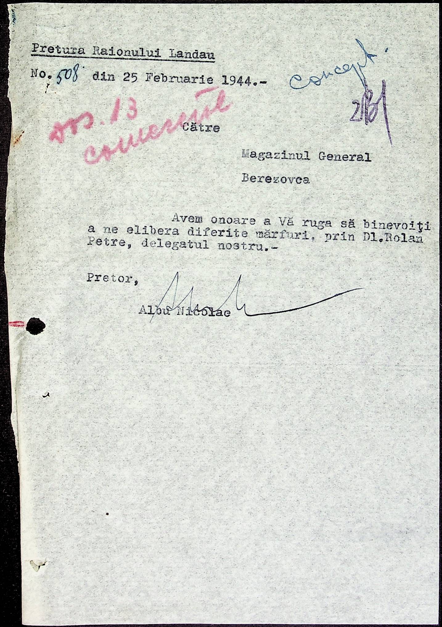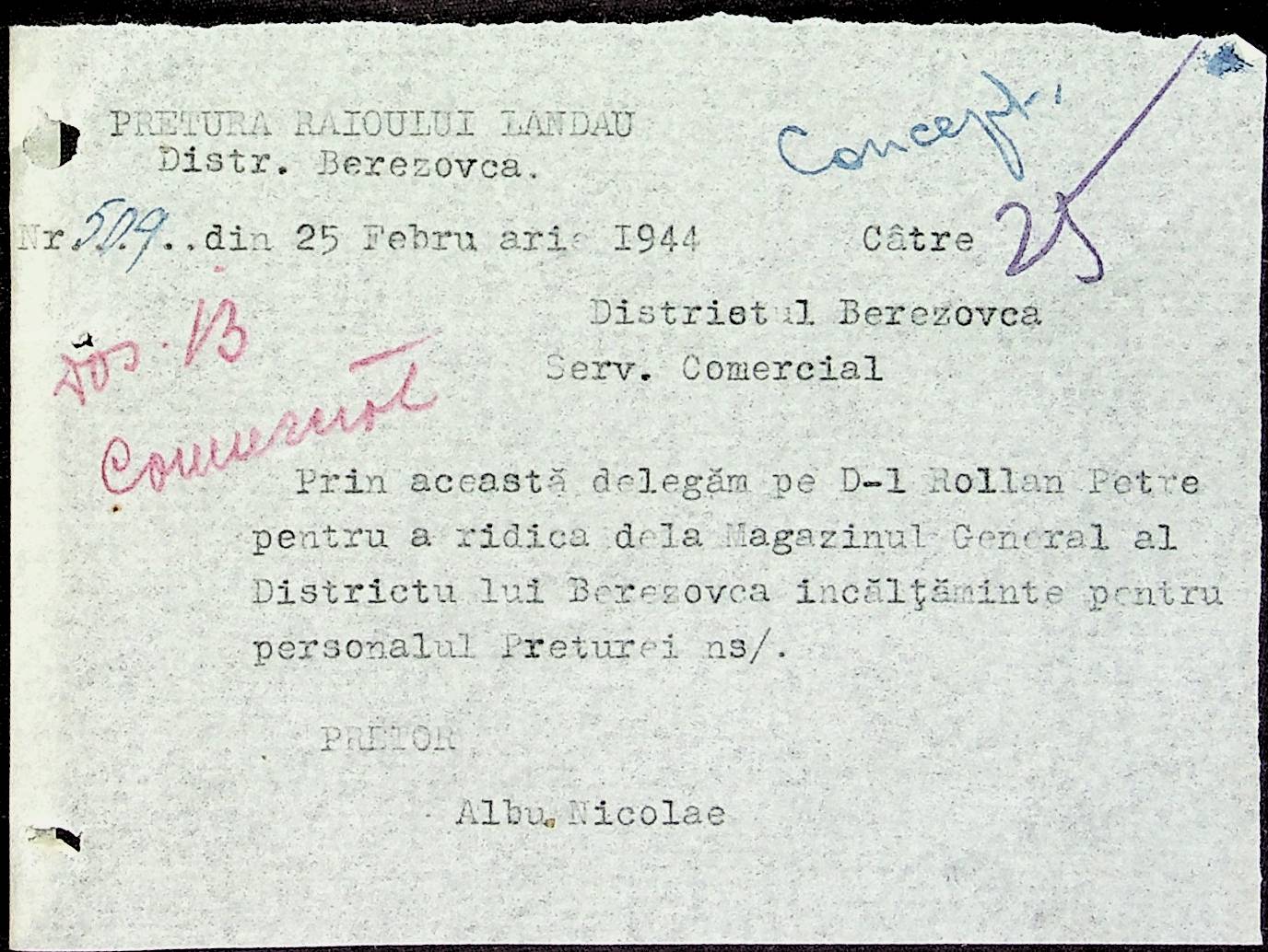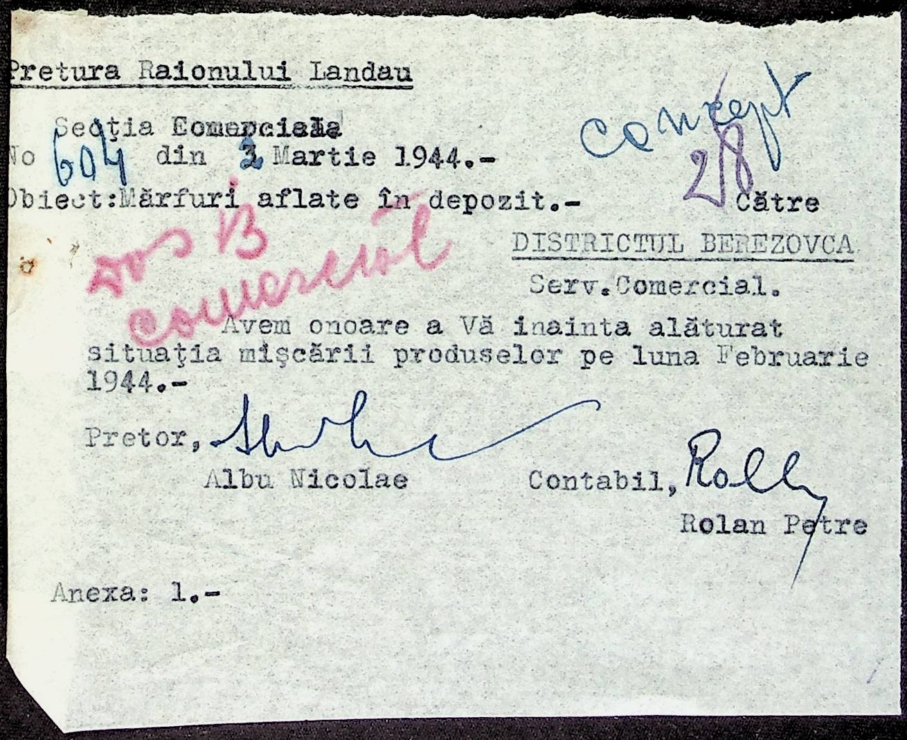 • • • • Справа № 71 Листування з економічним відділом префектури Березівського повіту про видачу продуктів для району, кількість отриманої і проданої солі, торгівлю спиртними напоями, рух продуктів за лютий 1944 року