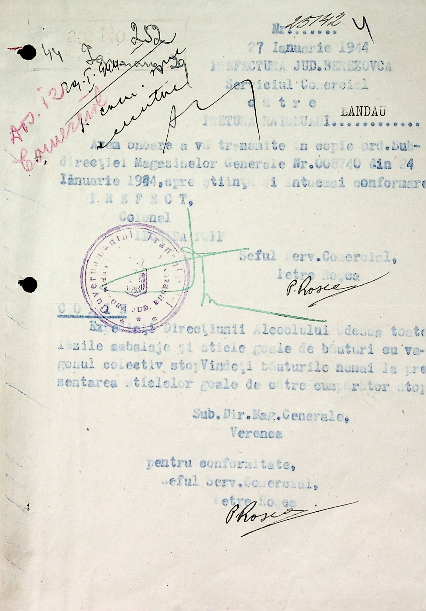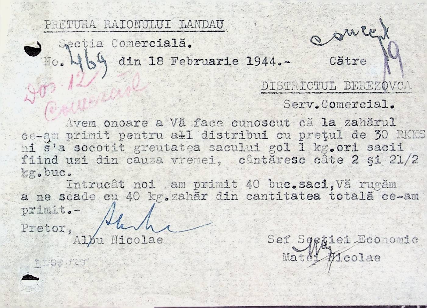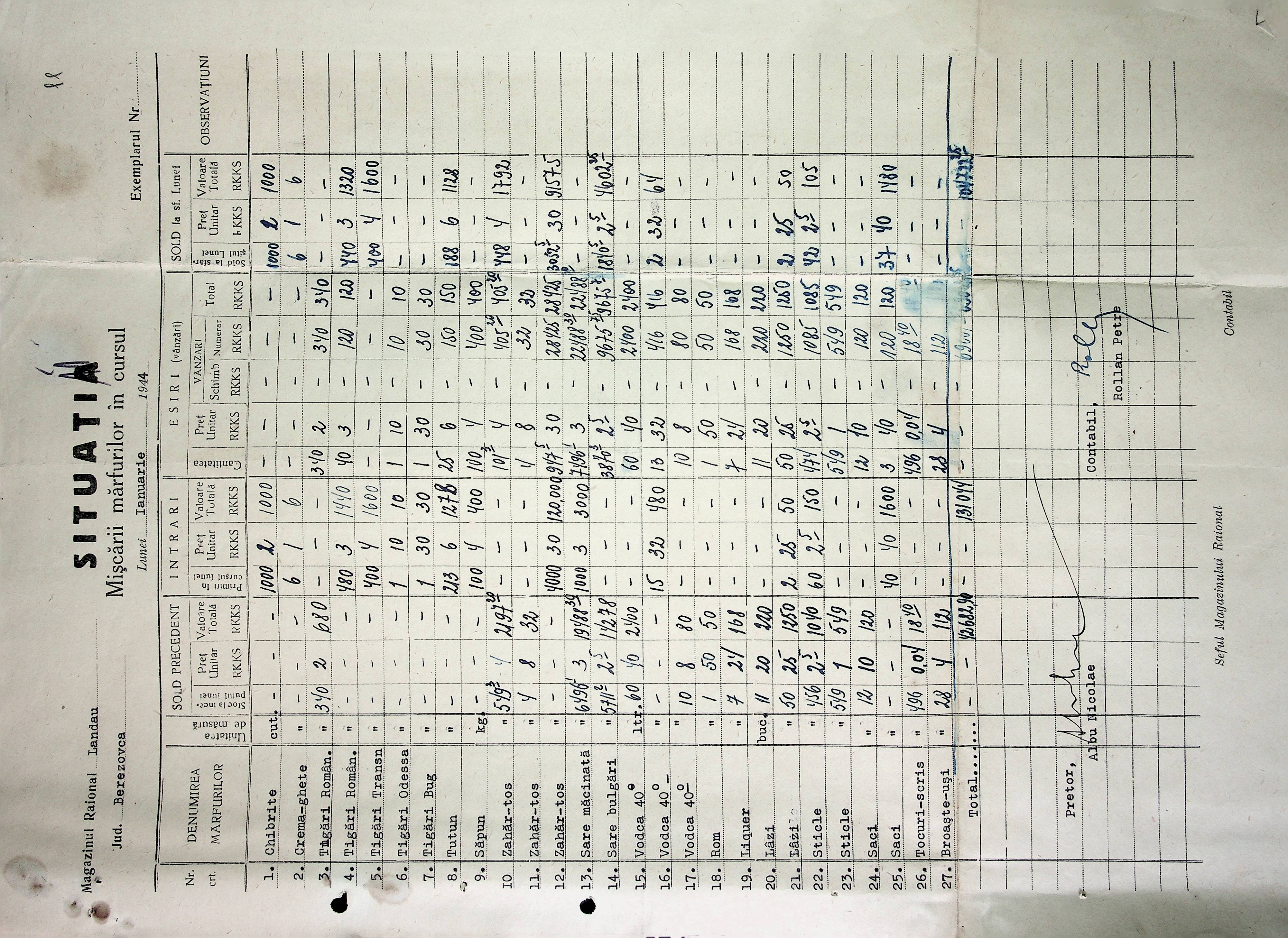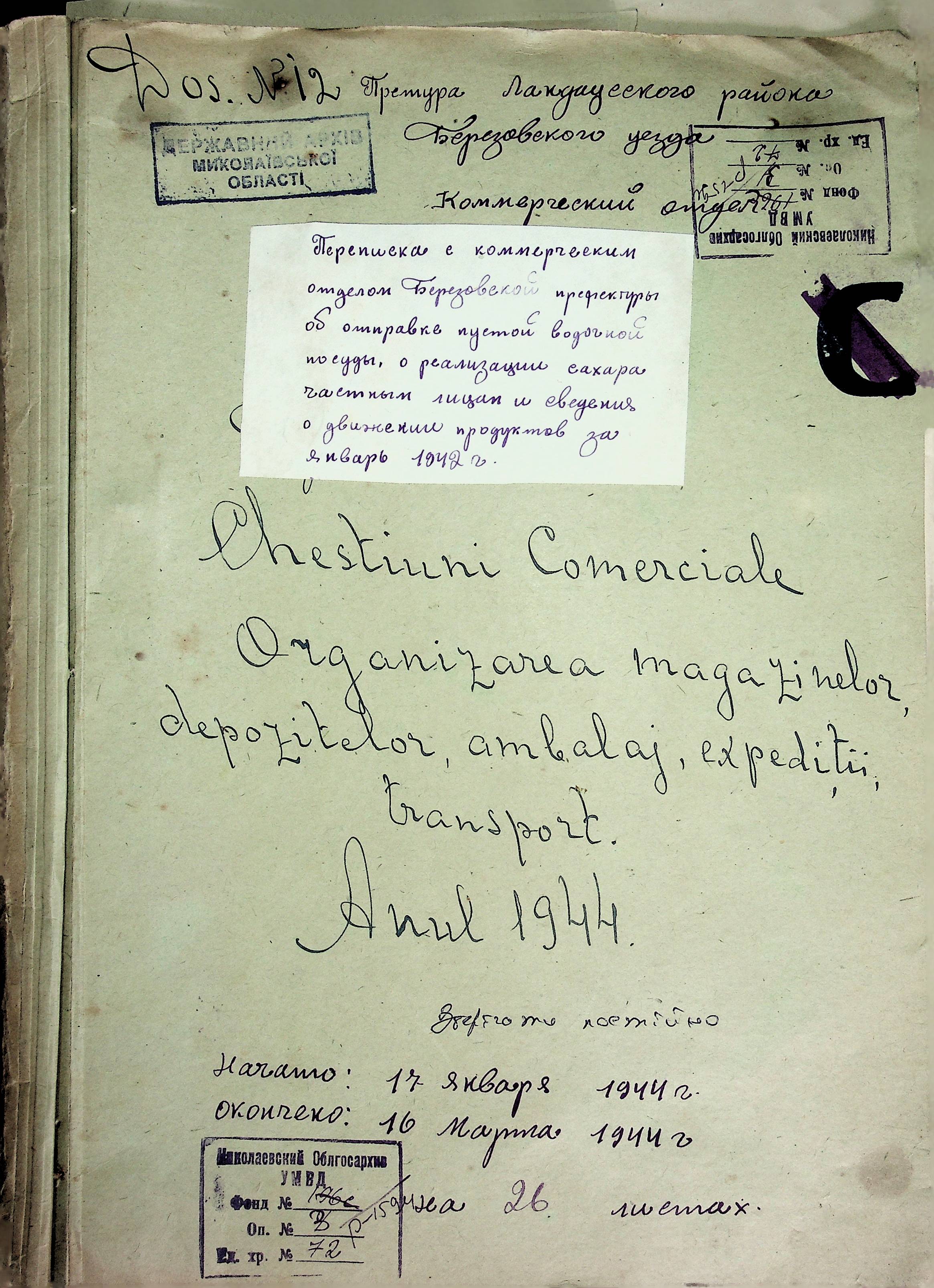 • • • • Справа № 72 Листування з комерційним відділом Березівської префектури про відправку порожнього посуду від спиртних напоїв, реалізацію цукру, рух продуктів і товарів за січень 1944 року
