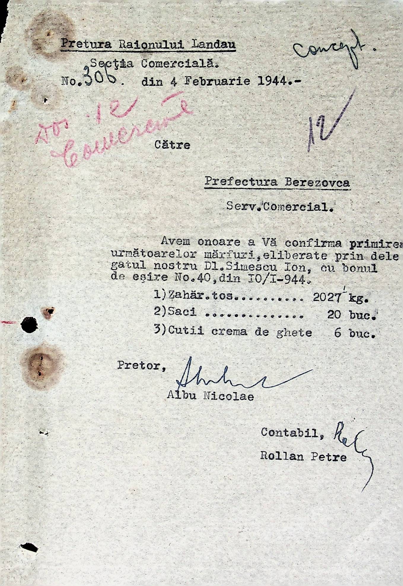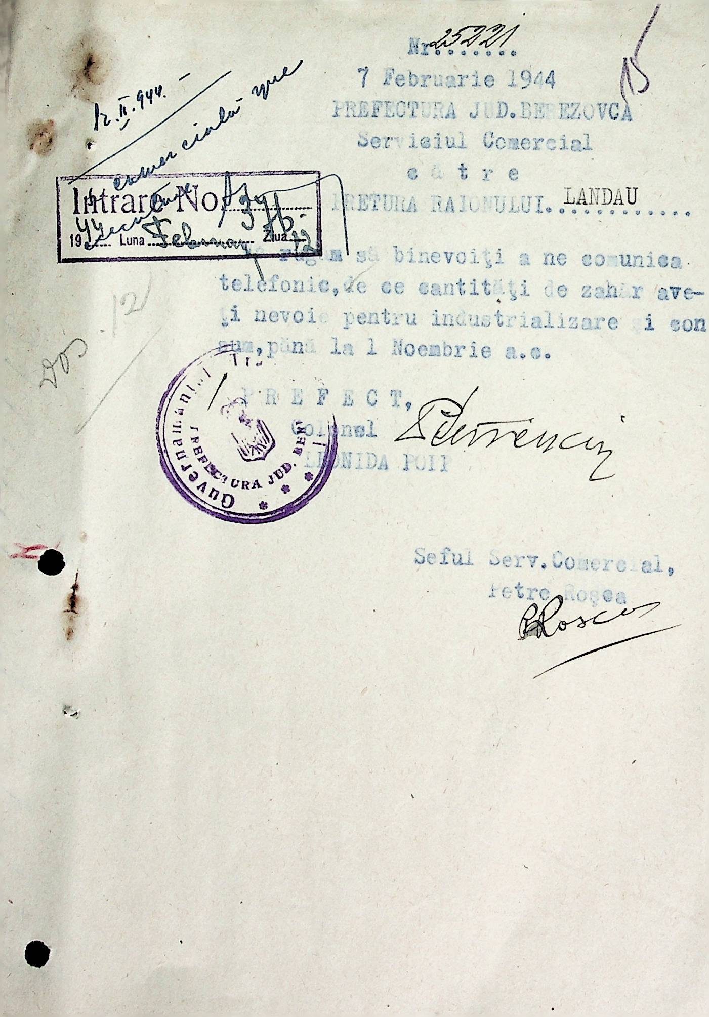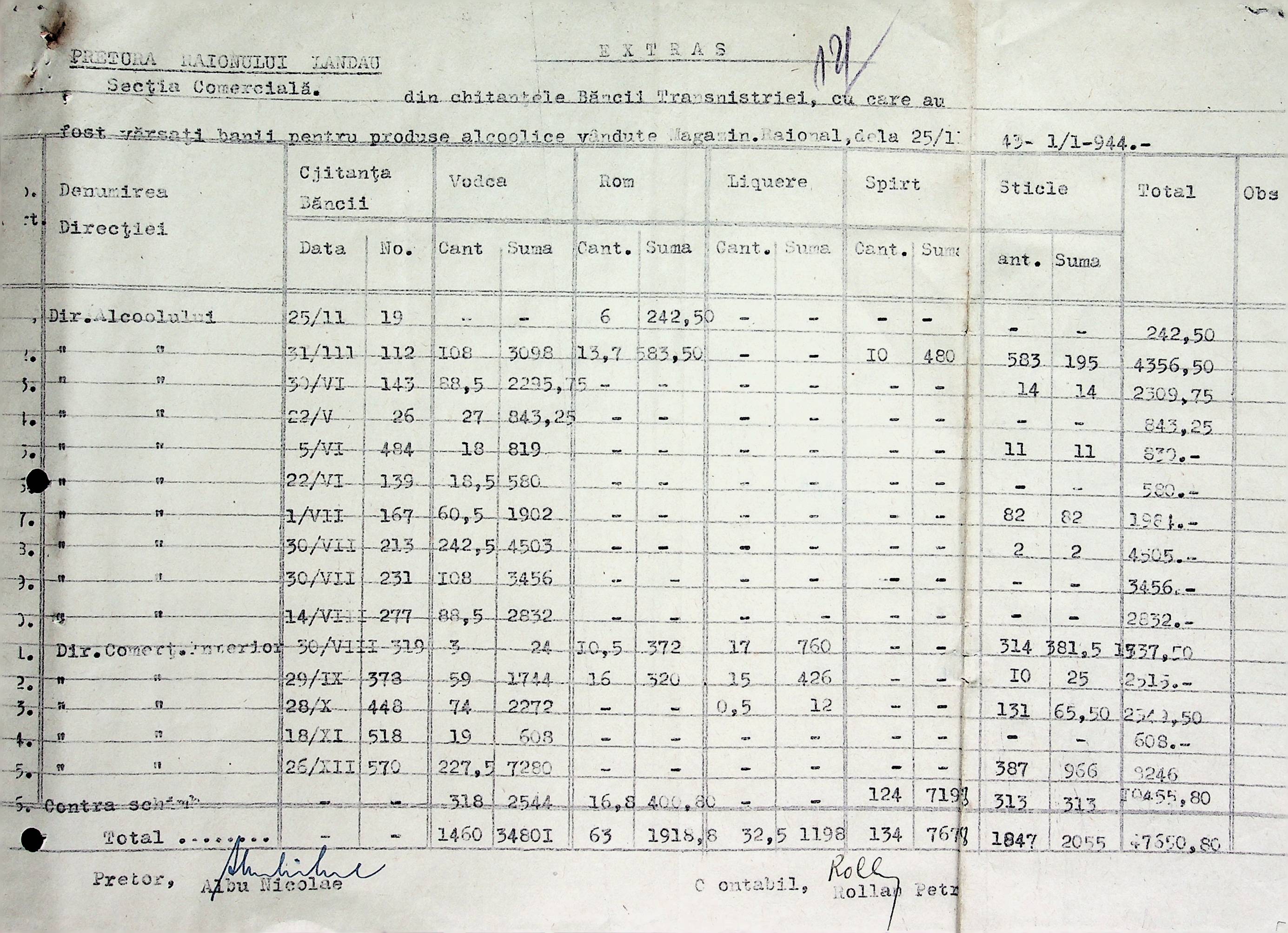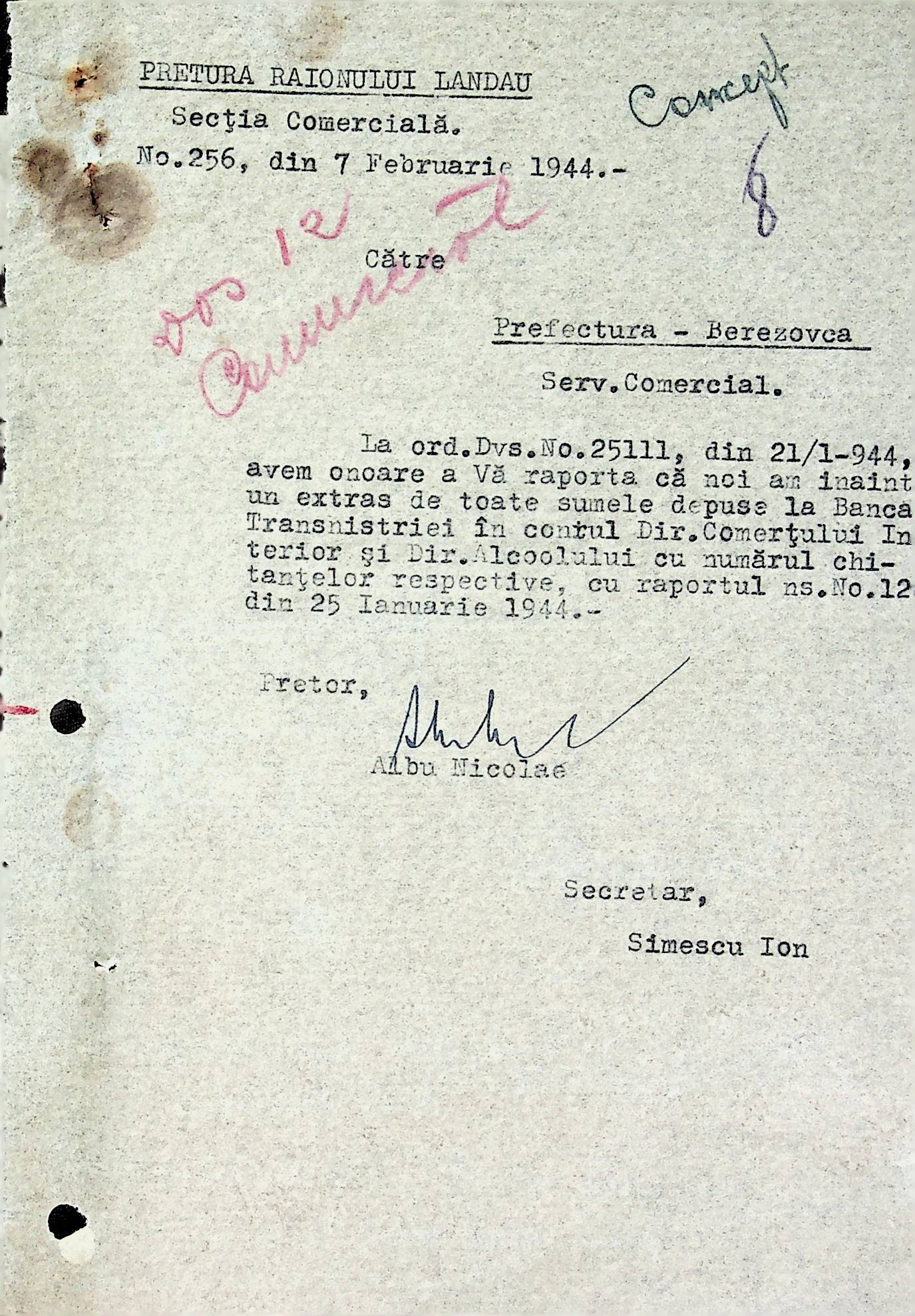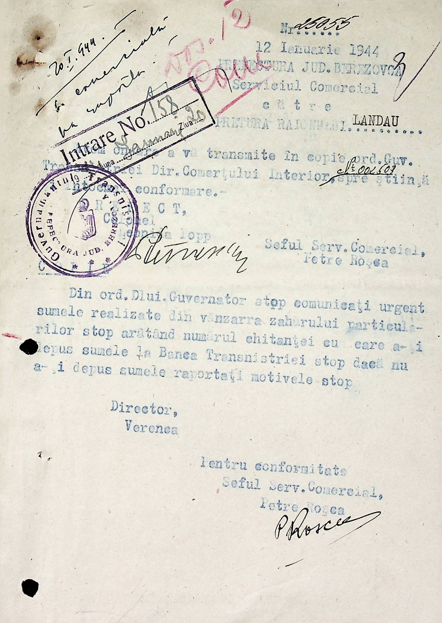• • • • Справа № 72 Листування з комерційним відділом Березівської префектури про відправку порожнього посуду від спиртних напоїв, реалізацію цукру, рух продуктів і товарів за січень 1944 року