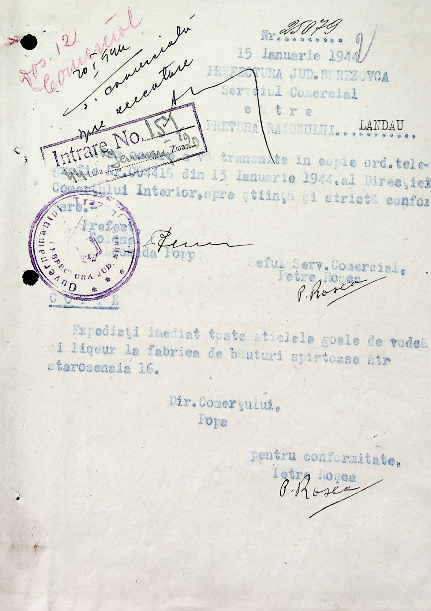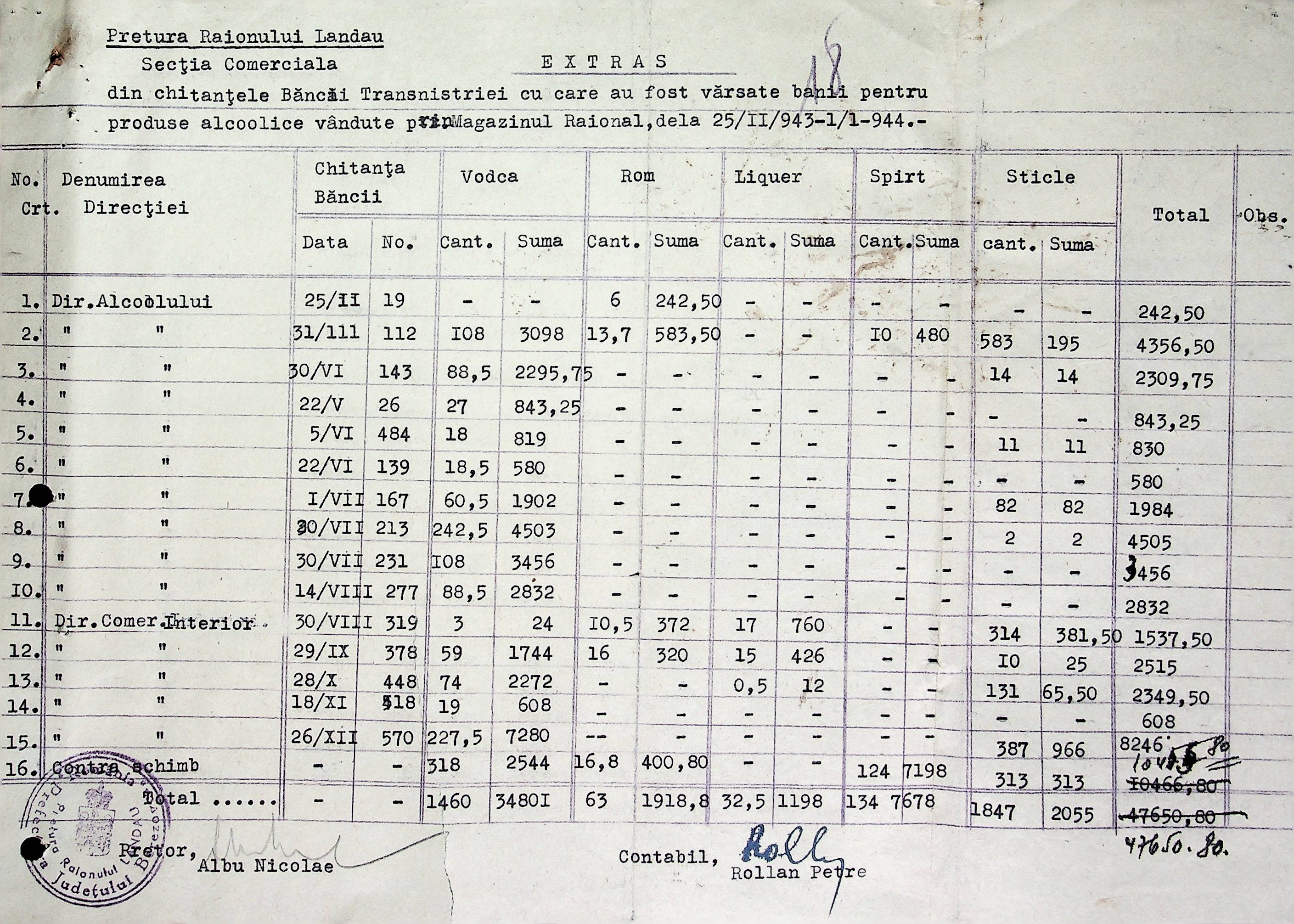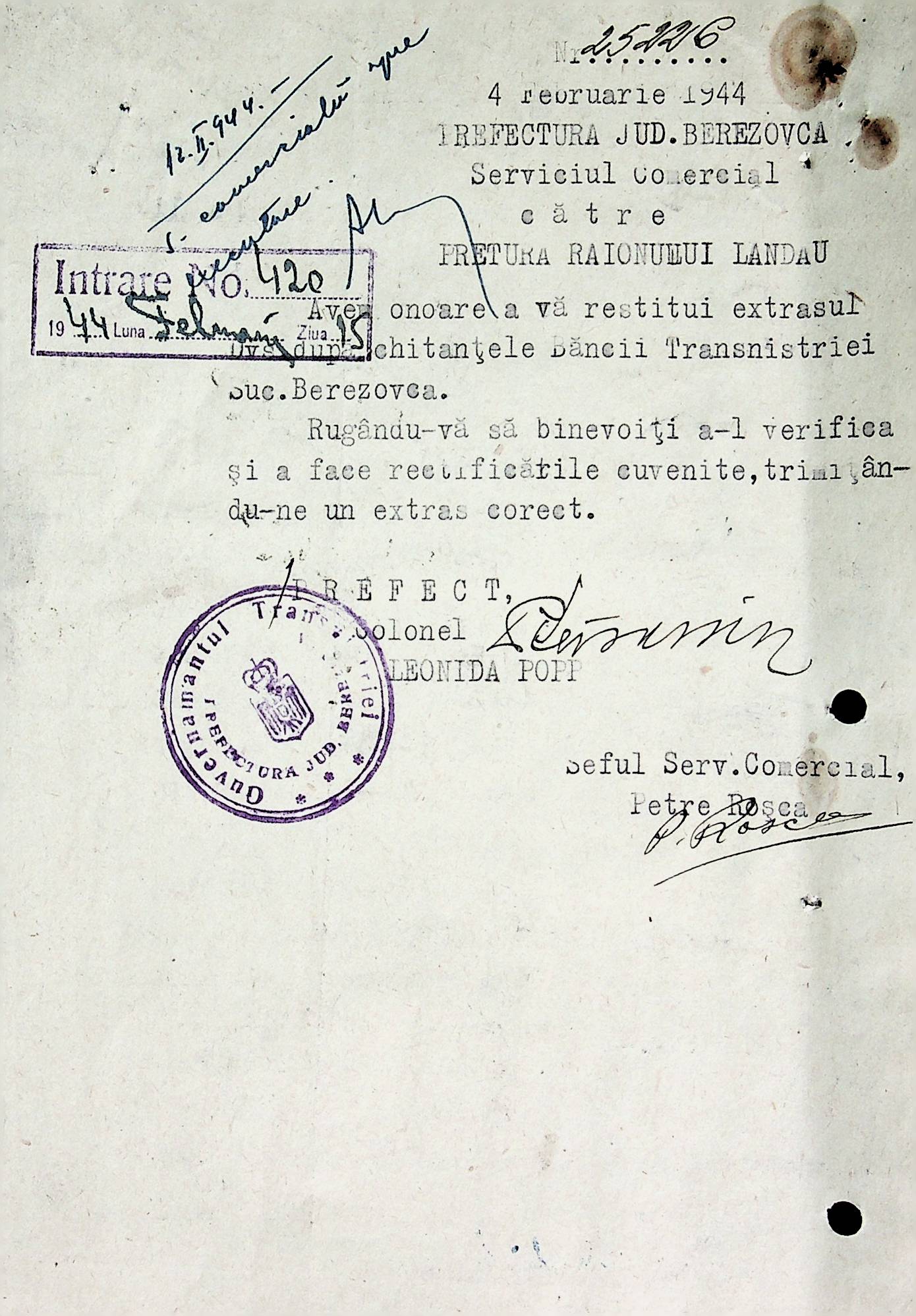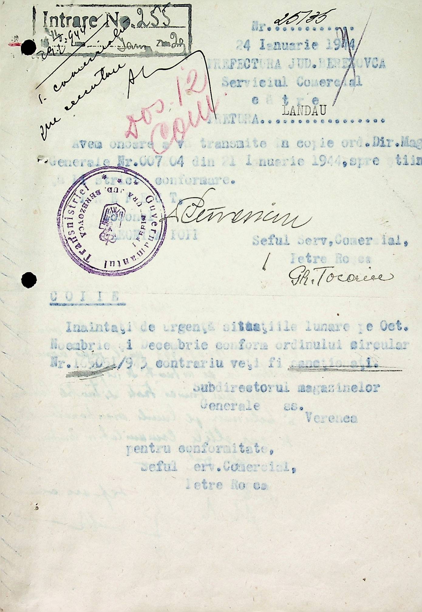 • • • • Справа № 72 Листування з комерційним відділом Березівської префектури про відправку порожнього посуду від спиртних напоїв, реалізацію цукру, рух продуктів і товарів за січень 1944 року