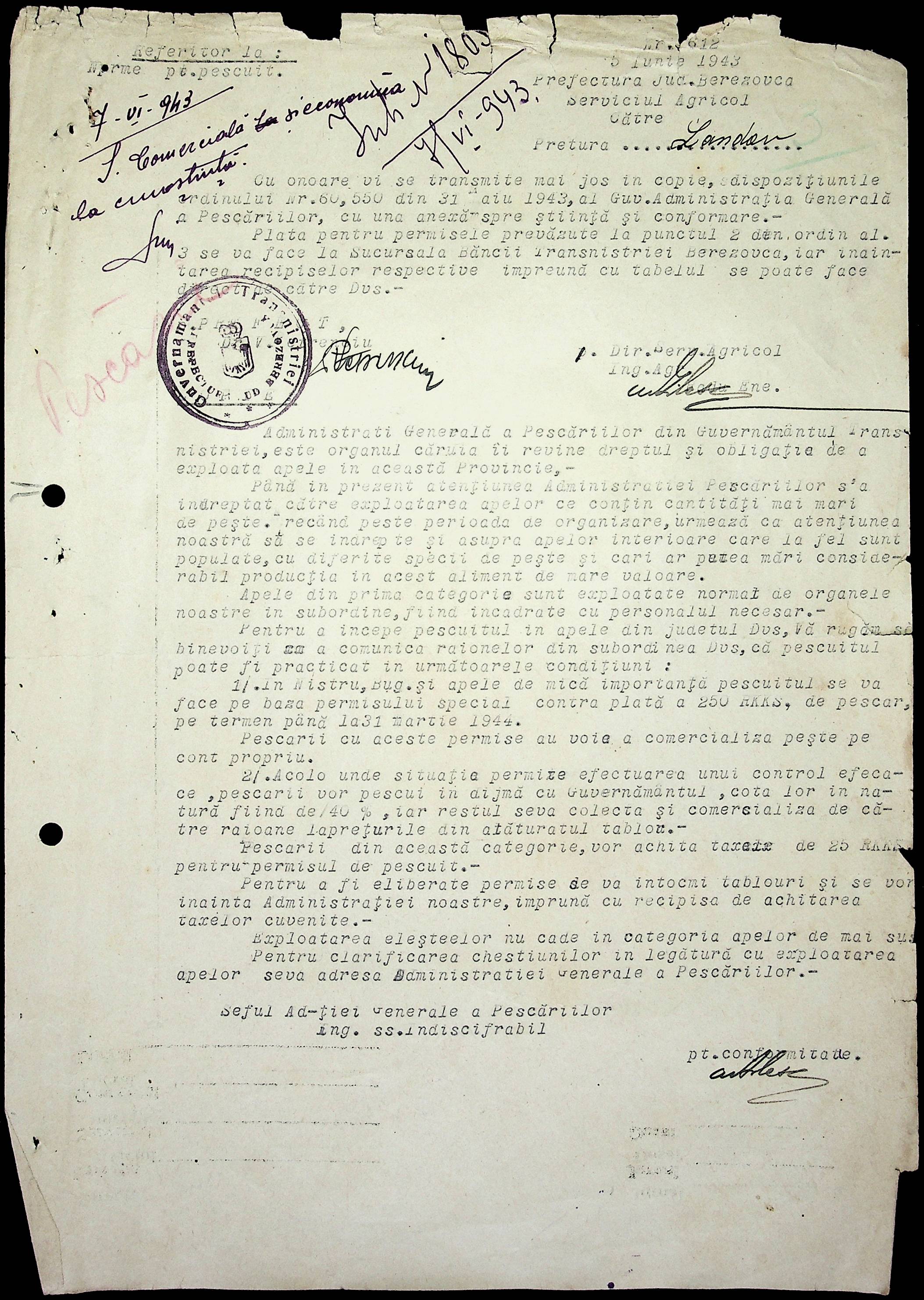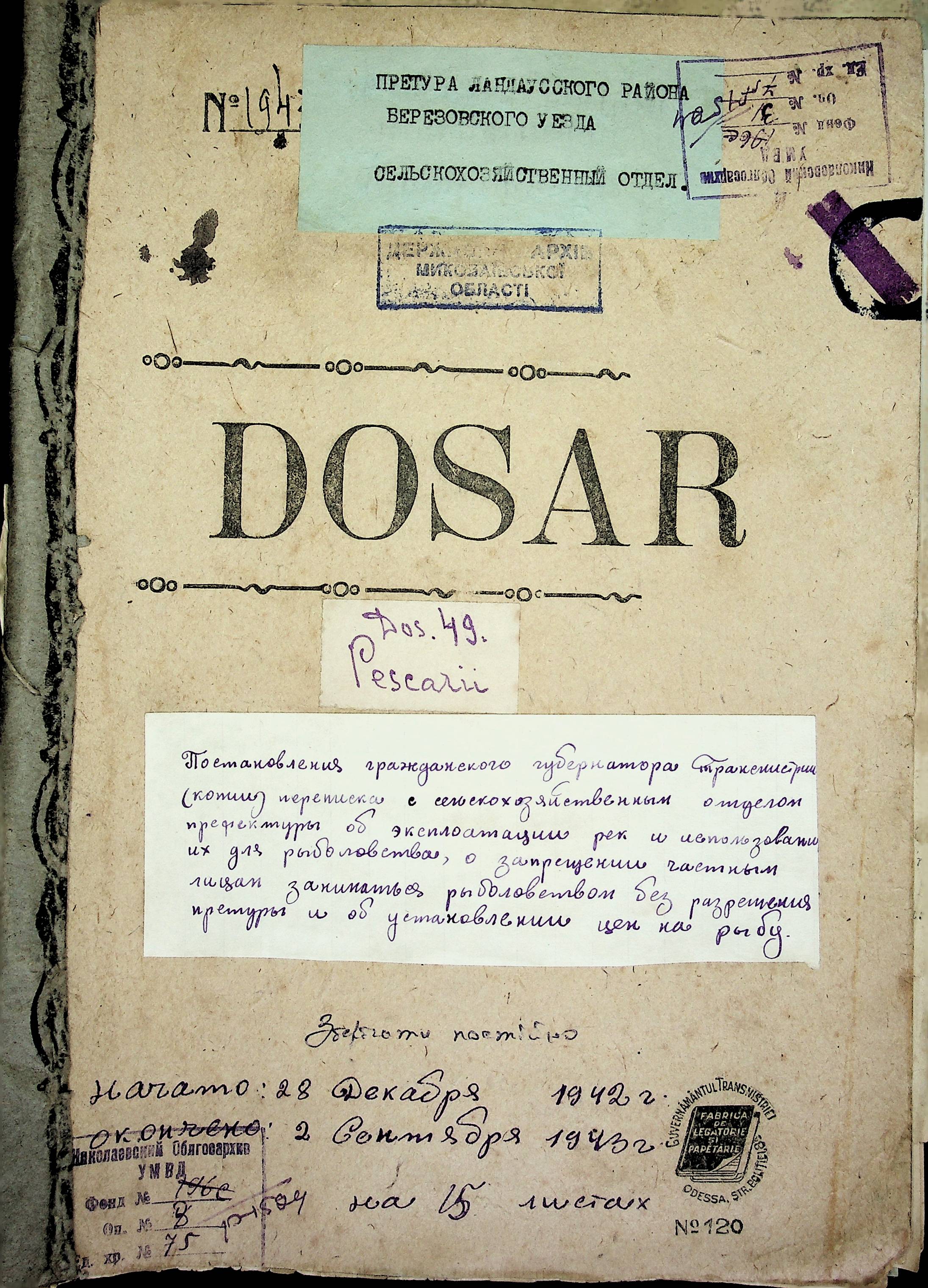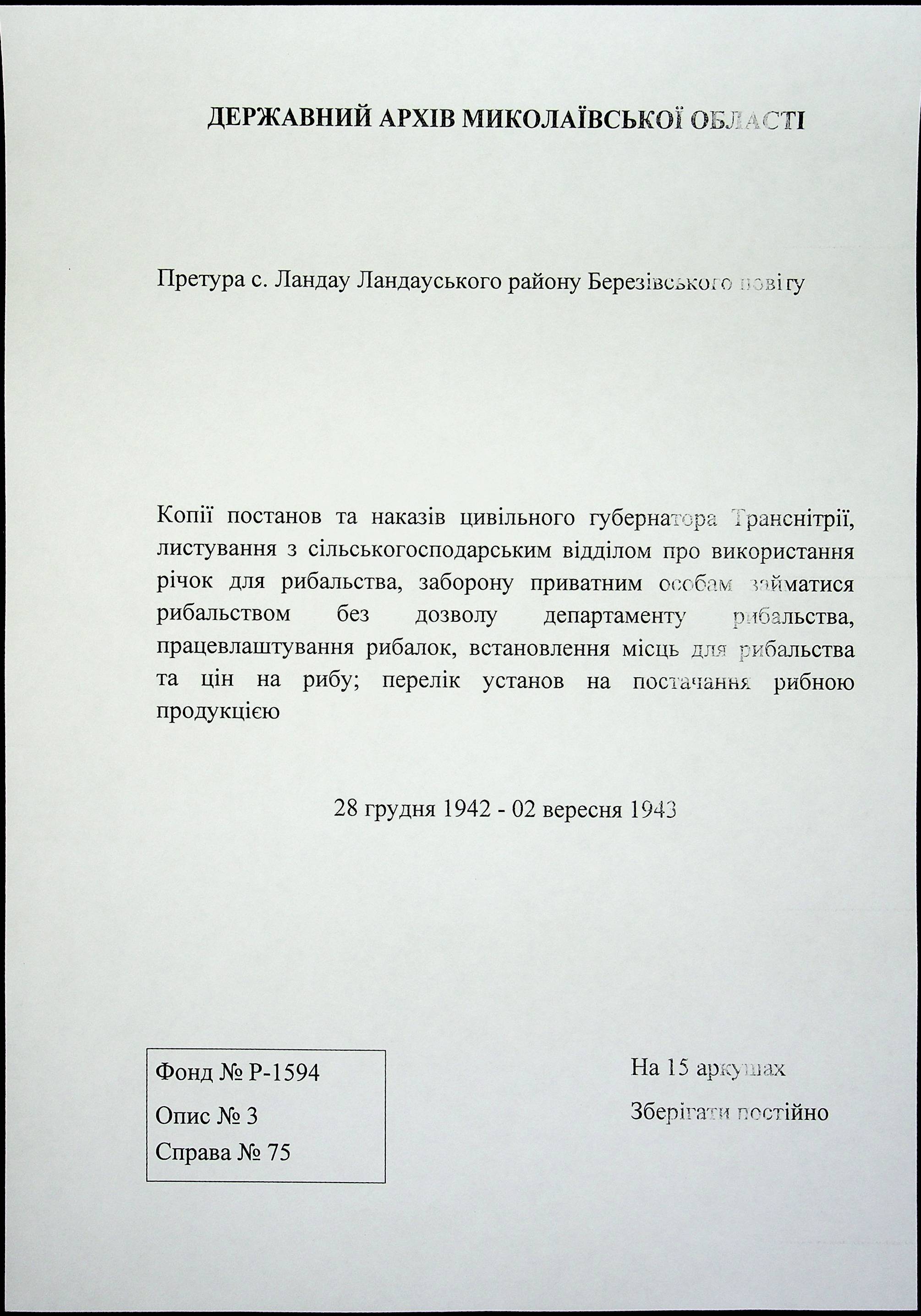 • • • • Справа № 75 Копії постанов та наказів цивільного губернатора Транснітрії, листування з сільськогосподарським відділом про використання річок для рибальства, заборону приватним особам займатися рибальством без дозволу департаменту рибальства, працевлаштування рибалок, встановлення місць для рибальства та цін на рибу; перелік установ на постачання рибною продукцією