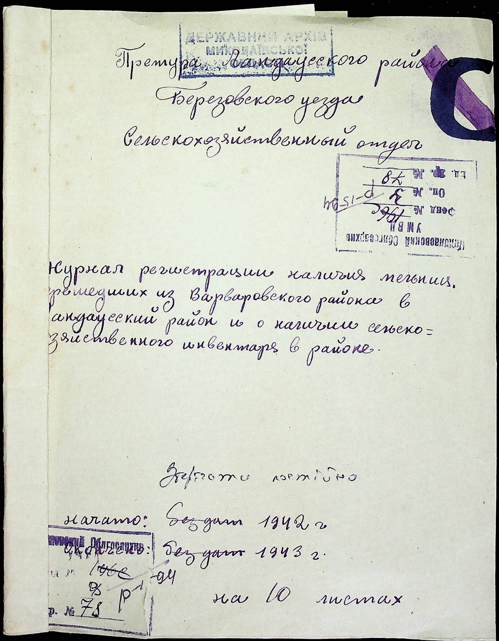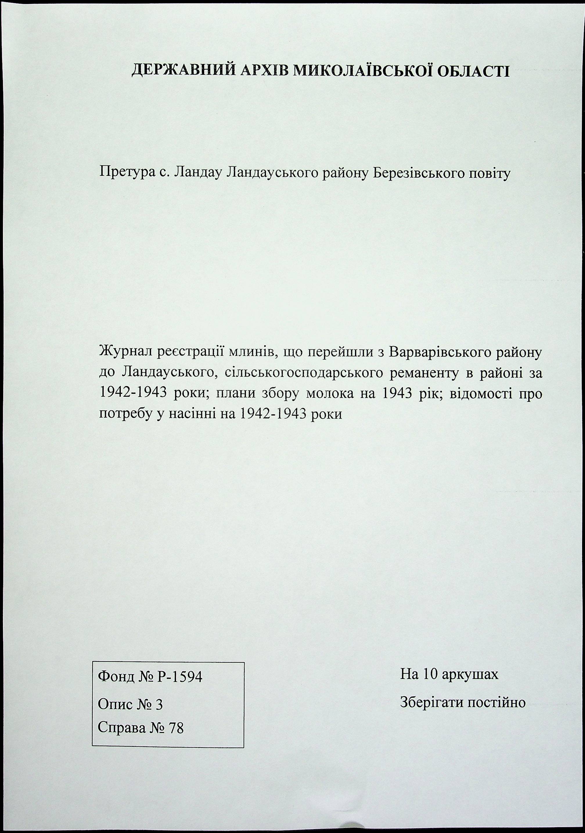 • • • • Справа № 78 Журнал реєстрації млинів, що перейшли з Варварівського району до Ландауського, сільськогосподарського реманенту в районі за 1942-1943 роки; плани збору молока на 1943 рік; відомості про потребу у насінні на 1942-1943 роки