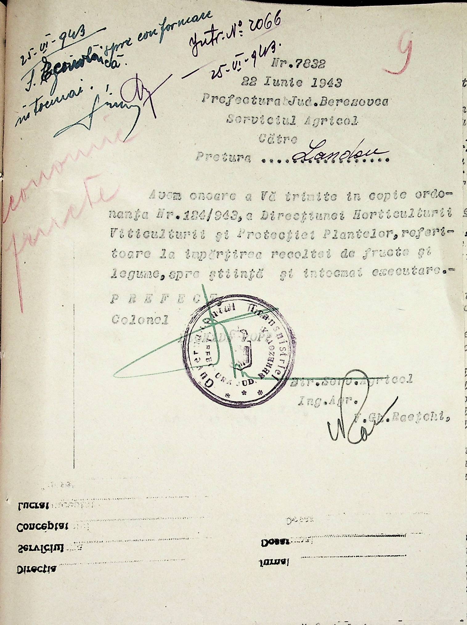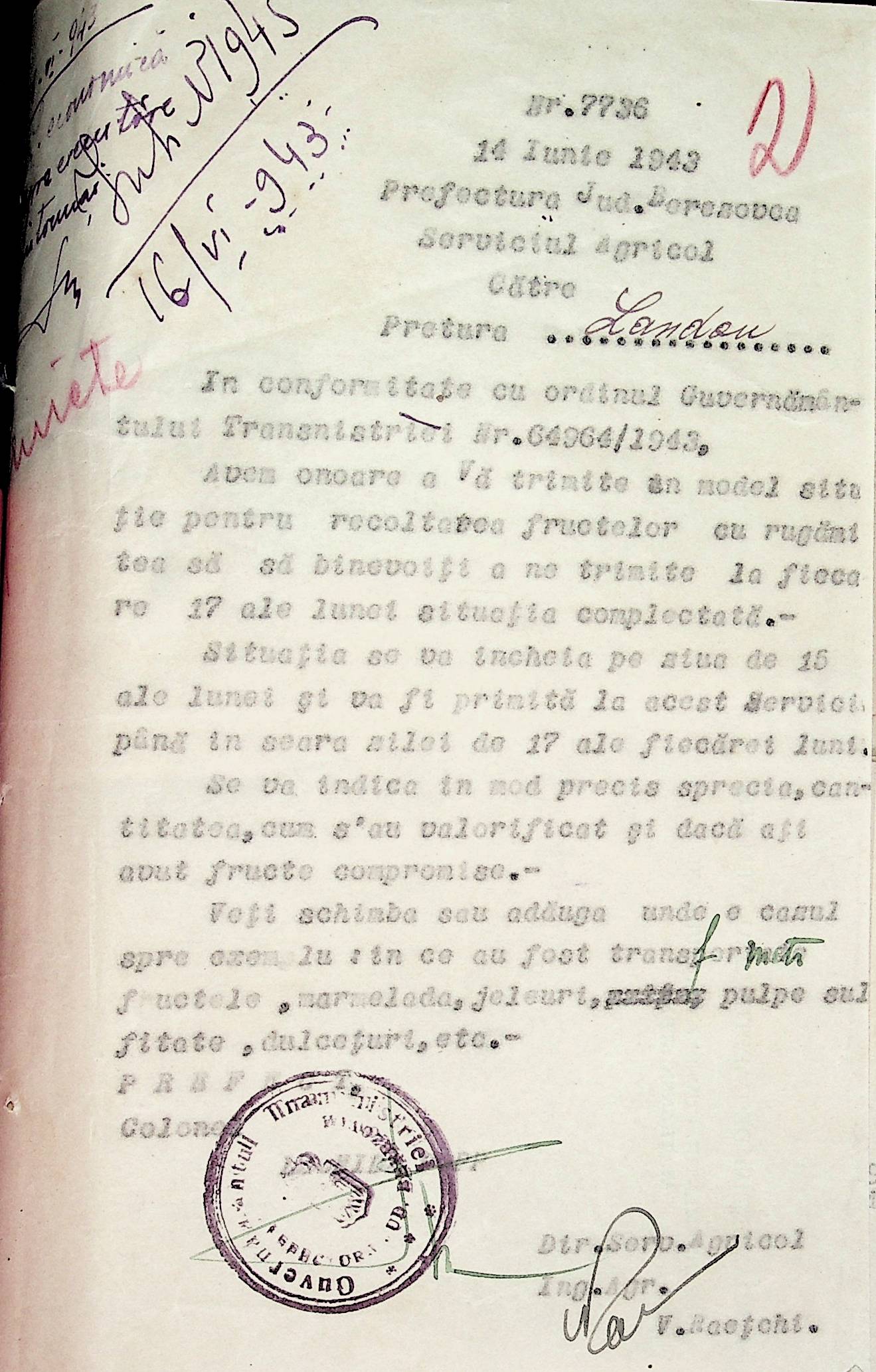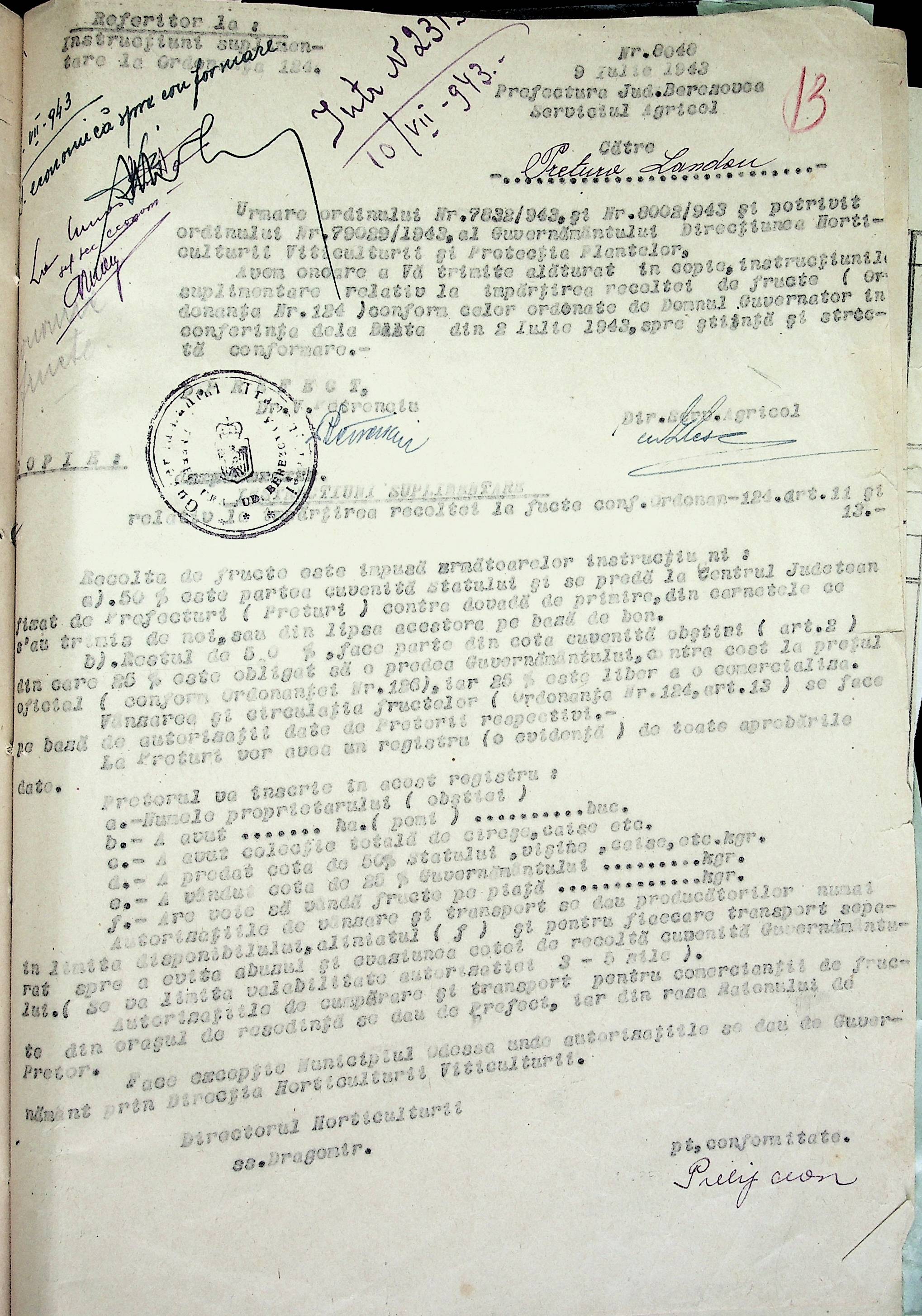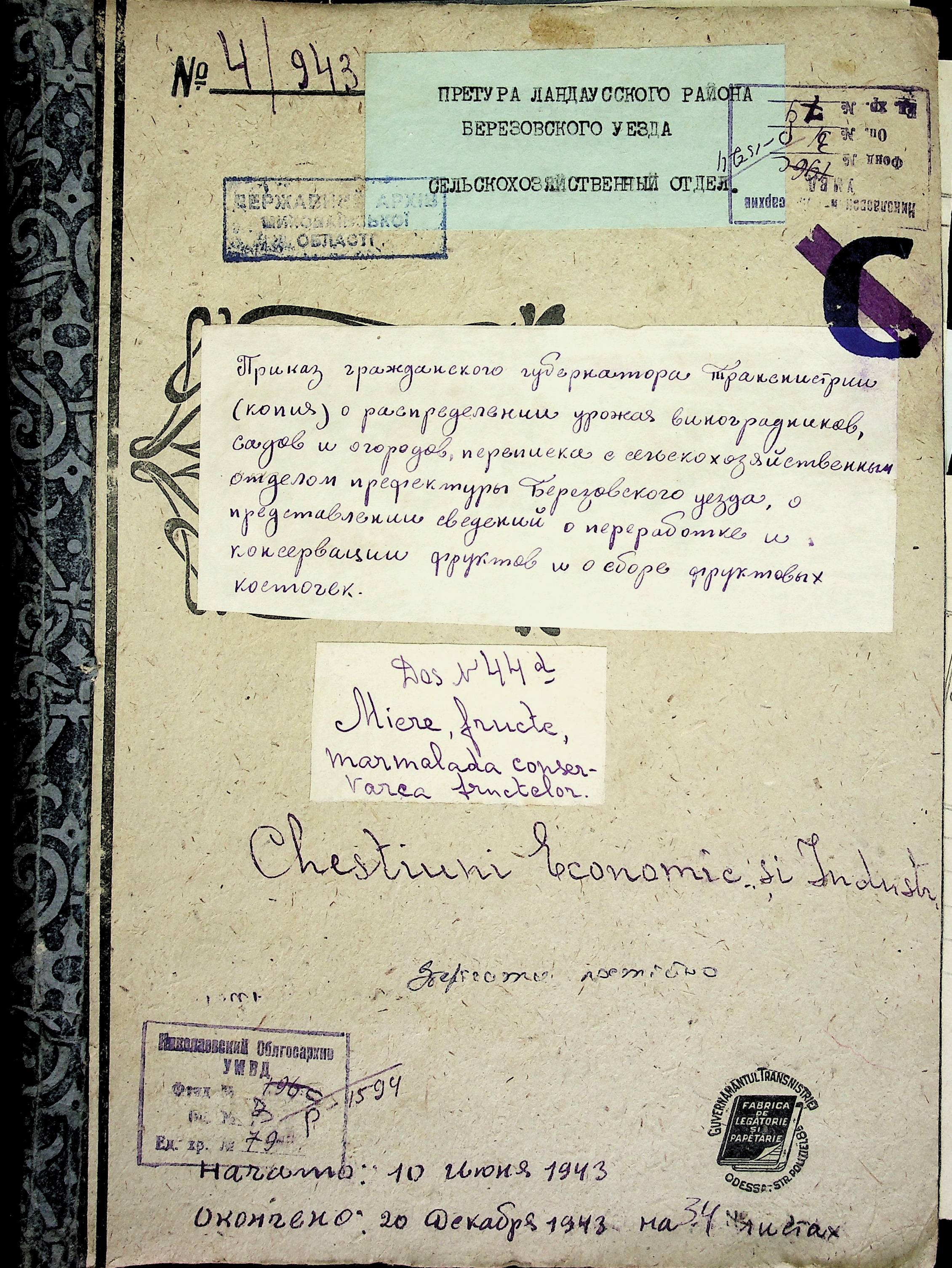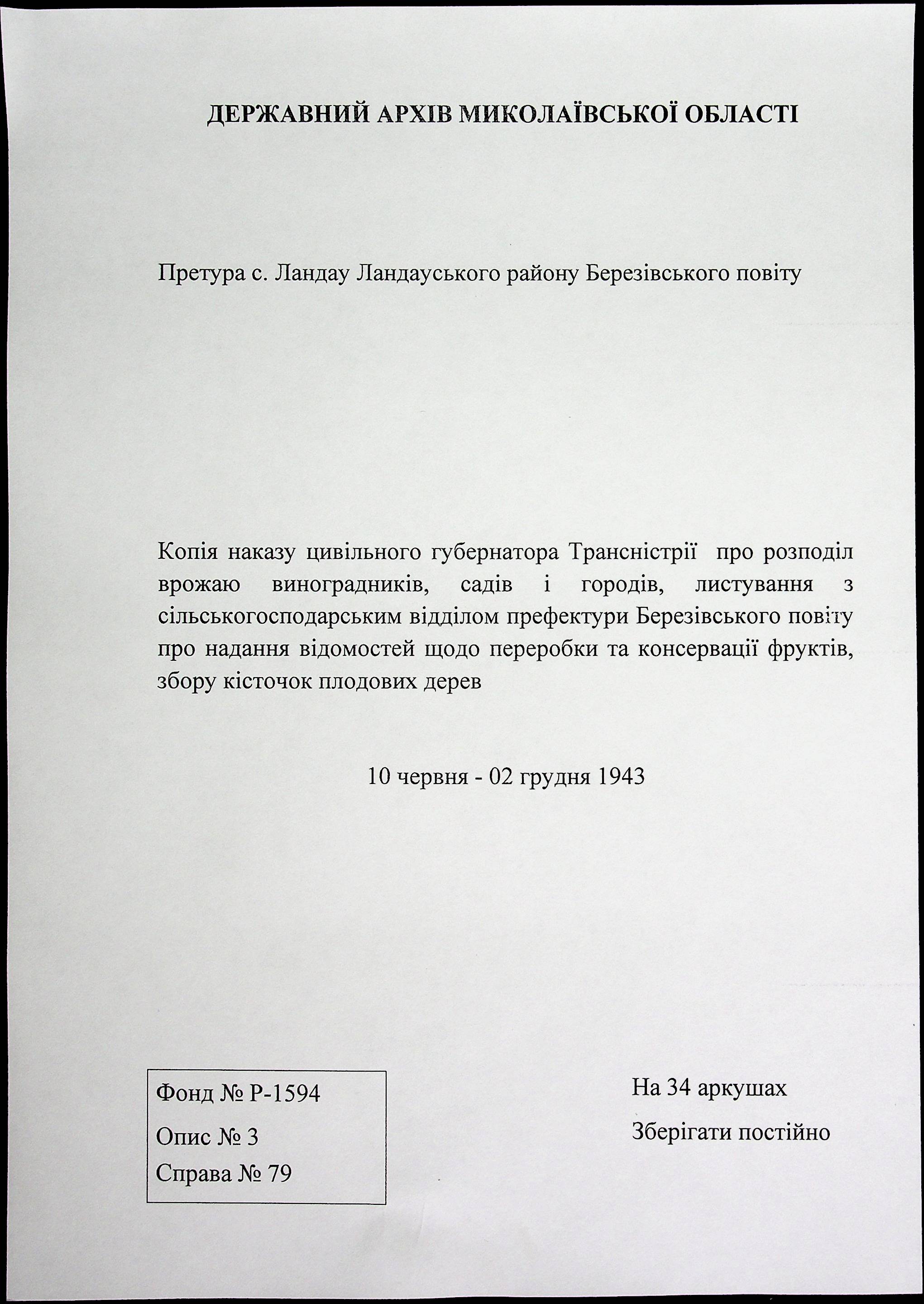 • • • • Справа № 79 Копія наказу цивільного губернатора Трансністрії про розподіл врожаю виноградників, садів і городів, листування з сільськогосподарським відділом префектури Березівського повіту про надання відомостей щодо переробки та консервації фруктів, збору кісточок плодових дерев