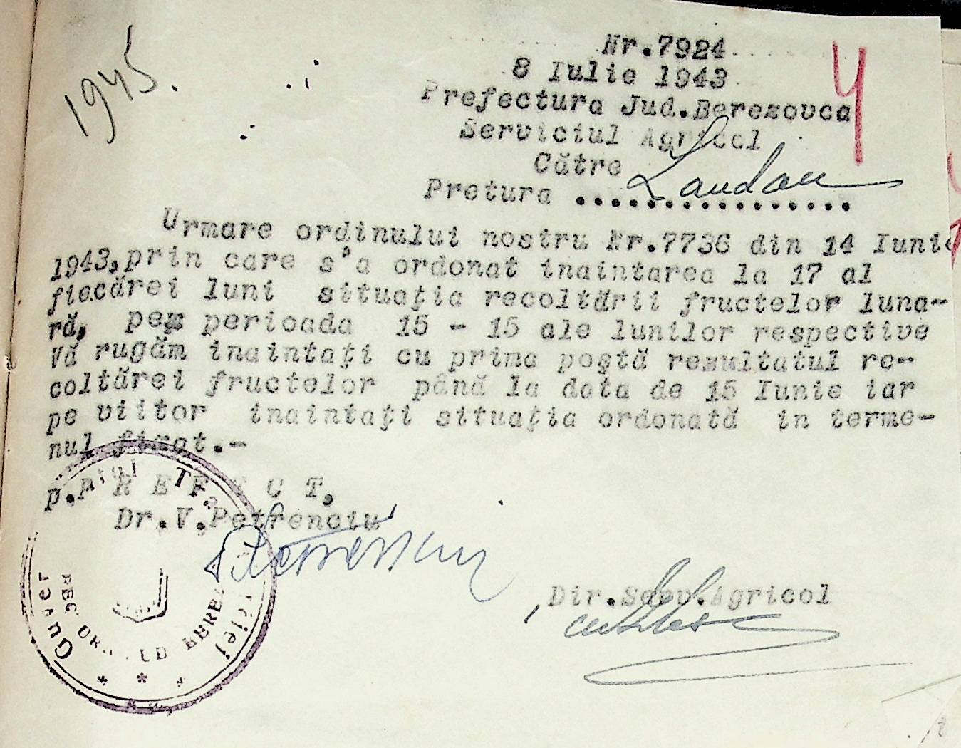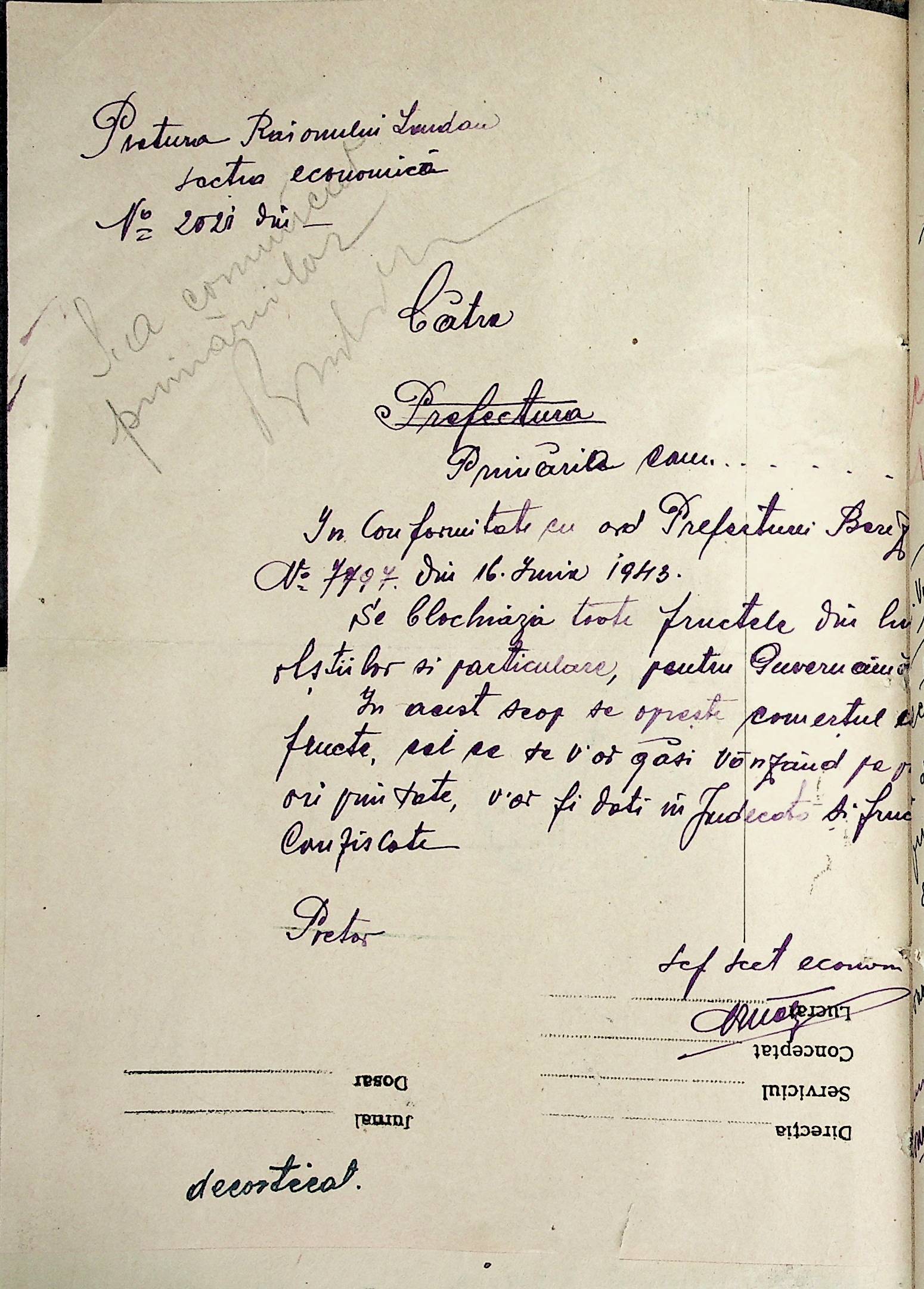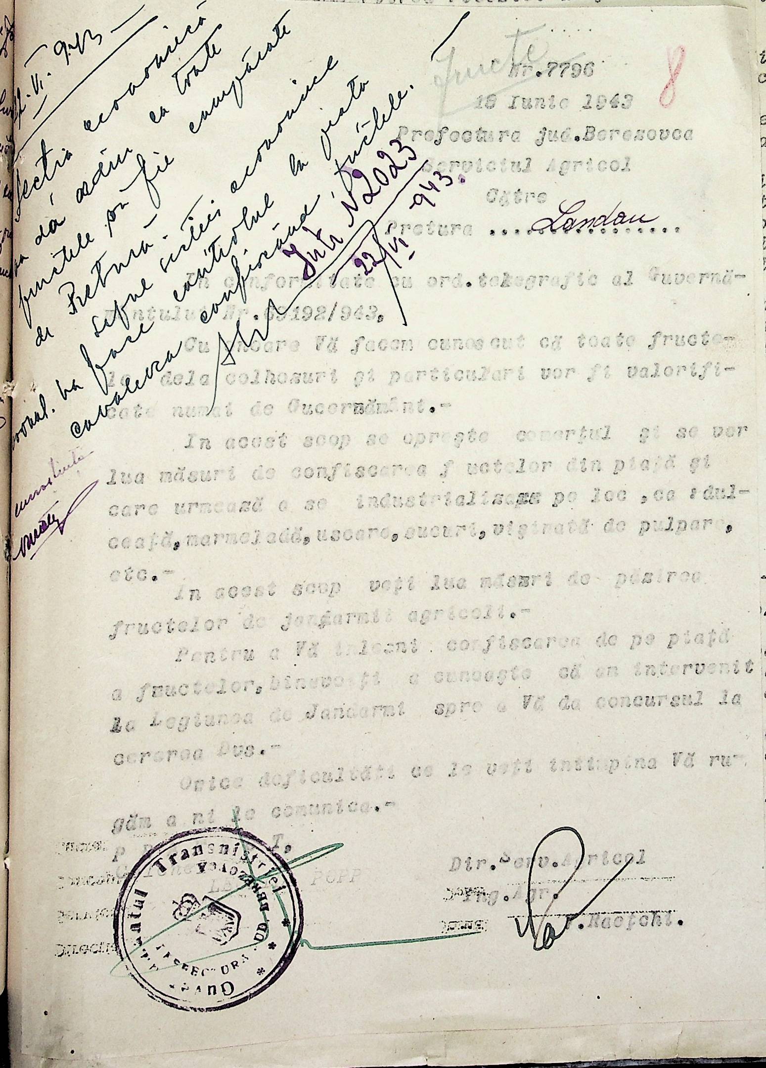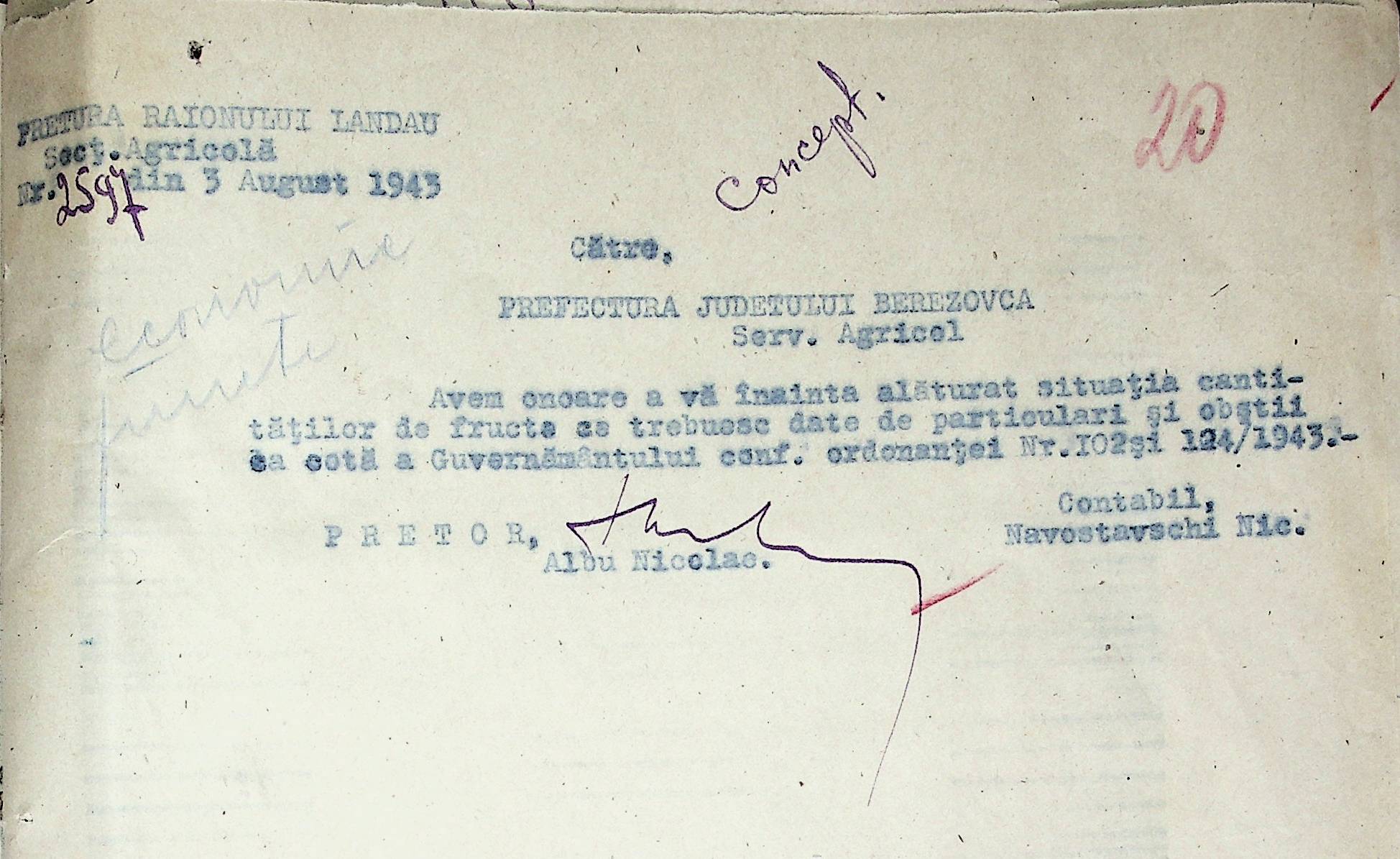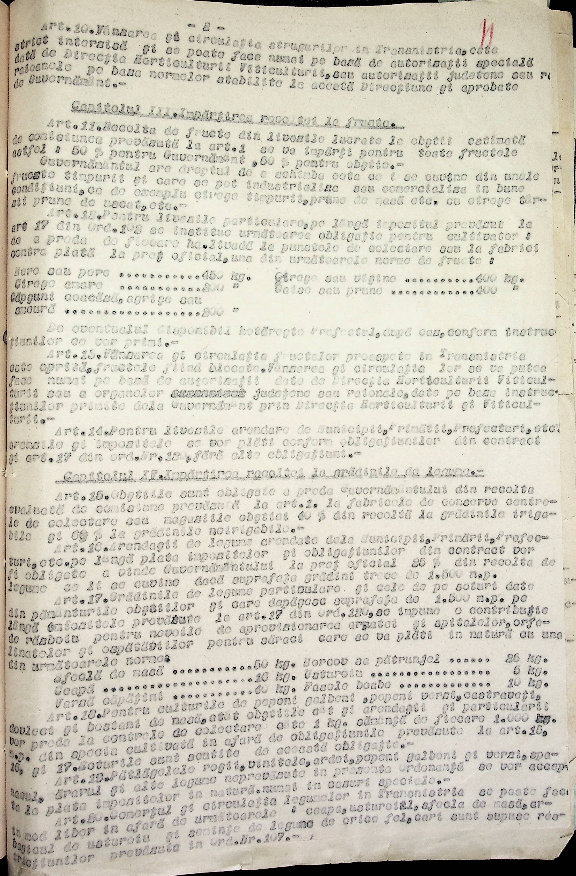 • • • • Справа № 79 Копія наказу цивільного губернатора Трансністрії про розподіл врожаю виноградників, садів і городів, листування з сільськогосподарським відділом префектури Березівського повіту про надання відомостей щодо переробки та консервації фруктів, збору кісточок плодових дерев