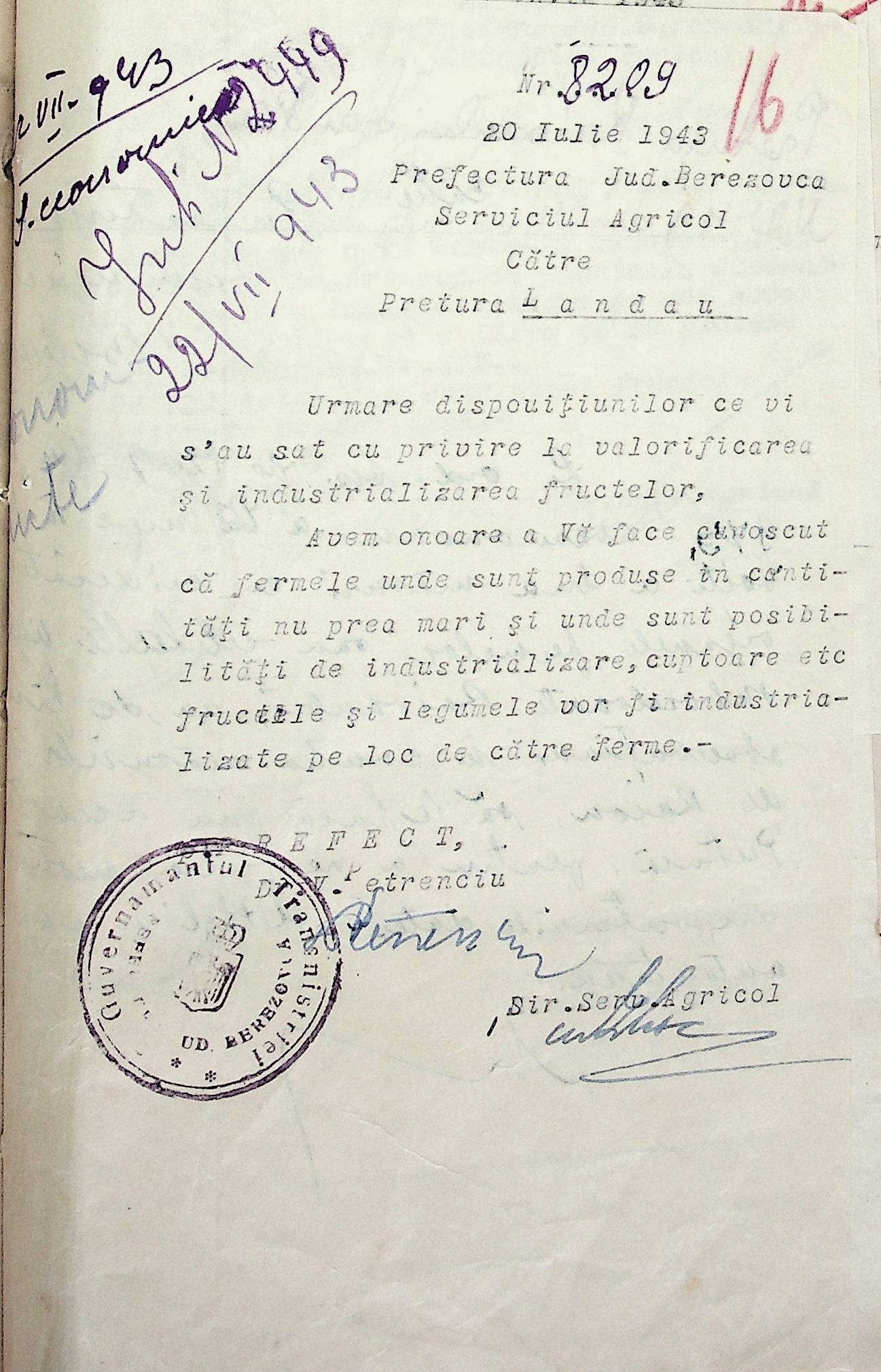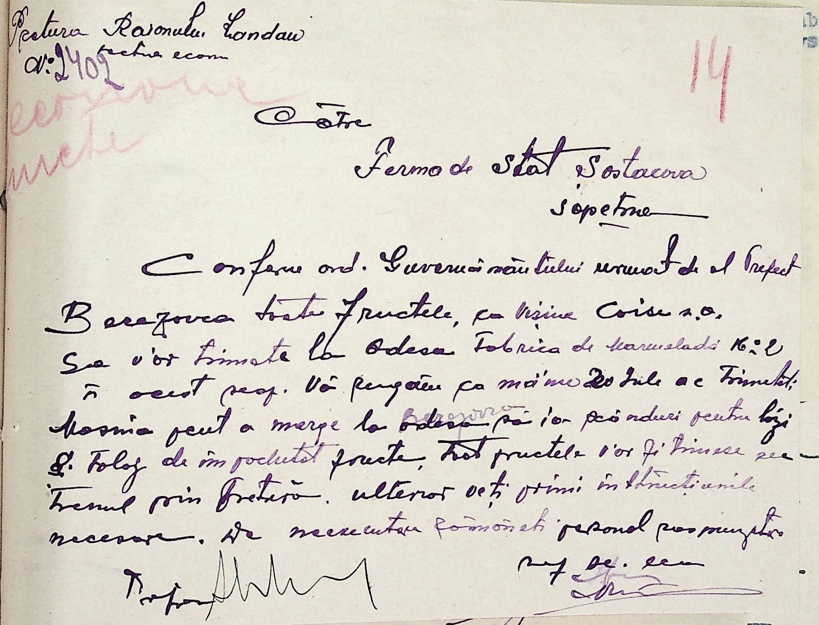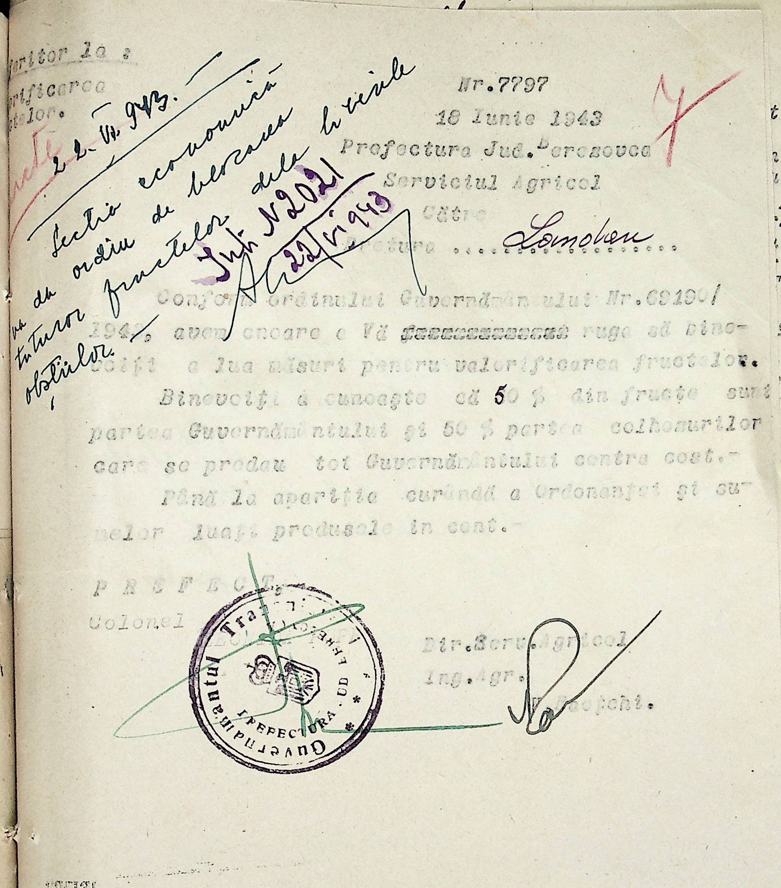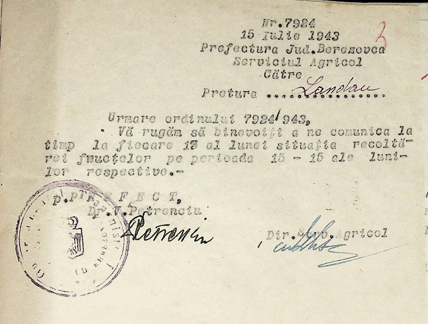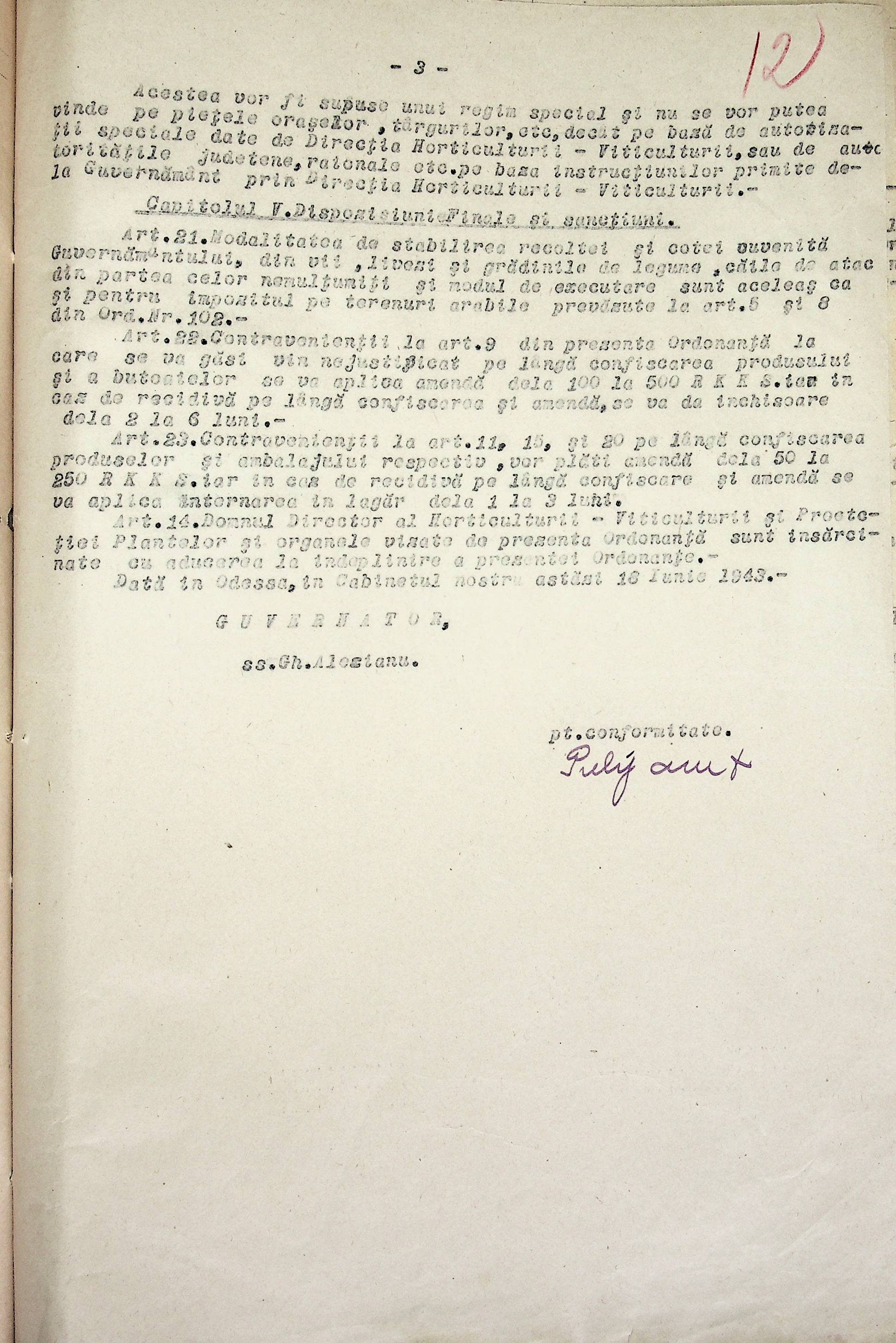 • • • • Справа № 79 Копія наказу цивільного губернатора Трансністрії про розподіл врожаю виноградників, садів і городів, листування з сільськогосподарським відділом префектури Березівського повіту про надання відомостей щодо переробки та консервації фруктів, збору кісточок плодових дерев