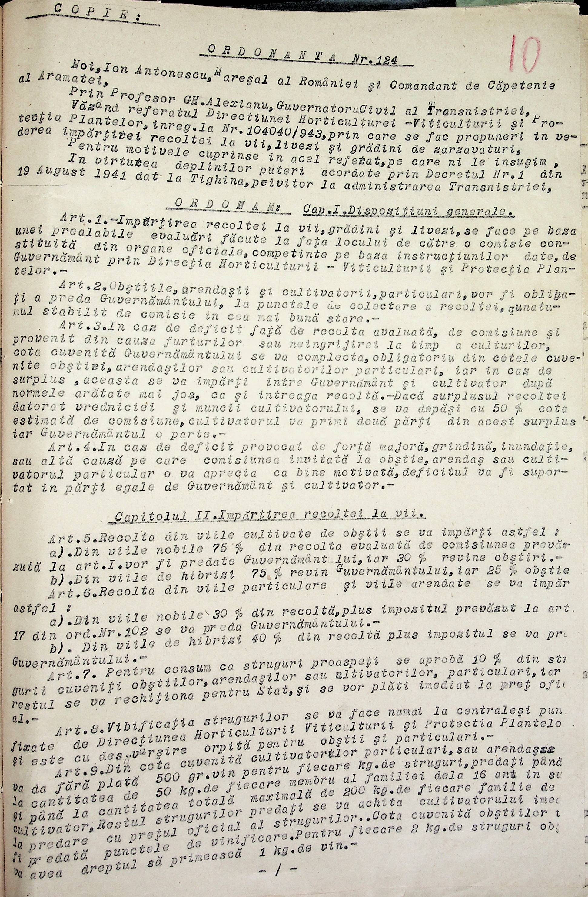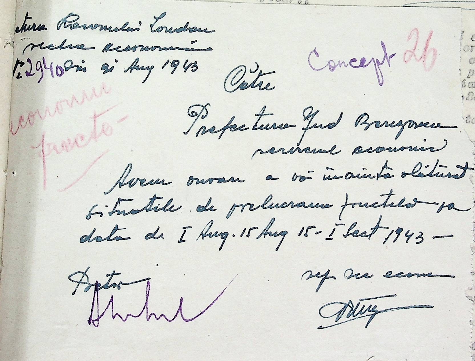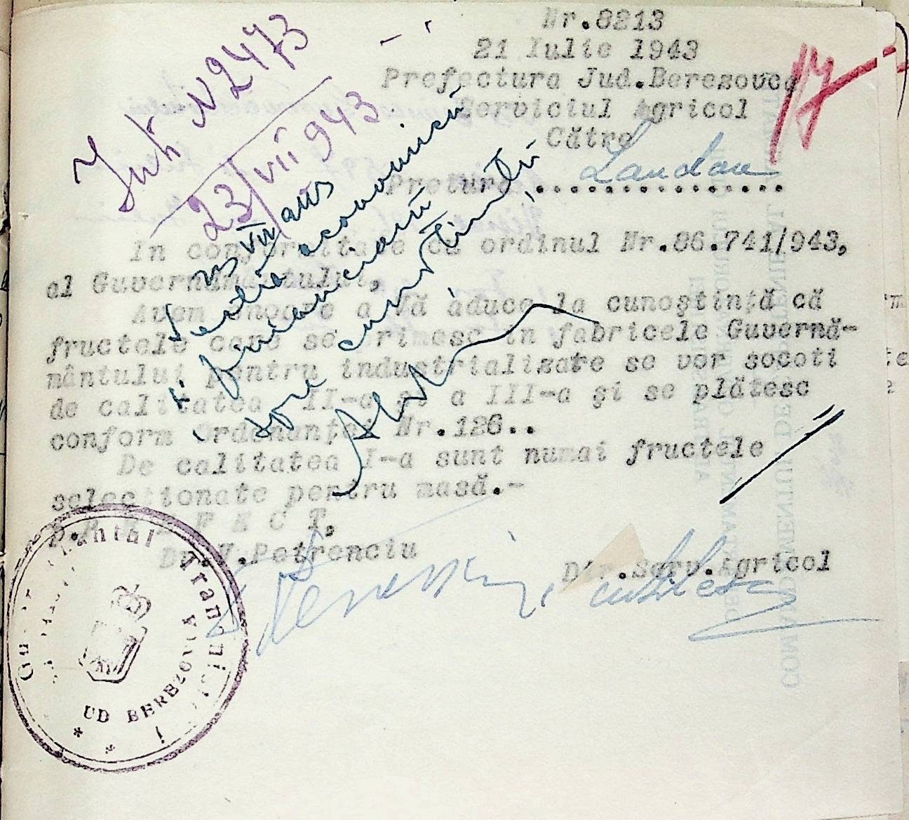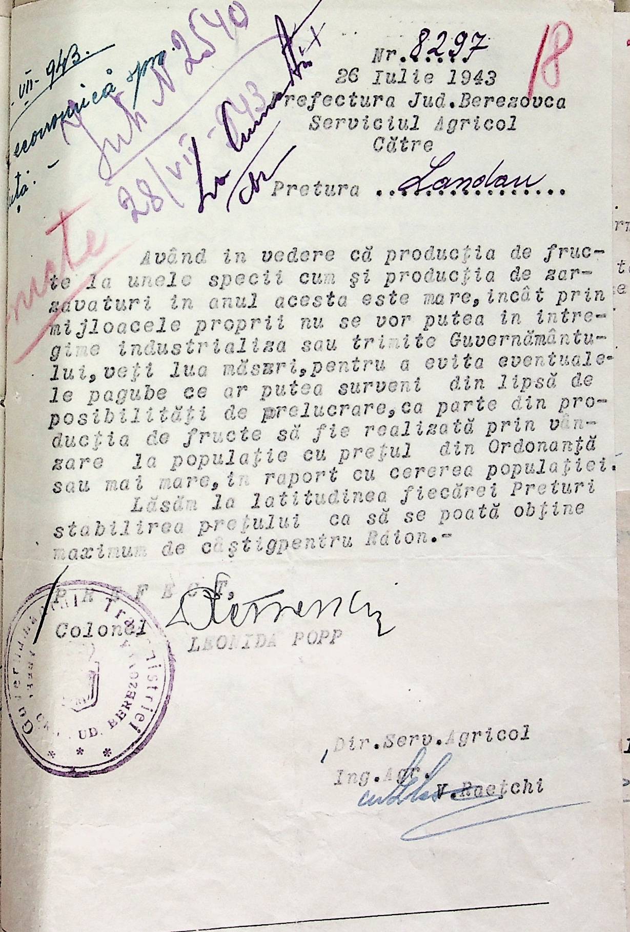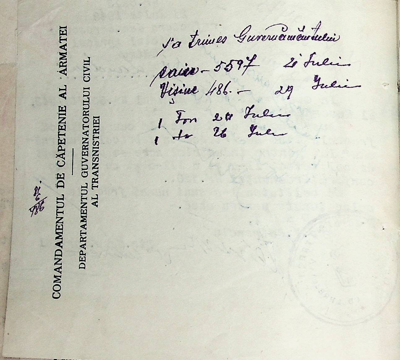 • • • • Справа № 79 Копія наказу цивільного губернатора Трансністрії про розподіл врожаю виноградників, садів і городів, листування з сільськогосподарським відділом префектури Березівського повіту про надання відомостей щодо переробки та консервації фруктів, збору кісточок плодових дерев