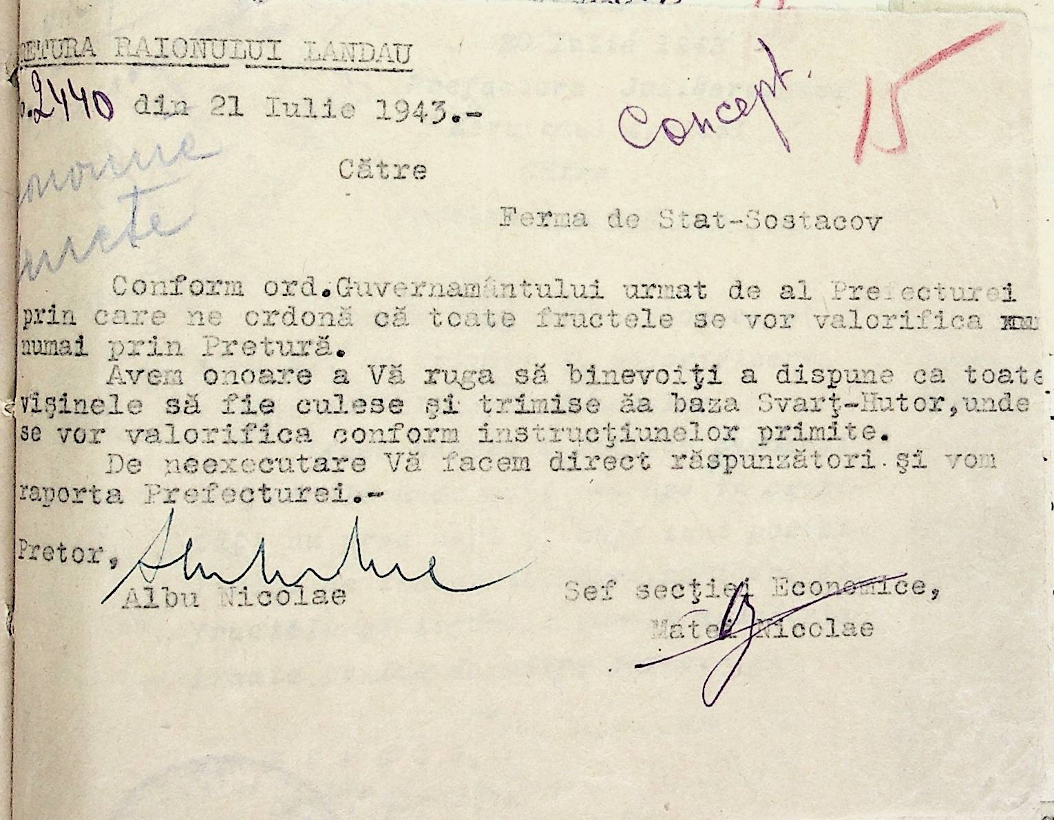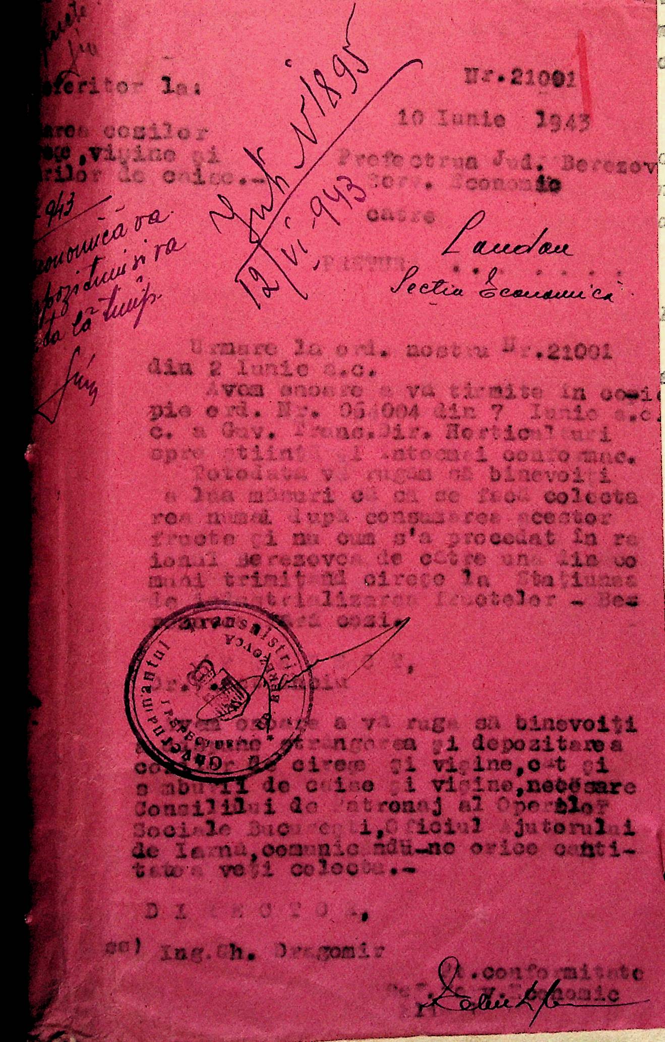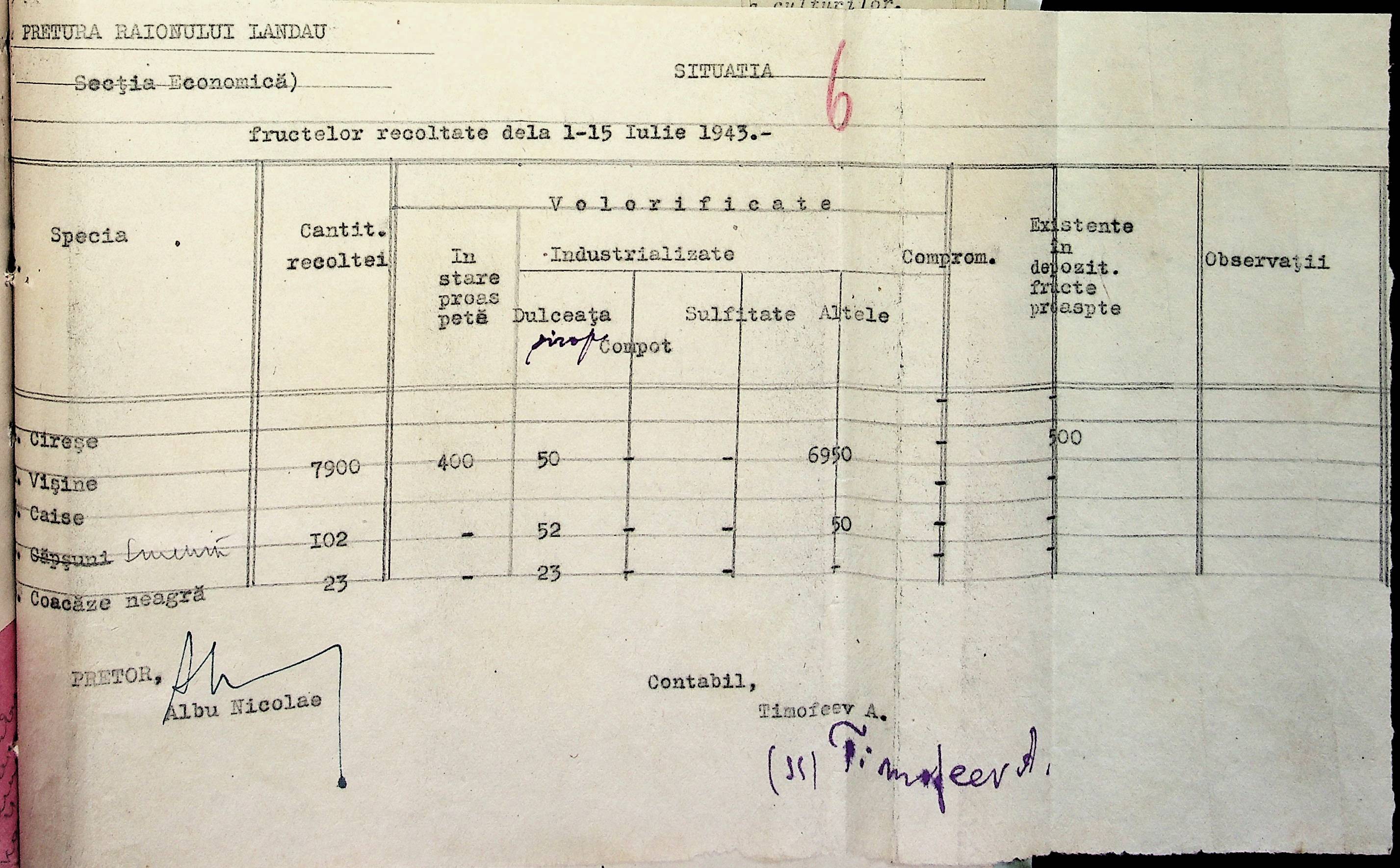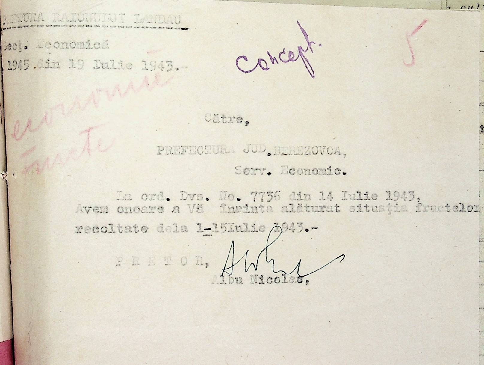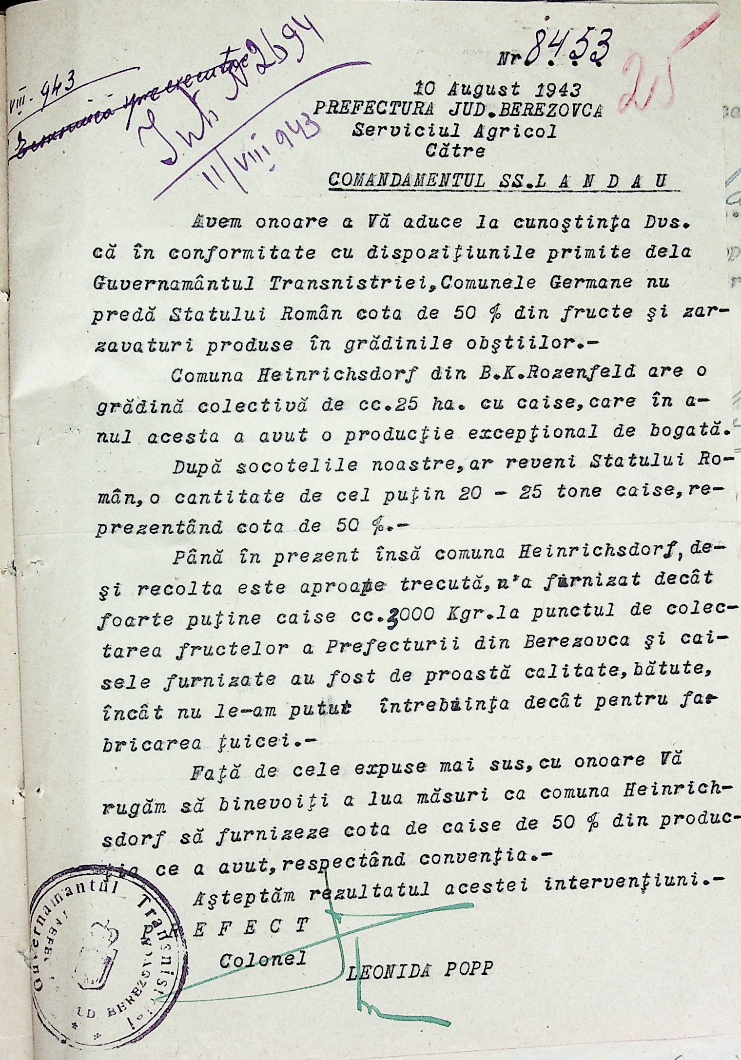 • • • • Справа № 79 Копія наказу цивільного губернатора Трансністрії про розподіл врожаю виноградників, садів і городів, листування з сільськогосподарським відділом префектури Березівського повіту про надання відомостей щодо переробки та консервації фруктів, збору кісточок плодових дерев