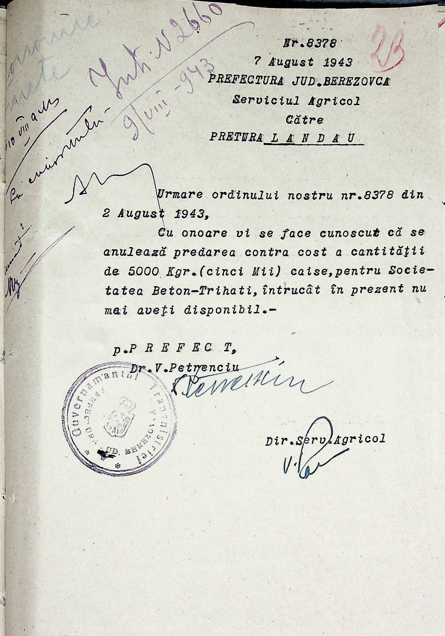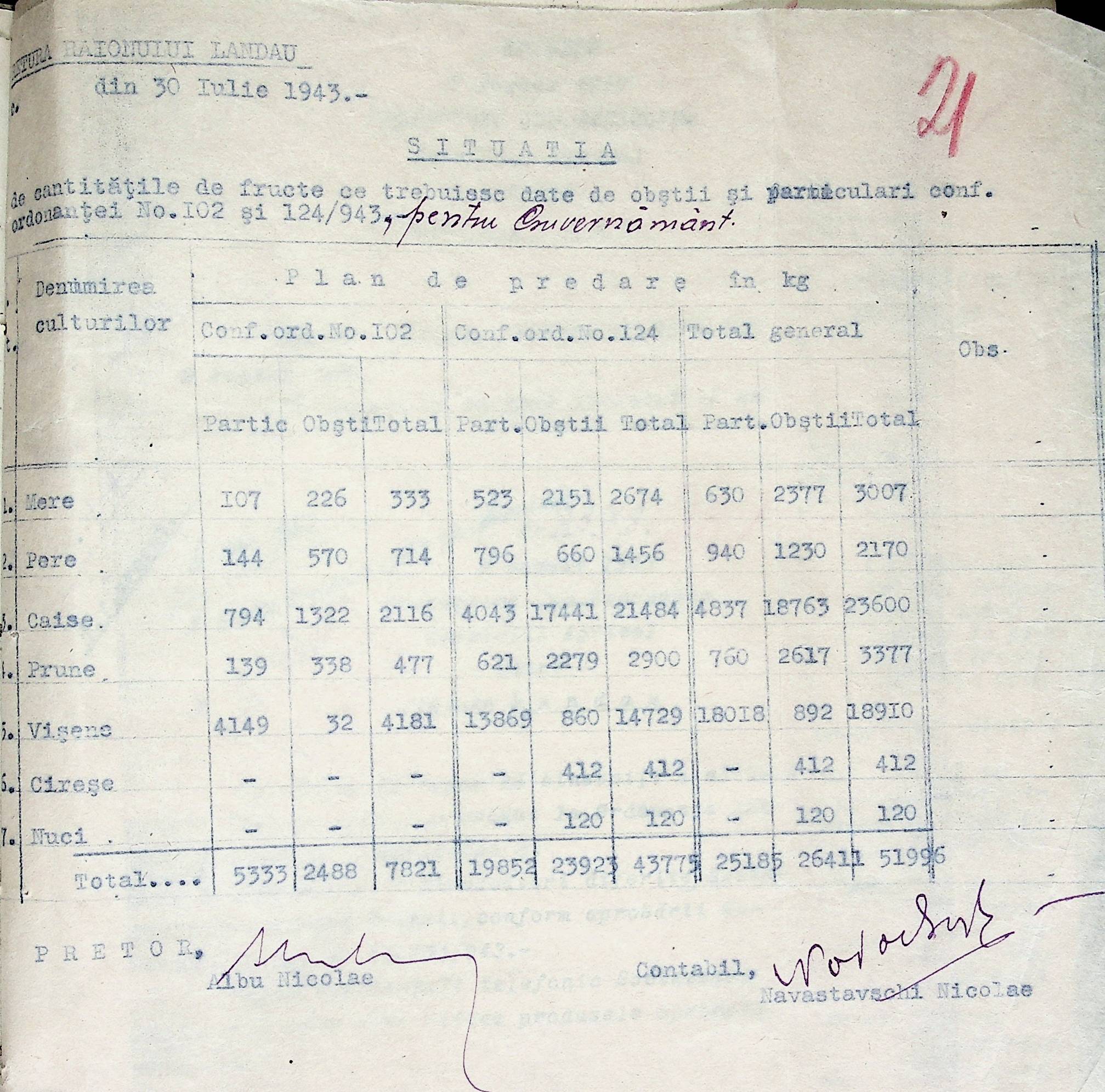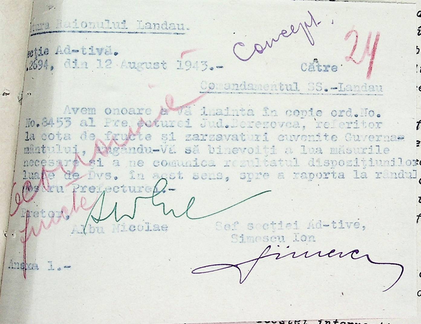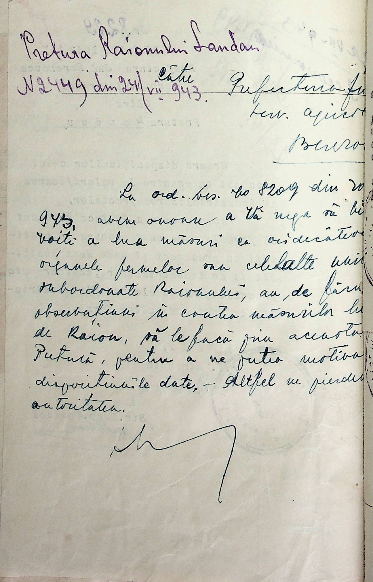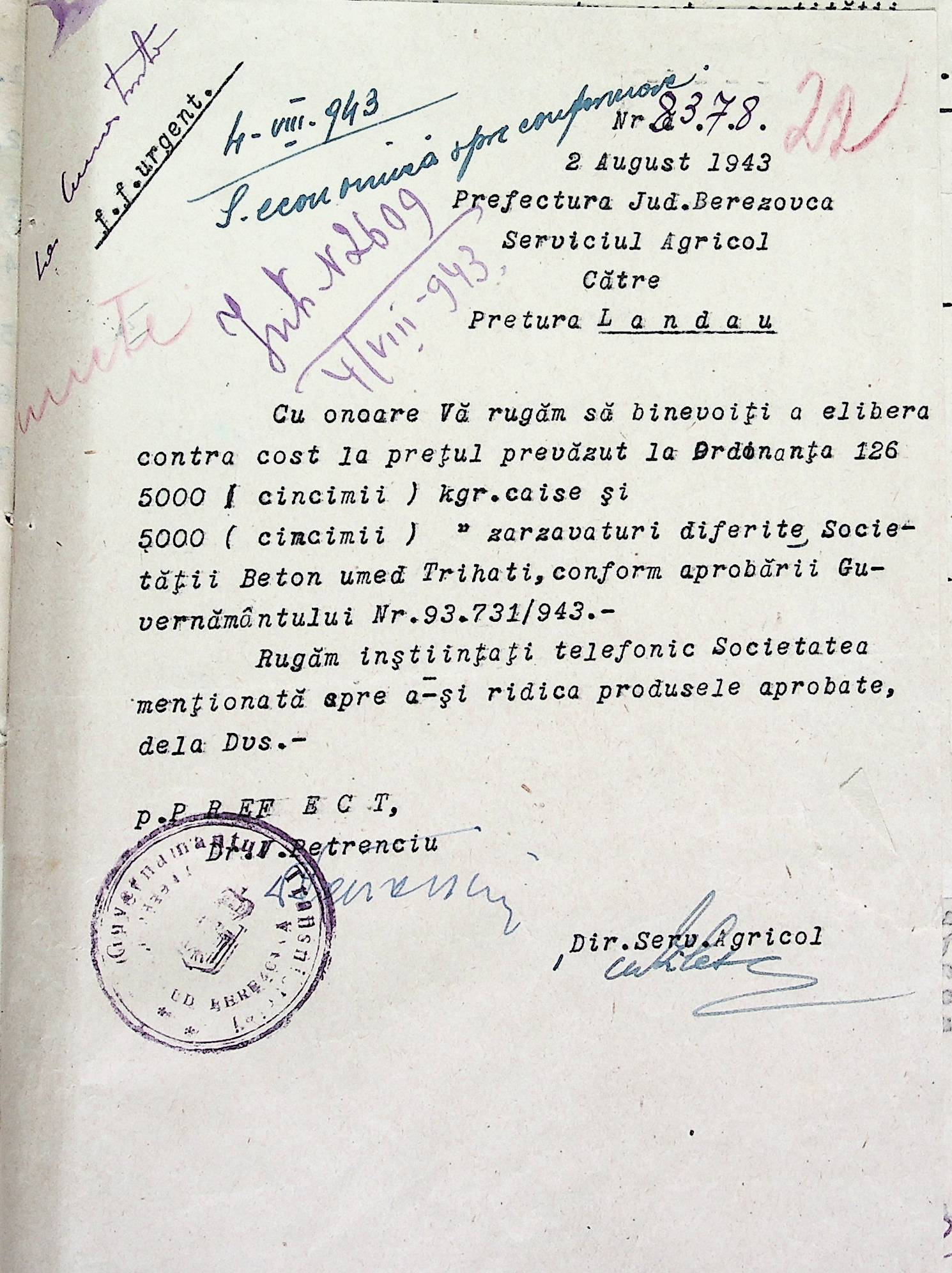 • • • • Справа № 79 Копія наказу цивільного губернатора Трансністрії про розподіл врожаю виноградників, садів і городів, листування з сільськогосподарським відділом префектури Березівського повіту про надання відомостей щодо переробки та консервації фруктів, збору кісточок плодових дерев