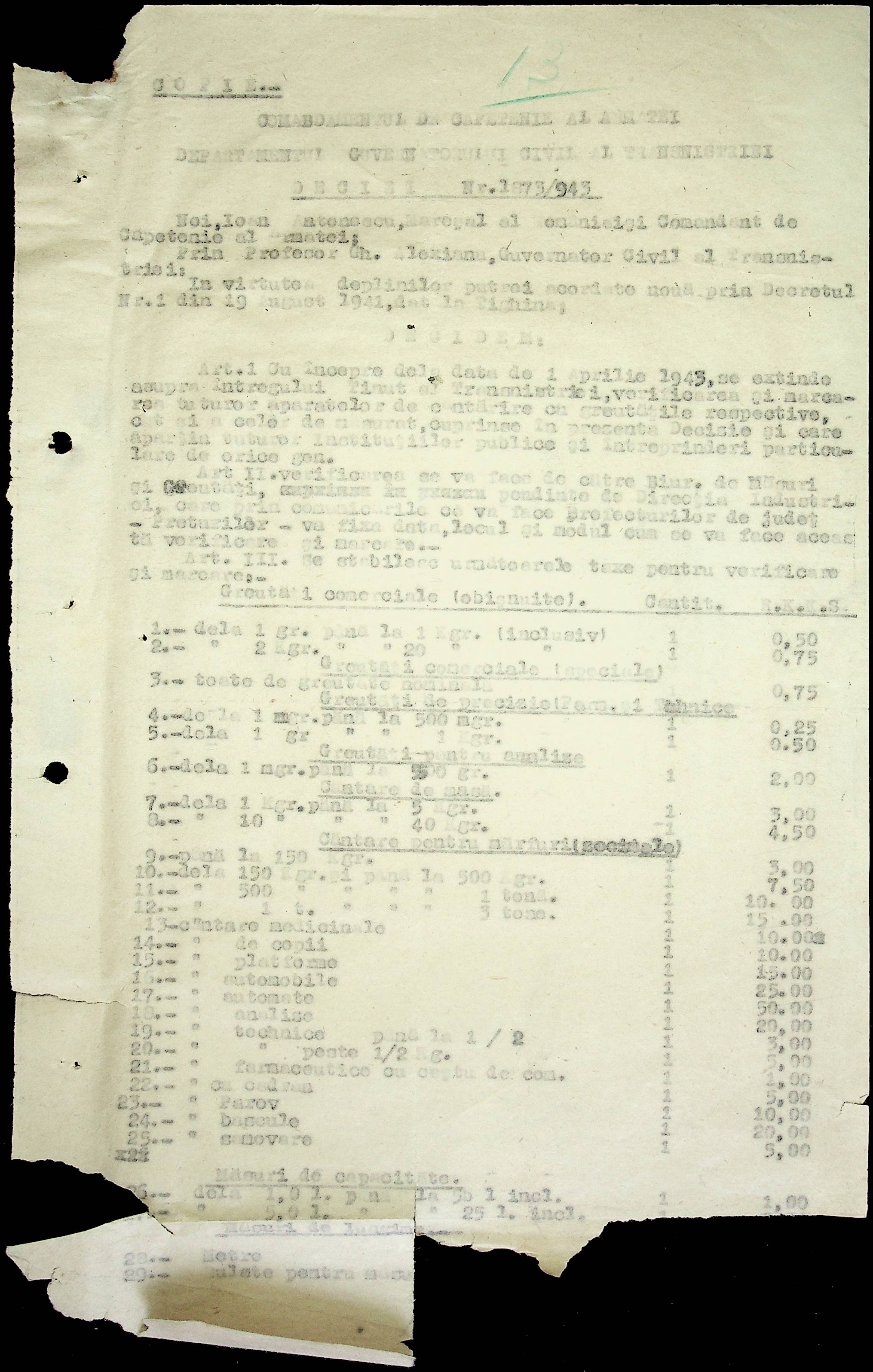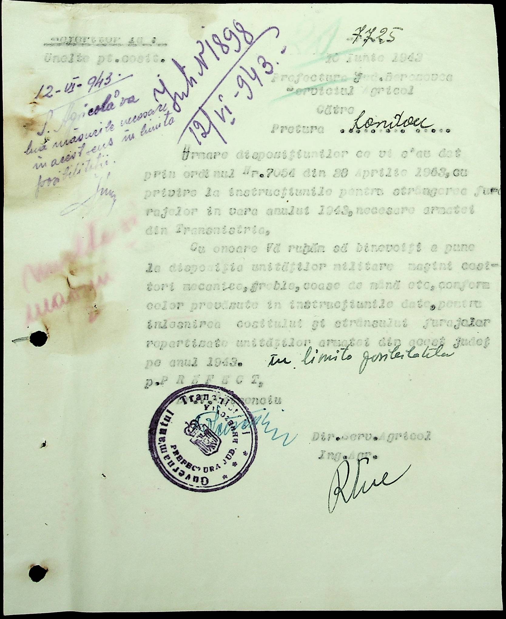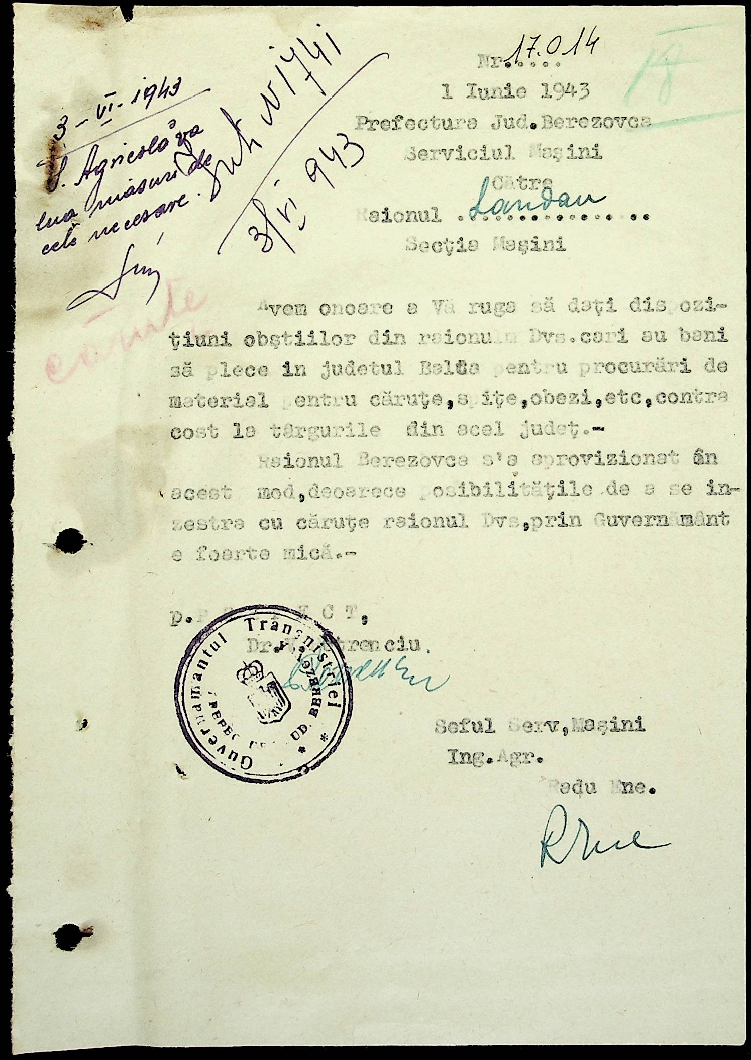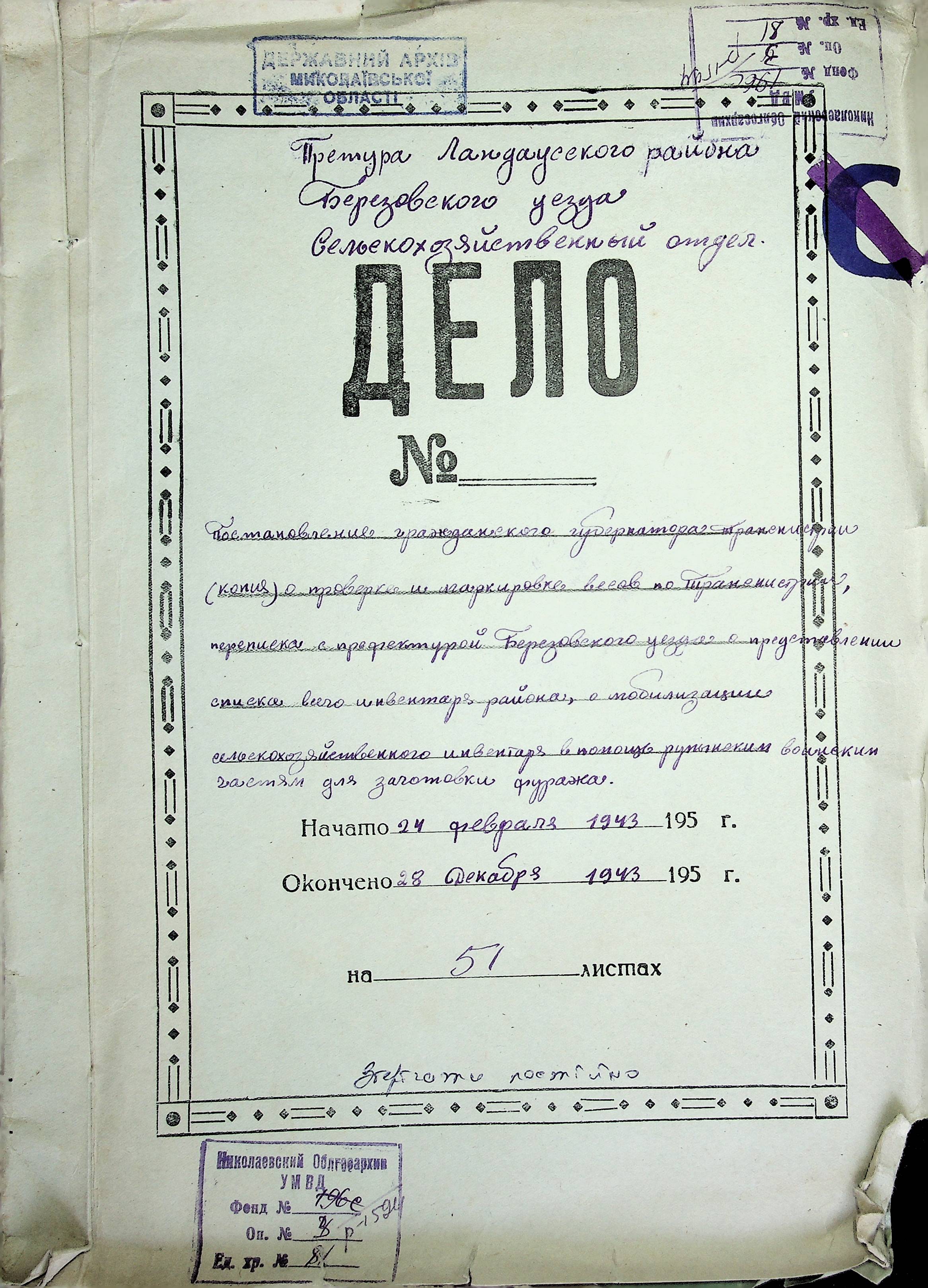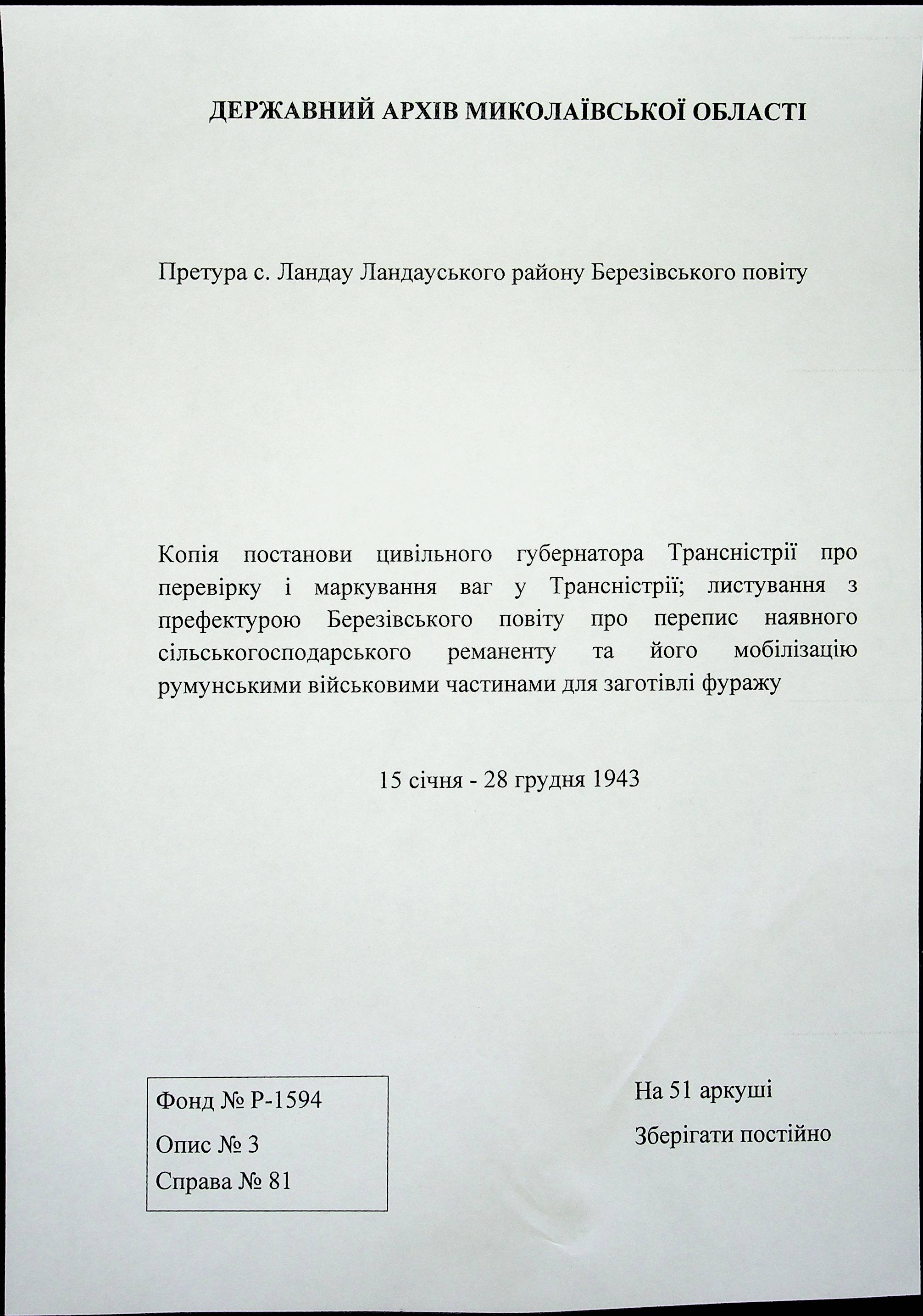 • • • • Справа № 81 Копія постанови цивільного губернатора Трансністрії про перевірку і маркування ваг у Трансністрії; листування з префектурою Березівського повіту про перепис наявного сільськогосподарського реманенту та його мобілізацію румунськими військовими частинами для заготівлі фуражу