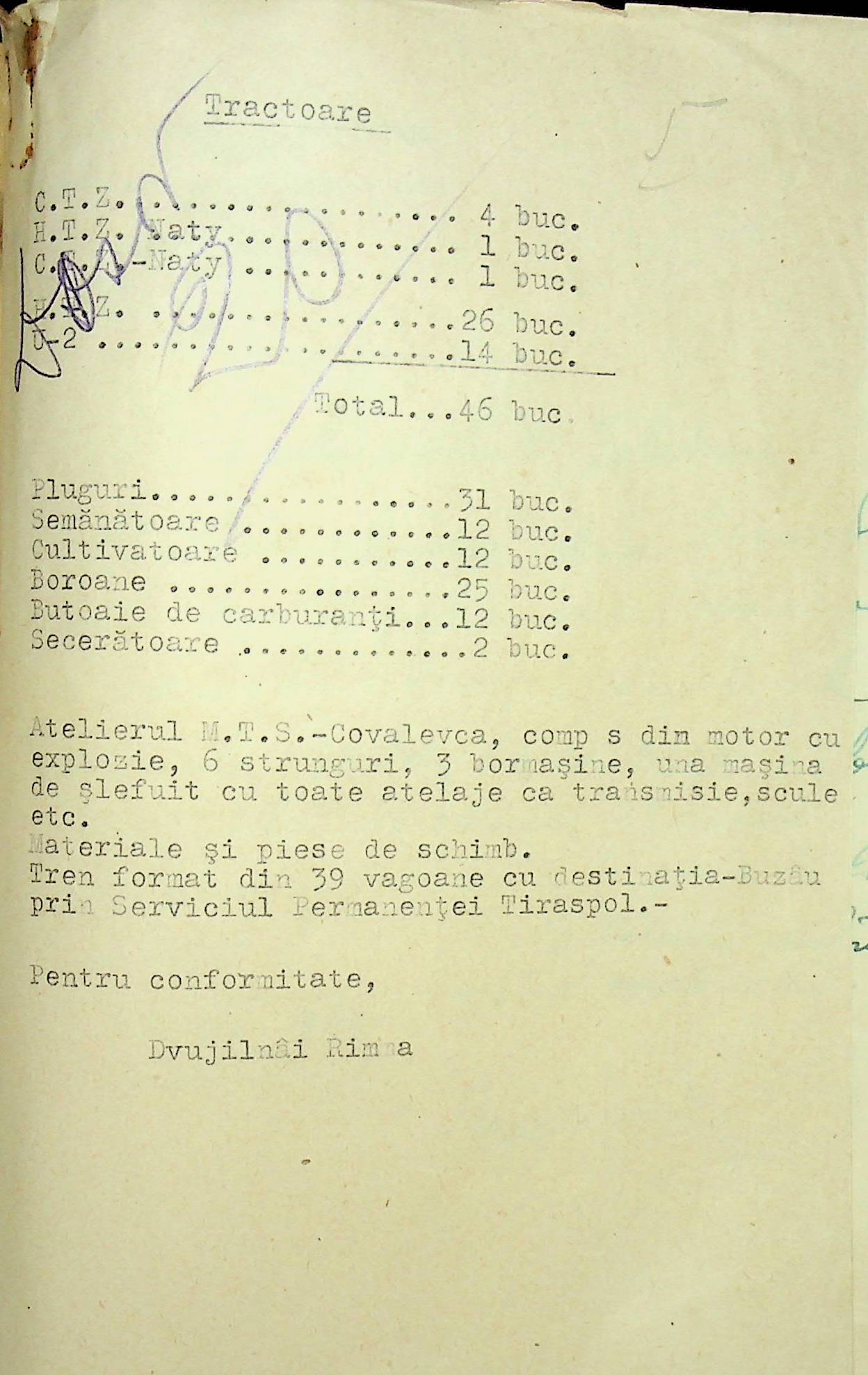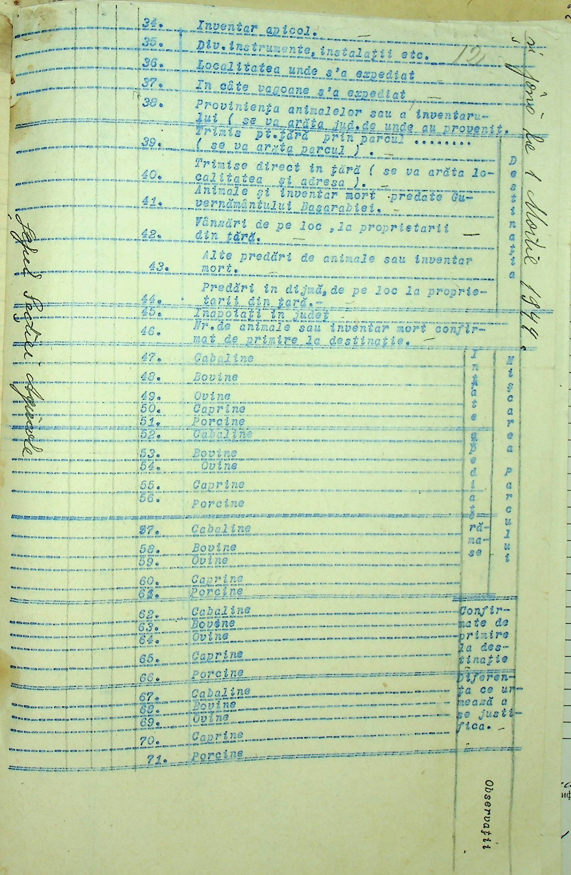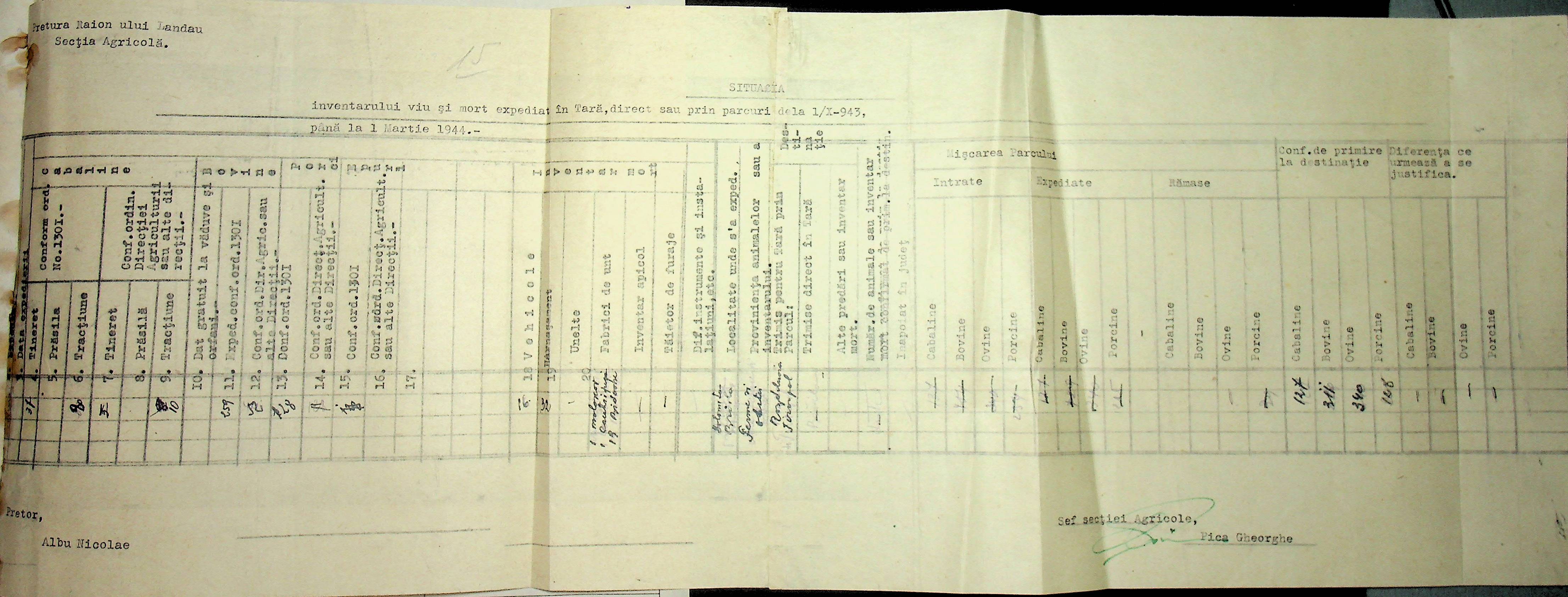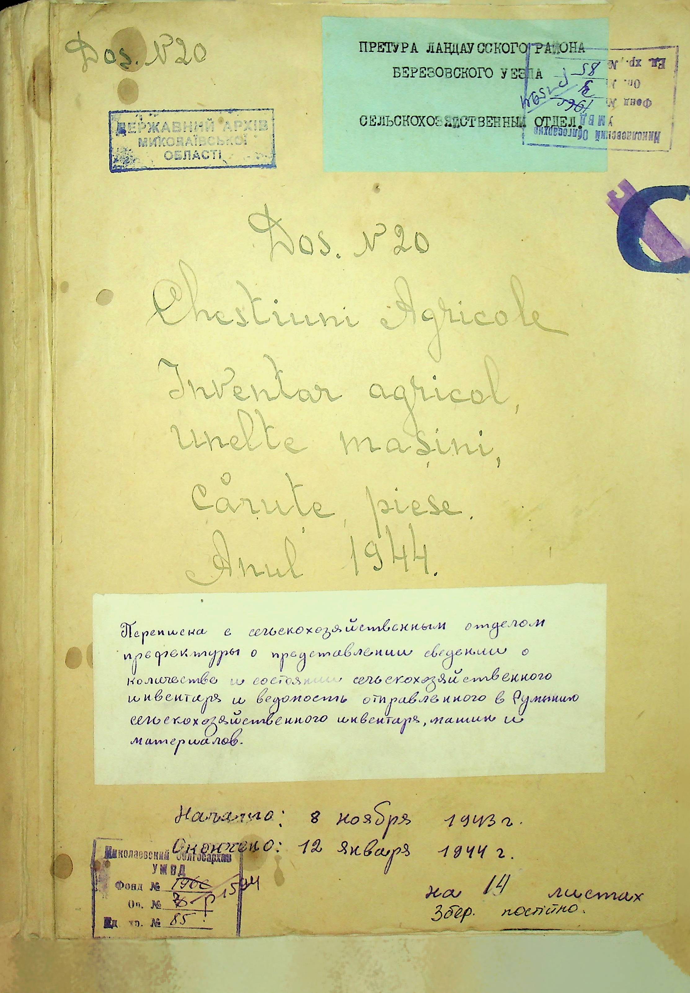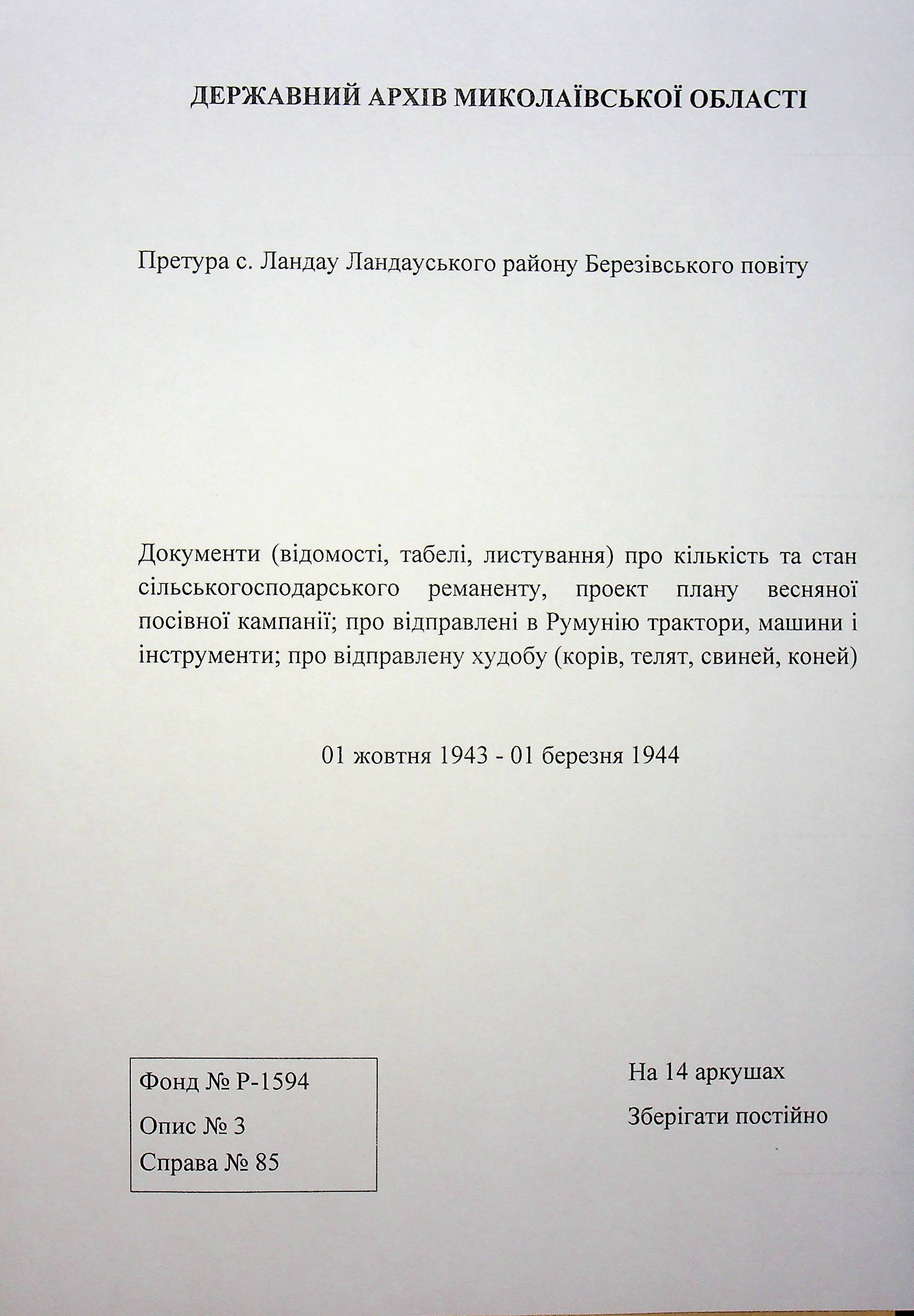 • • • • Справа № 85 Документи (відомості, табелі, листування) про кількість та стан сільськогосподарського реманенту, проект плану весняної посівної кампанії; про відправлені в Румунію трактори, машини і інструменти; про відправлену худобу (корів, телят, свиней, коней)