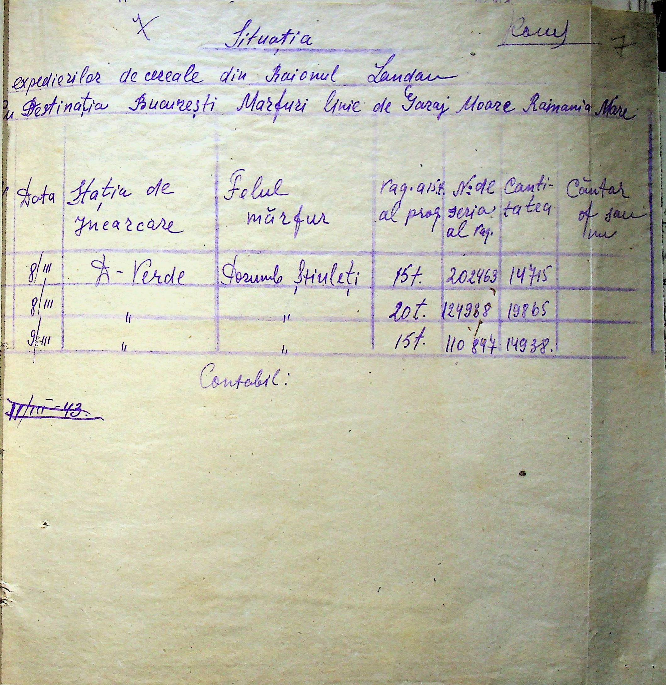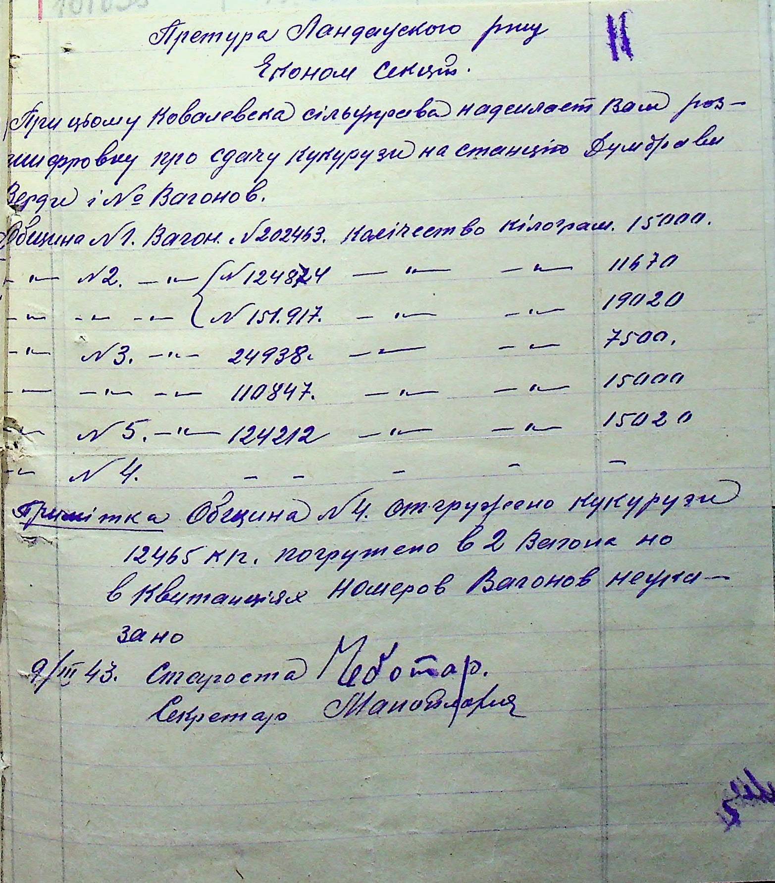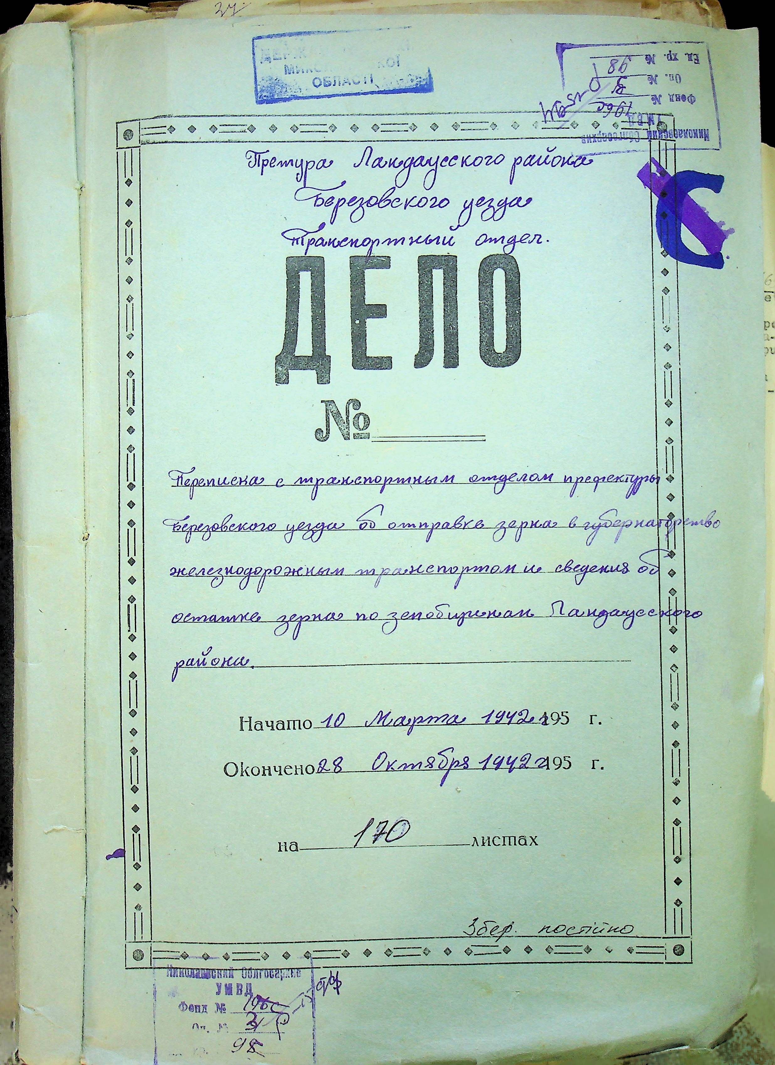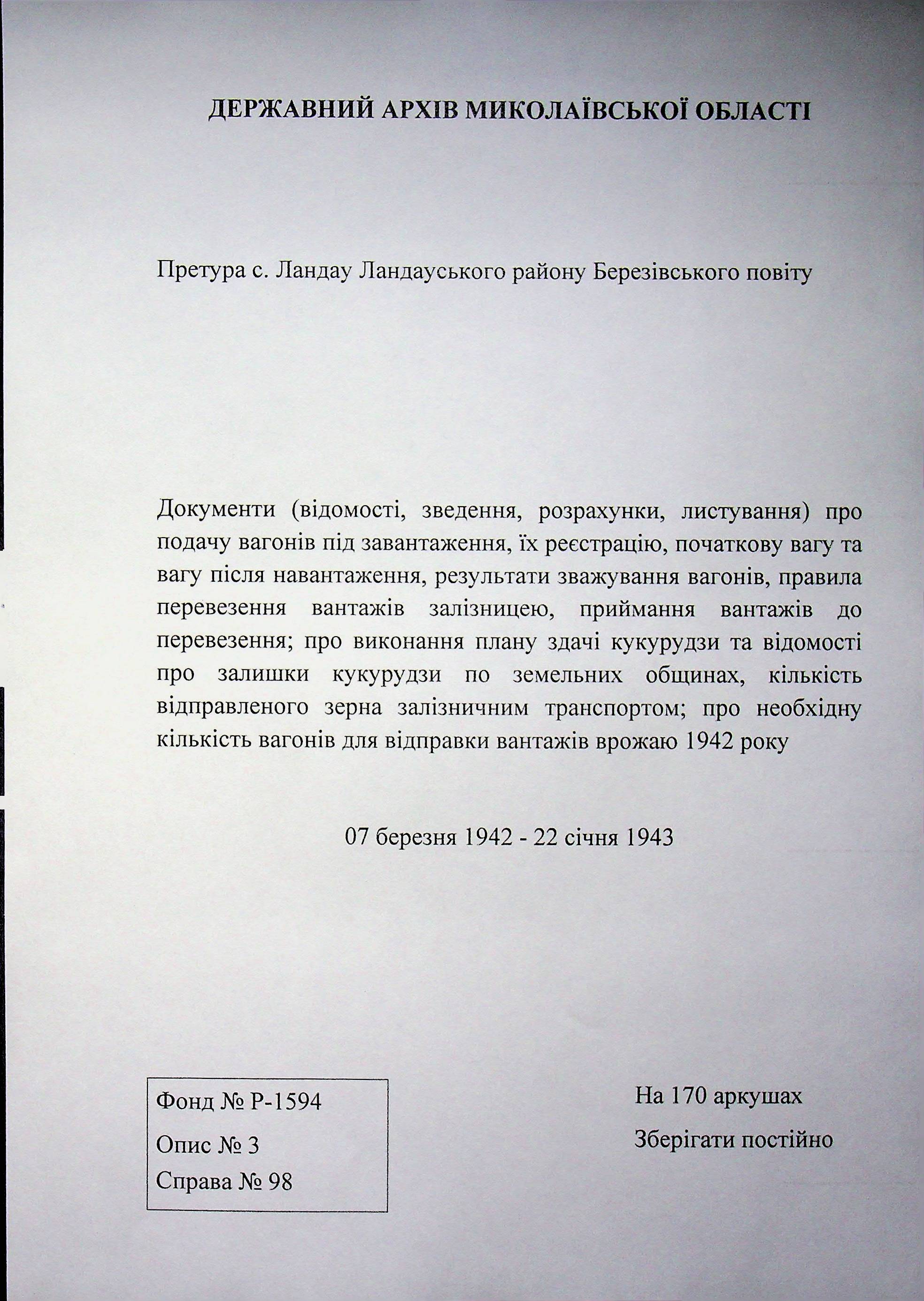 • • • • Справа № 98 Документи (відомості, зведення, розрахунки, листування) про подачу вагонів під завантаження, їх реєстрацію, початкову вагу та вагу після навантаження, результати зважування вагонів, правила перевезення вантажів залізницею, приймання вантажів до перевезення; про виконання плану здачі кукурудзи та відомості про залишки кукурудзи по земельних общинах, кількість відправленого зерна залізничним транспортом; про необхідну кількість вагонів для відправки вантажів врожаю 1942 року