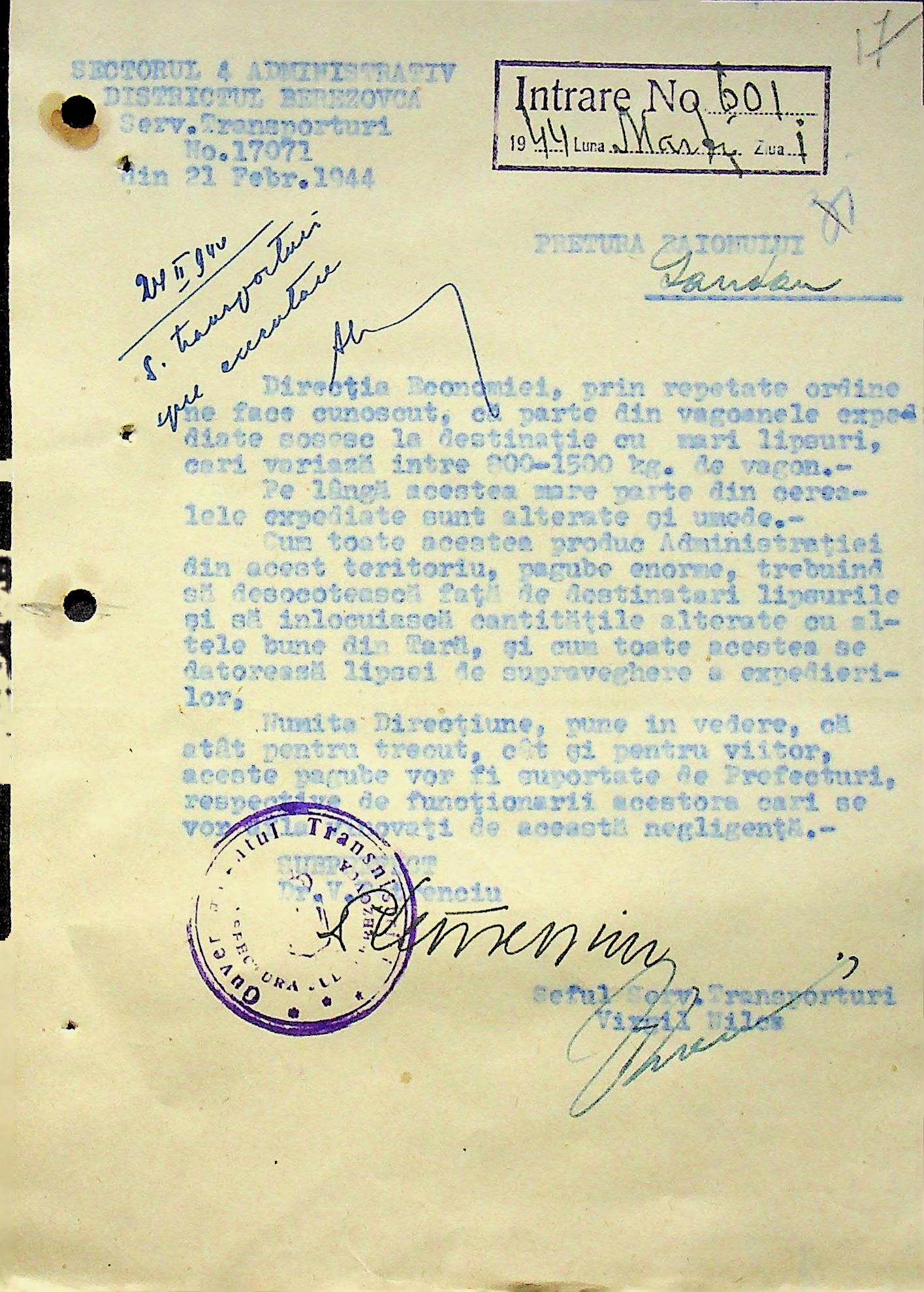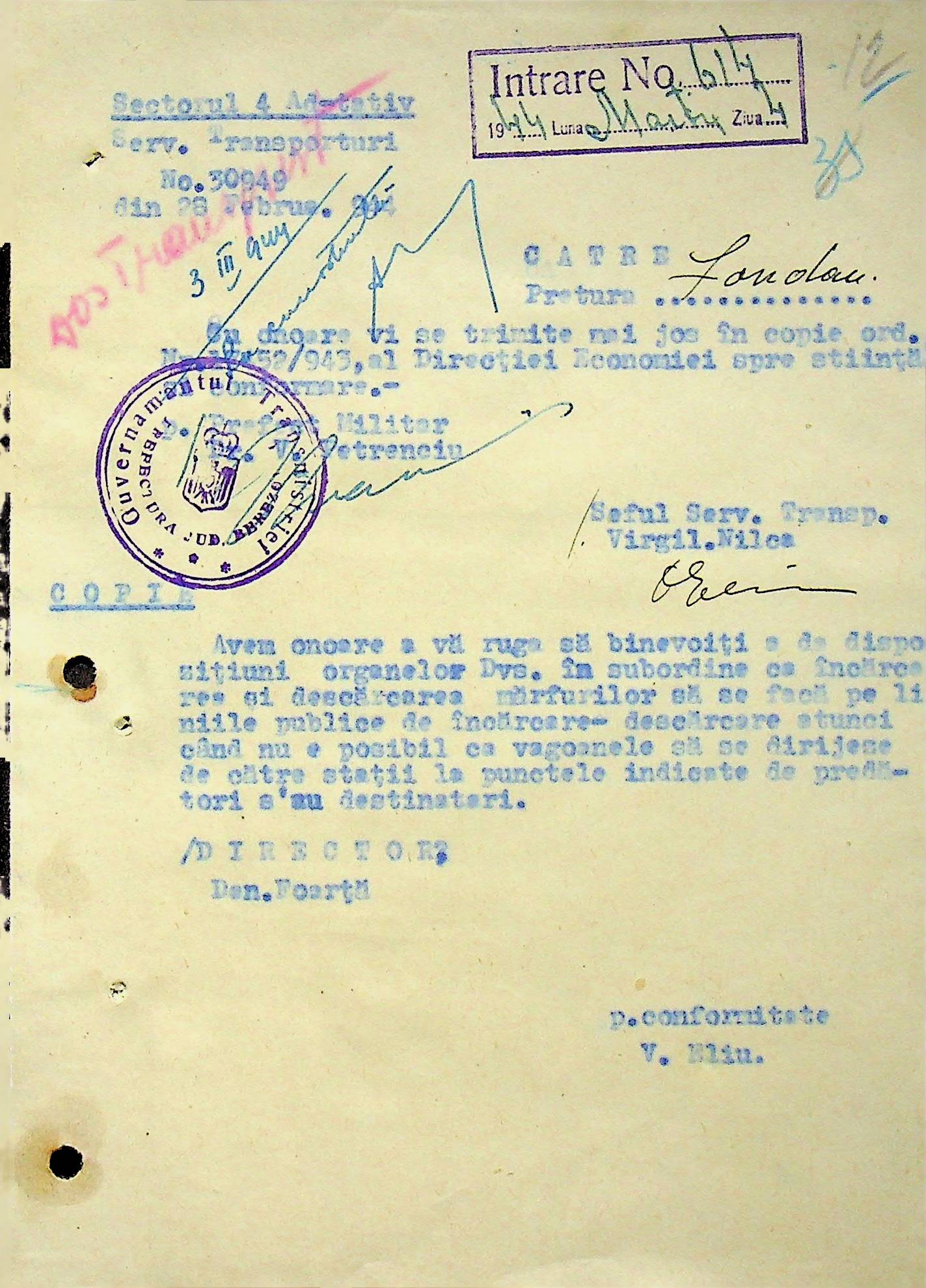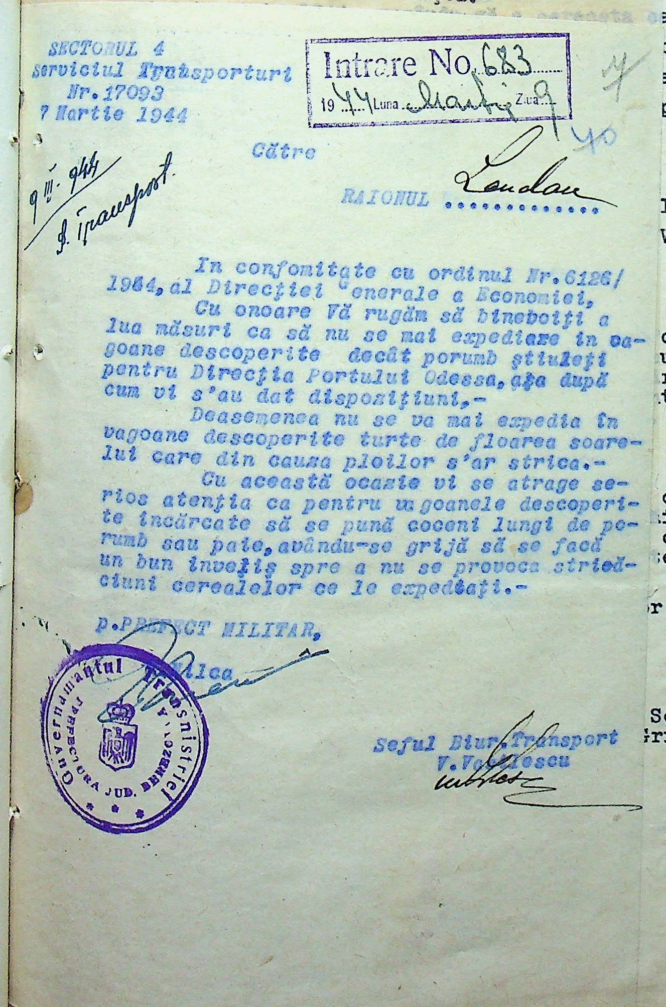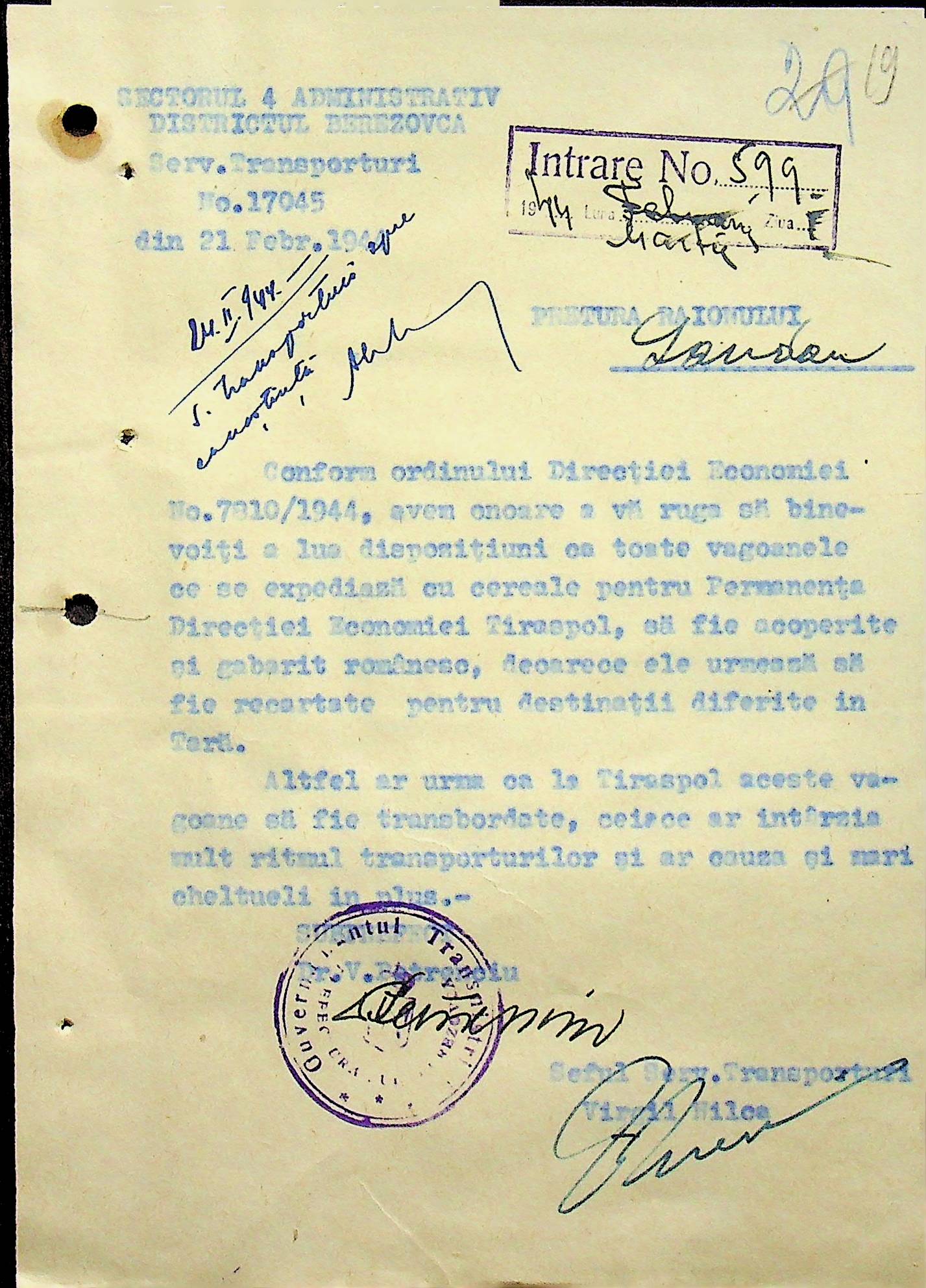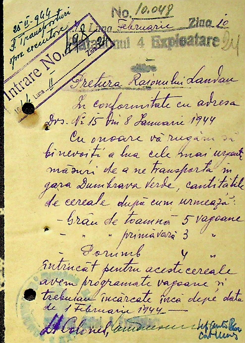 • • • • Справа № 101 Документи (обіжник-замовлення, протокол, листування) про порядок прийому на роботу, доставку вагонів для відвантаження плодоовочевої продукції, перевезення вантажів у вагонах відкритого типу, завантаження та розвантаження критих вагонів, підготовку вагонів для відправки зерна в Румунію, супровідні документи на відвантажену продукцію і матеріали