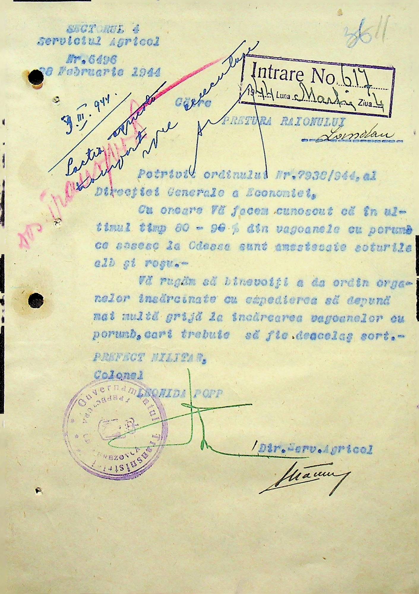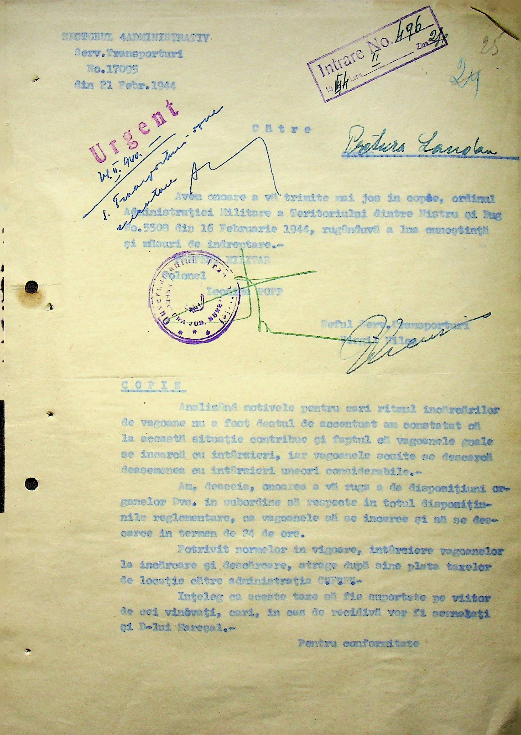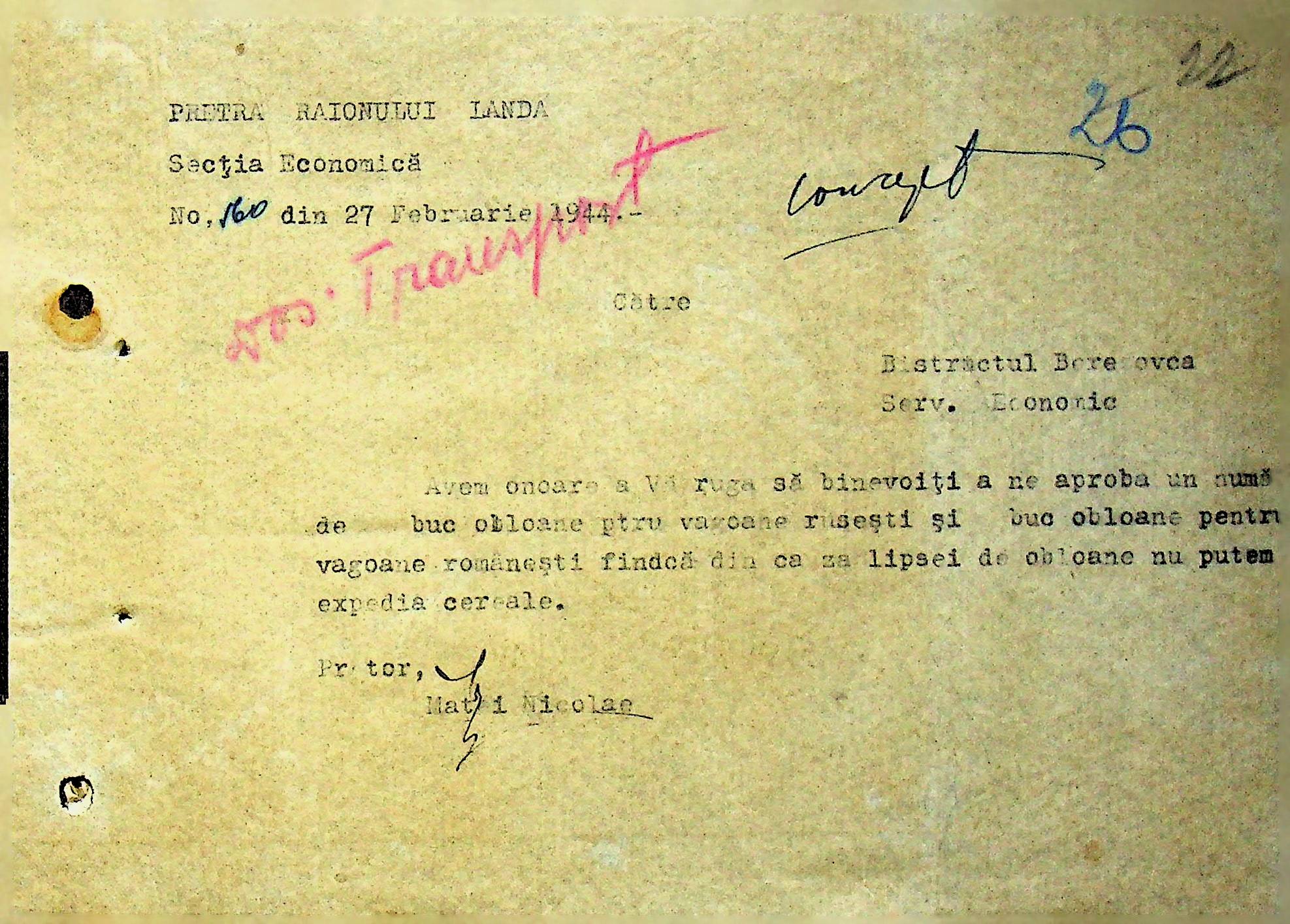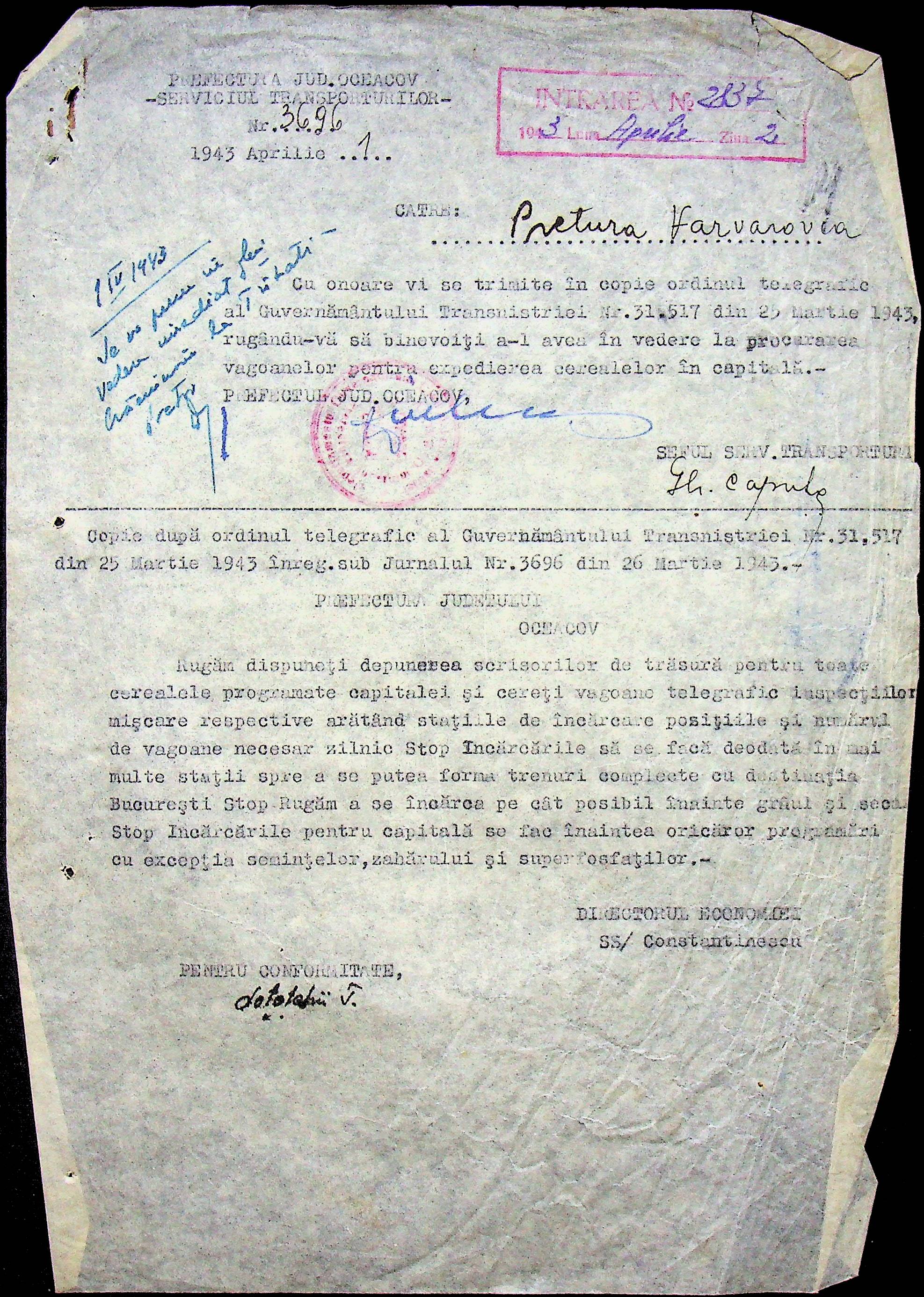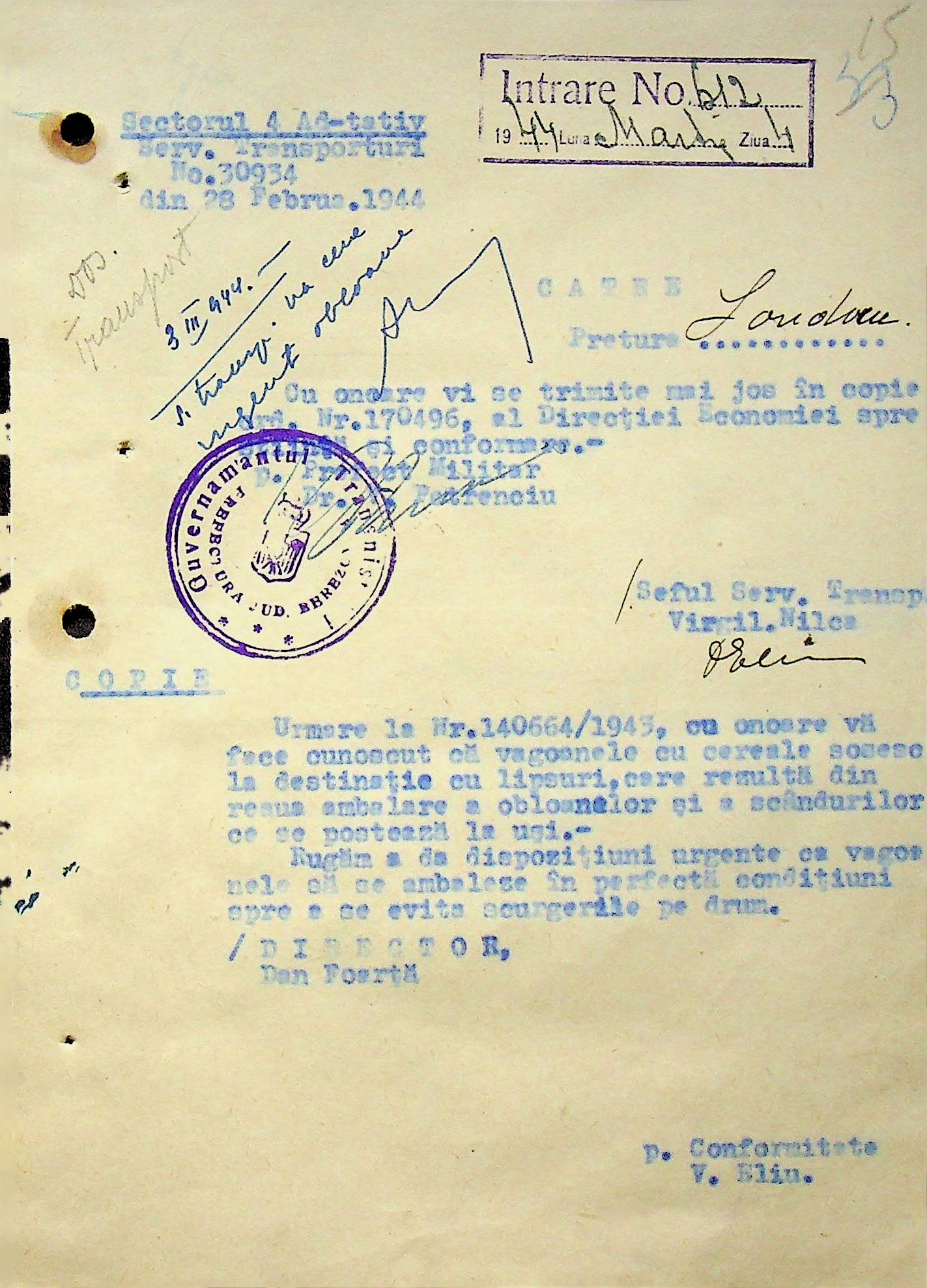 • • • • Справа № 101 Документи (обіжник-замовлення, протокол, листування) про порядок прийому на роботу, доставку вагонів для відвантаження плодоовочевої продукції, перевезення вантажів у вагонах відкритого типу, завантаження та розвантаження критих вагонів, підготовку вагонів для відправки зерна в Румунію, супровідні документи на відвантажену продукцію і матеріали