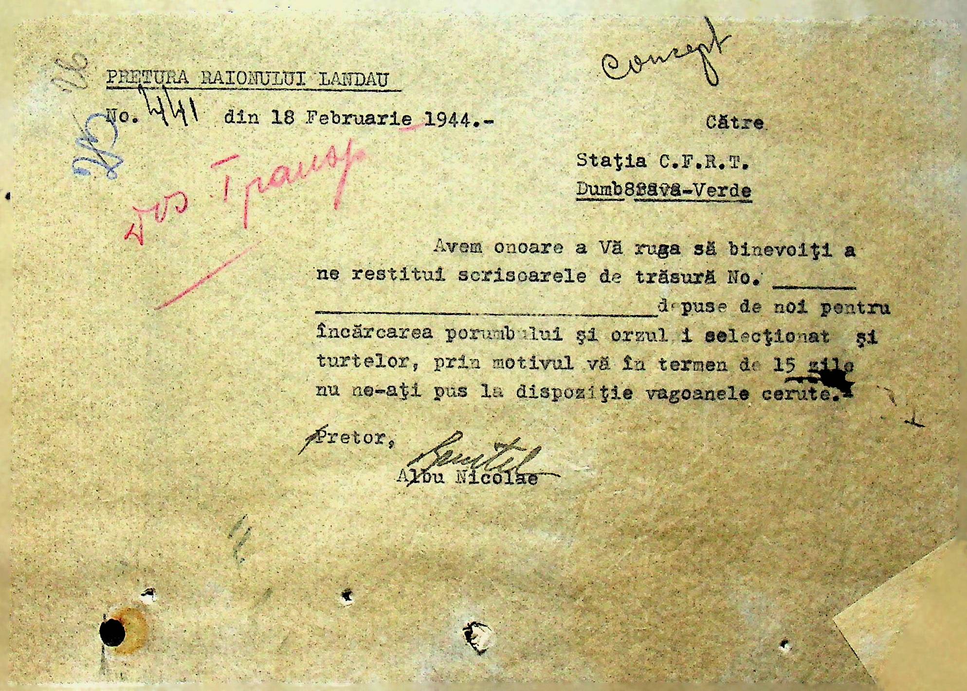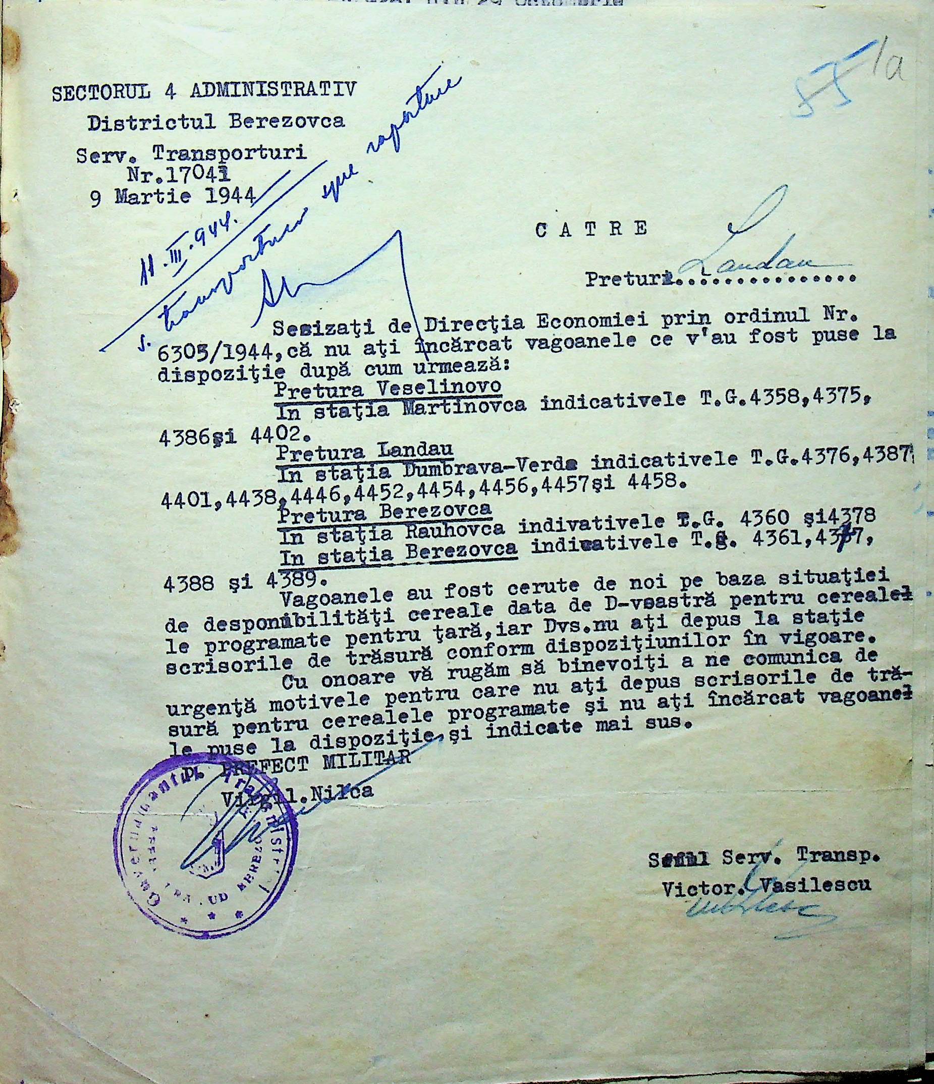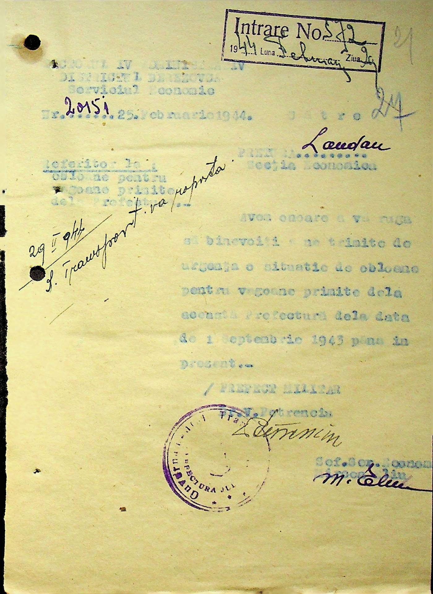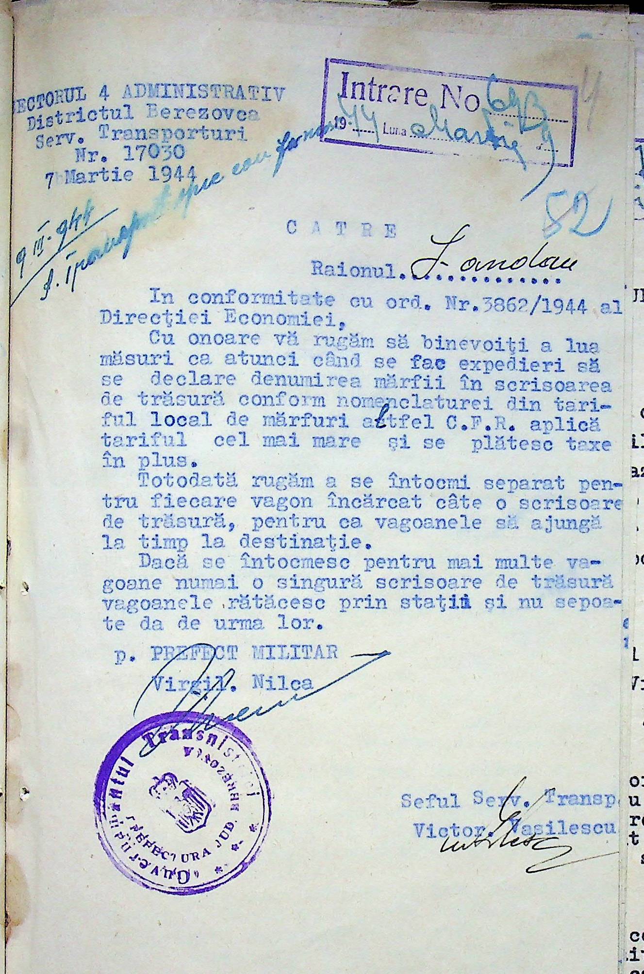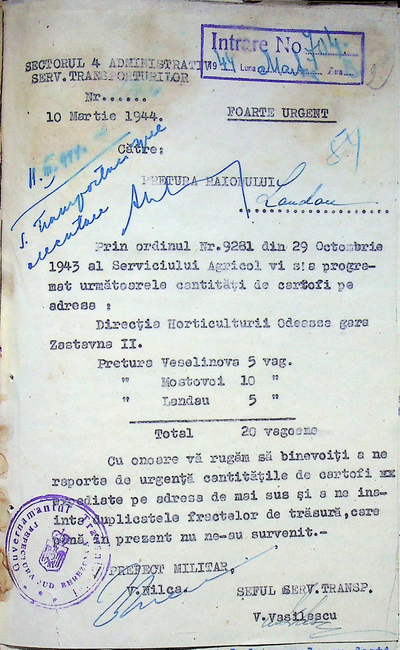 • • • • Справа № 101 Документи (обіжник-замовлення, протокол, листування) про порядок прийому на роботу, доставку вагонів для відвантаження плодоовочевої продукції, перевезення вантажів у вагонах відкритого типу, завантаження та розвантаження критих вагонів, підготовку вагонів для відправки зерна в Румунію, супровідні документи на відвантажену продукцію і матеріали