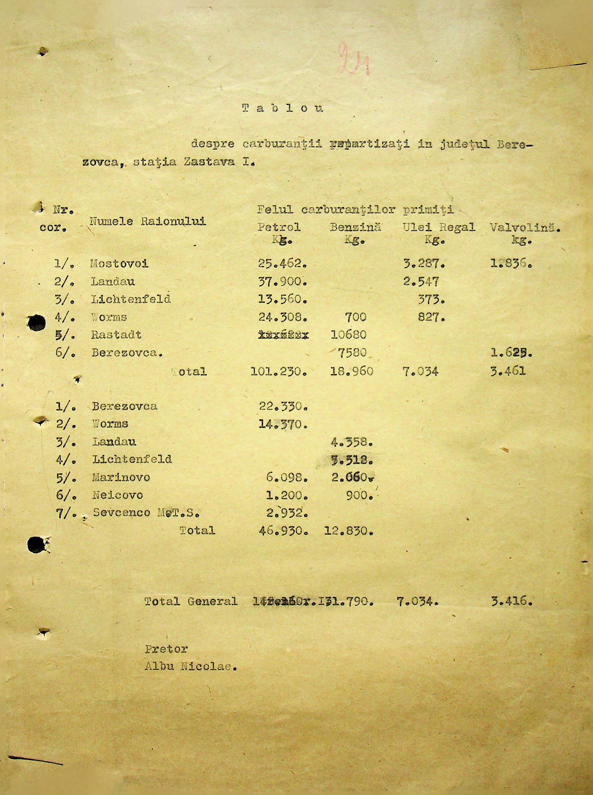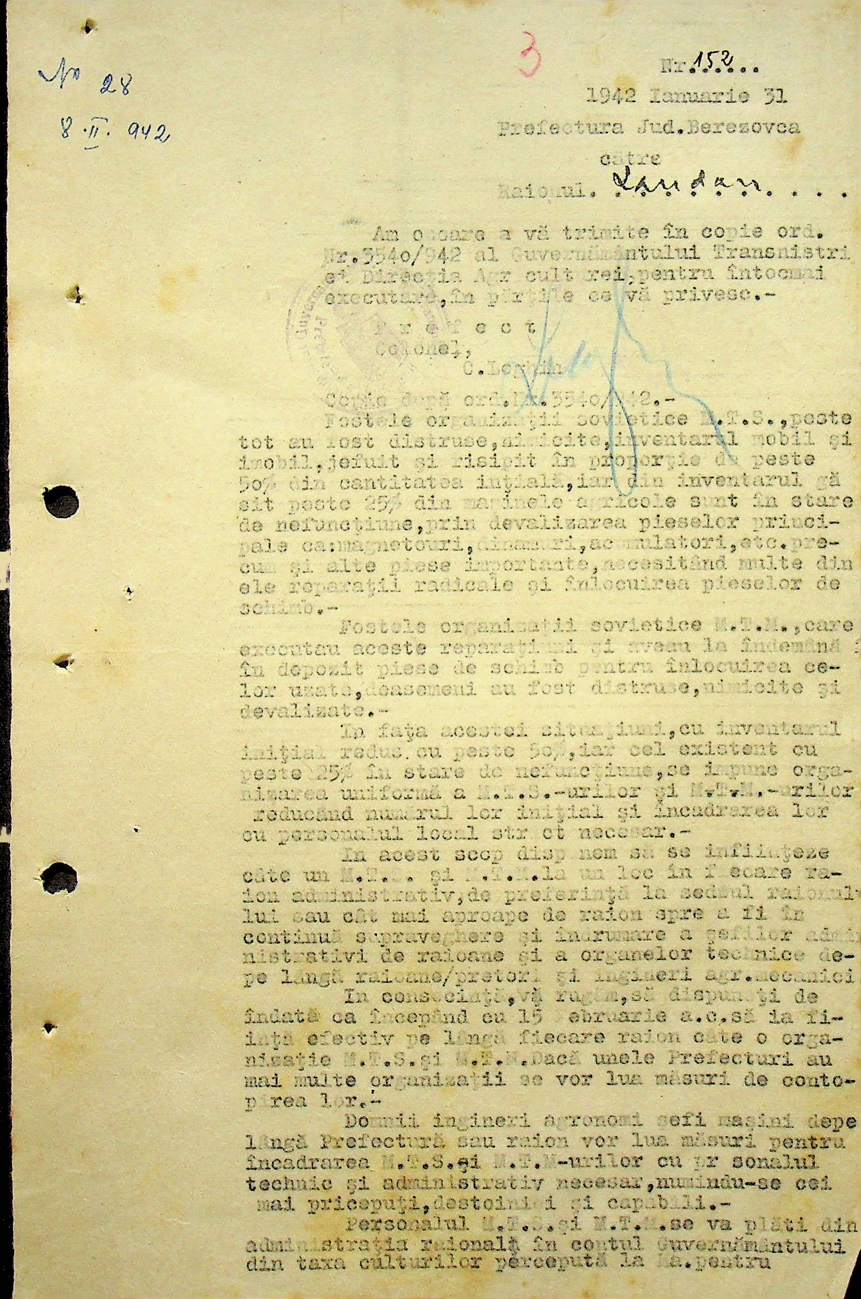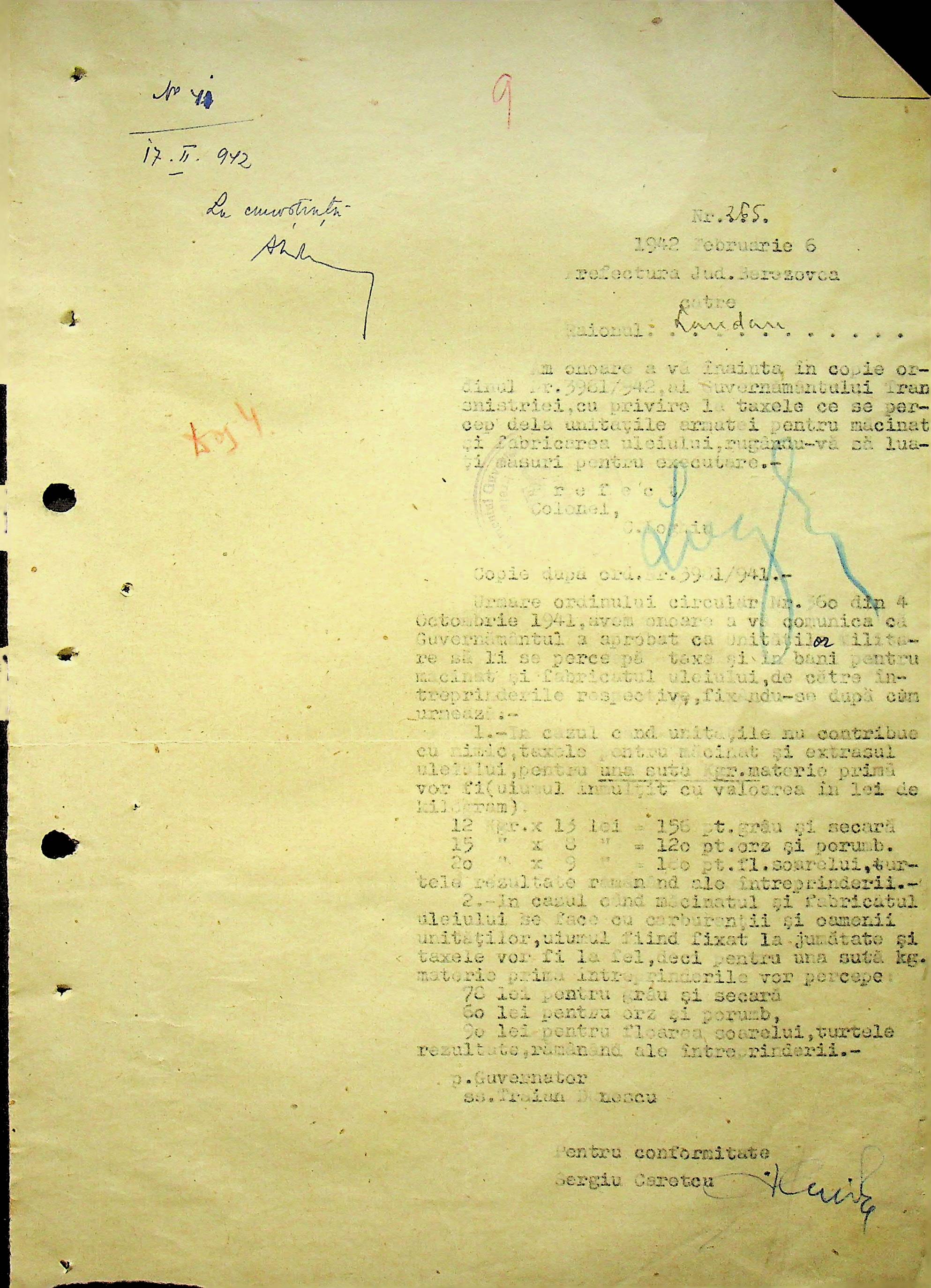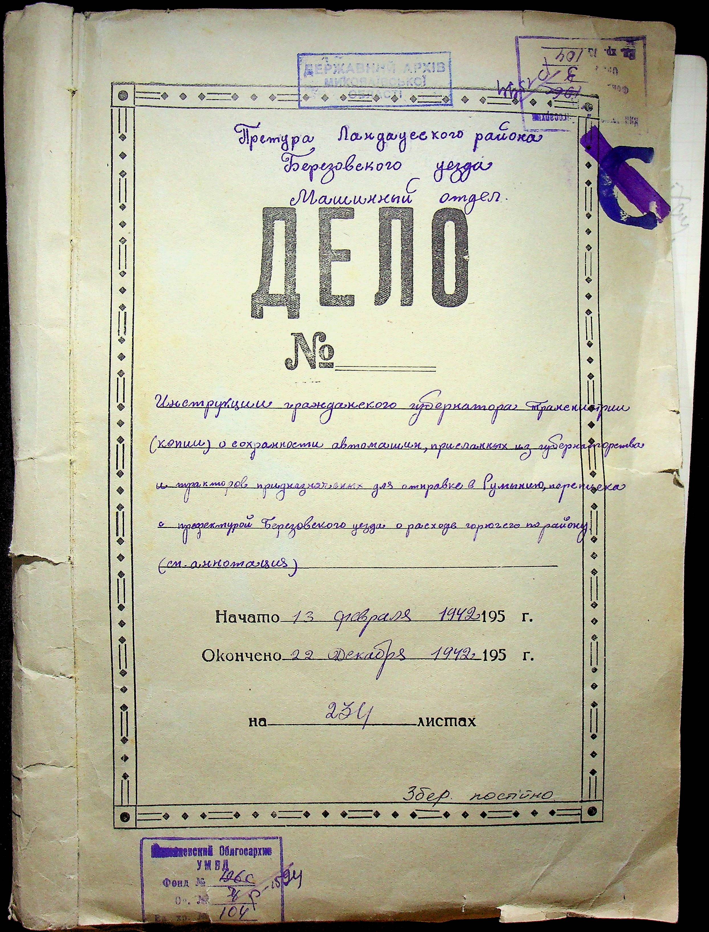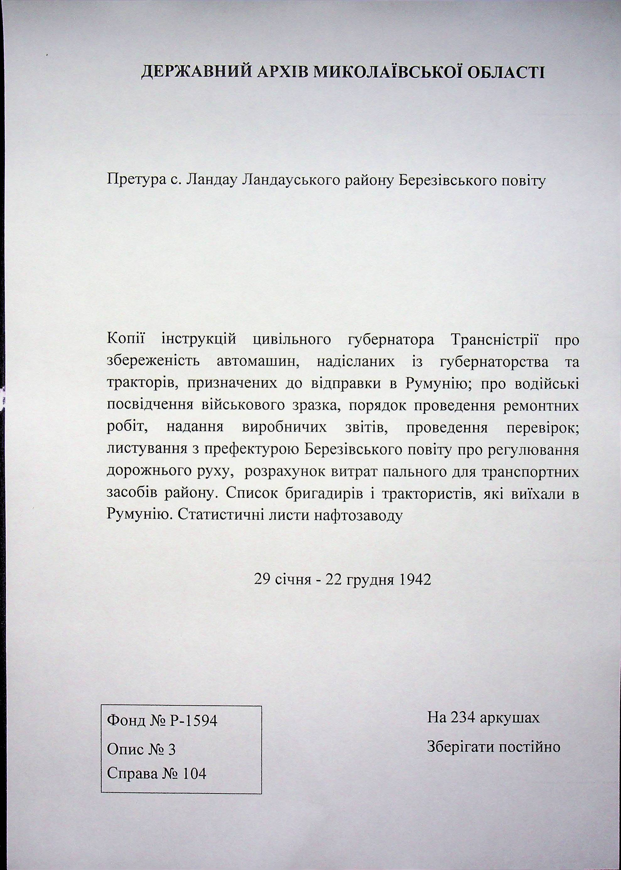 • • • • Справа № 104 Копії інструкцій цивільного губернатора Трансністрії про зберігання автомашин, надісланих із губернаторства та тракторів, призначених до відправки в Румунію; про водійські посвідчення військового зразка, порядок проведення ремонтних робіт, надання виробничих звітів, проведення перевірок; листування з префектурою Березівського повіту про регулювання дорожнього руху, розрахунок витрат пального для транспортних засобів району. Список бригадирів і трактористів, які виїхали в Румунію. Статистичні листи нафтозаводу