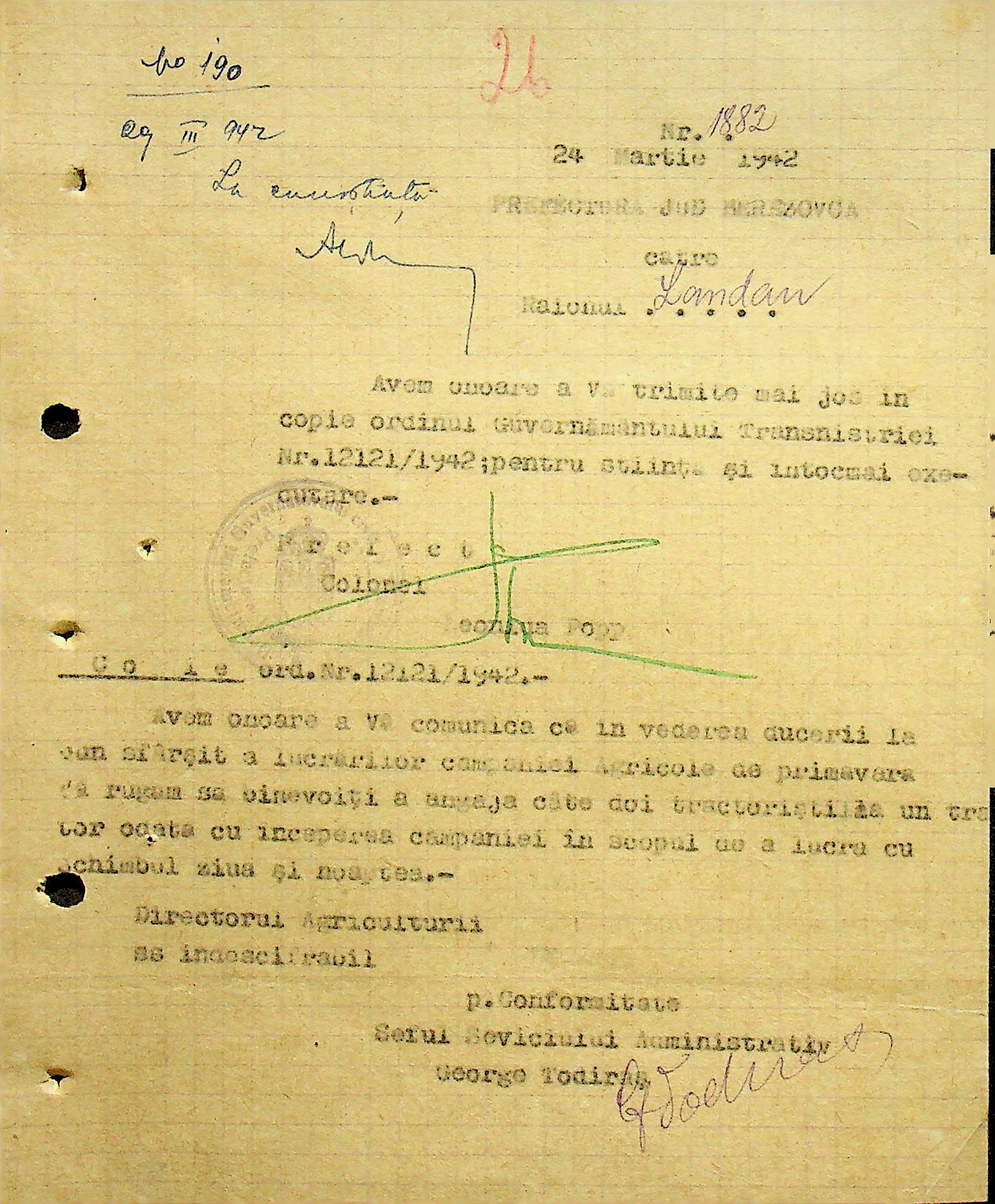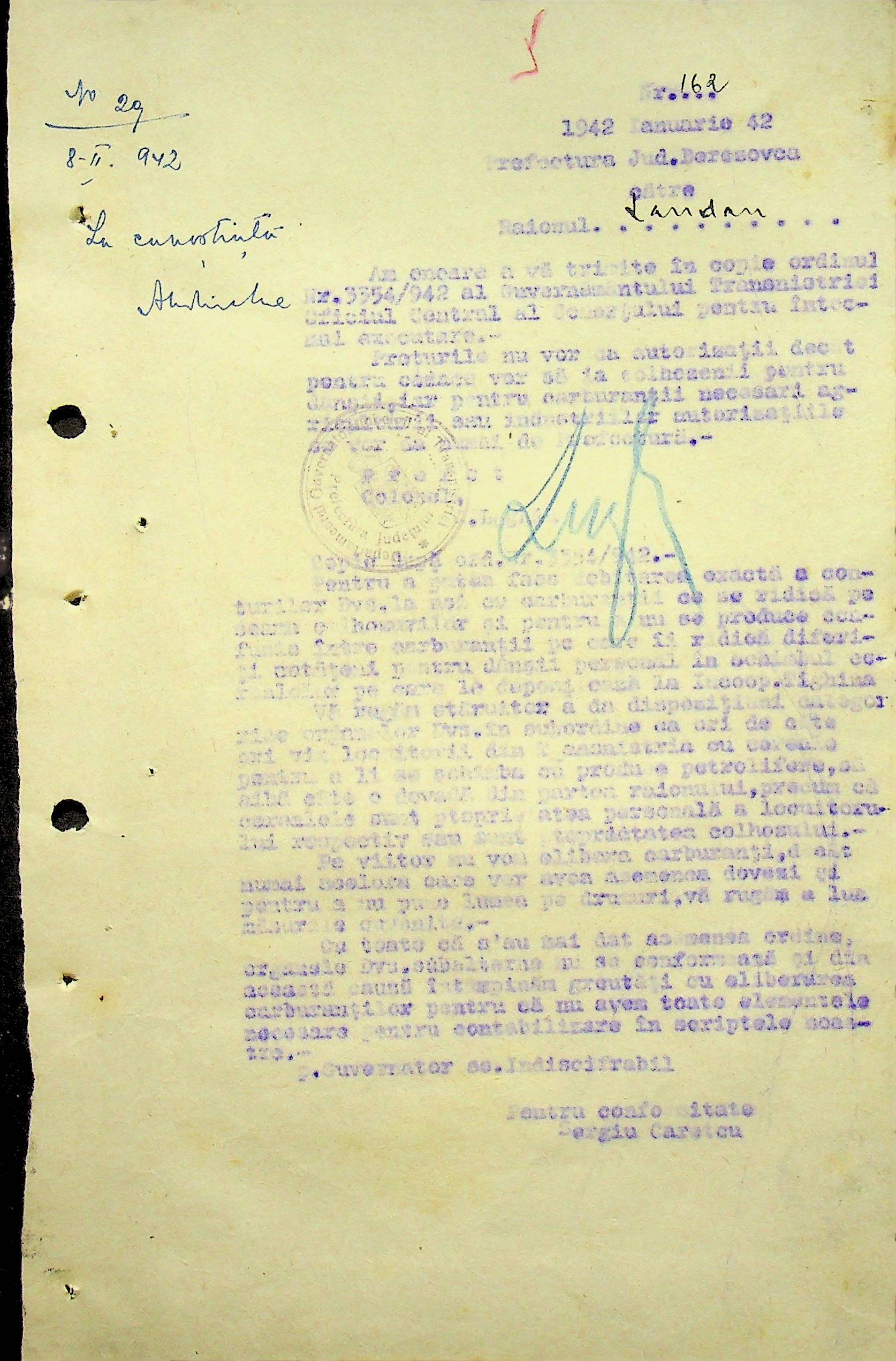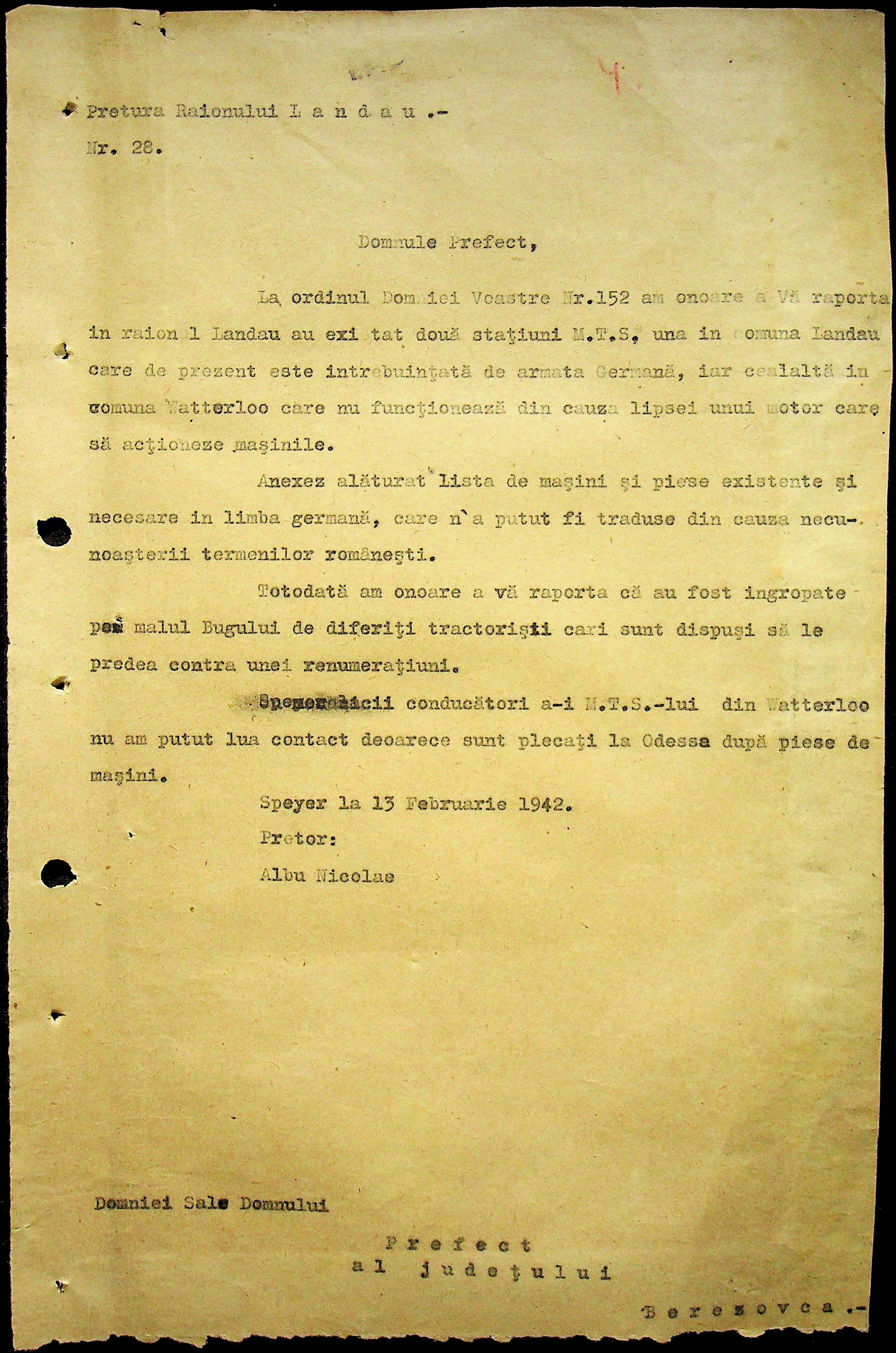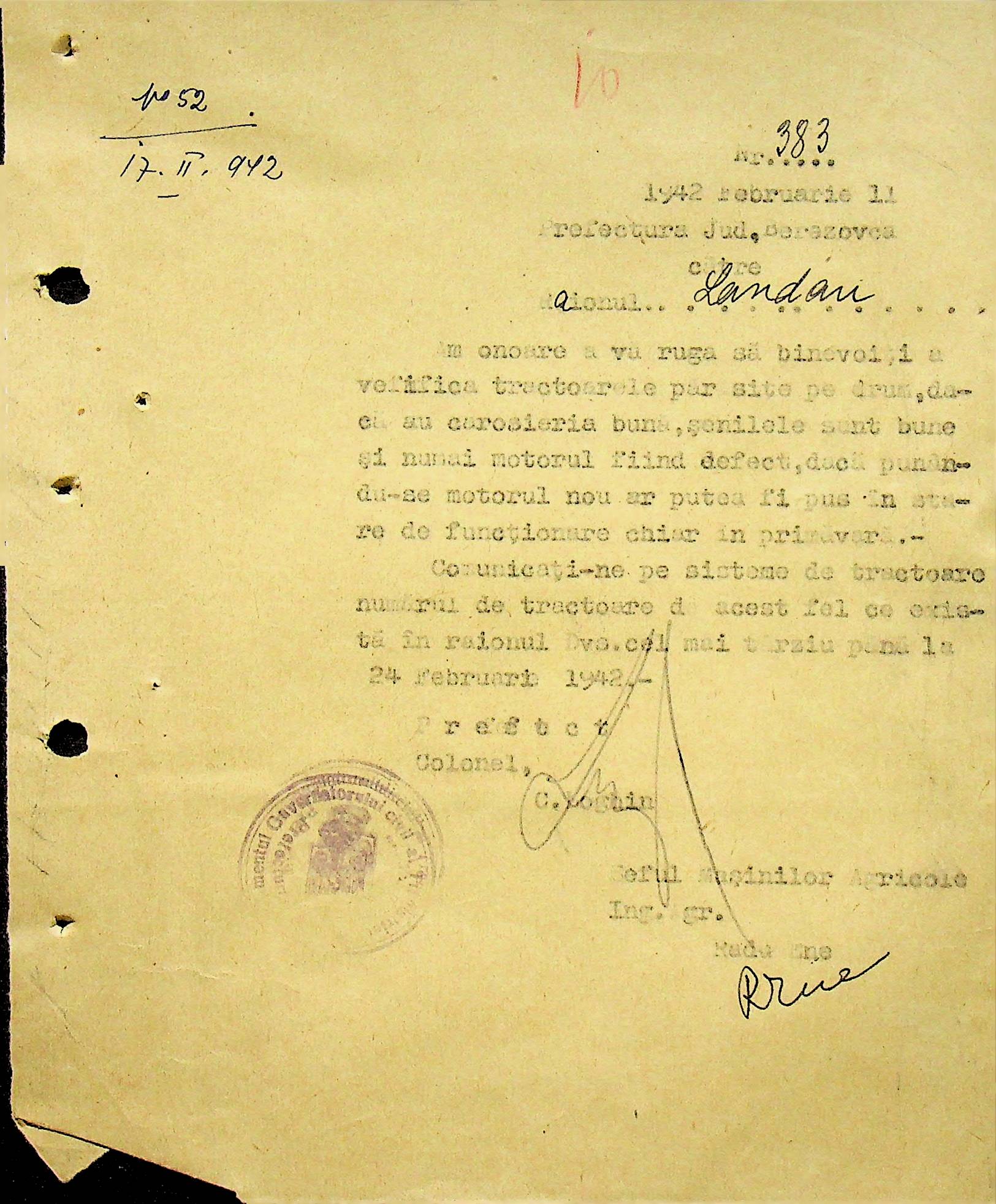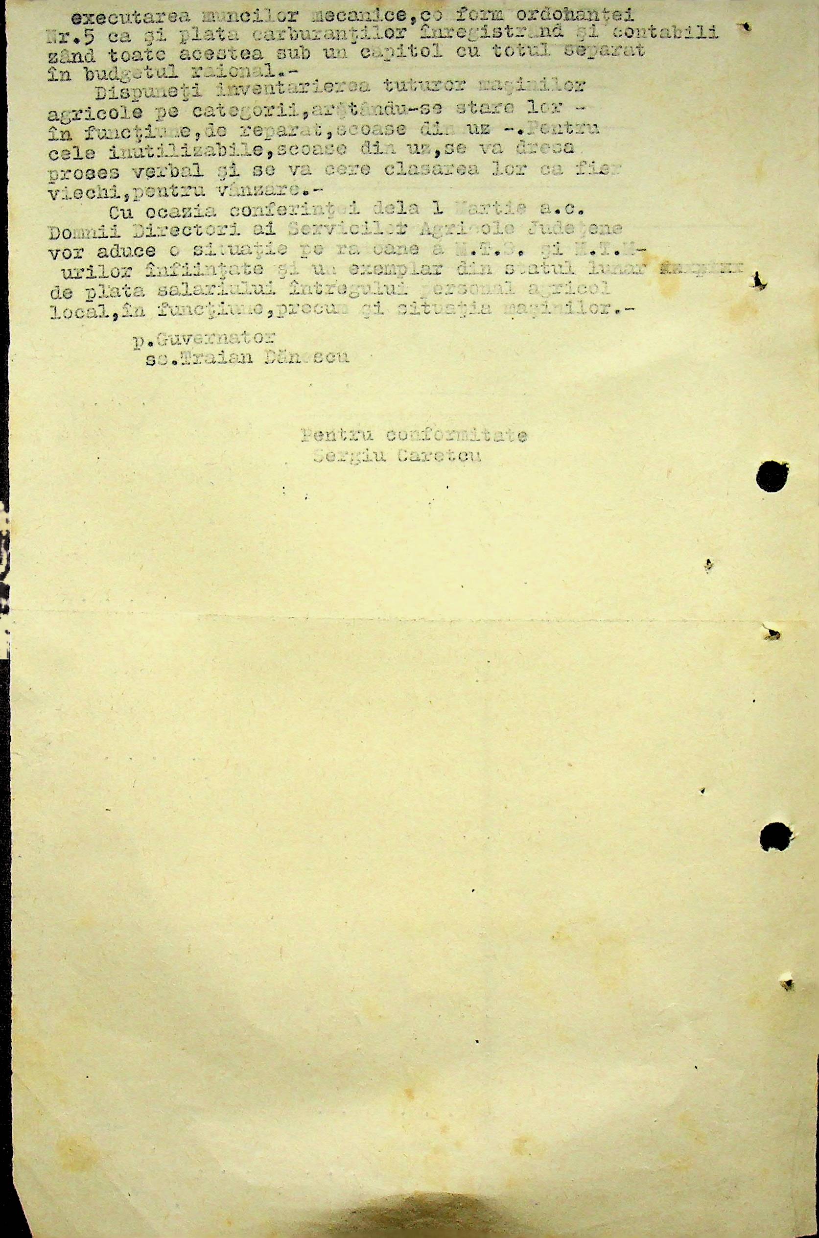 • • • • Справа № 104 Копії інструкцій цивільного губернатора Трансністрії про зберігання автомашин, надісланих із губернаторства та тракторів, призначених до відправки в Румунію; про водійські посвідчення військового зразка, порядок проведення ремонтних робіт, надання виробничих звітів, проведення перевірок; листування з префектурою Березівського повіту про регулювання дорожнього руху, розрахунок витрат пального для транспортних засобів району. Список бригадирів і трактористів, які виїхали в Румунію. Статистичні листи нафтозаводу