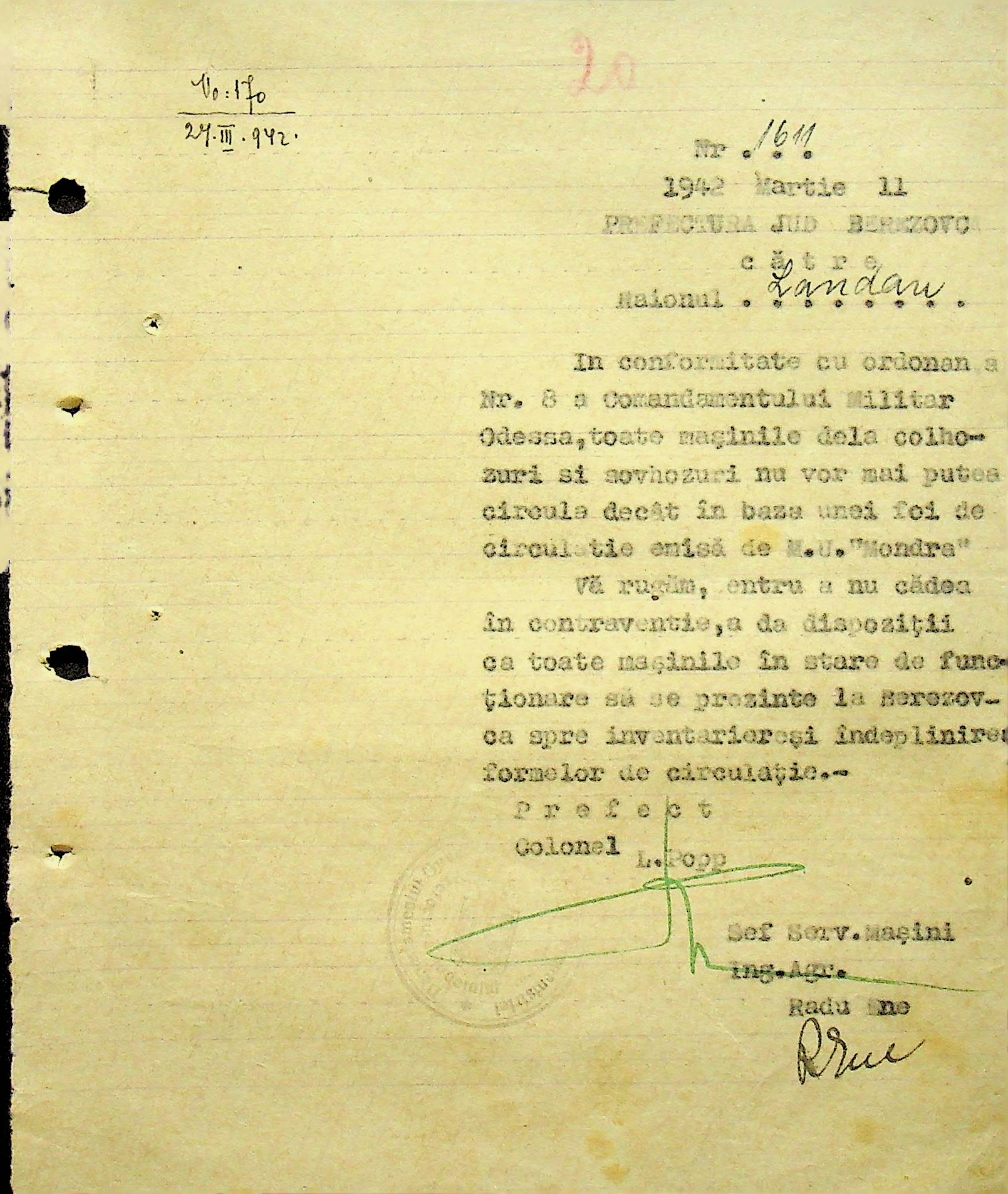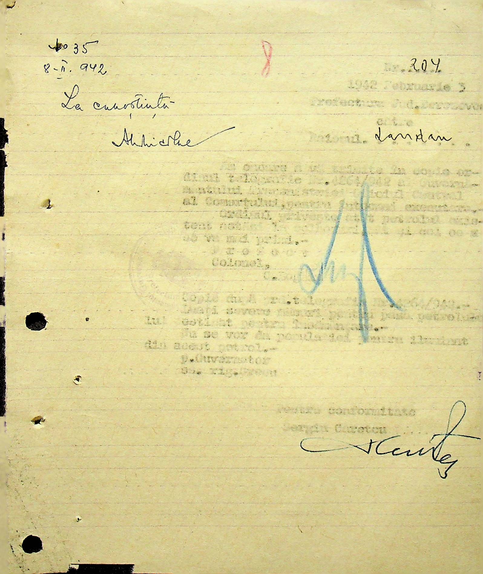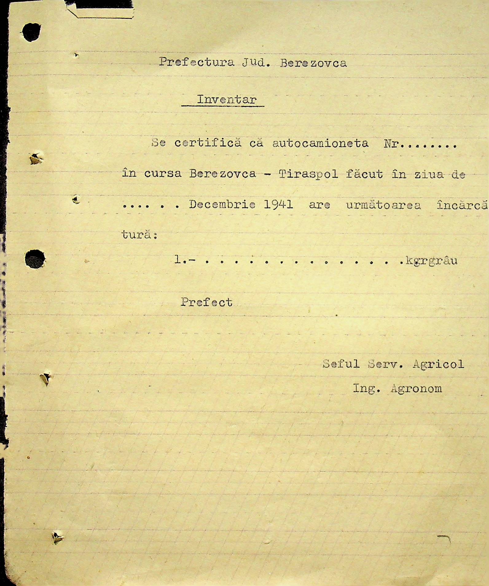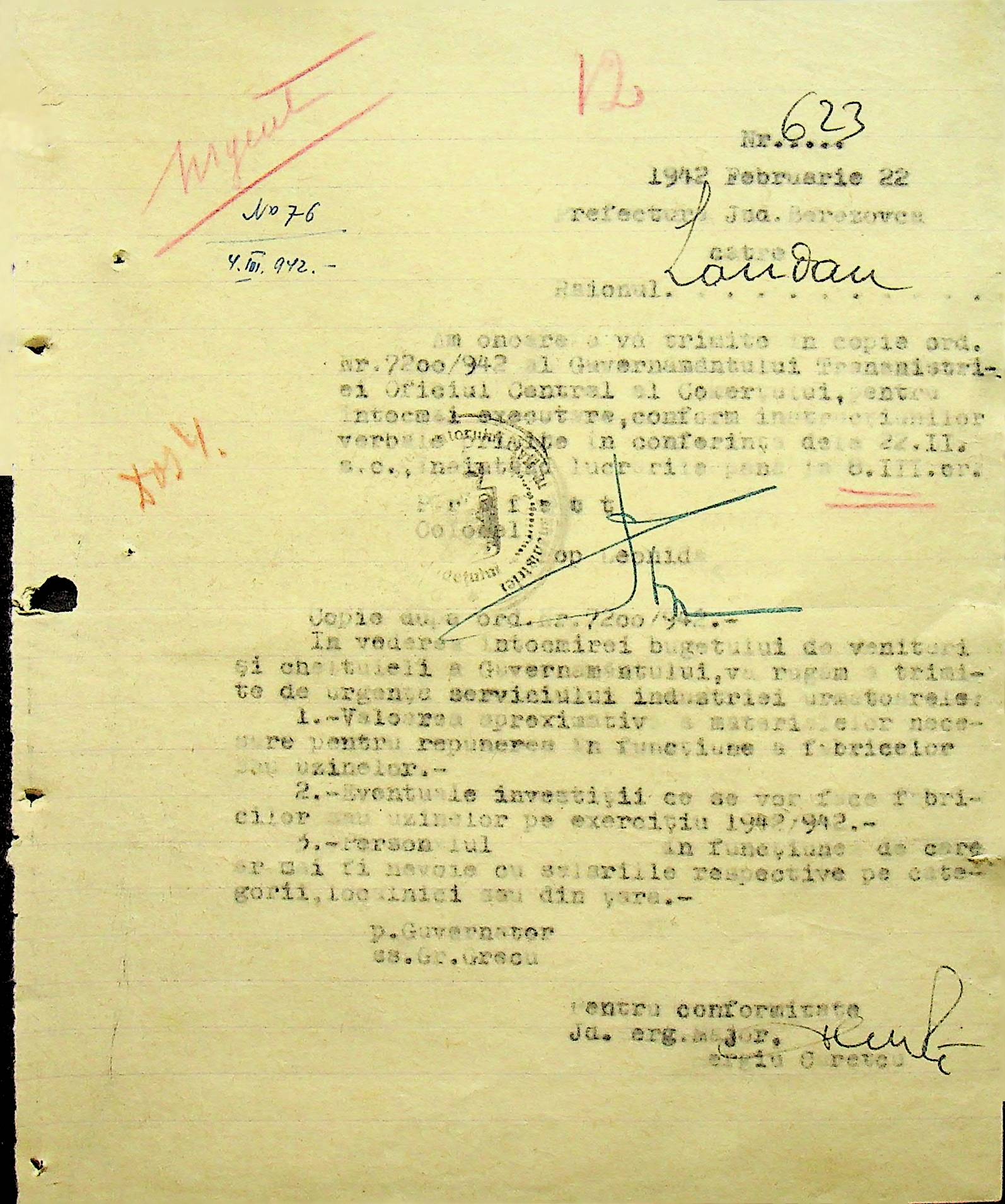 • • • • Справа № 104 Копії інструкцій цивільного губернатора Трансністрії про зберігання автомашин, надісланих із губернаторства та тракторів, призначених до відправки в Румунію; про водійські посвідчення військового зразка, порядок проведення ремонтних робіт, надання виробничих звітів, проведення перевірок; листування з префектурою Березівського повіту про регулювання дорожнього руху, розрахунок витрат пального для транспортних засобів району. Список бригадирів і трактористів, які виїхали в Румунію. Статистичні листи нафтозаводу