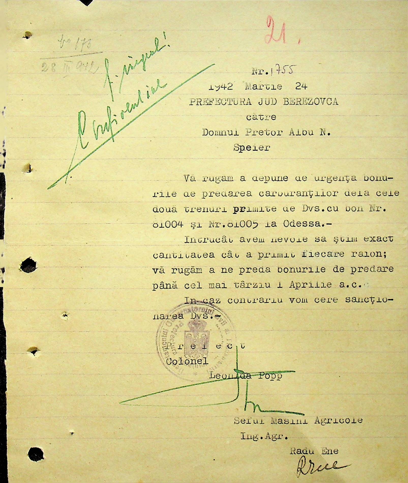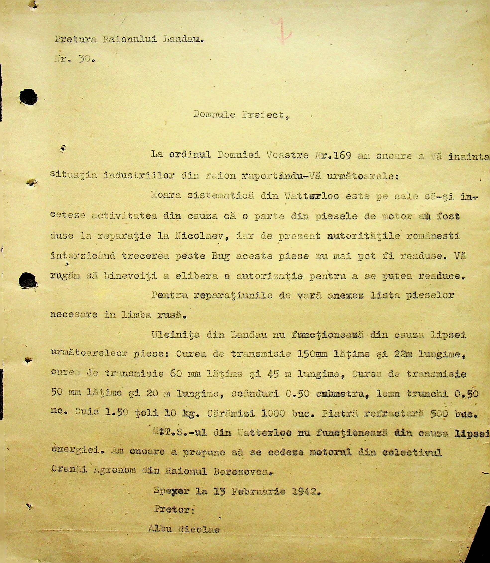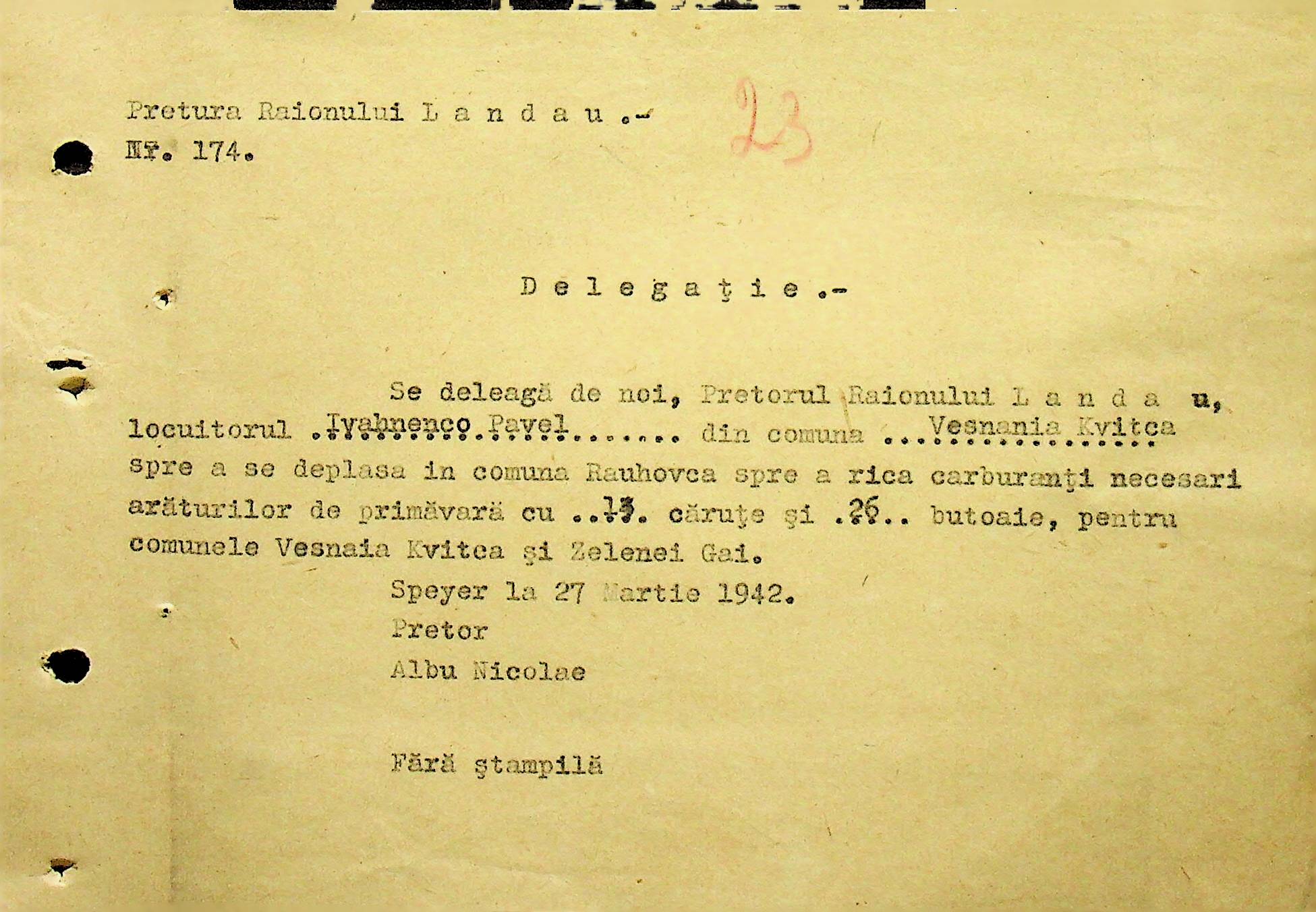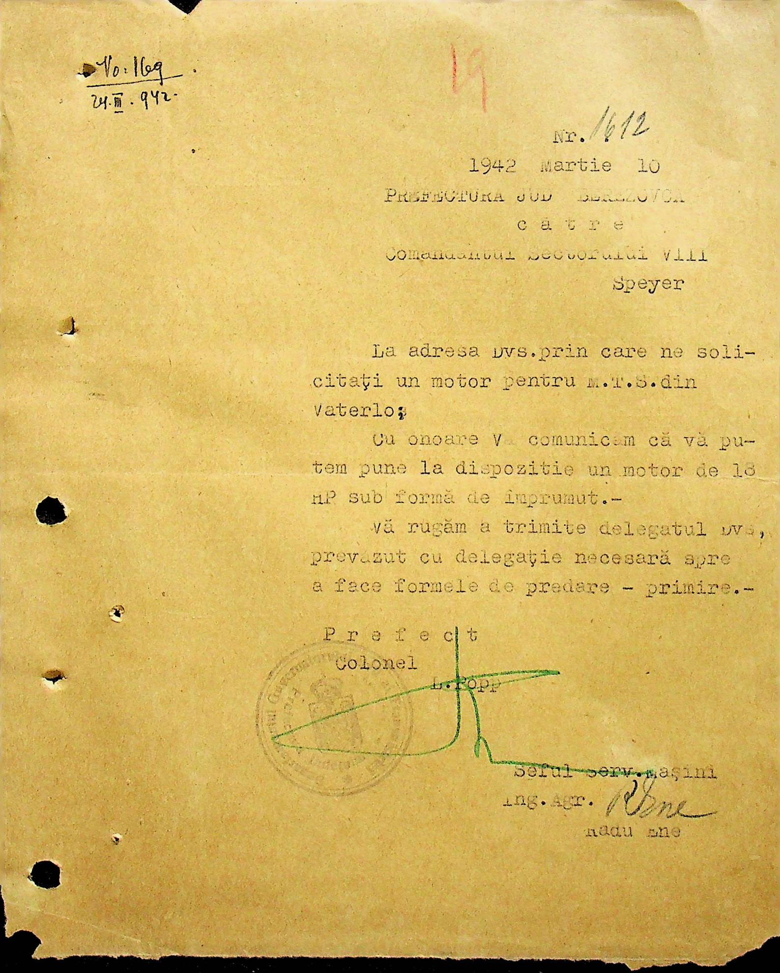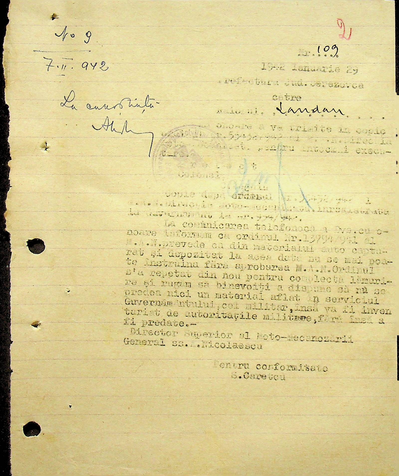 • • • • Справа № 104 Копії інструкцій цивільного губернатора Трансністрії про зберігання автомашин, надісланих із губернаторства та тракторів, призначених до відправки в Румунію; про водійські посвідчення військового зразка, порядок проведення ремонтних робіт, надання виробничих звітів, проведення перевірок; листування з префектурою Березівського повіту про регулювання дорожнього руху, розрахунок витрат пального для транспортних засобів району. Список бригадирів і трактористів, які виїхали в Румунію. Статистичні листи нафтозаводу