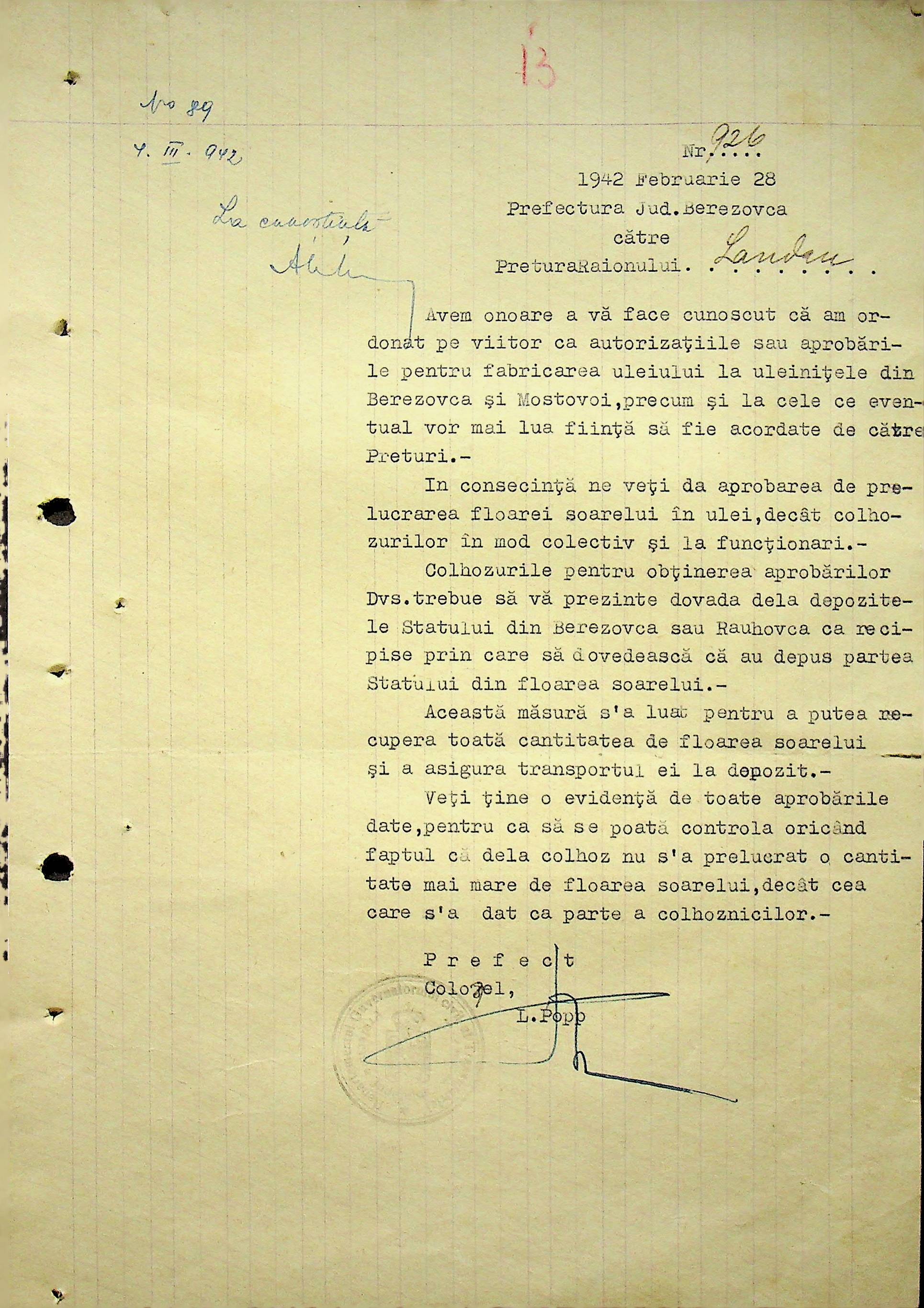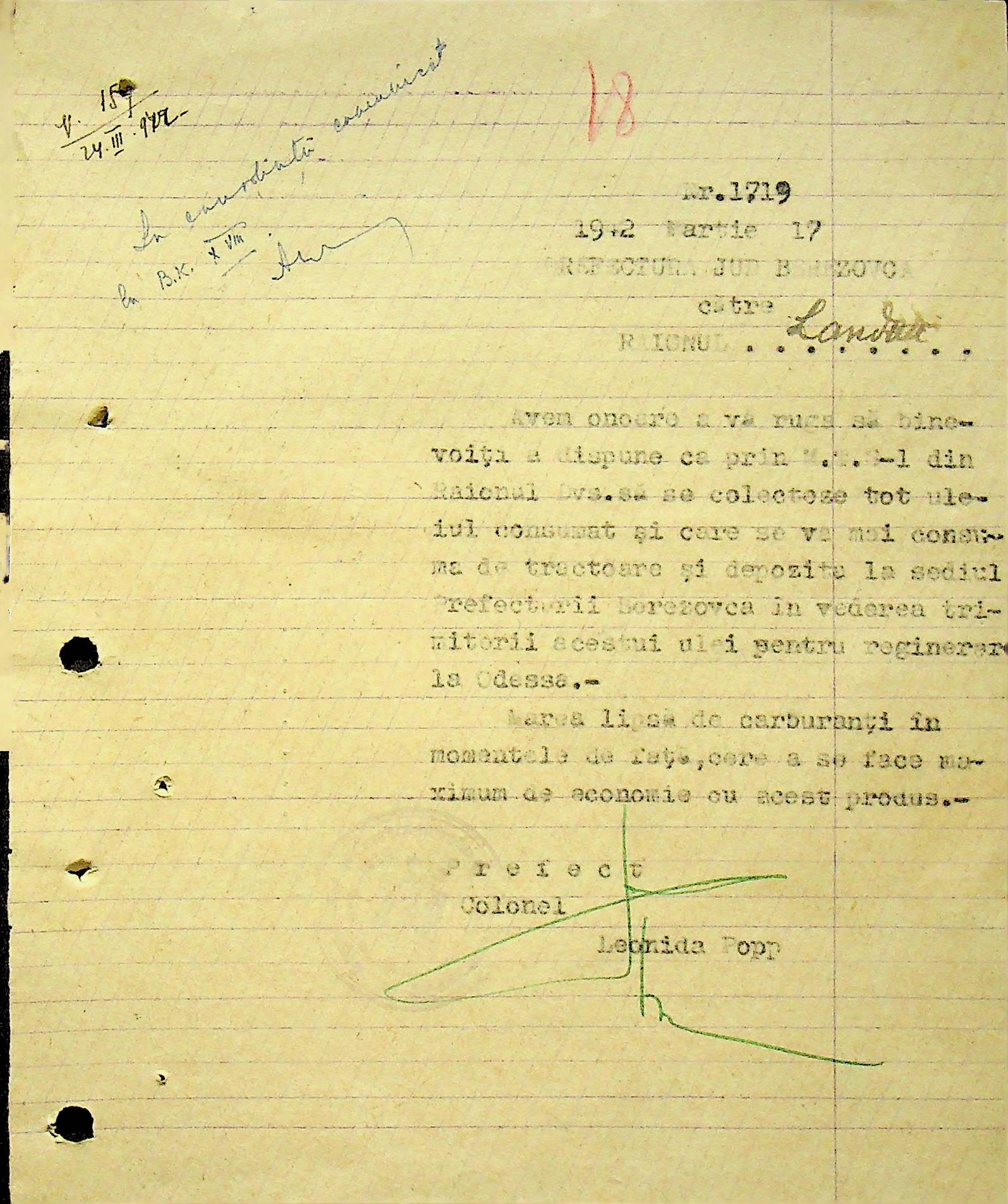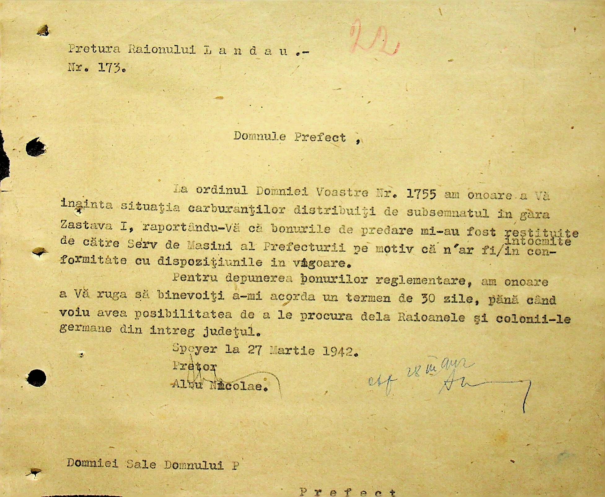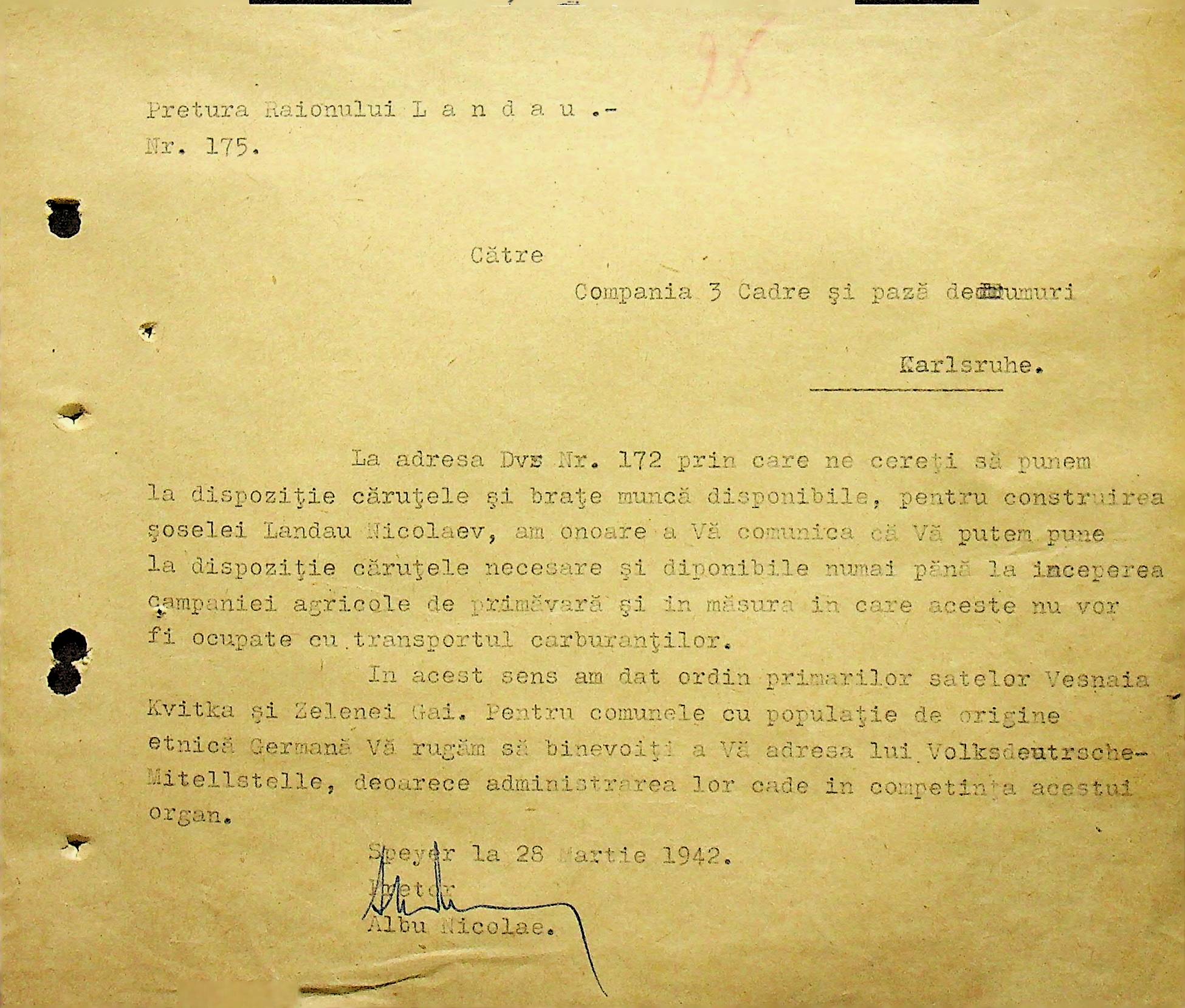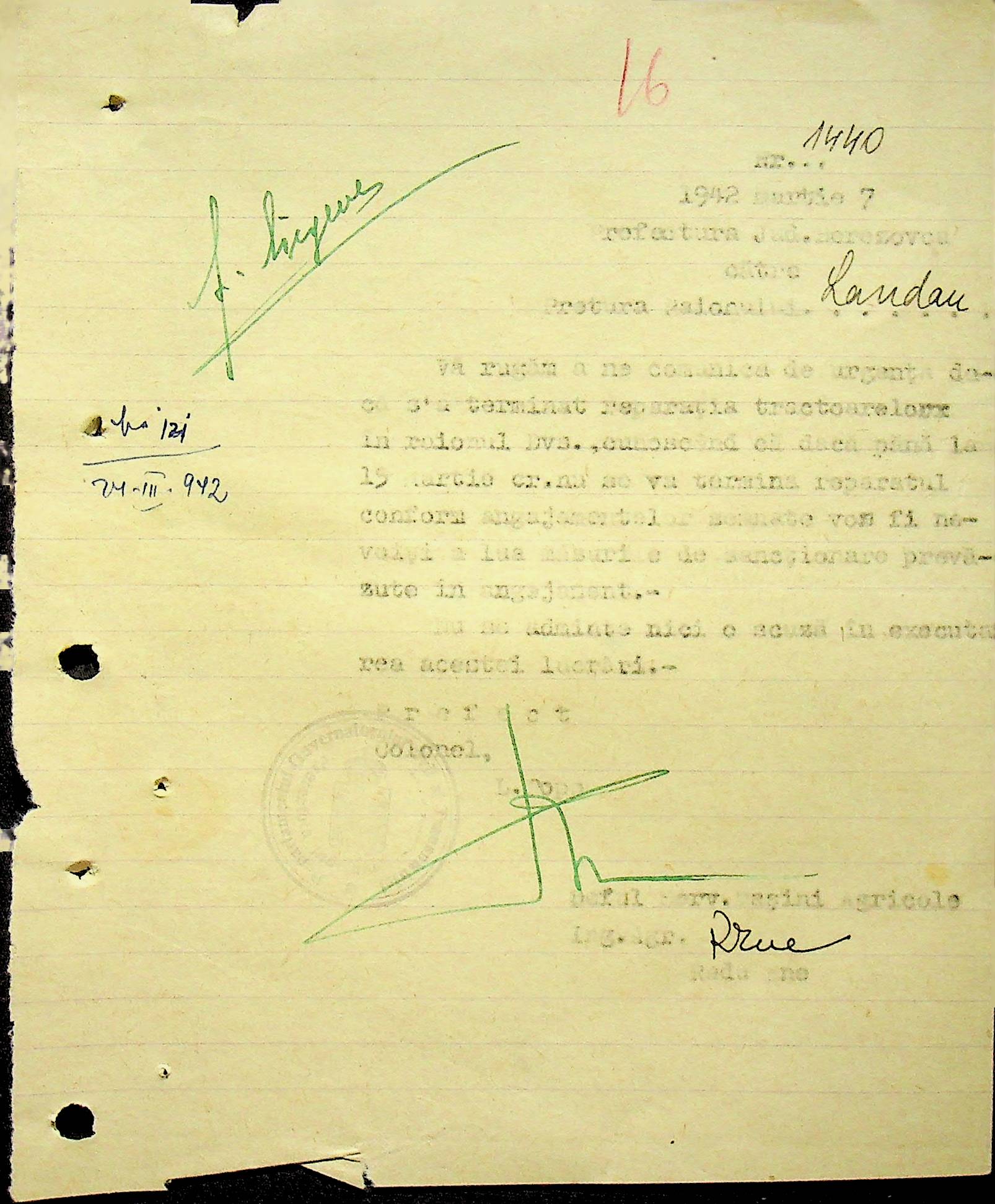 • • • • Справа № 104 Копії інструкцій цивільного губернатора Трансністрії про зберігання автомашин, надісланих із губернаторства та тракторів, призначених до відправки в Румунію; про водійські посвідчення військового зразка, порядок проведення ремонтних робіт, надання виробничих звітів, проведення перевірок; листування з префектурою Березівського повіту про регулювання дорожнього руху, розрахунок витрат пального для транспортних засобів району. Список бригадирів і трактористів, які виїхали в Румунію. Статистичні листи нафтозаводу