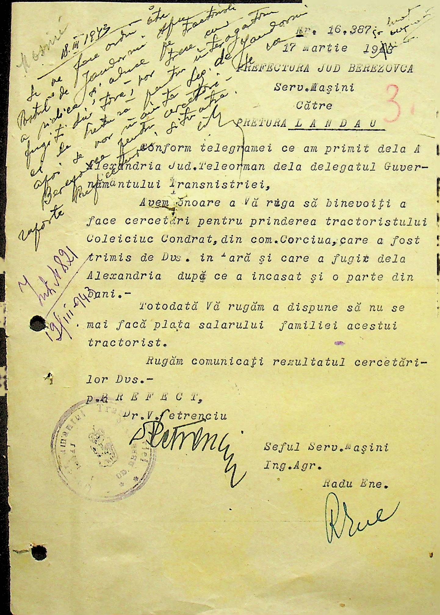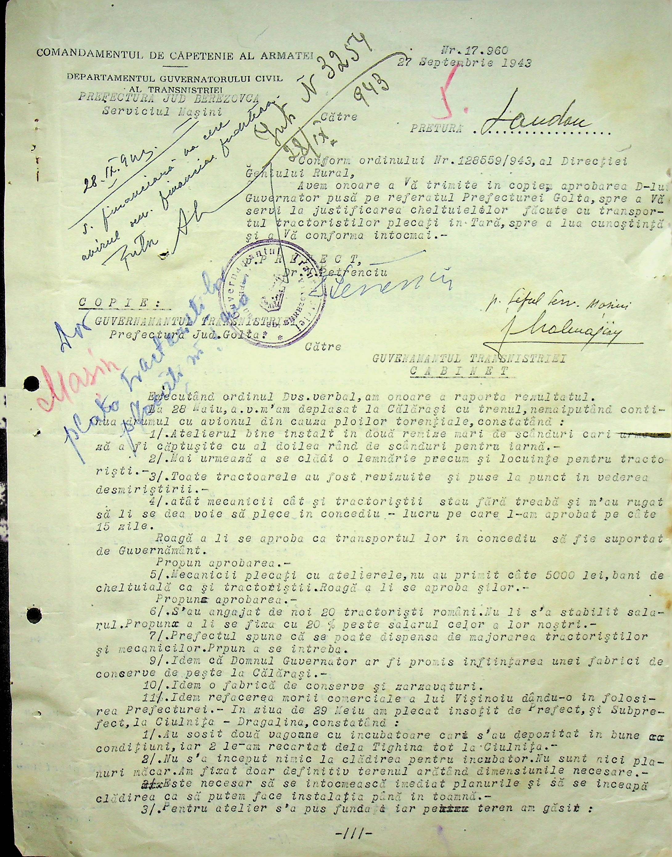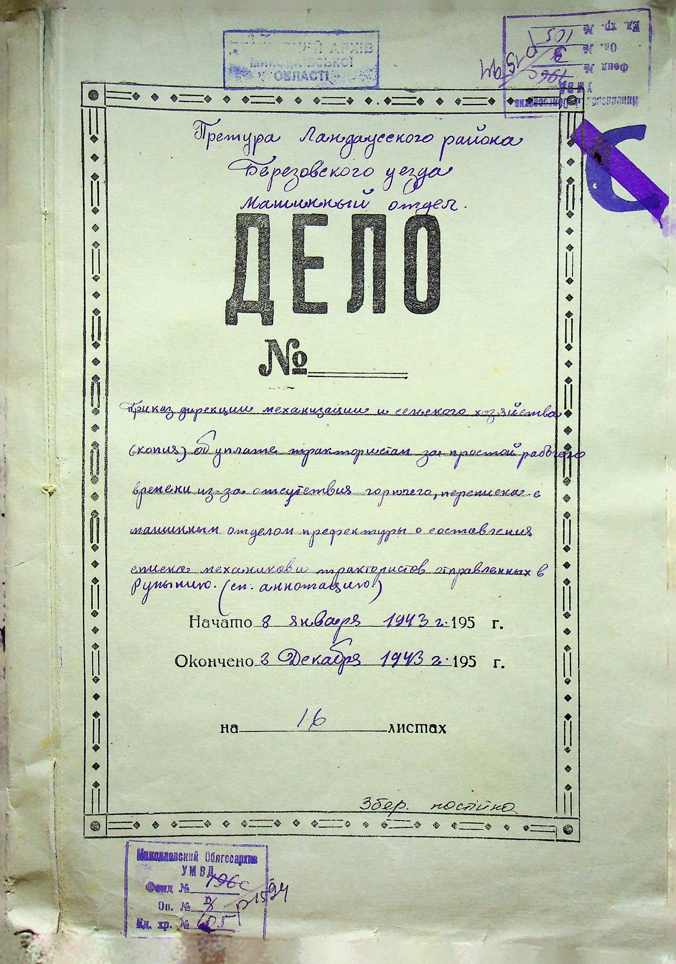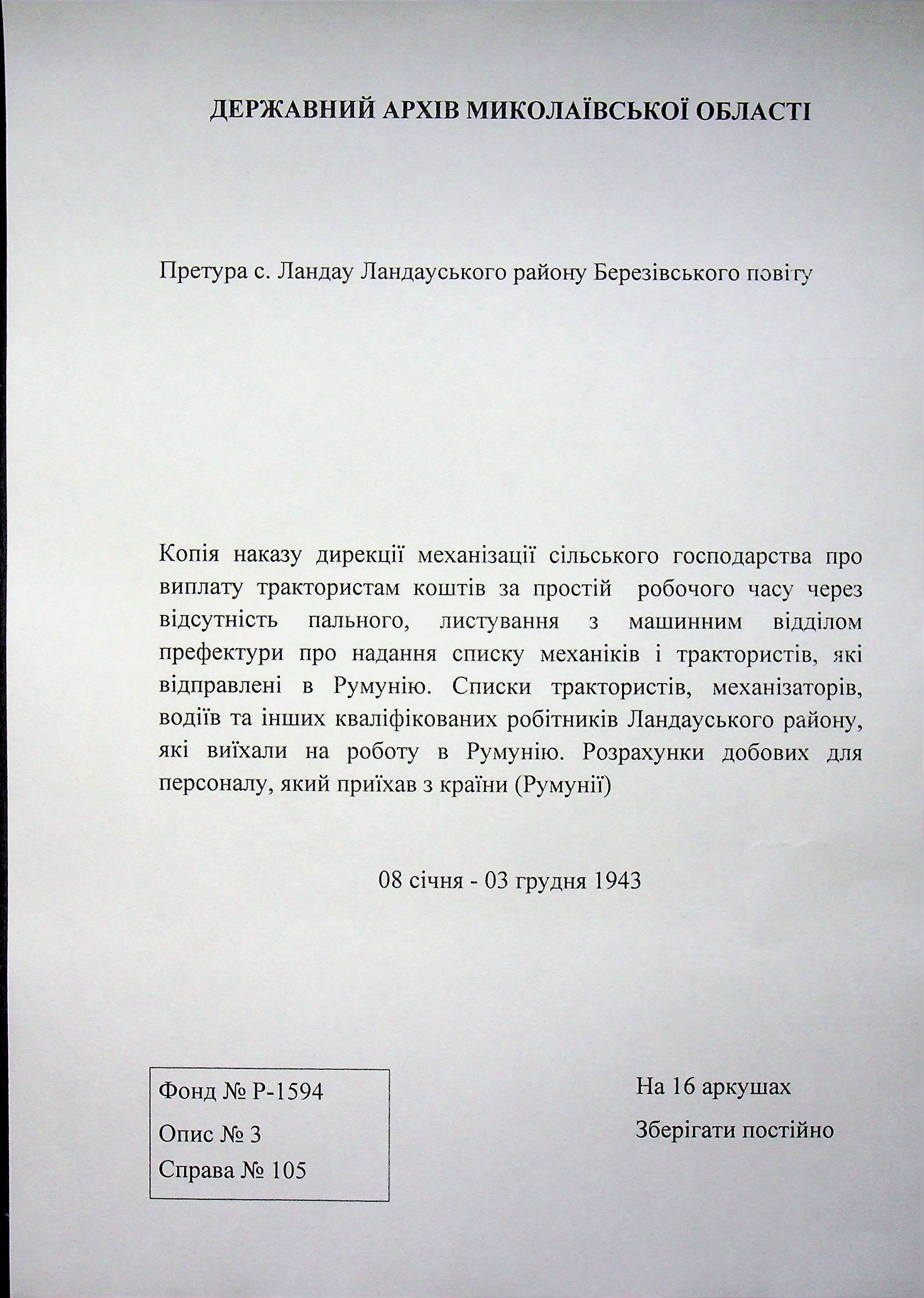 • • • • Справа № 105 Копія наказу дирекції механізації сільського господарства про виплату трактористам коштів за простій робочого часу через відсутність пального, листування з машинним відділом префектури про надання списку механіків і трактористів, які відправлені в Румунію. Списки трактористів, механізаторів, водіїв та інших кваліфікованих робітників Ландауського району, які виїхали на роботу в Румунію. Розрахунки добових для персоналу, який приїхав з країни (Румунії)