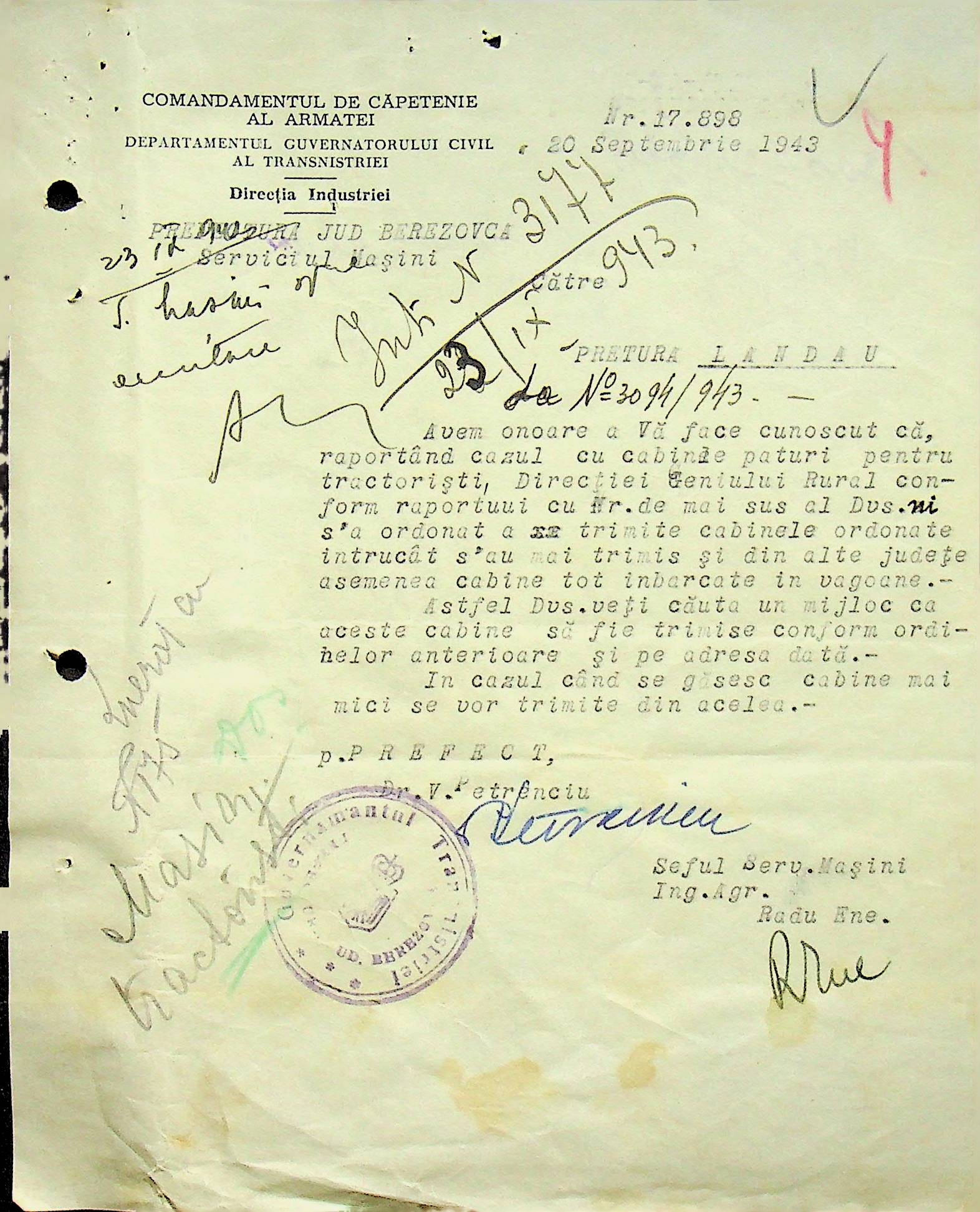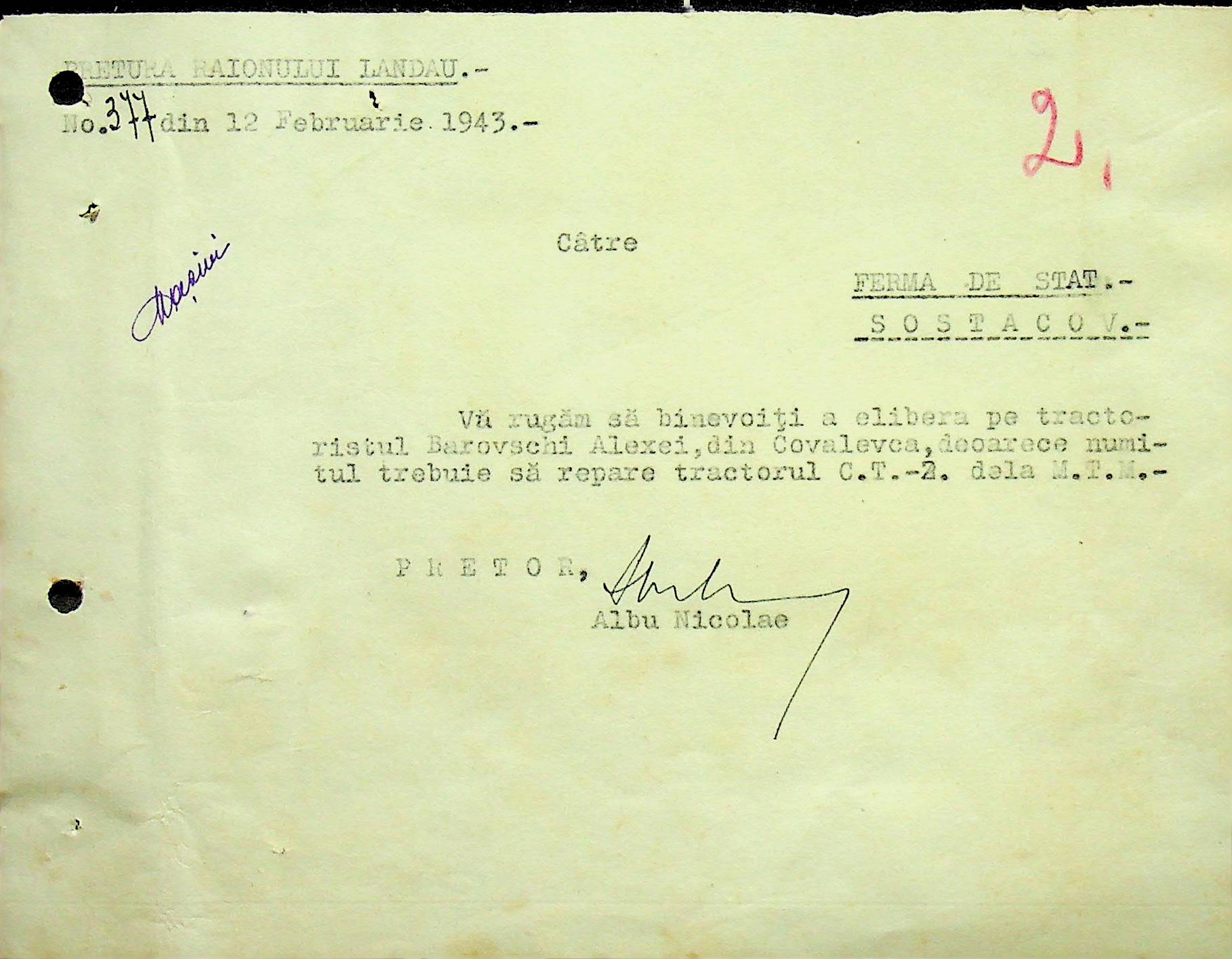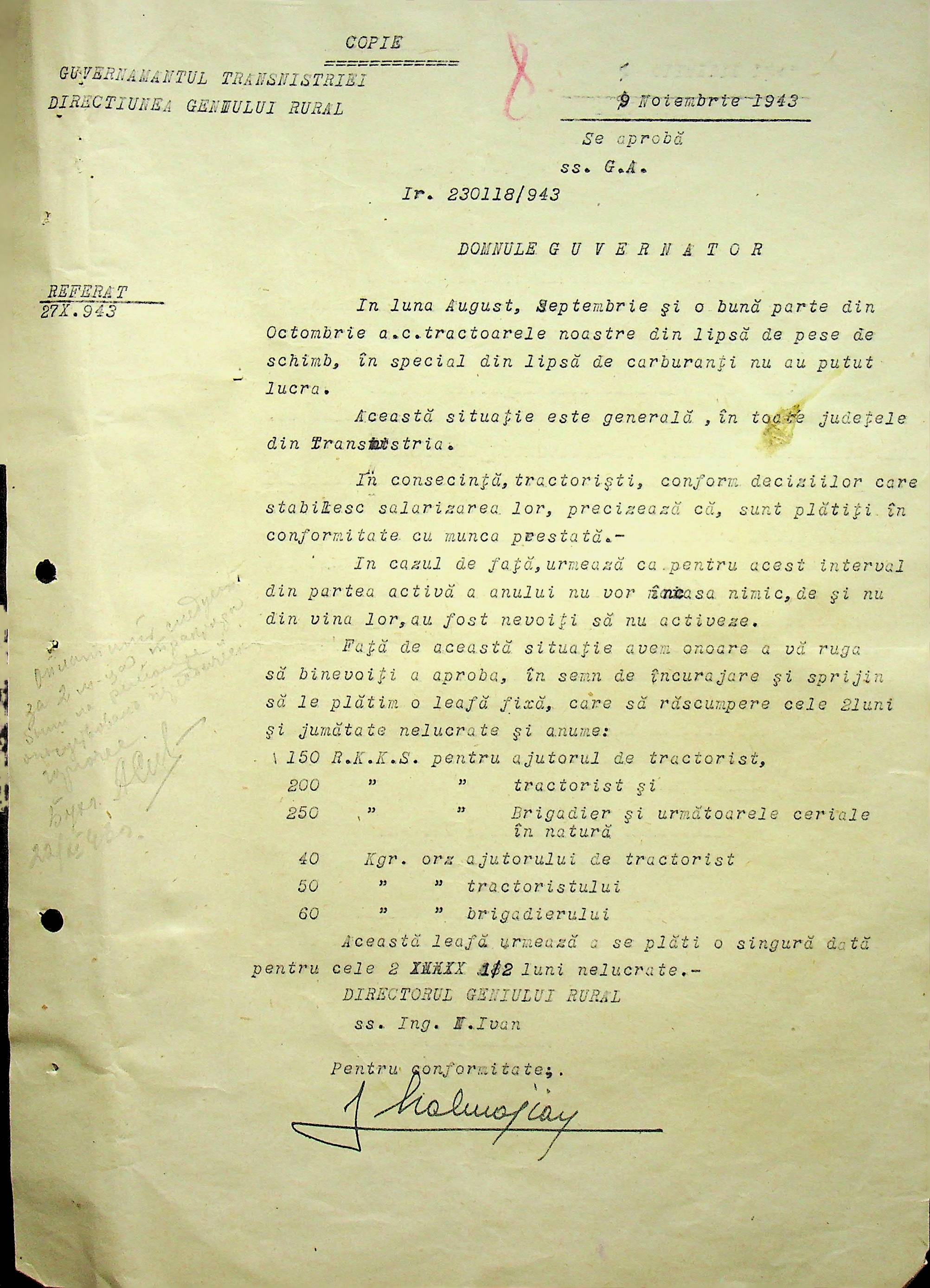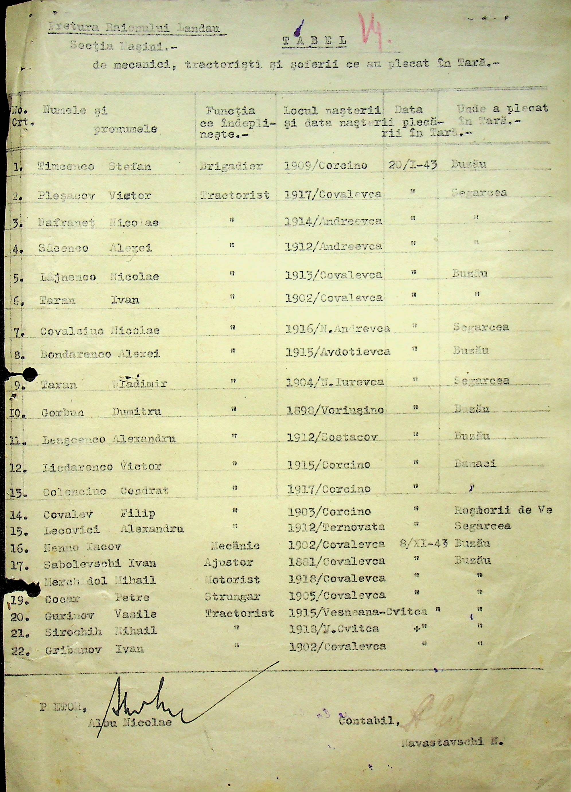 • • • • Справа № 105 Копія наказу дирекції механізації сільського господарства про виплату трактористам коштів за простій робочого часу через відсутність пального, листування з машинним відділом префектури про надання списку механіків і трактористів, які відправлені в Румунію. Списки трактористів, механізаторів, водіїв та інших кваліфікованих робітників Ландауського району, які виїхали на роботу в Румунію. Розрахунки добових для персоналу, який приїхав з країни (Румунії)