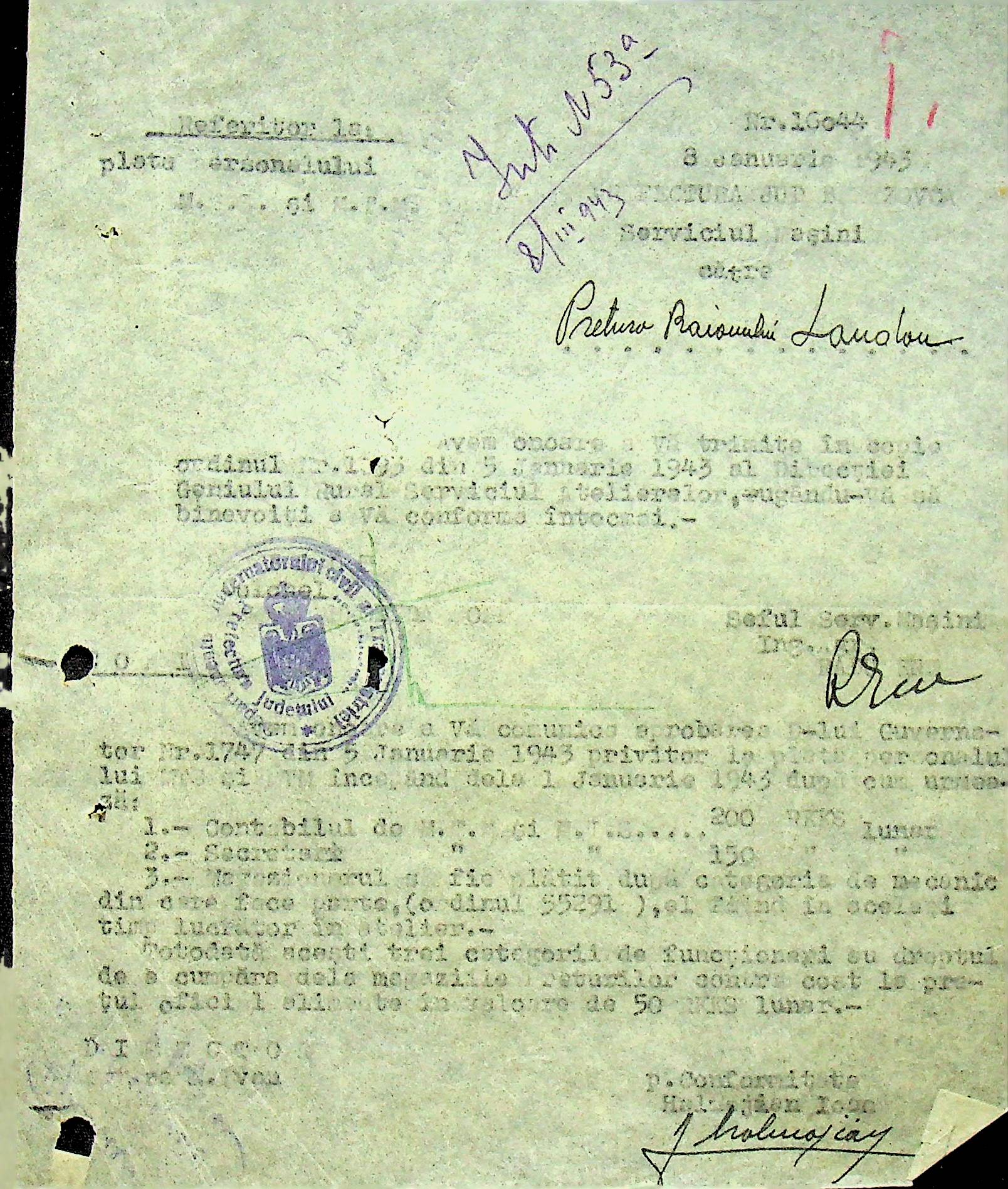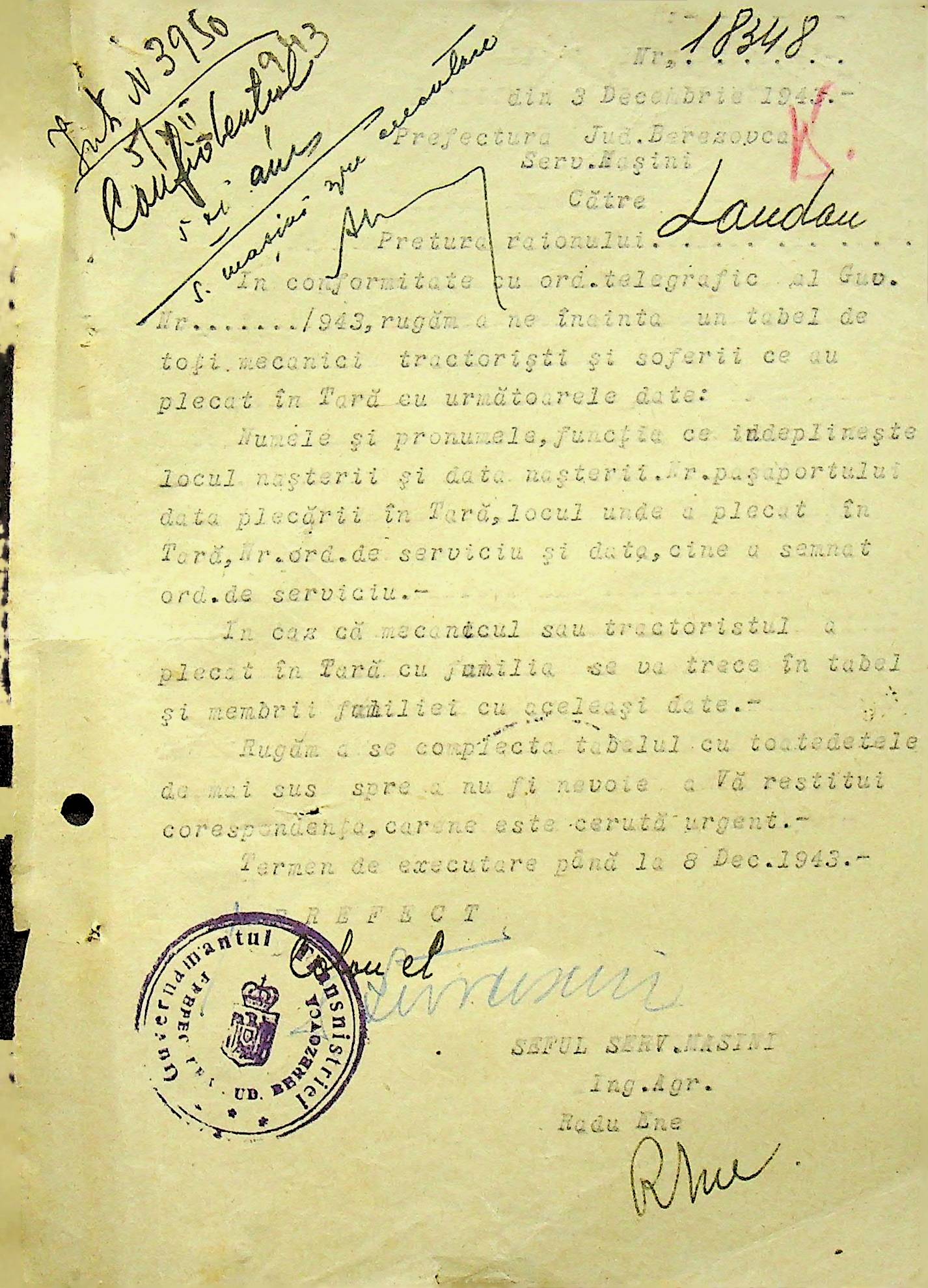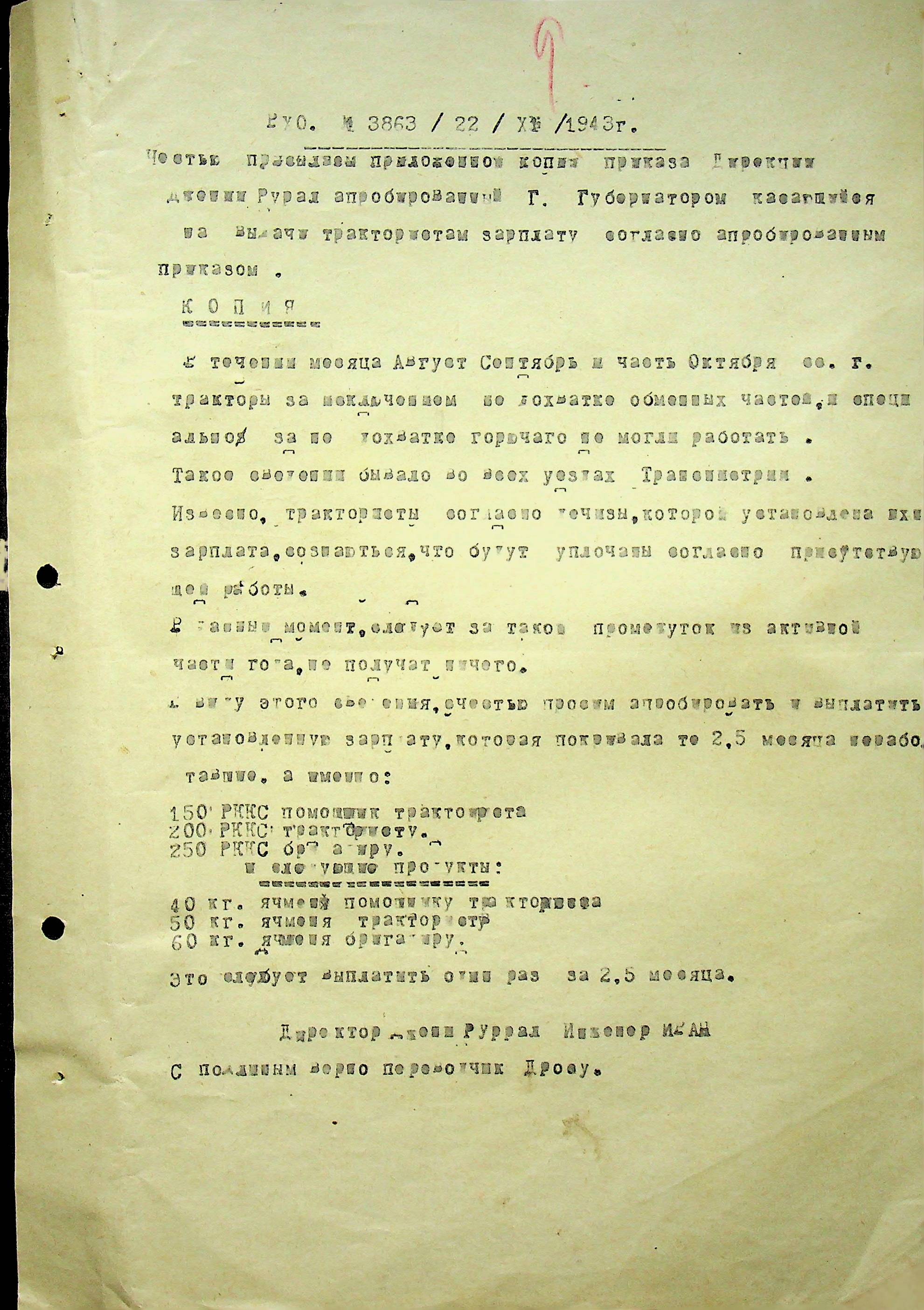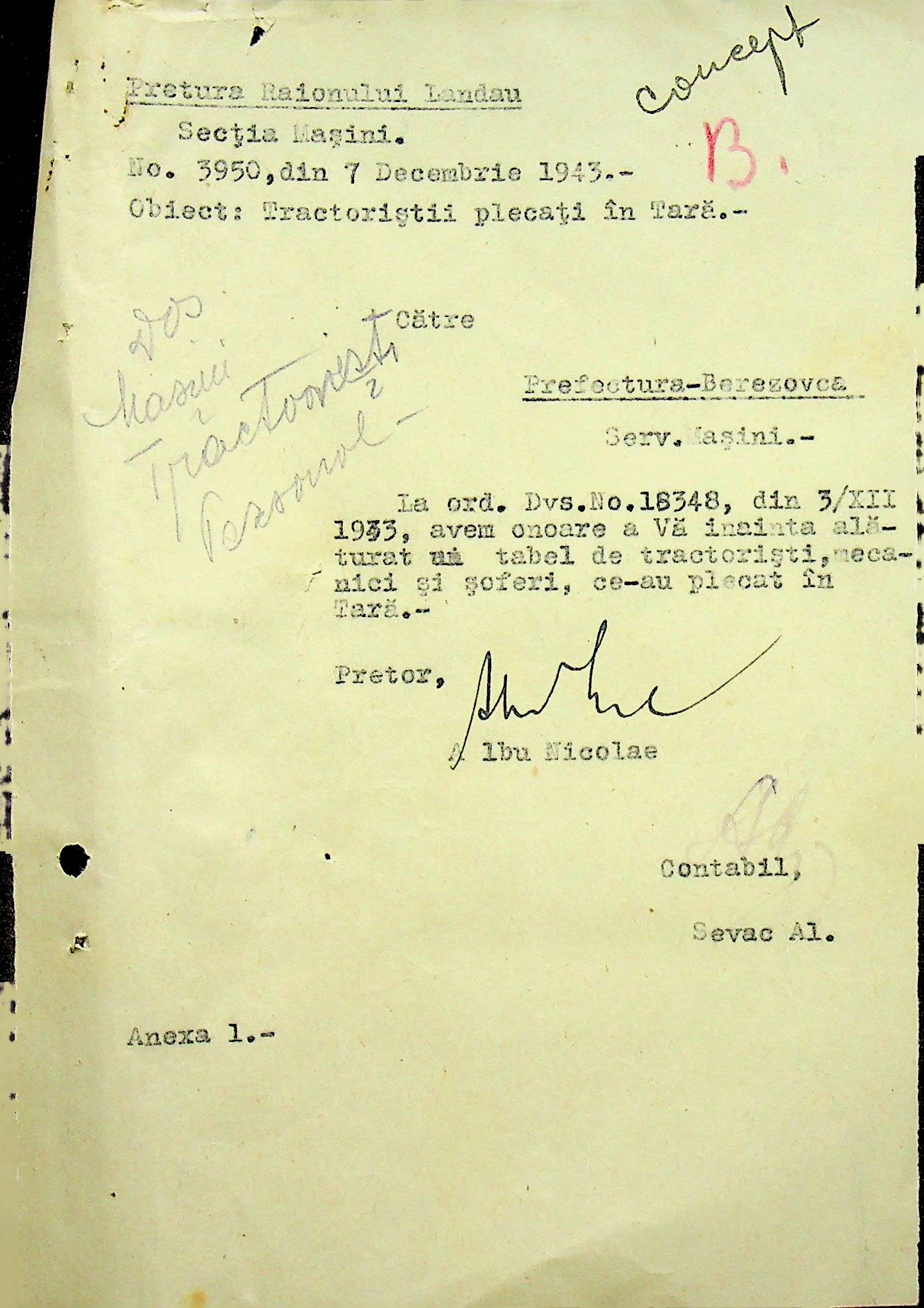 • • • • Справа № 105 Копія наказу дирекції механізації сільського господарства про виплату трактористам коштів за простій робочого часу через відсутність пального, листування з машинним відділом префектури про надання списку механіків і трактористів, які відправлені в Румунію. Списки трактористів, механізаторів, водіїв та інших кваліфікованих робітників Ландауського району, які виїхали на роботу в Румунію. Розрахунки добових для персоналу, який приїхав з країни (Румунії)