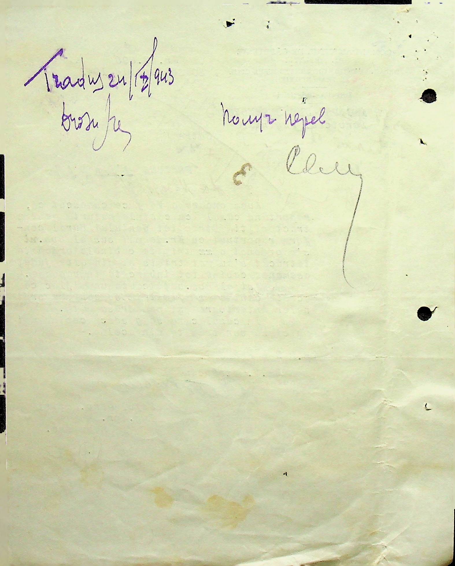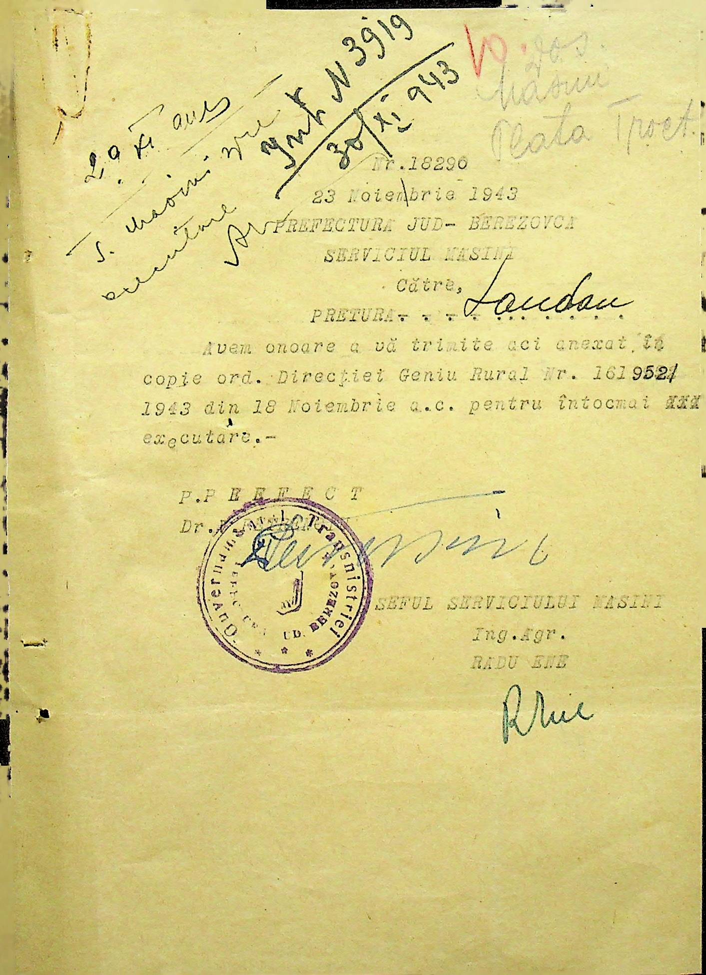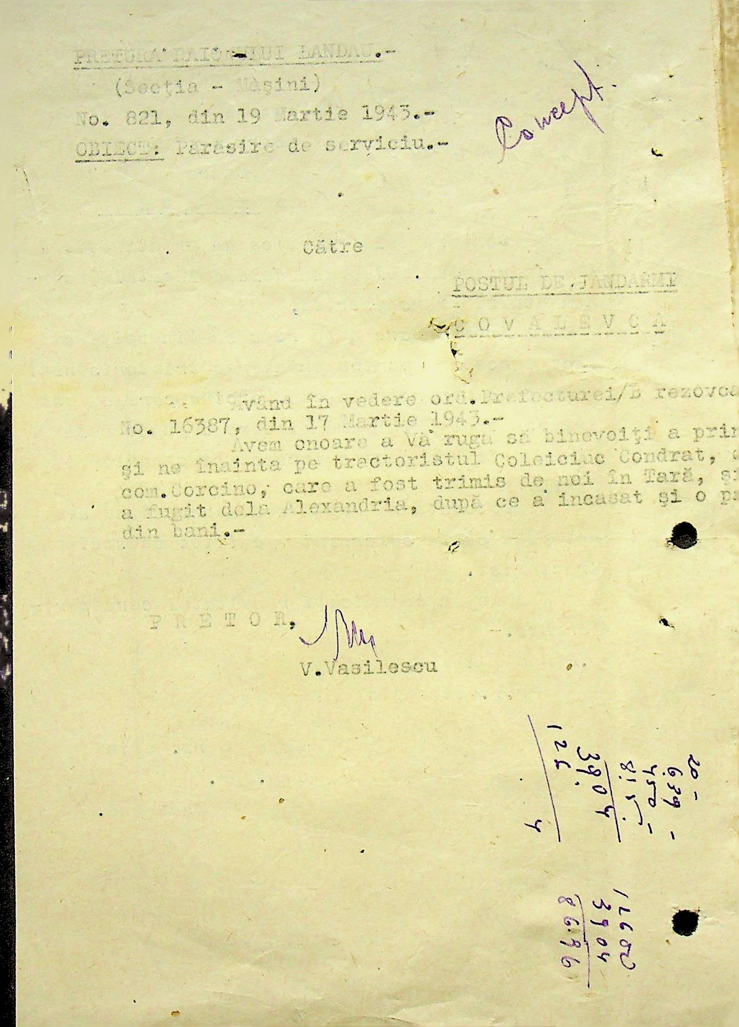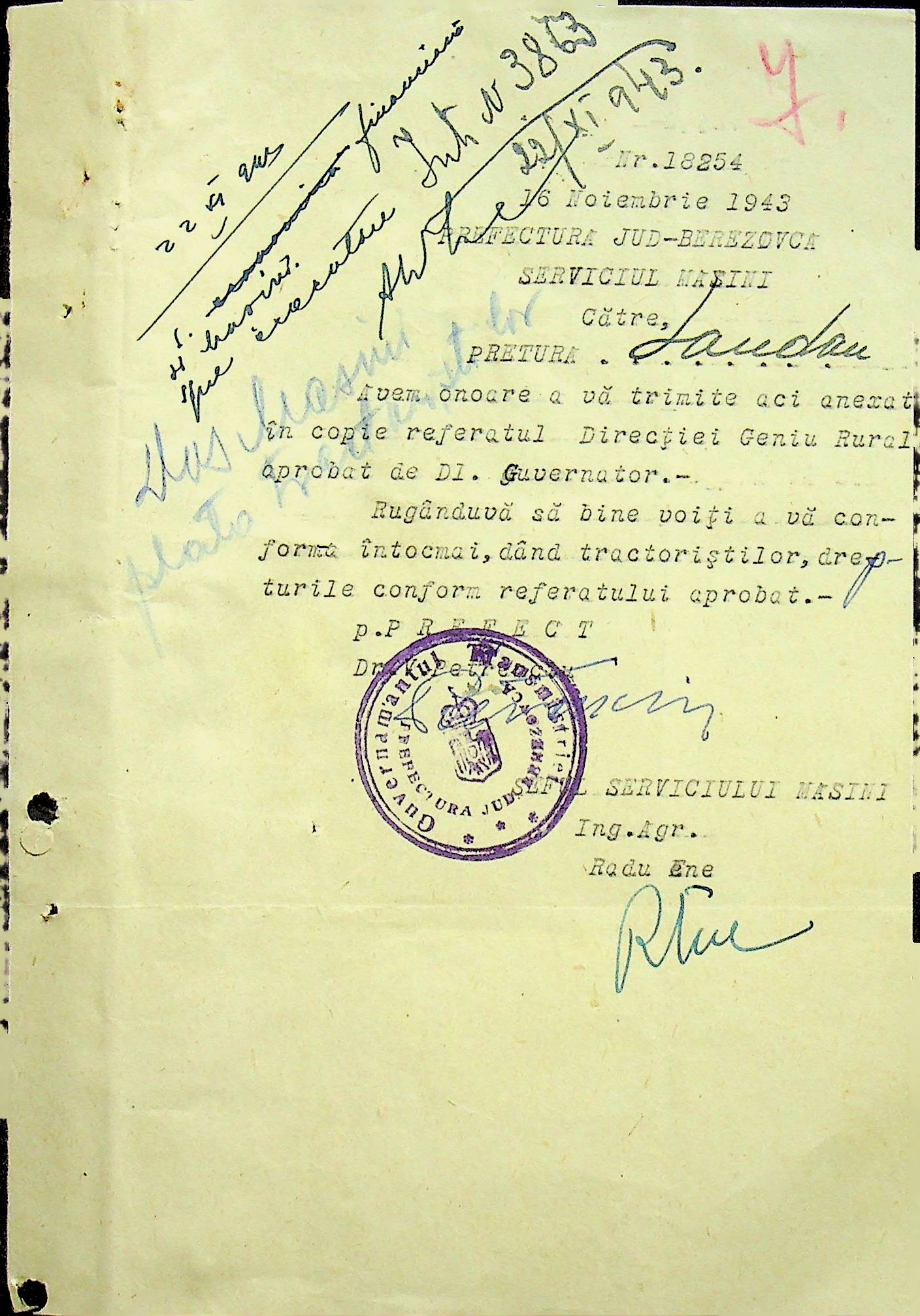 • • • • Справа № 105 Копія наказу дирекції механізації сільського господарства про виплату трактористам коштів за простій робочого часу через відсутність пального, листування з машинним відділом префектури про надання списку механіків і трактористів, які відправлені в Румунію. Списки трактористів, механізаторів, водіїв та інших кваліфікованих робітників Ландауського району, які виїхали на роботу в Румунію. Розрахунки добових для персоналу, який приїхав з країни (Румунії)