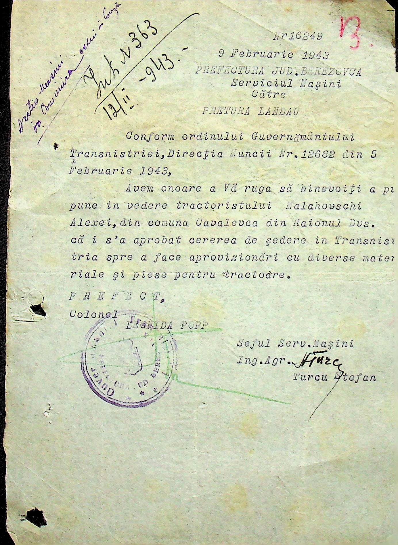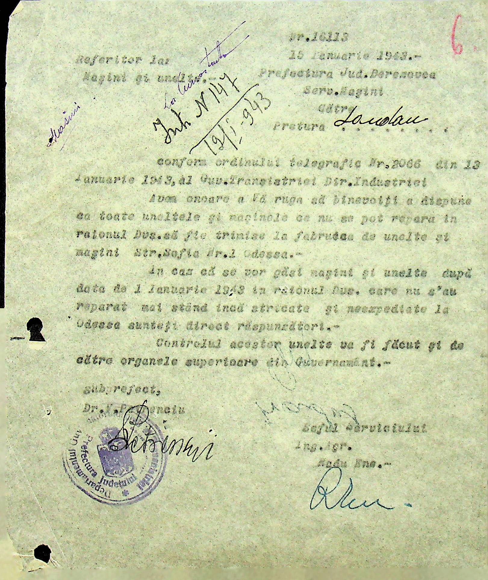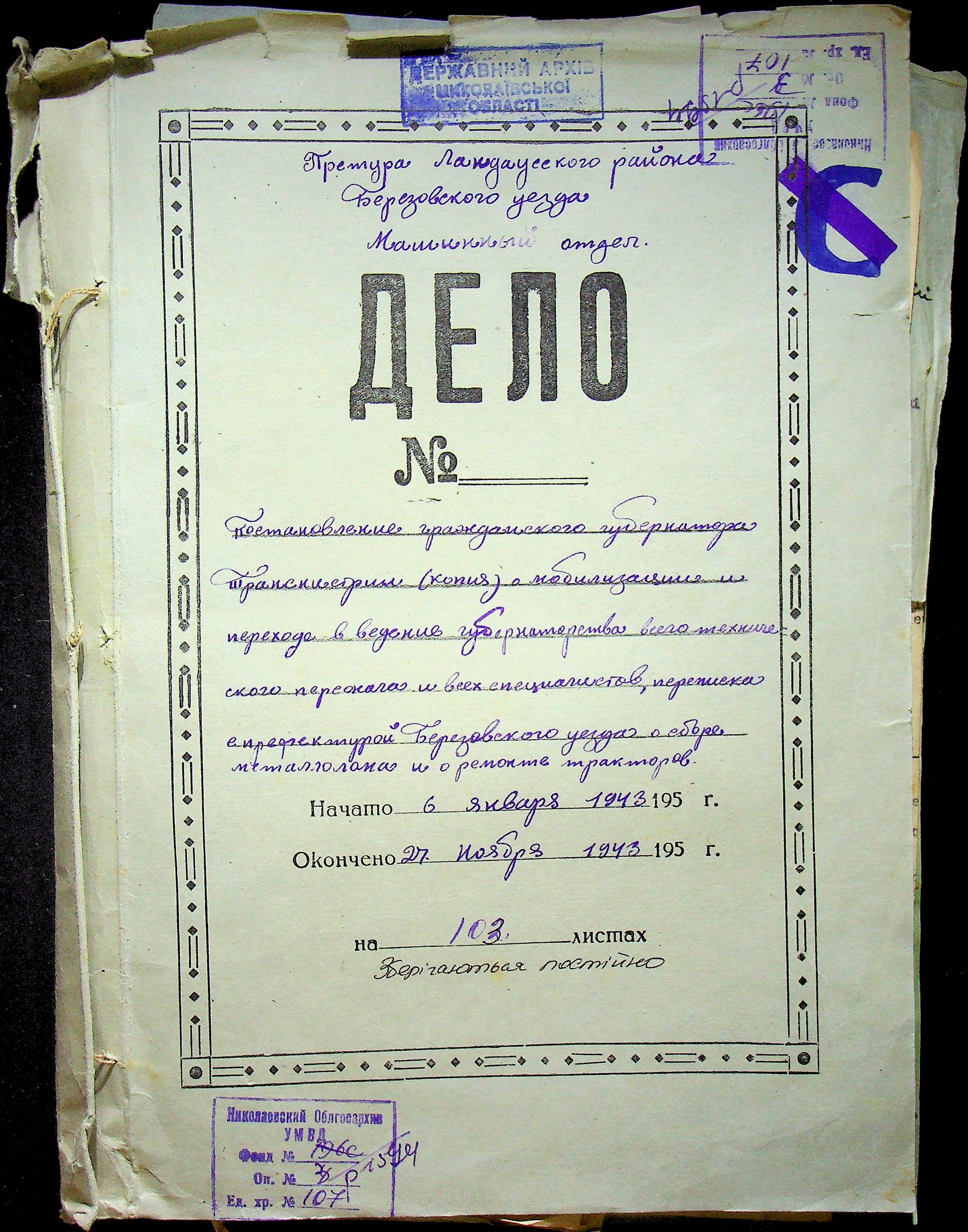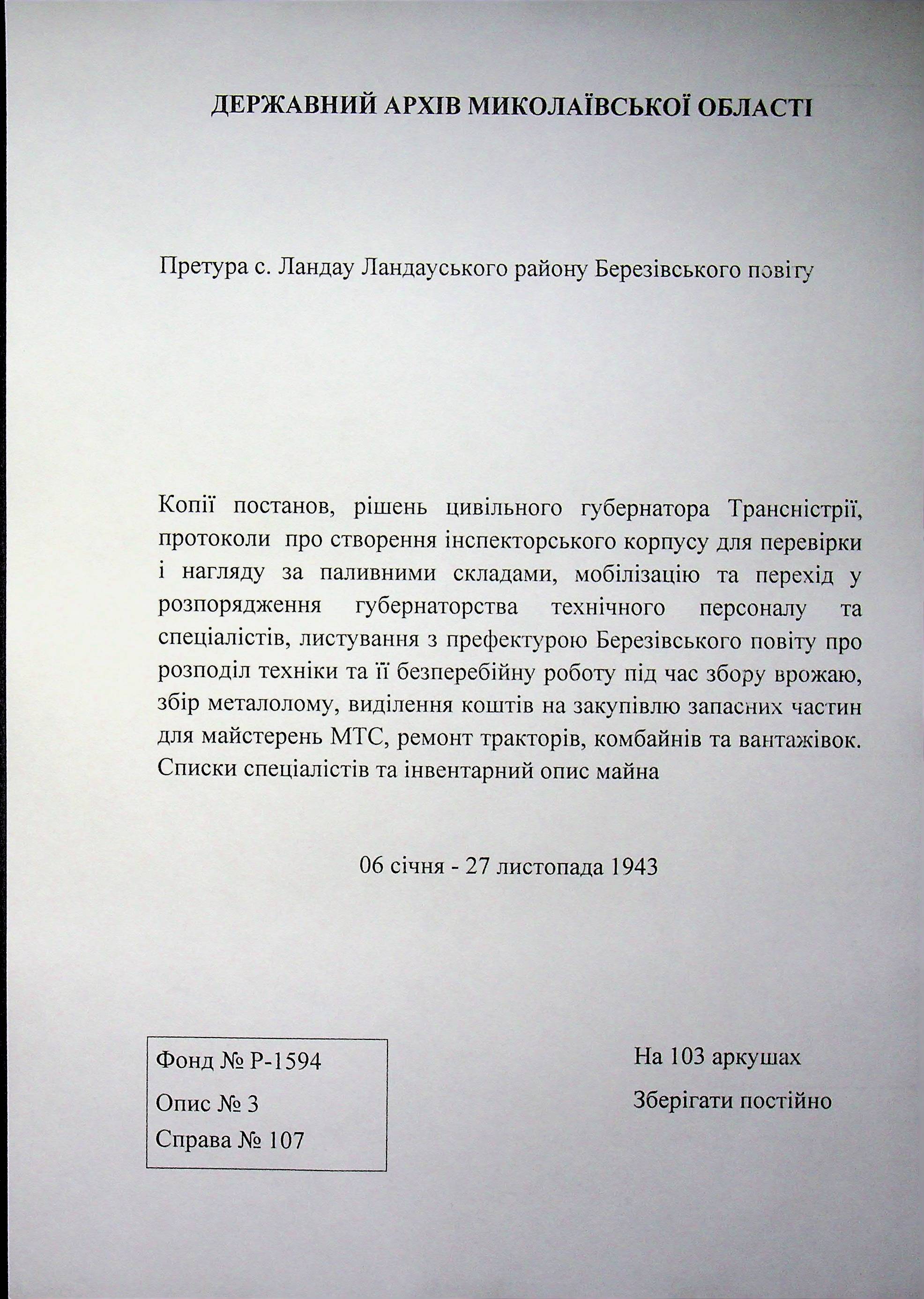 • • • • Справа № 107 Копії постанов, рішень цивільного губернатора Трансністрії, протоколи про створення інспекторського корпусу для перевірки і нагляду за паливними складами, мобілізацію та перехід у розпорядження губернаторства технічного персоналу та спеціалістів, листування з префектурою Березівського повіту про розподіл техніки та її безперебійну роботу під час збору врожаю, збір металолому, виділення коштів на закупівлю запасних частин для майстерень МТС, ремонт тракторів, комбайнів та вантажівок.Списки спеціалістів та інвентарний опис майна