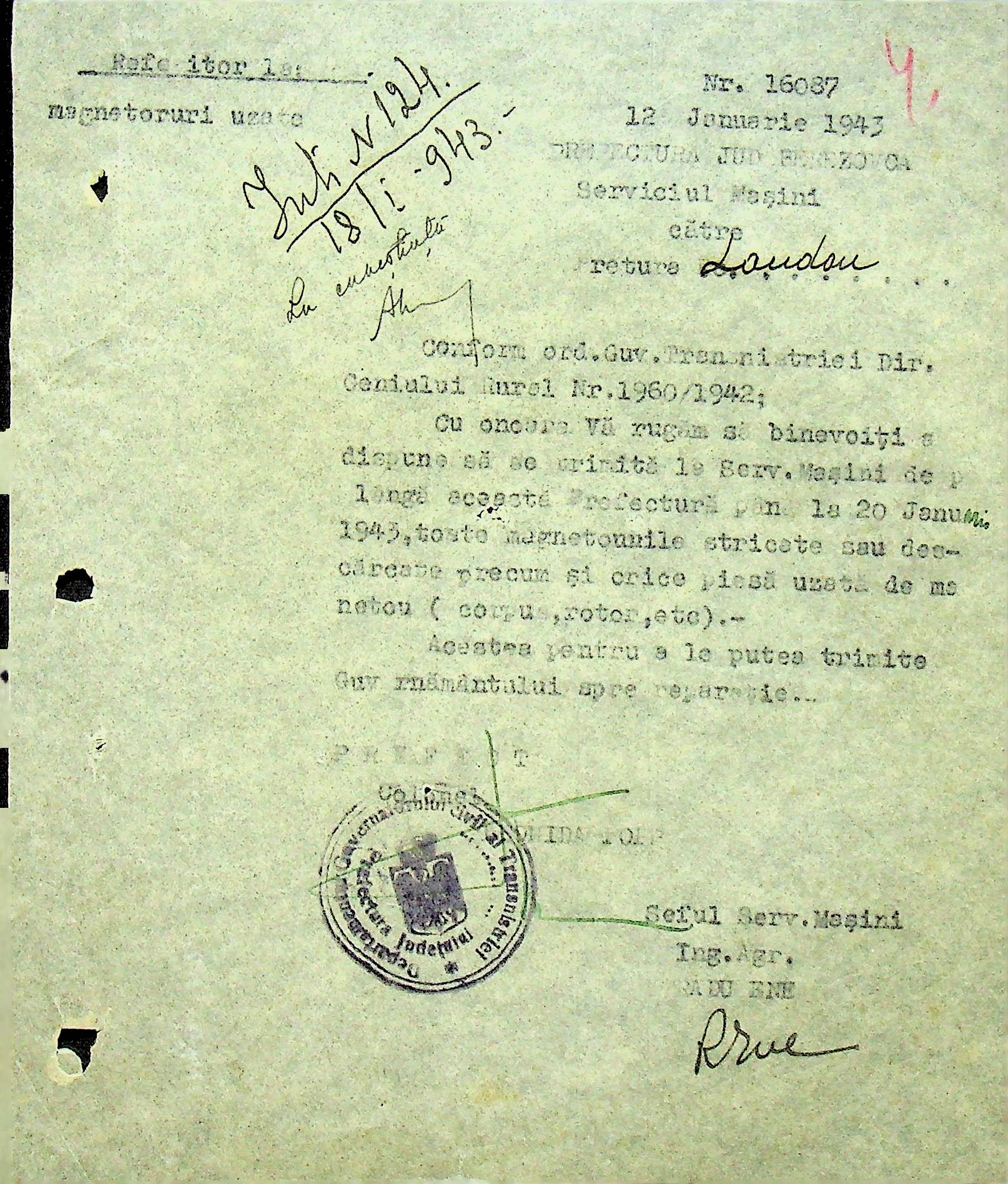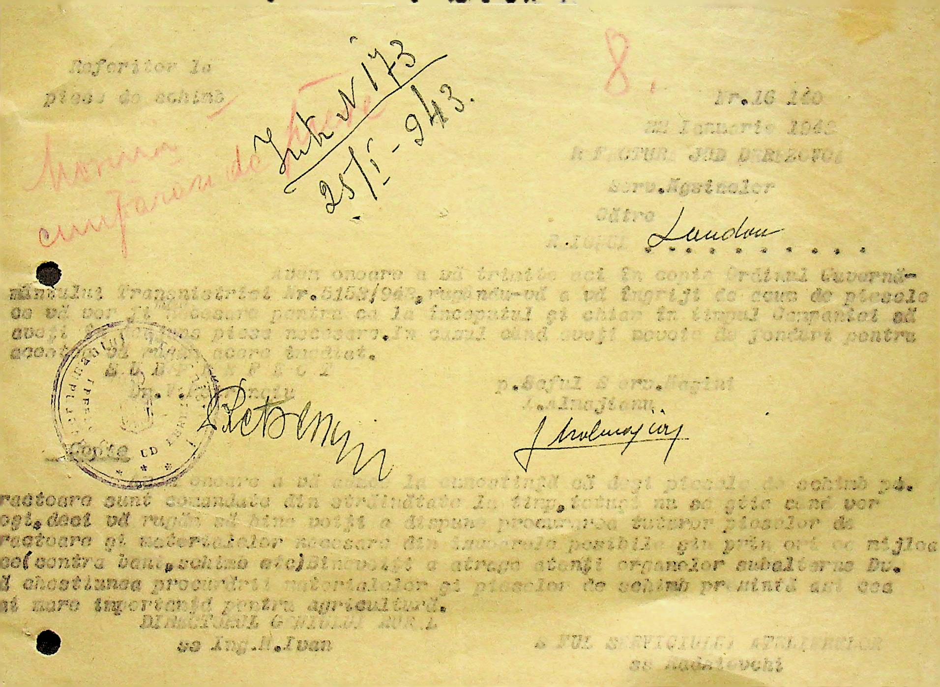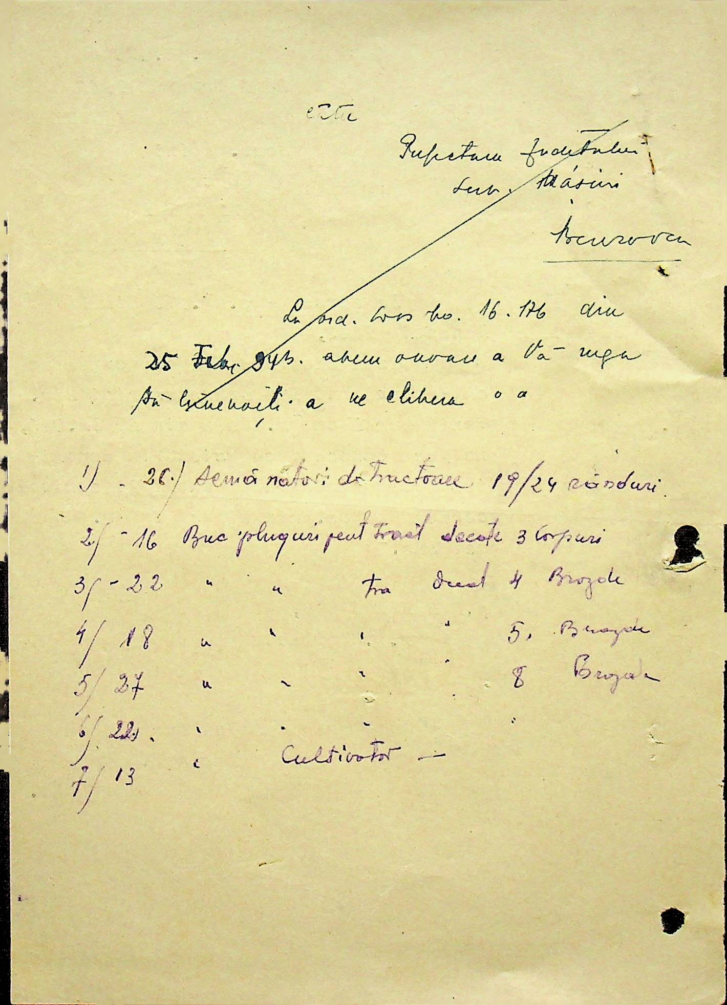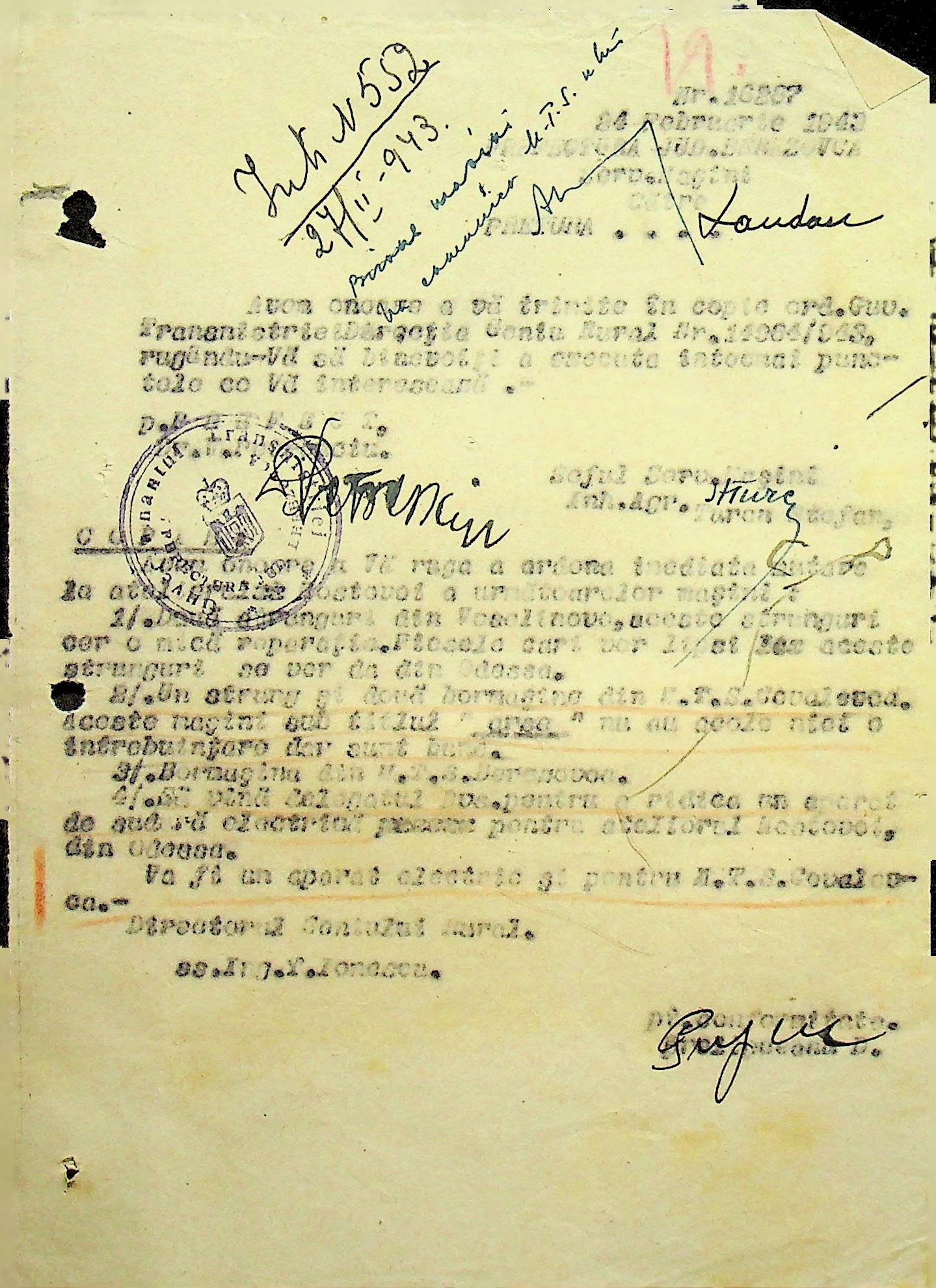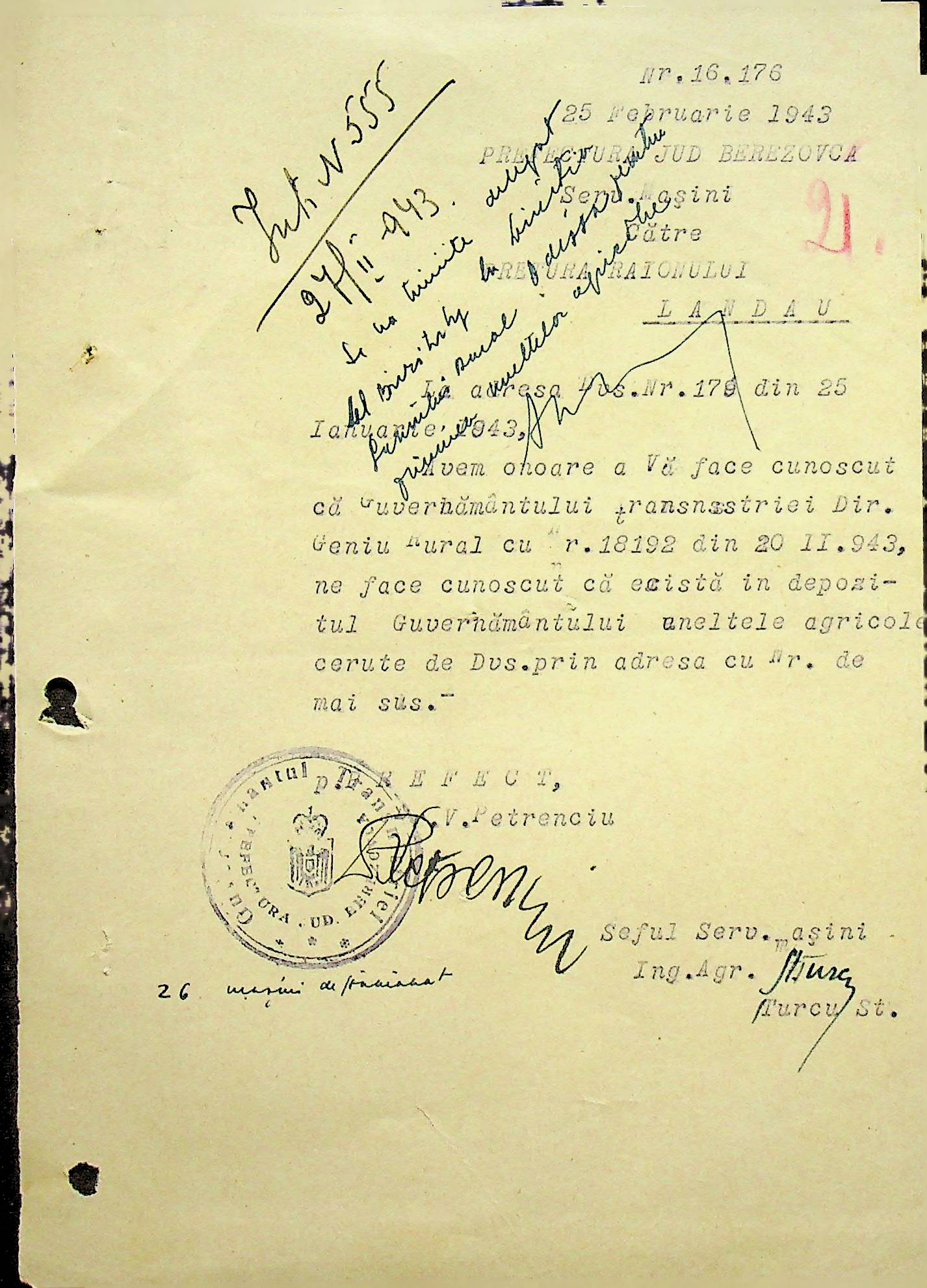 • • • • Справа № 107 Копії постанов, рішень цивільного губернатора Трансністрії, протоколи про створення інспекторського корпусу для перевірки і нагляду за паливними складами, мобілізацію та перехід у розпорядження губернаторства технічного персоналу та спеціалістів, листування з префектурою Березівського повіту про розподіл техніки та її безперебійну роботу під час збору врожаю, збір металолому, виділення коштів на закупівлю запасних частин для майстерень МТС, ремонт тракторів, комбайнів та вантажівок.Списки спеціалістів та інвентарний опис майна