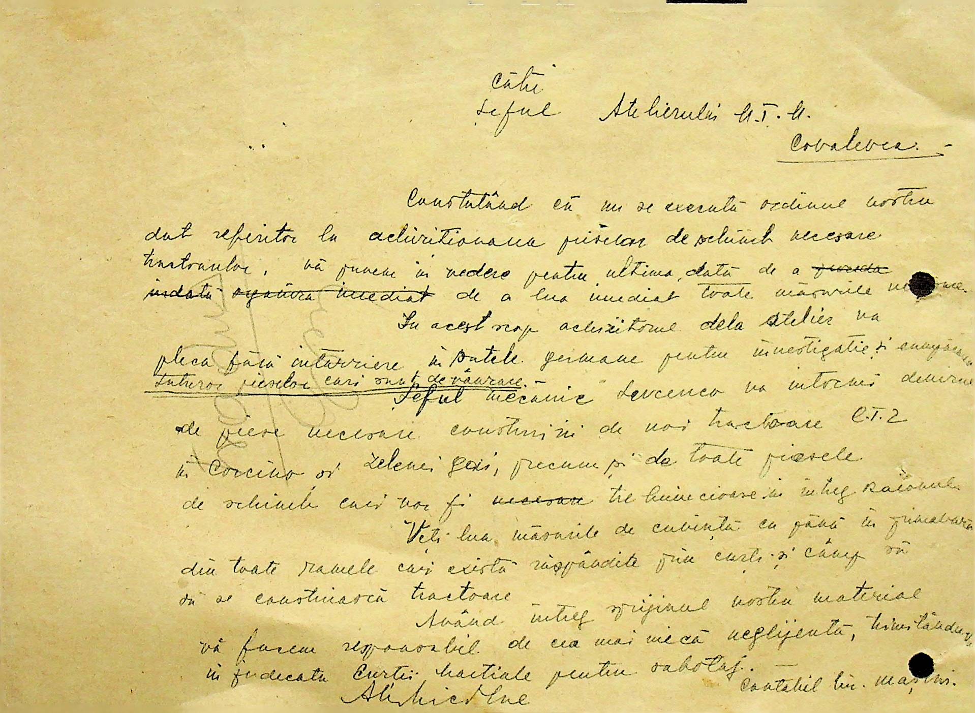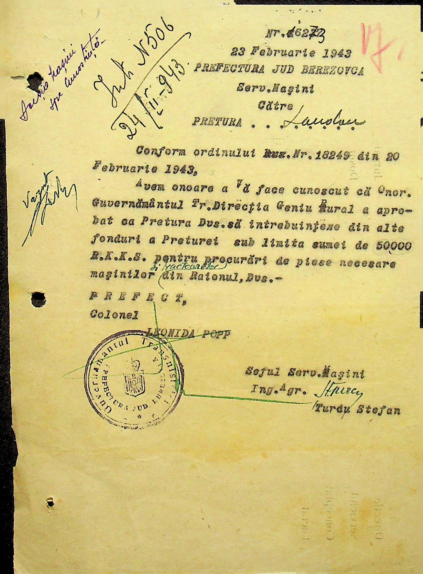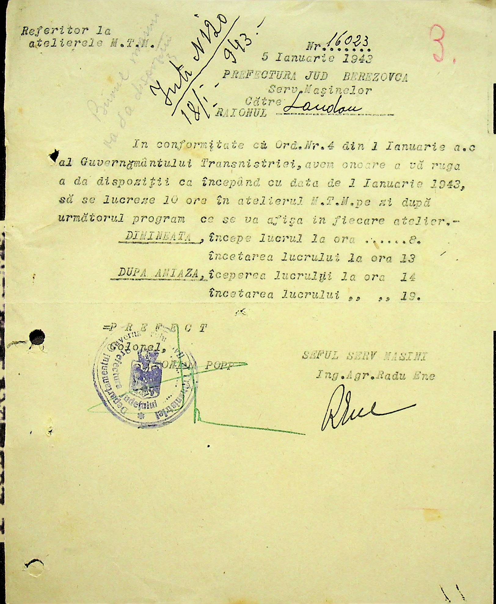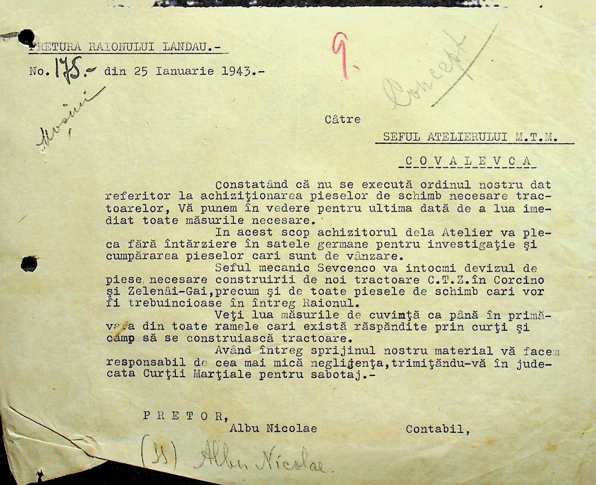 • • • • Справа № 107 Копії постанов, рішень цивільного губернатора Трансністрії, протоколи про створення інспекторського корпусу для перевірки і нагляду за паливними складами, мобілізацію та перехід у розпорядження губернаторства технічного персоналу та спеціалістів, листування з префектурою Березівського повіту про розподіл техніки та її безперебійну роботу під час збору врожаю, збір металолому, виділення коштів на закупівлю запасних частин для майстерень МТС, ремонт тракторів, комбайнів та вантажівок.Списки спеціалістів та інвентарний опис майна