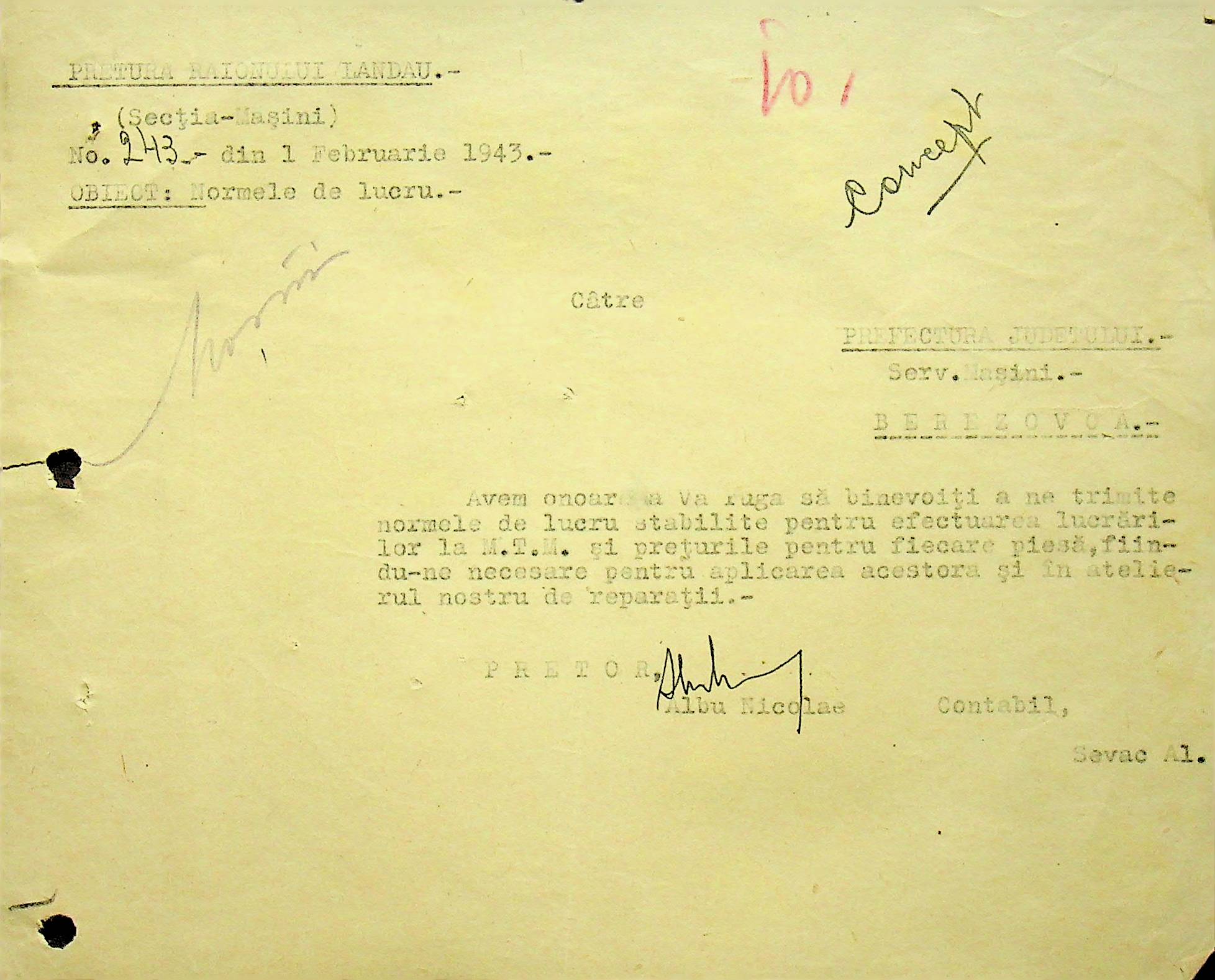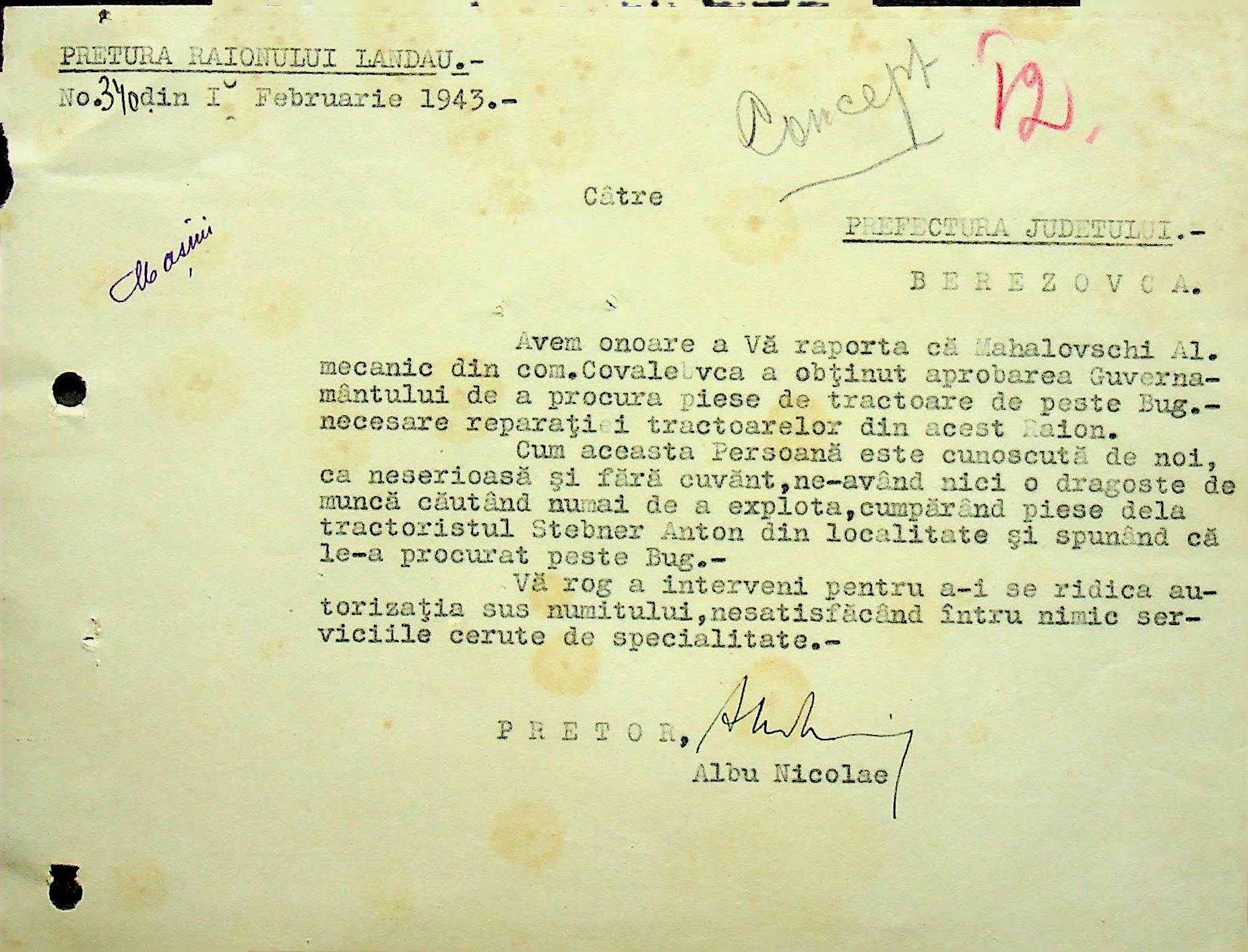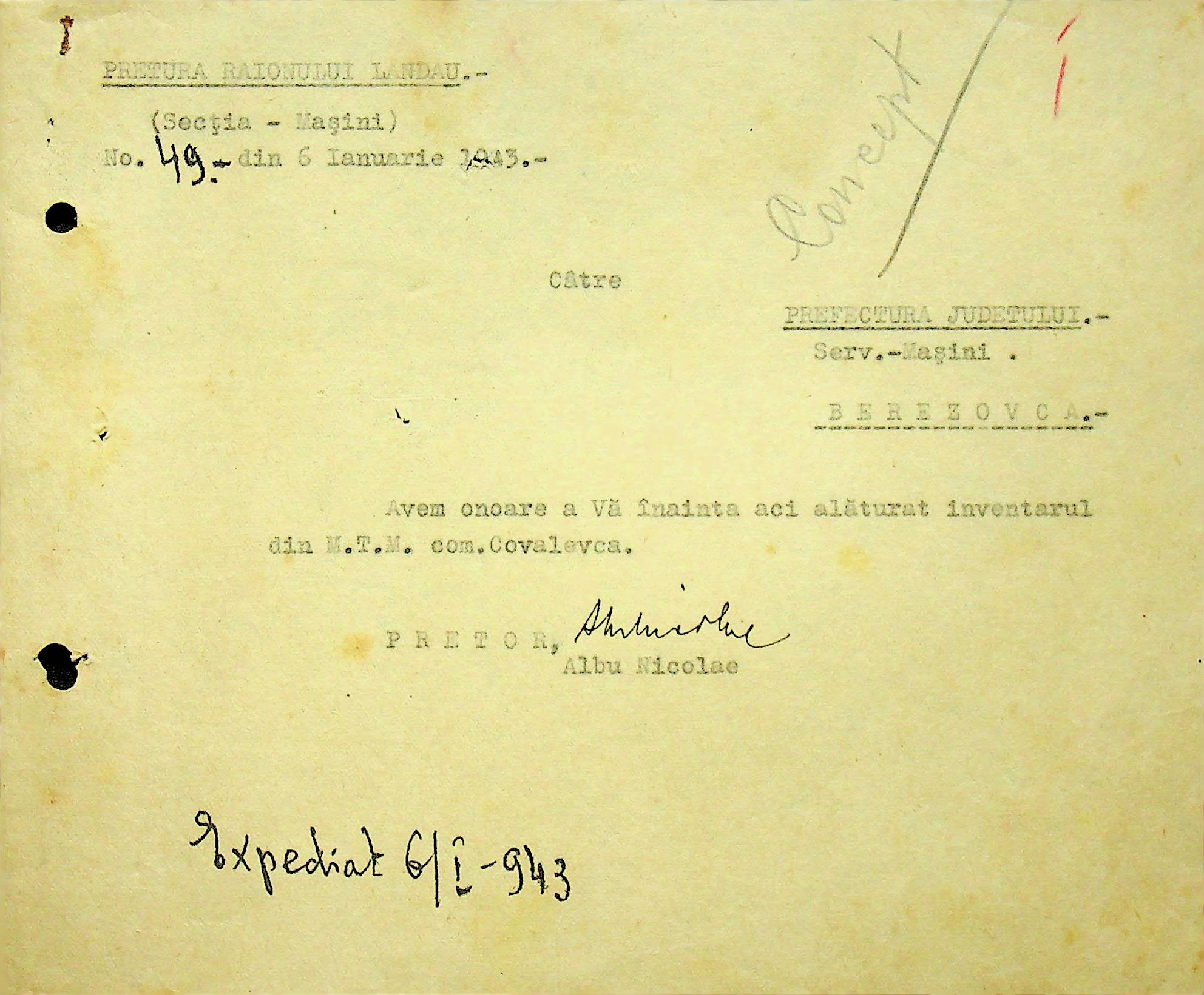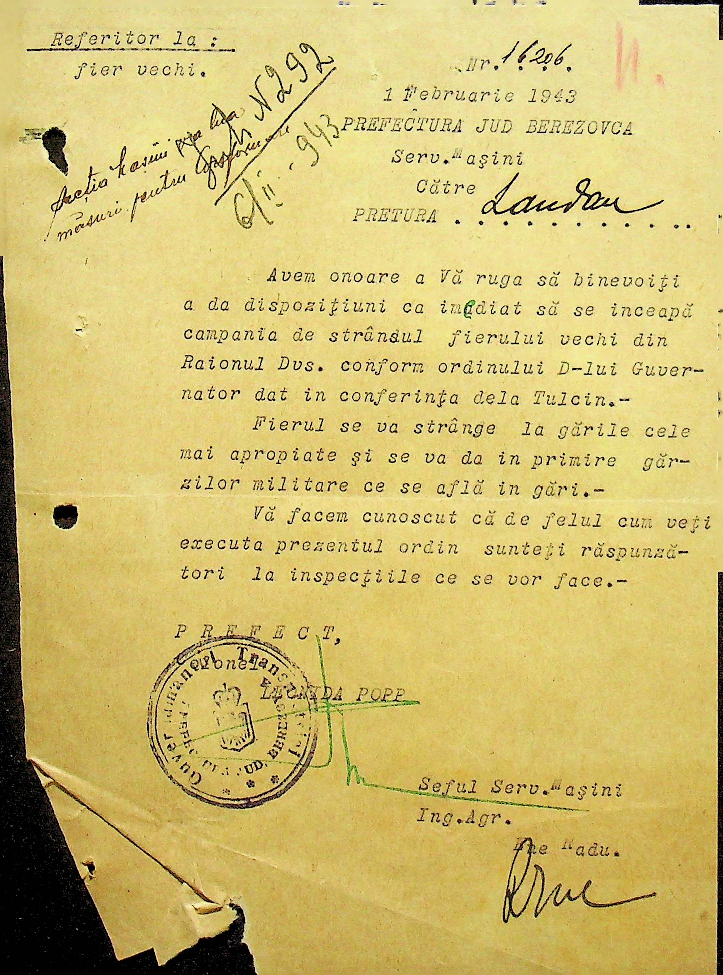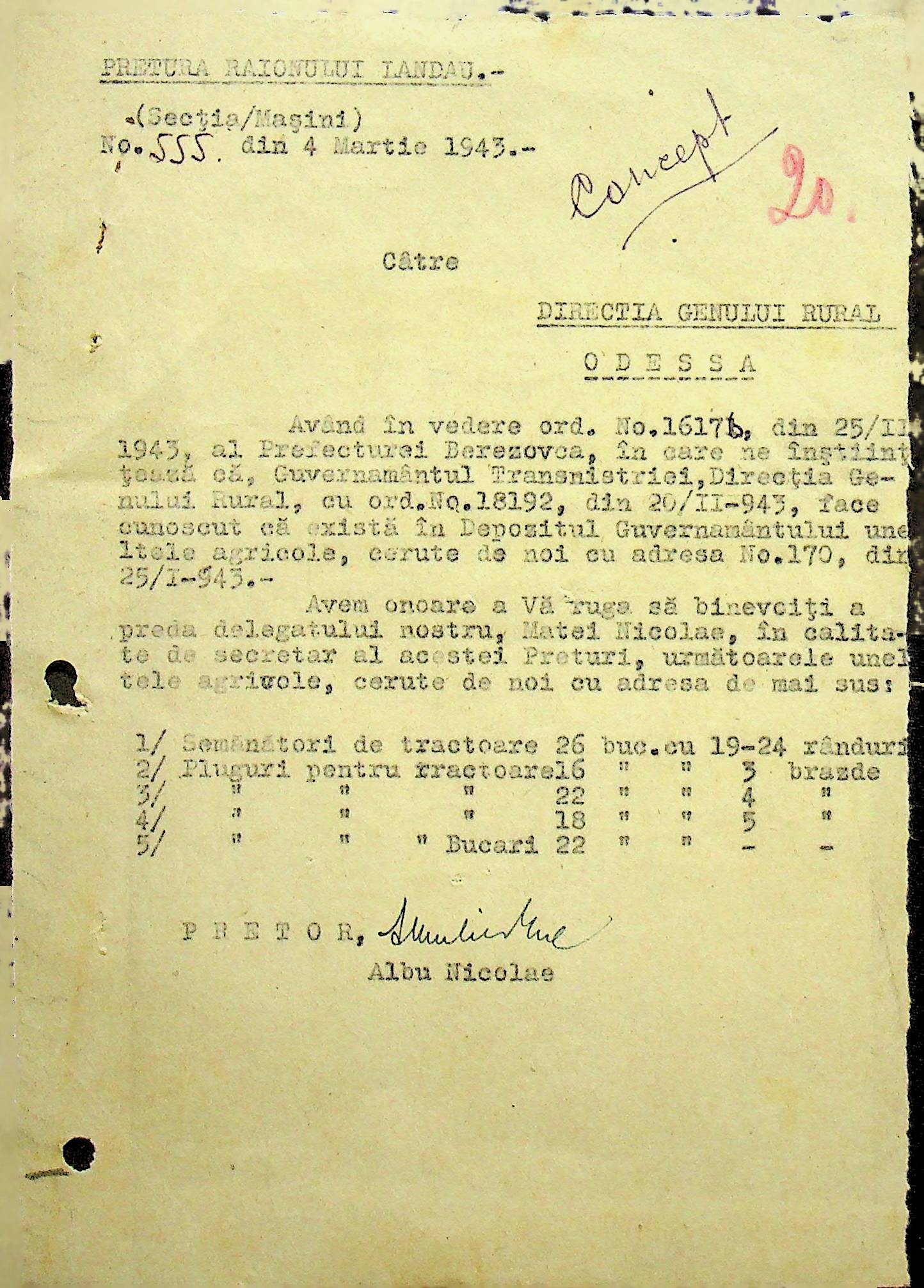 • • • • Справа № 107 Копії постанов, рішень цивільного губернатора Трансністрії, протоколи про створення інспекторського корпусу для перевірки і нагляду за паливними складами, мобілізацію та перехід у розпорядження губернаторства технічного персоналу та спеціалістів, листування з префектурою Березівського повіту про розподіл техніки та її безперебійну роботу під час збору врожаю, збір металолому, виділення коштів на закупівлю запасних частин для майстерень МТС, ремонт тракторів, комбайнів та вантажівок.Списки спеціалістів та інвентарний опис майна