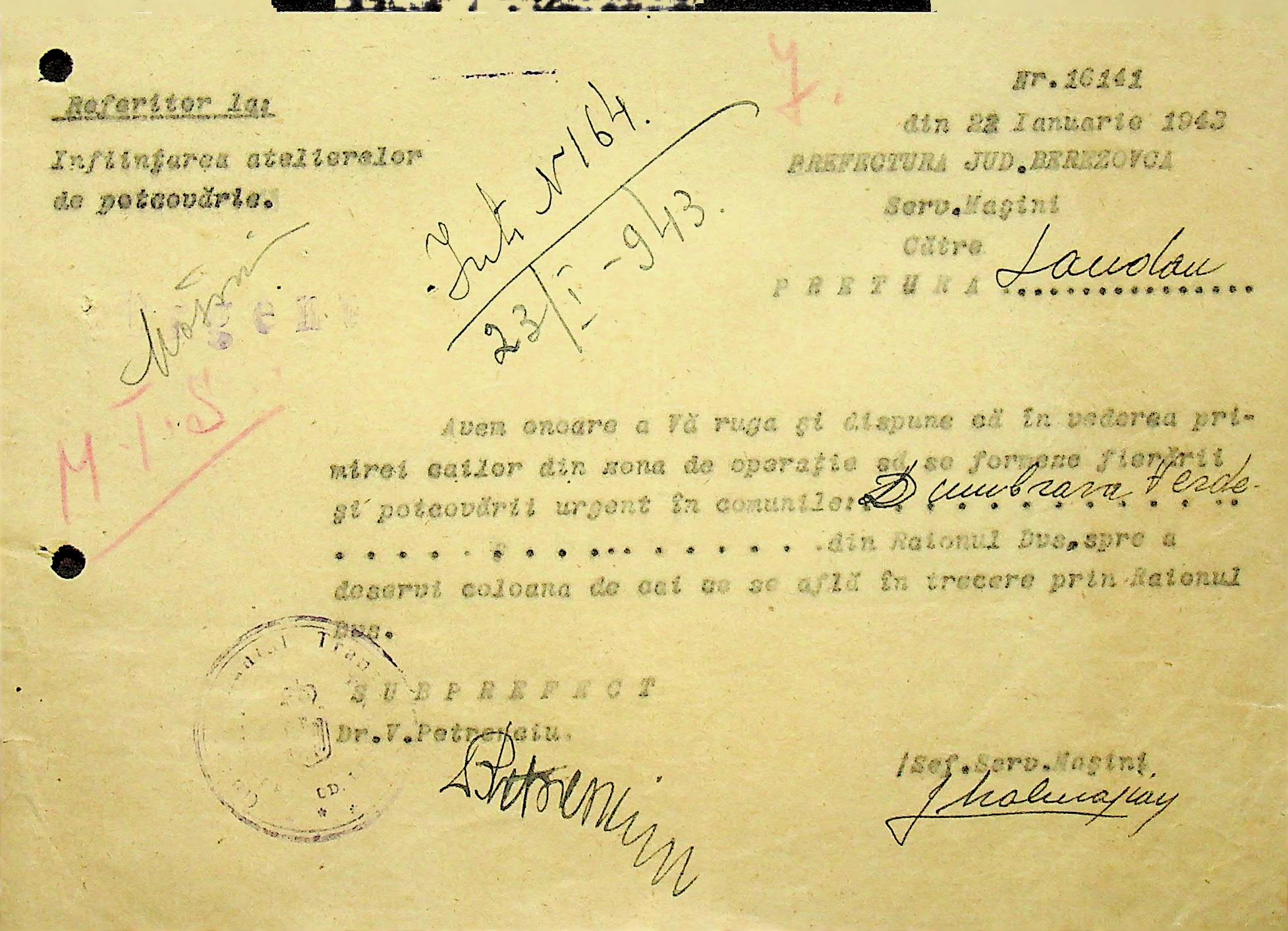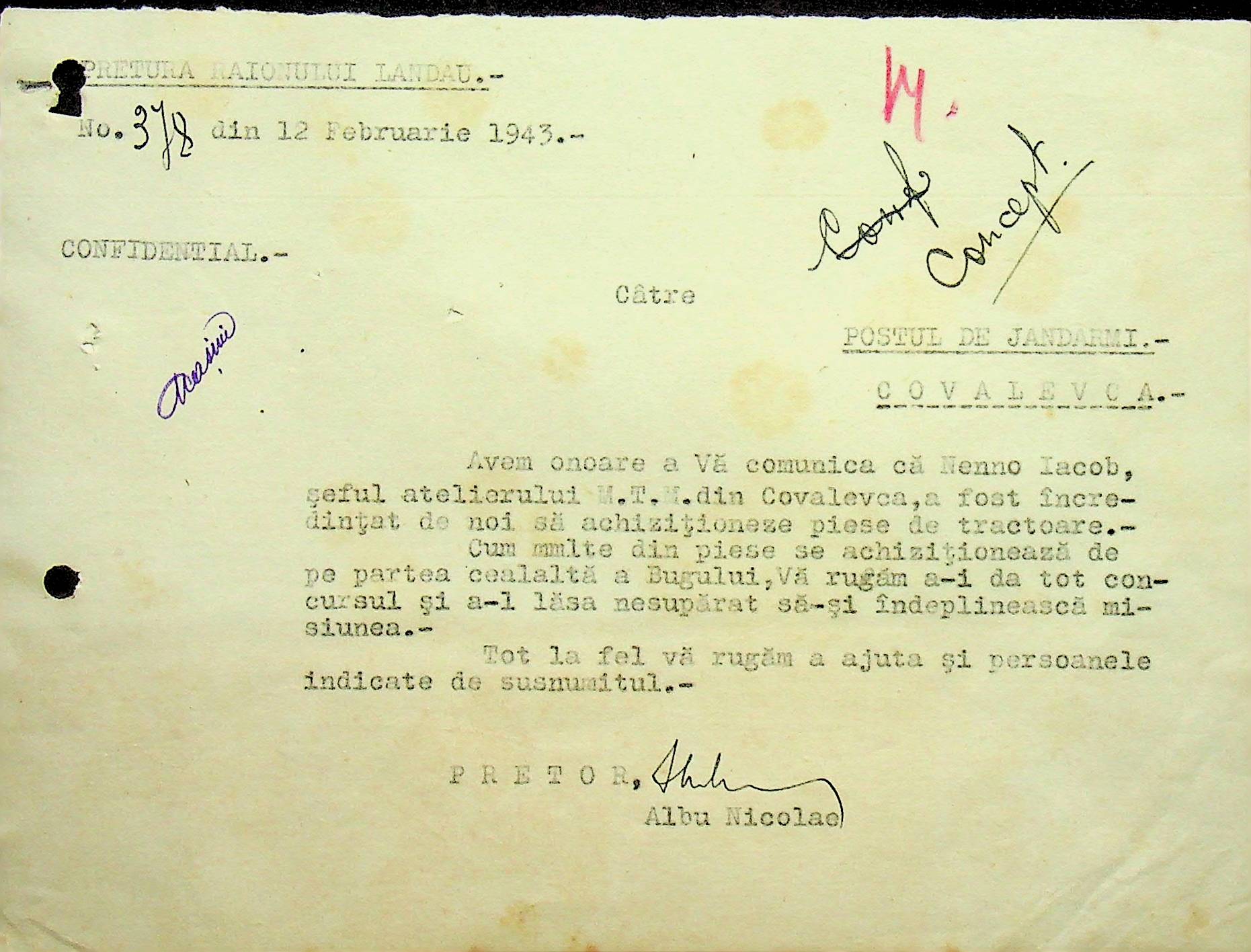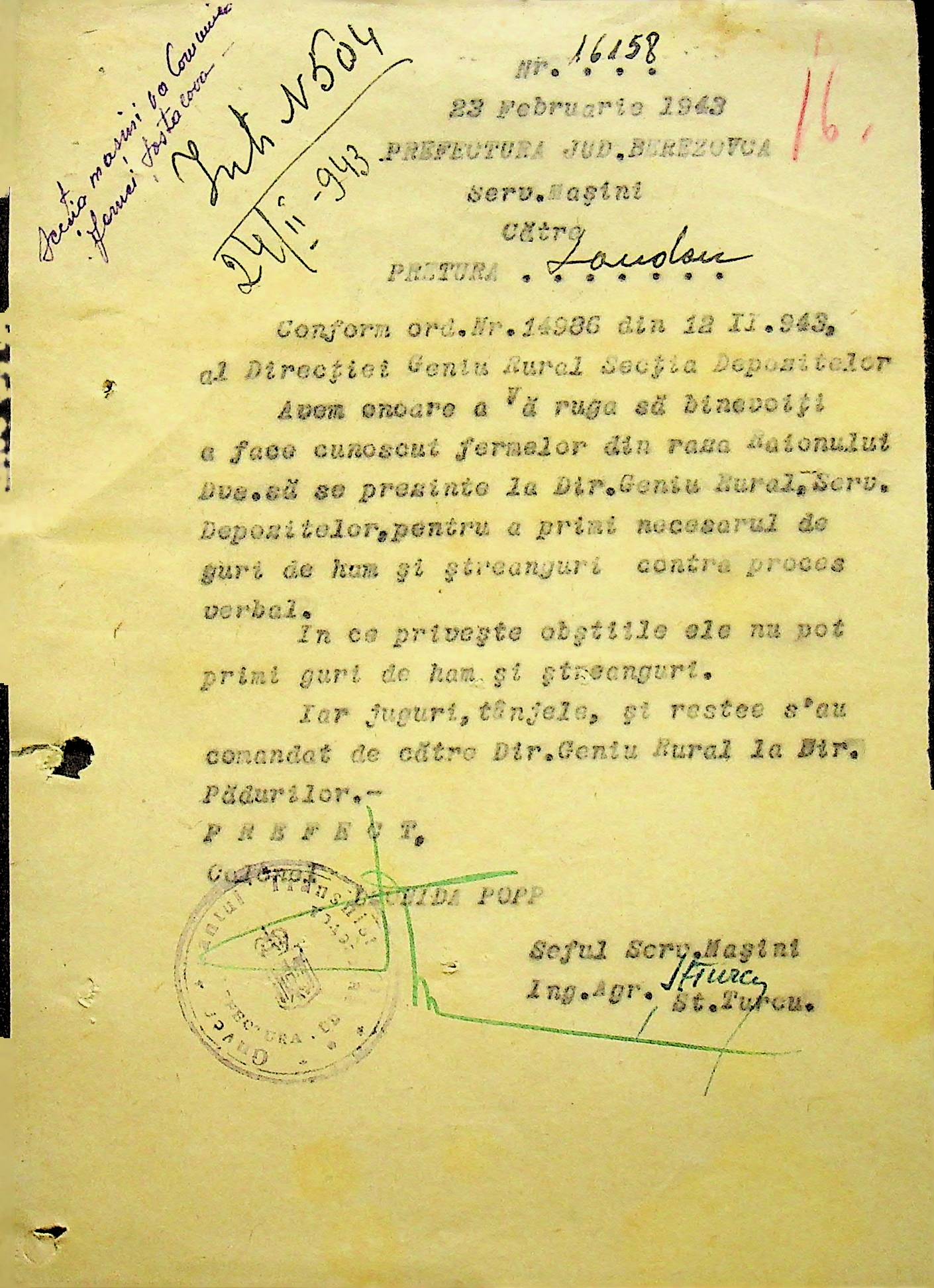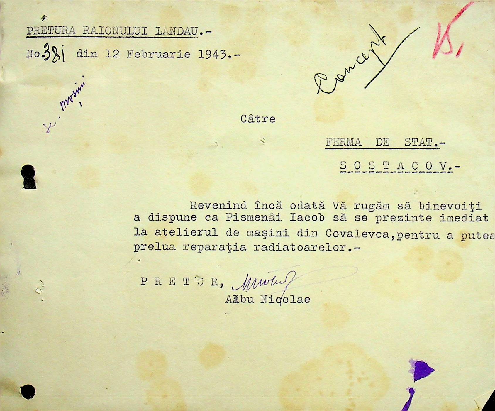 • • • • Справа № 107 Копії постанов, рішень цивільного губернатора Трансністрії, протоколи про створення інспекторського корпусу для перевірки і нагляду за паливними складами, мобілізацію та перехід у розпорядження губернаторства технічного персоналу та спеціалістів, листування з префектурою Березівського повіту про розподіл техніки та її безперебійну роботу під час збору врожаю, збір металолому, виділення коштів на закупівлю запасних частин для майстерень МТС, ремонт тракторів, комбайнів та вантажівок.Списки спеціалістів та інвентарний опис майна