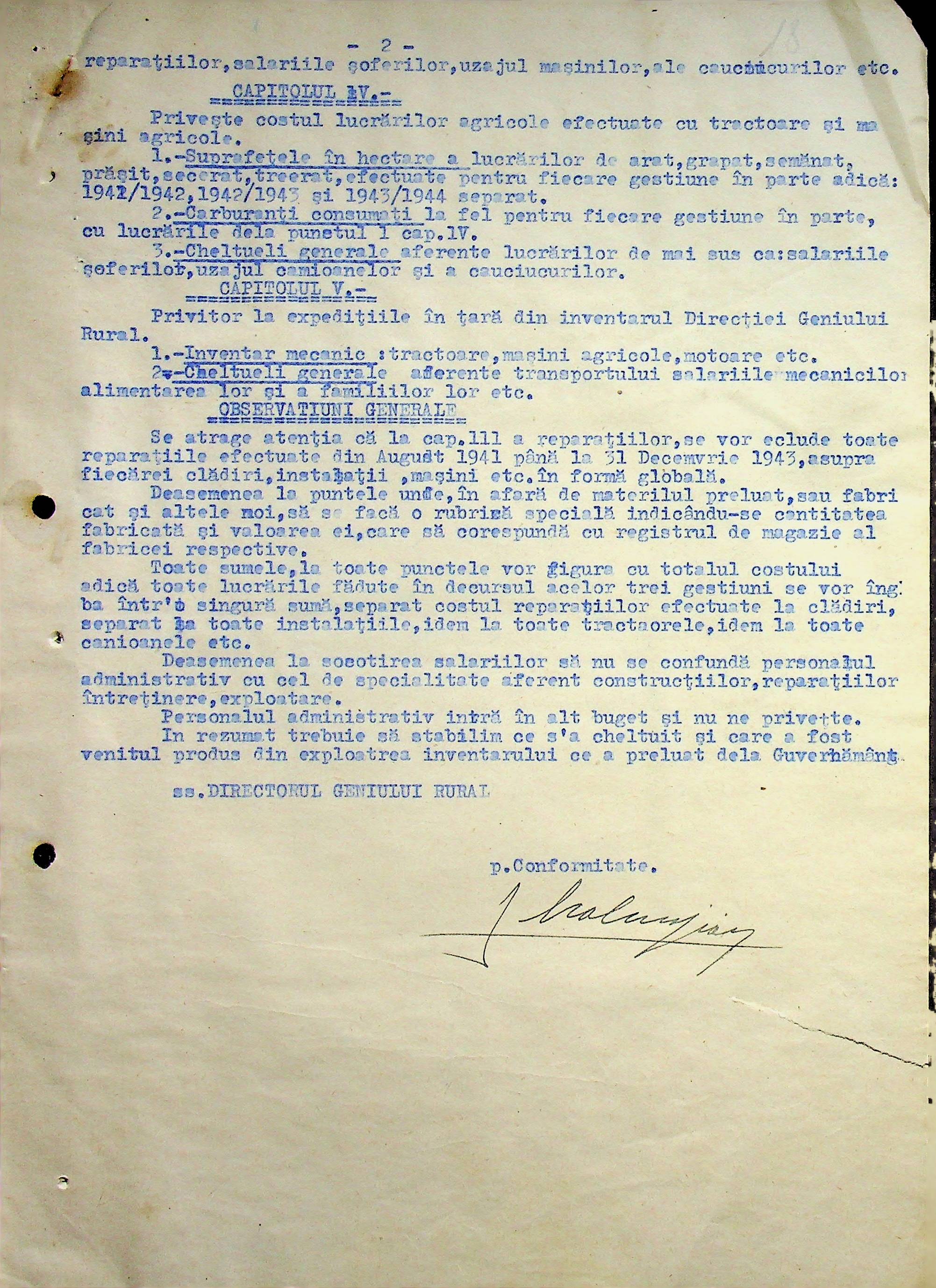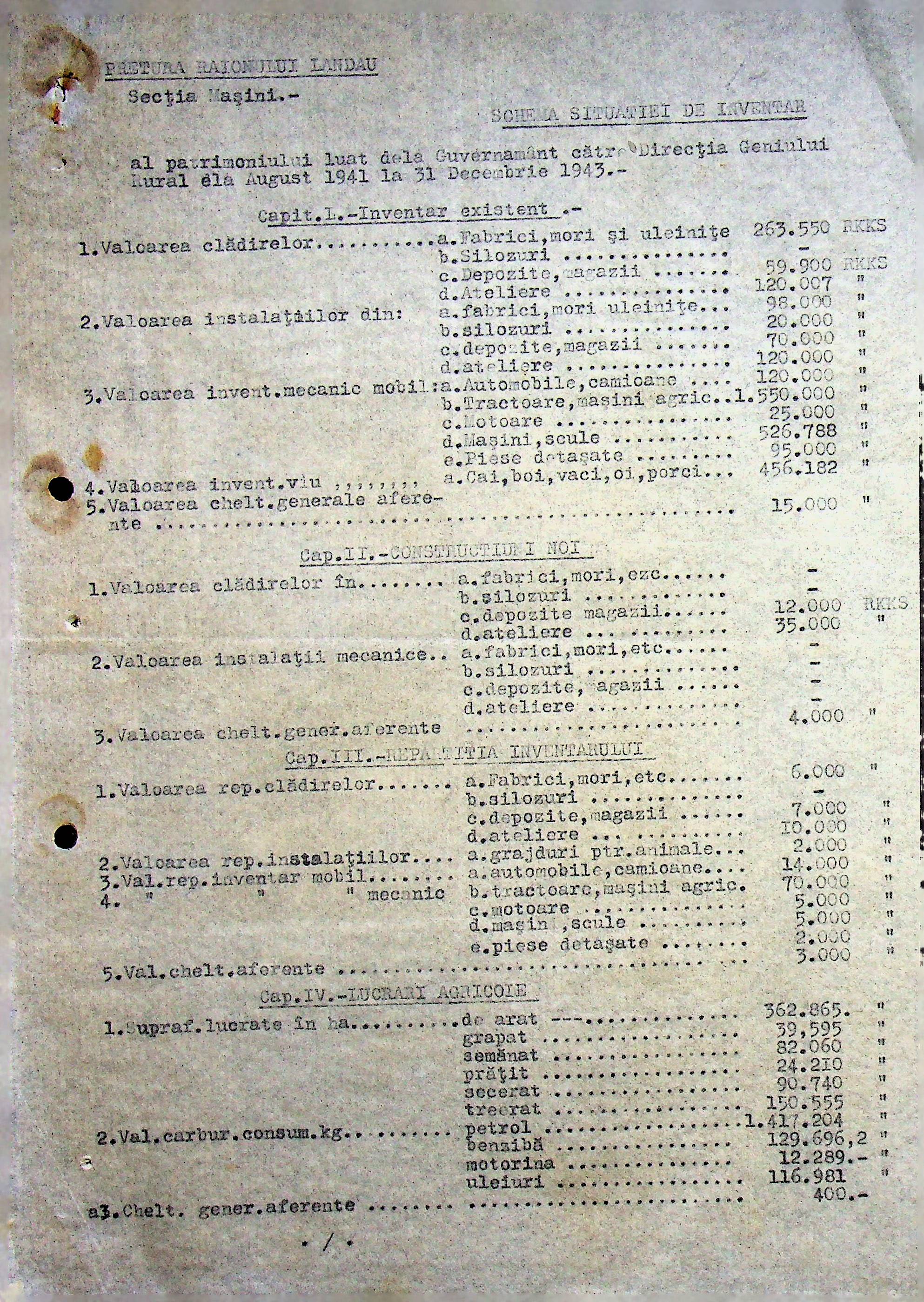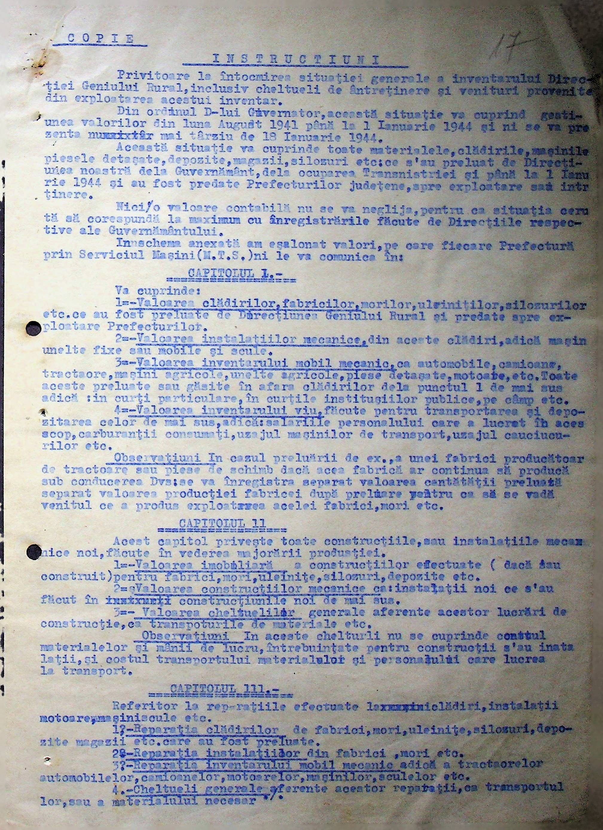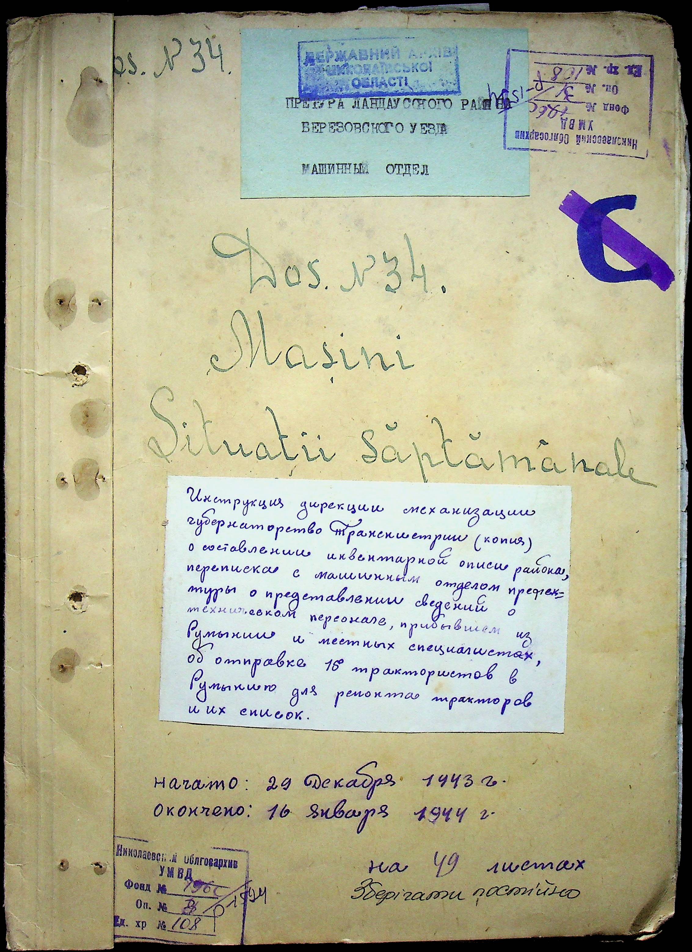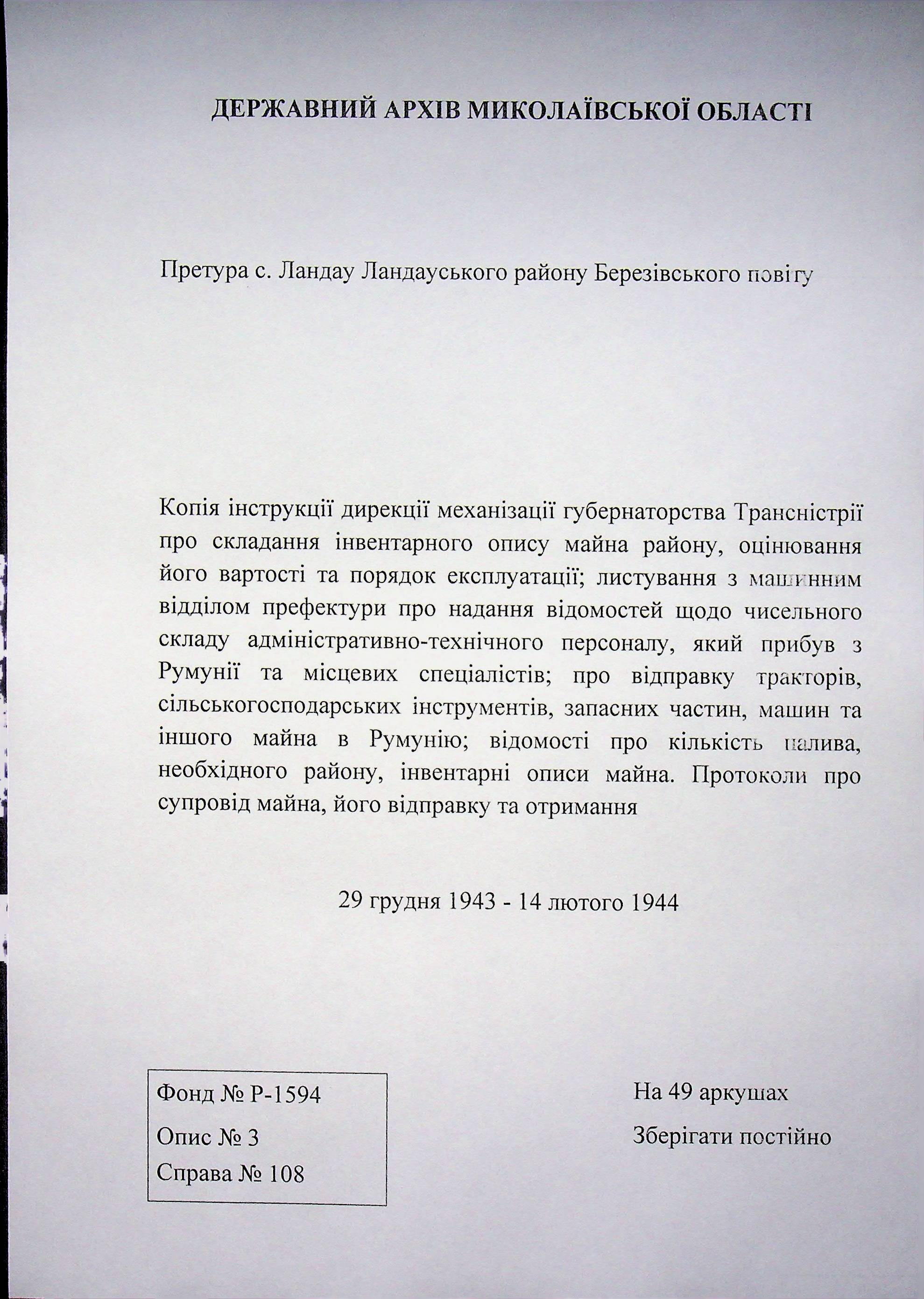 • • • • Справа № 108 Копія інструкції дирекції механізації губернаторства Трансністрії про складання інвентарного опису майна району, оцінювання його вартості та порядок експлуатації; листування з машинним відділом префектури про надання відомостей щодо чисельного складу адміністративно-технічного персоналу, який прибув з Румунії та місцевих спеціалістів; про відправку тракторів, сільськогосподарських інструментів, запасних частин, машин та іншого майна в Румунію; відомості про кількість палива, необхідного району, інвентарні описи майна. Протоколи про супровід майна, його відправку та отримання