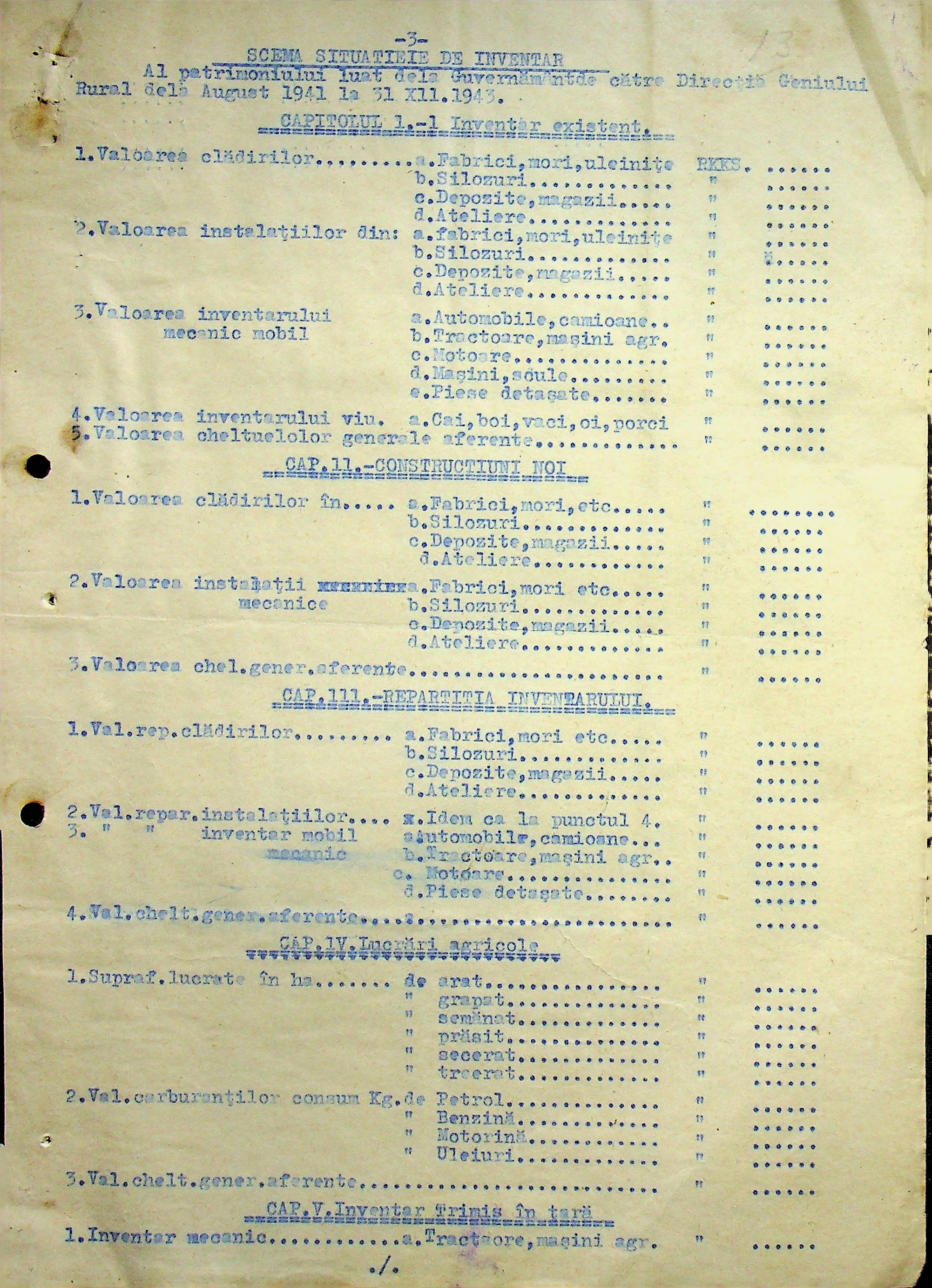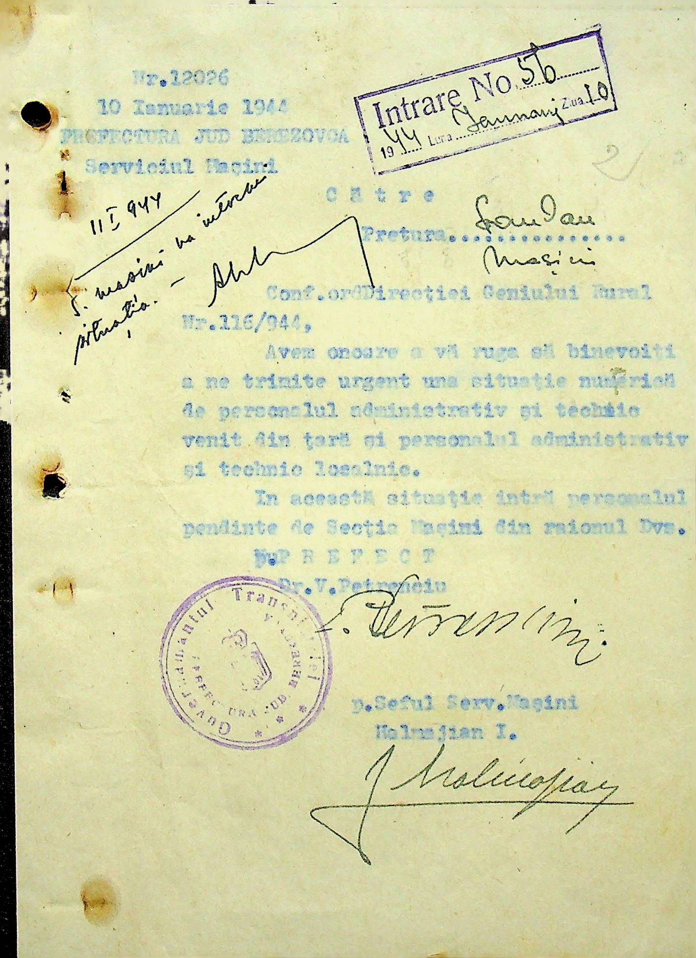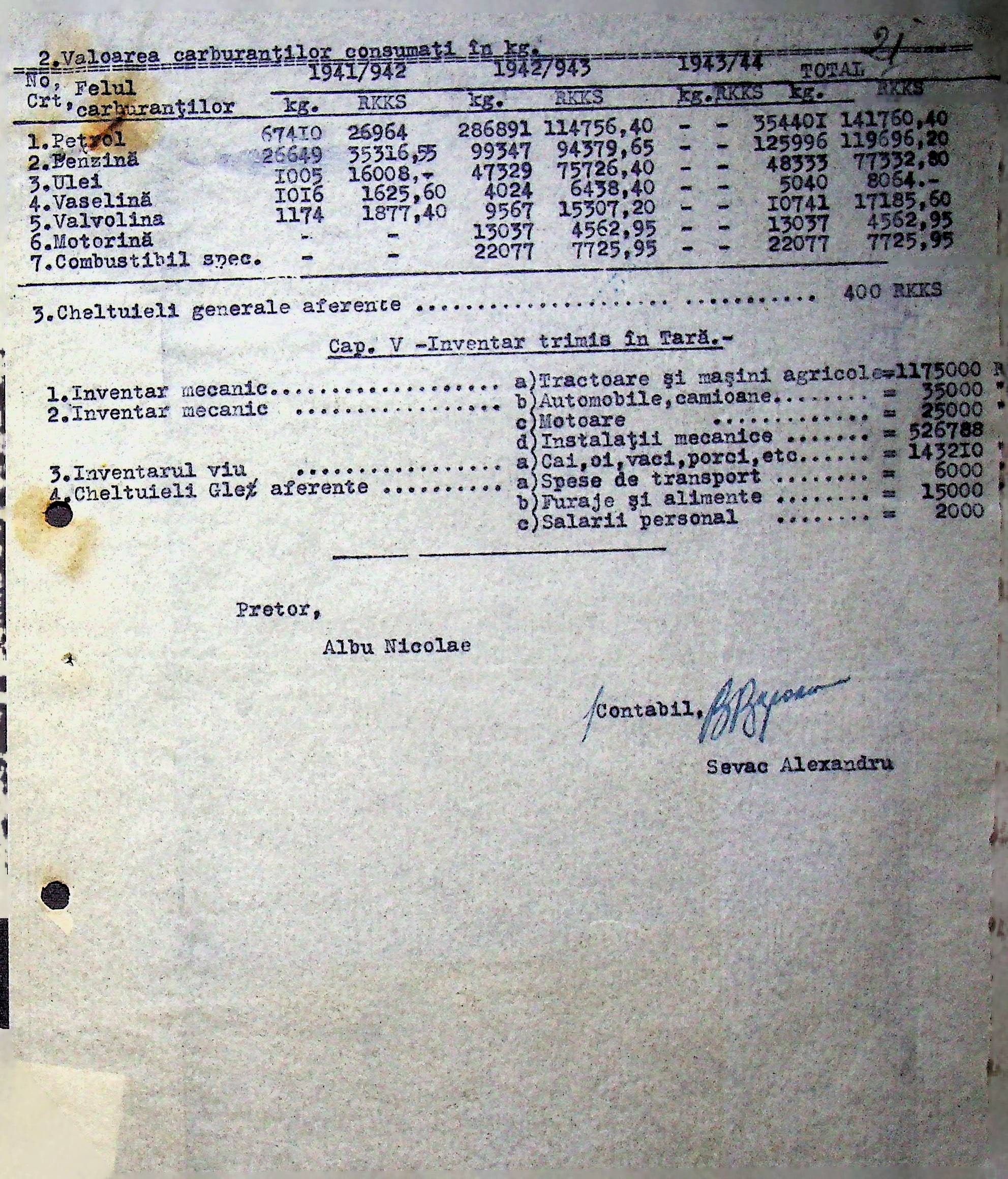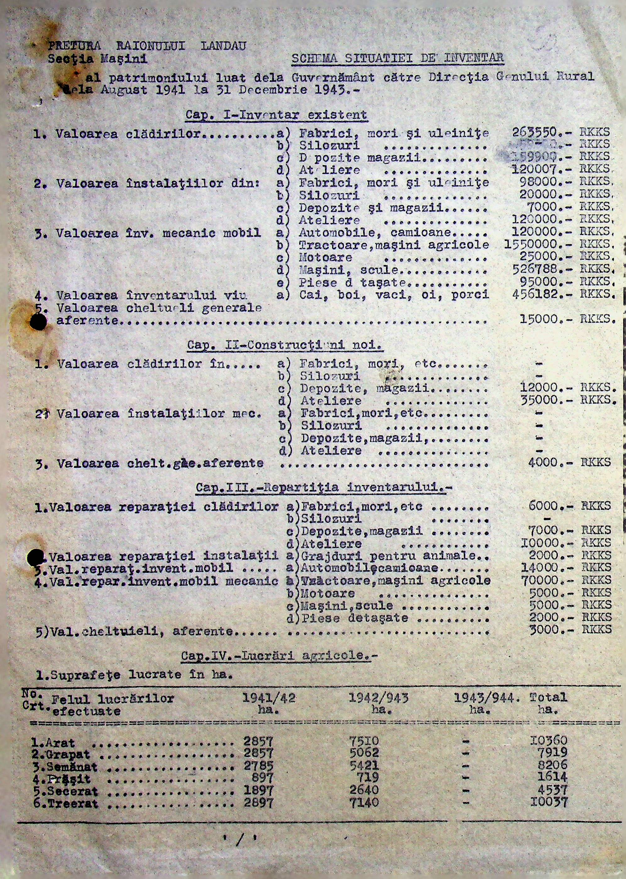 • • • • Справа № 108 Копія інструкції дирекції механізації губернаторства Трансністрії про складання інвентарного опису майна району, оцінювання його вартості та порядок експлуатації; листування з машинним відділом префектури про надання відомостей щодо чисельного складу адміністративно-технічного персоналу, який прибув з Румунії та місцевих спеціалістів; про відправку тракторів, сільськогосподарських інструментів, запасних частин, машин та іншого майна в Румунію; відомості про кількість палива, необхідного району, інвентарні описи майна. Протоколи про супровід майна, його відправку та отримання