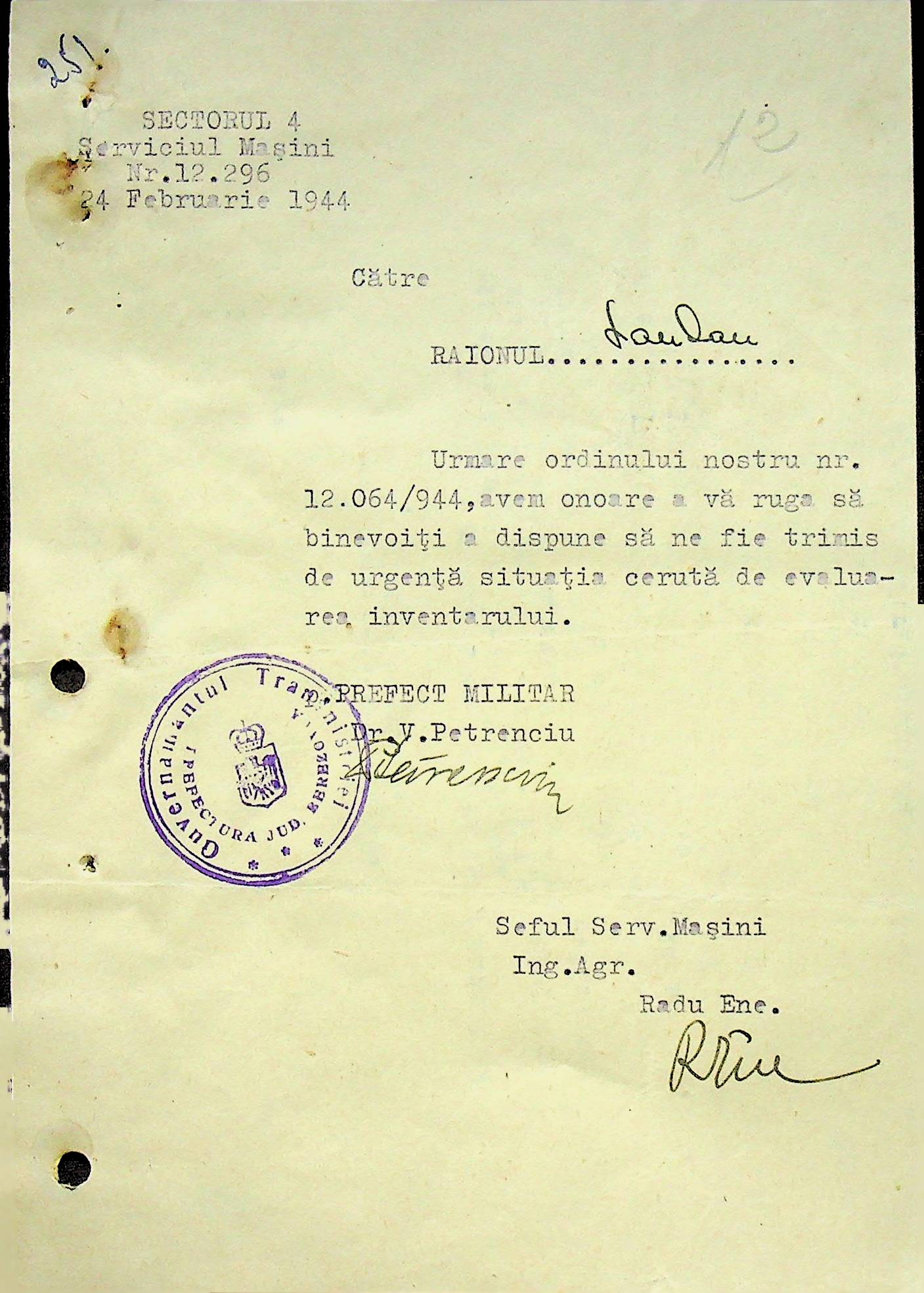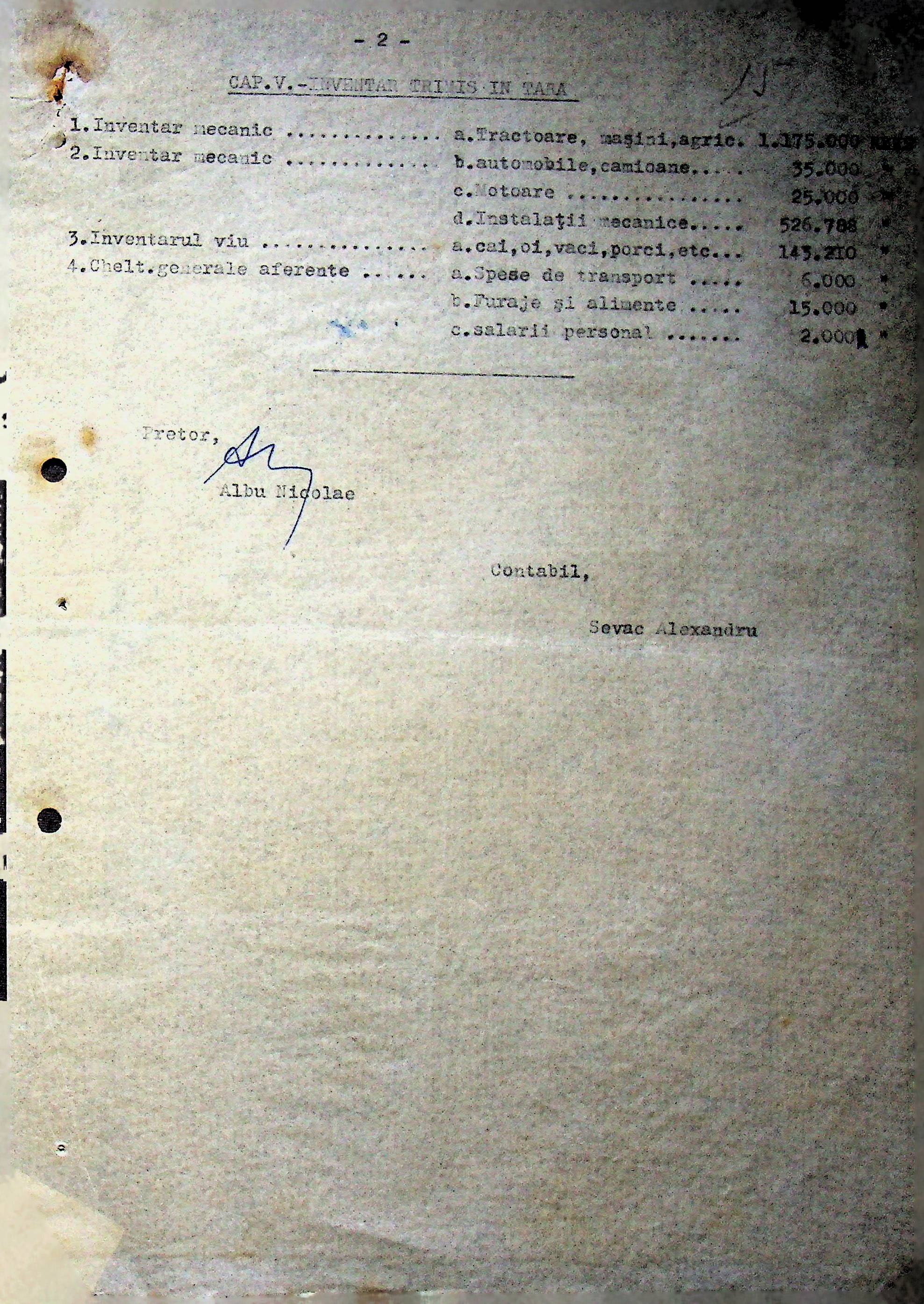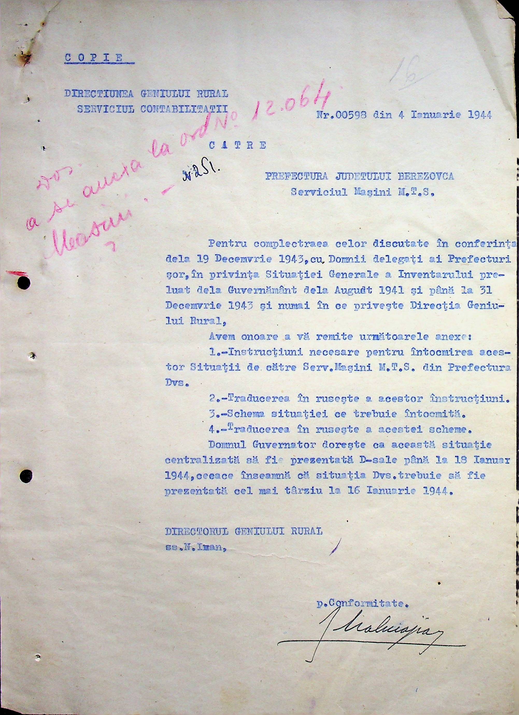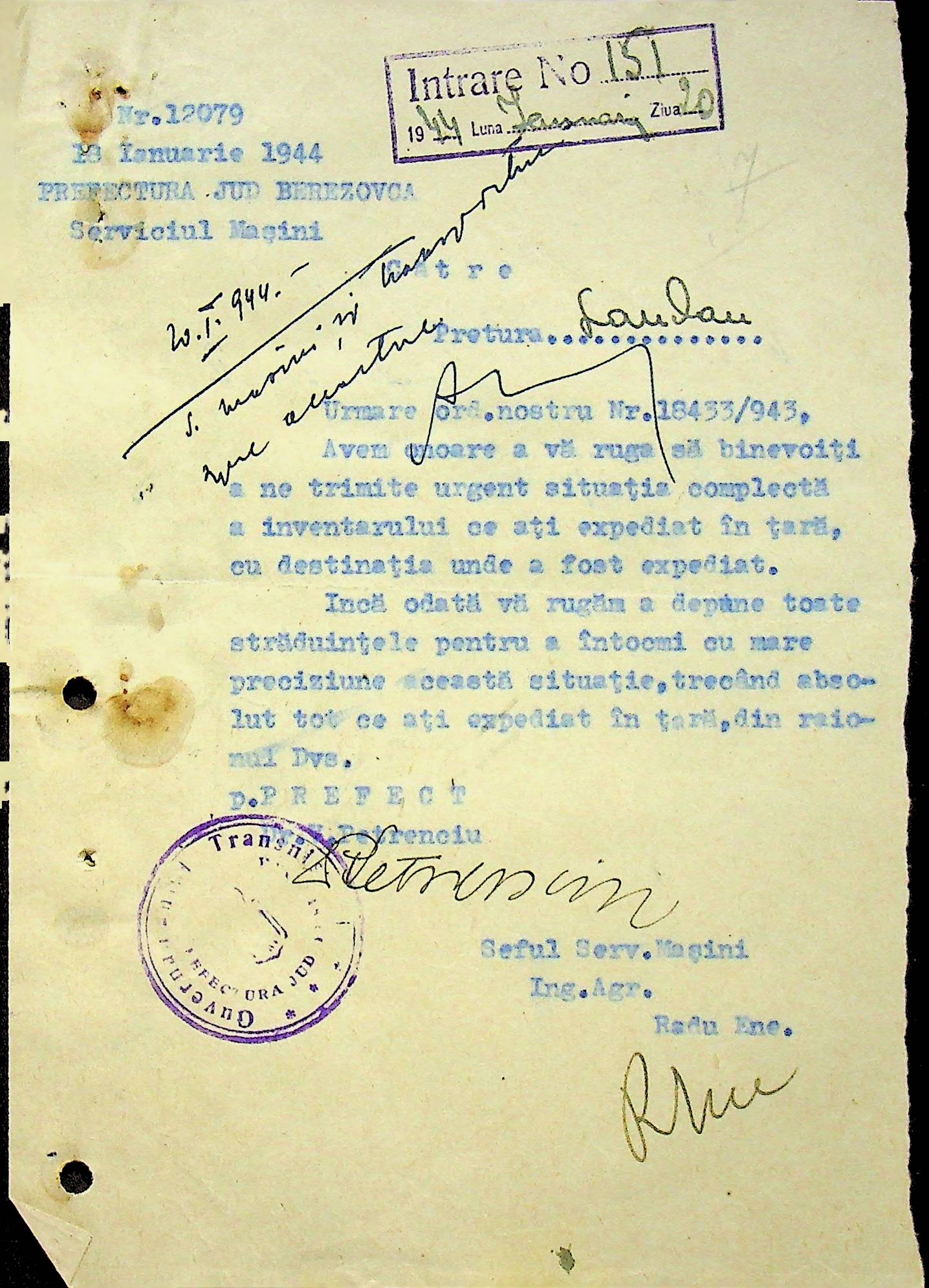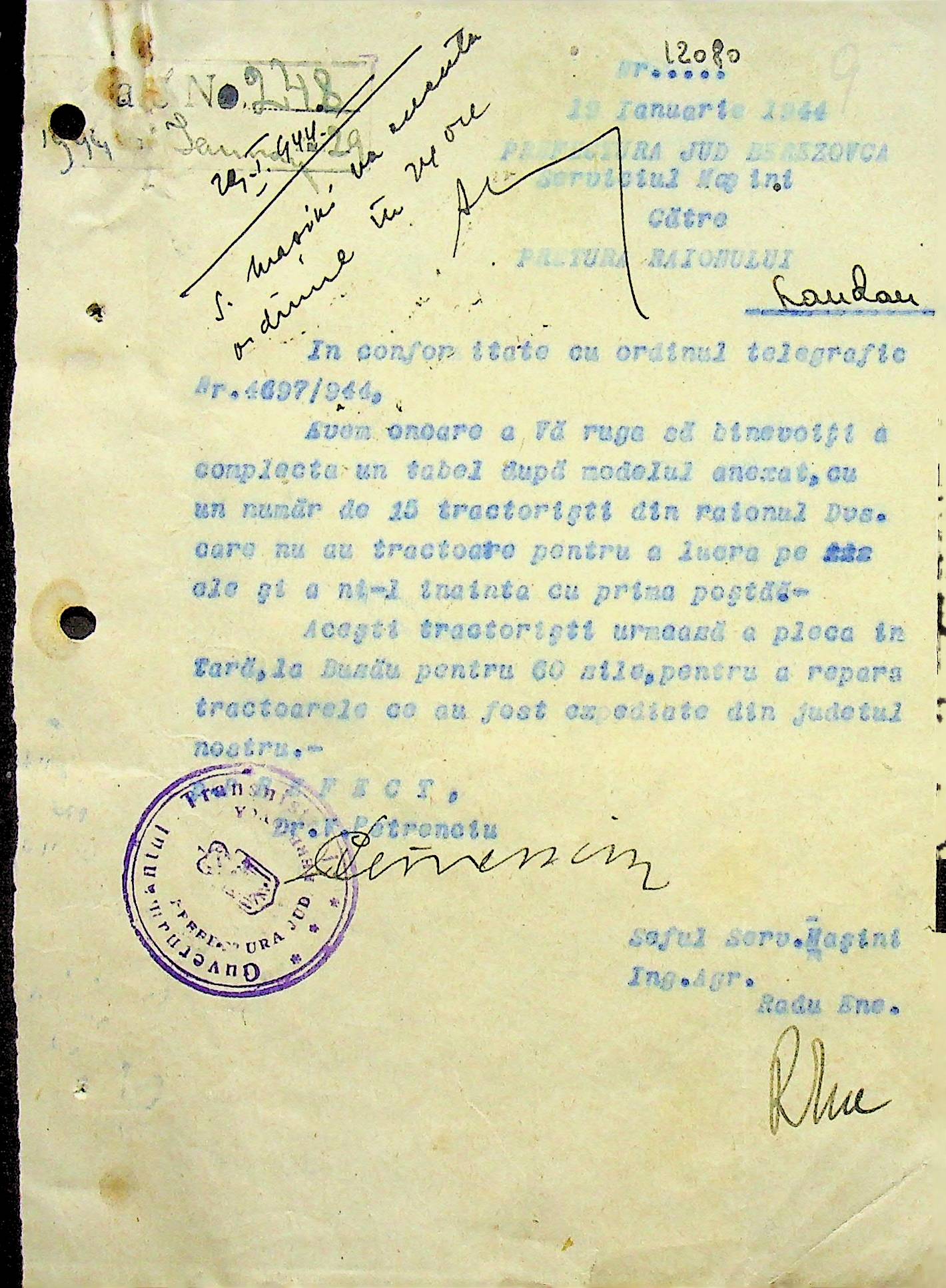 • • • • Справа № 108 Копія інструкції дирекції механізації губернаторства Трансністрії про складання інвентарного опису майна району, оцінювання його вартості та порядок експлуатації; листування з машинним відділом префектури про надання відомостей щодо чисельного складу адміністративно-технічного персоналу, який прибув з Румунії та місцевих спеціалістів; про відправку тракторів, сільськогосподарських інструментів, запасних частин, машин та іншого майна в Румунію; відомості про кількість палива, необхідного району, інвентарні описи майна. Протоколи про супровід майна, його відправку та отримання