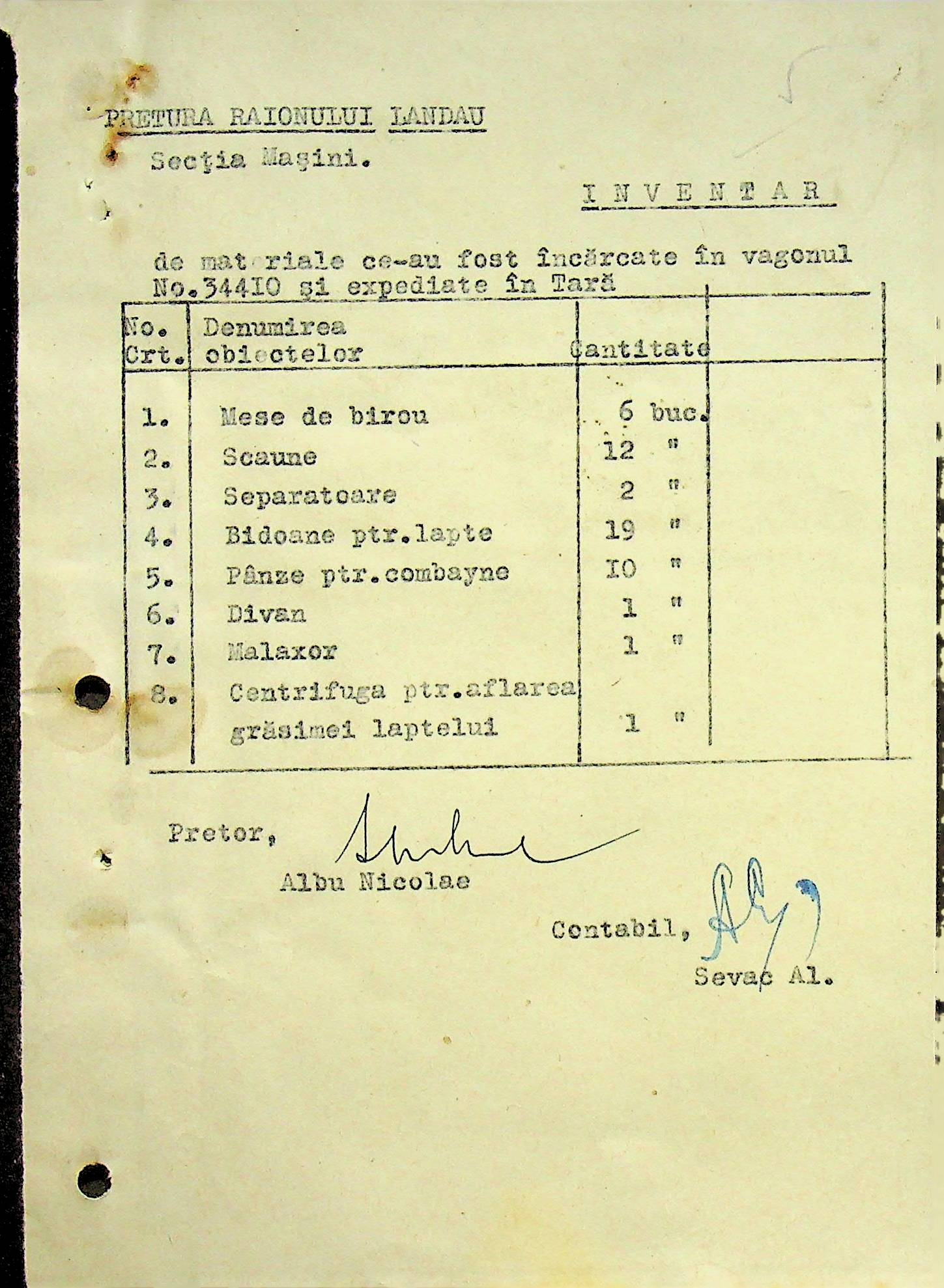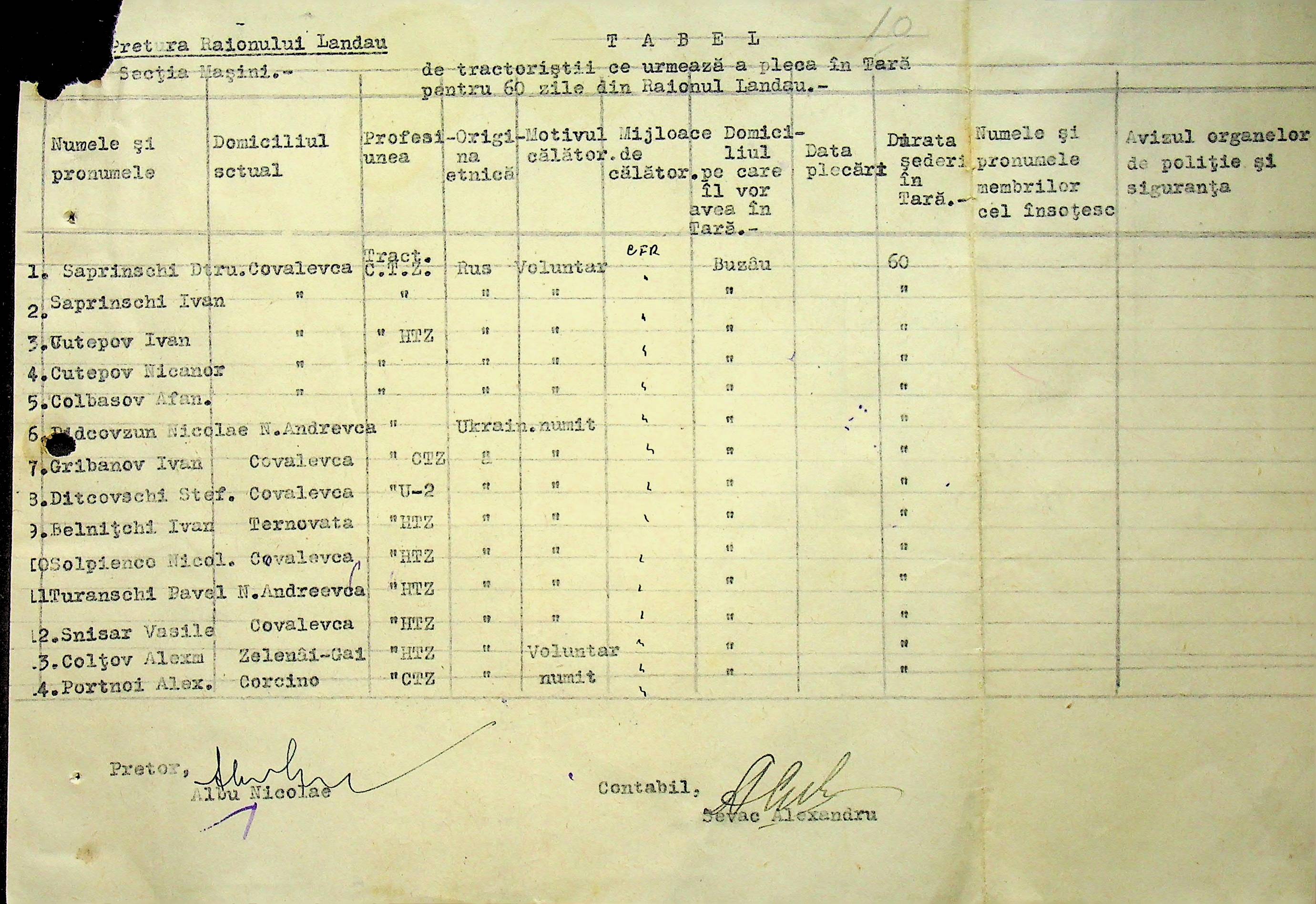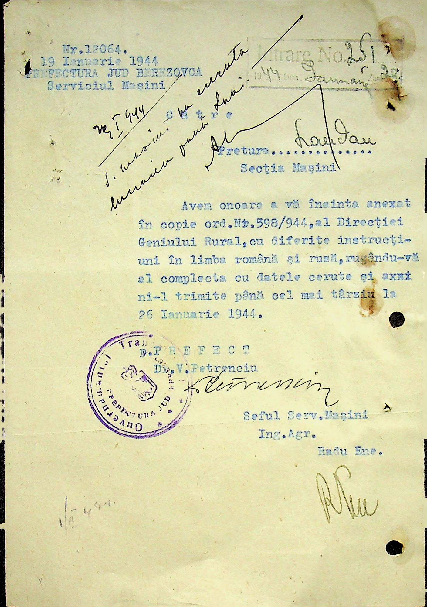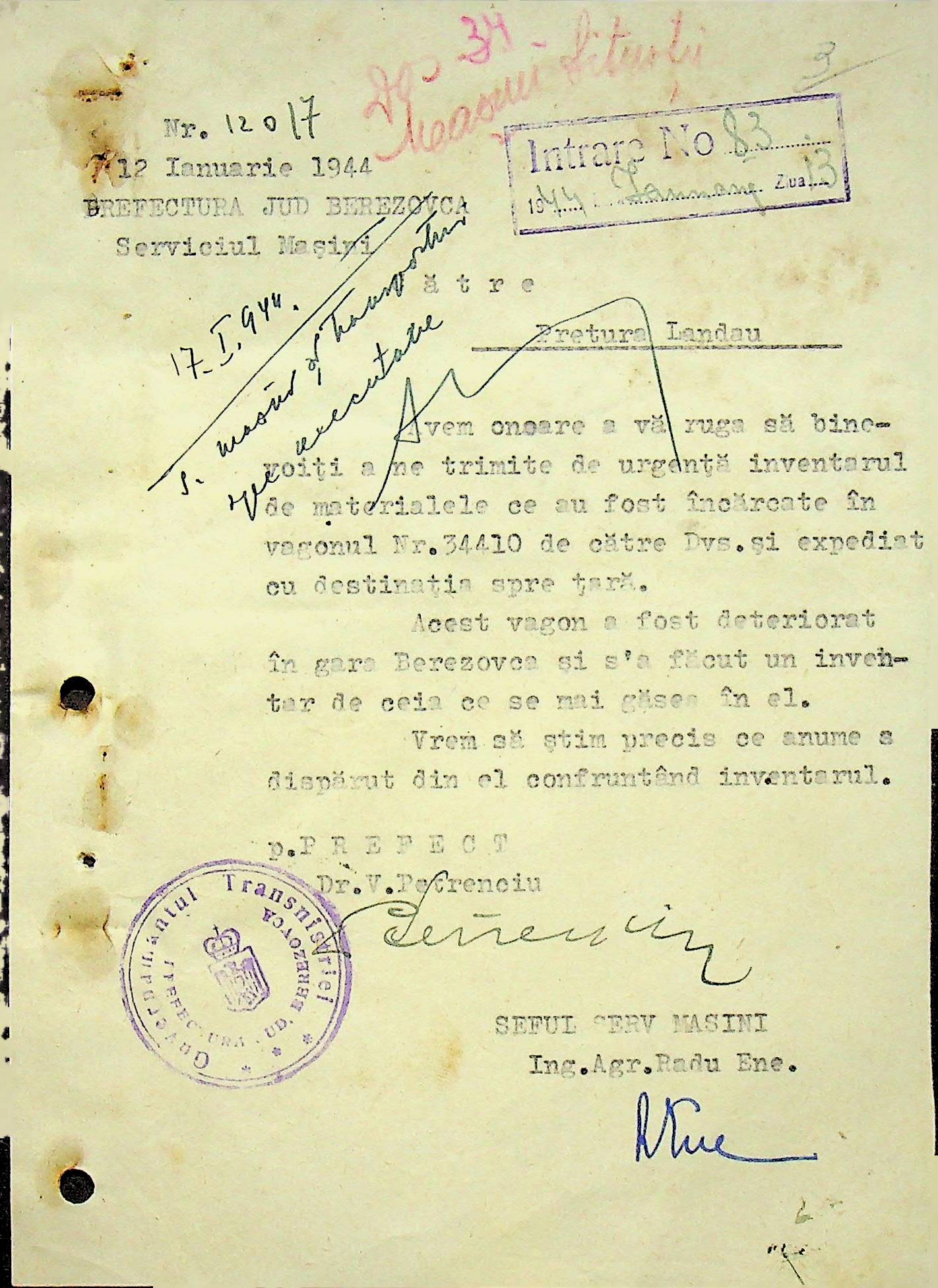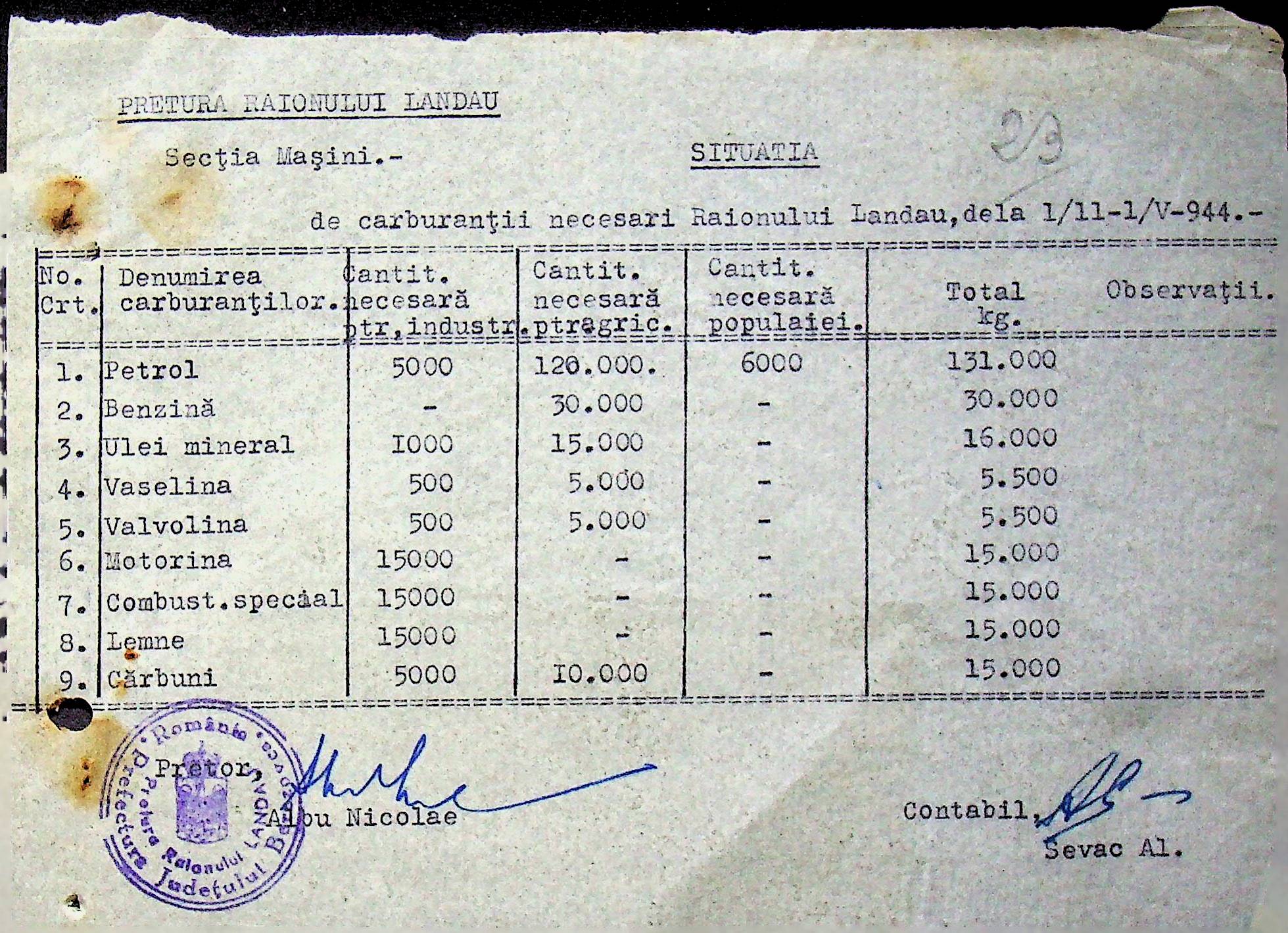 • • • • Справа № 108 Копія інструкції дирекції механізації губернаторства Трансністрії про складання інвентарного опису майна району, оцінювання його вартості та порядок експлуатації; листування з машинним відділом префектури про надання відомостей щодо чисельного складу адміністративно-технічного персоналу, який прибув з Румунії та місцевих спеціалістів; про відправку тракторів, сільськогосподарських інструментів, запасних частин, машин та іншого майна в Румунію; відомості про кількість палива, необхідного району, інвентарні описи майна. Протоколи про супровід майна, його відправку та отримання