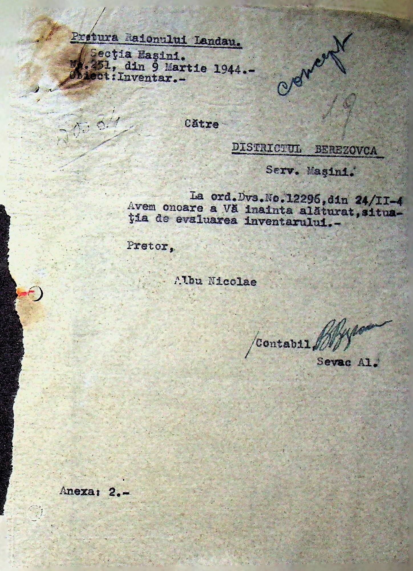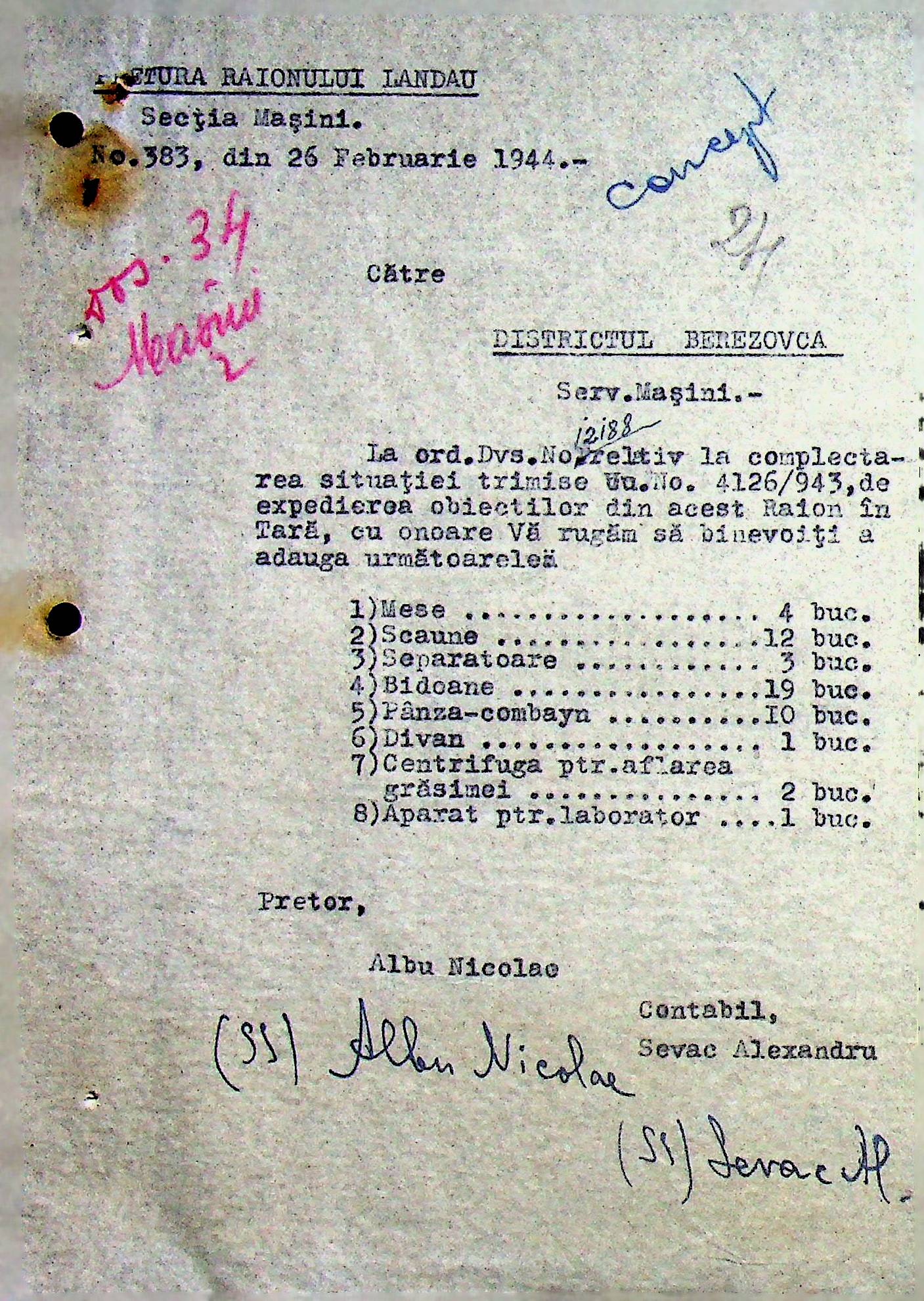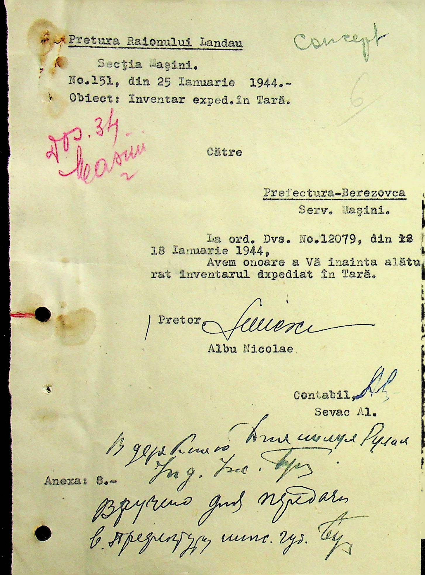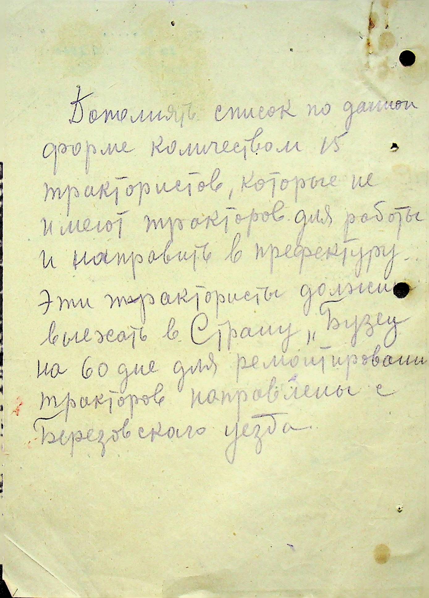 • • • • Справа № 108 Копія інструкції дирекції механізації губернаторства Трансністрії про складання інвентарного опису майна району, оцінювання його вартості та порядок експлуатації; листування з машинним відділом префектури про надання відомостей щодо чисельного складу адміністративно-технічного персоналу, який прибув з Румунії та місцевих спеціалістів; про відправку тракторів, сільськогосподарських інструментів, запасних частин, машин та іншого майна в Румунію; відомості про кількість палива, необхідного району, інвентарні описи майна. Протоколи про супровід майна, його відправку та отримання