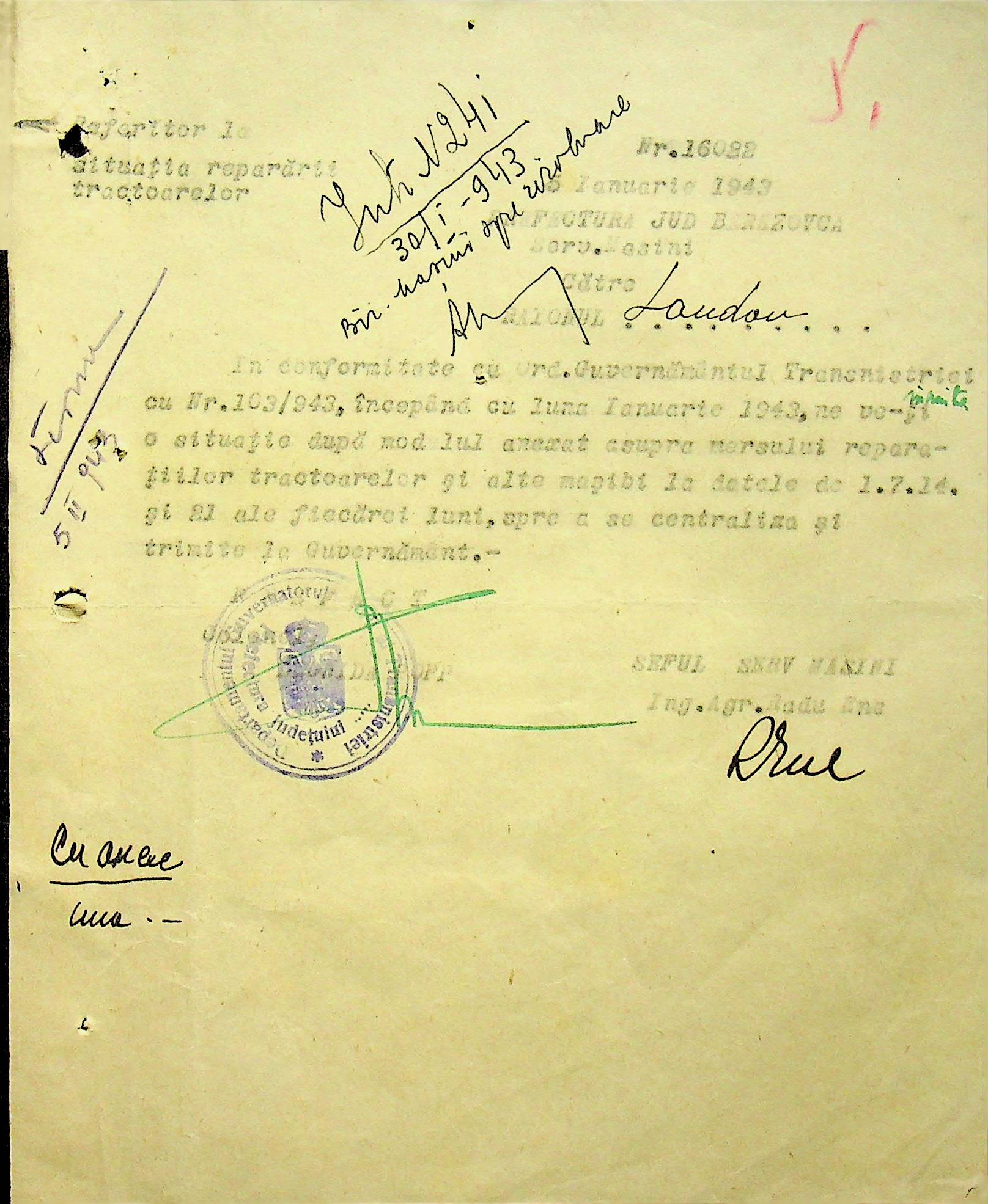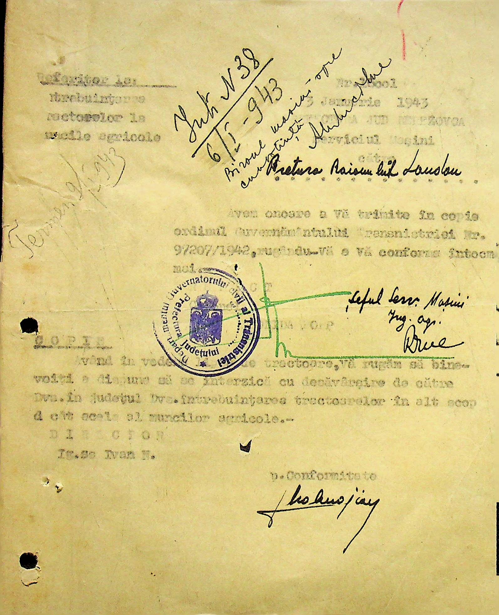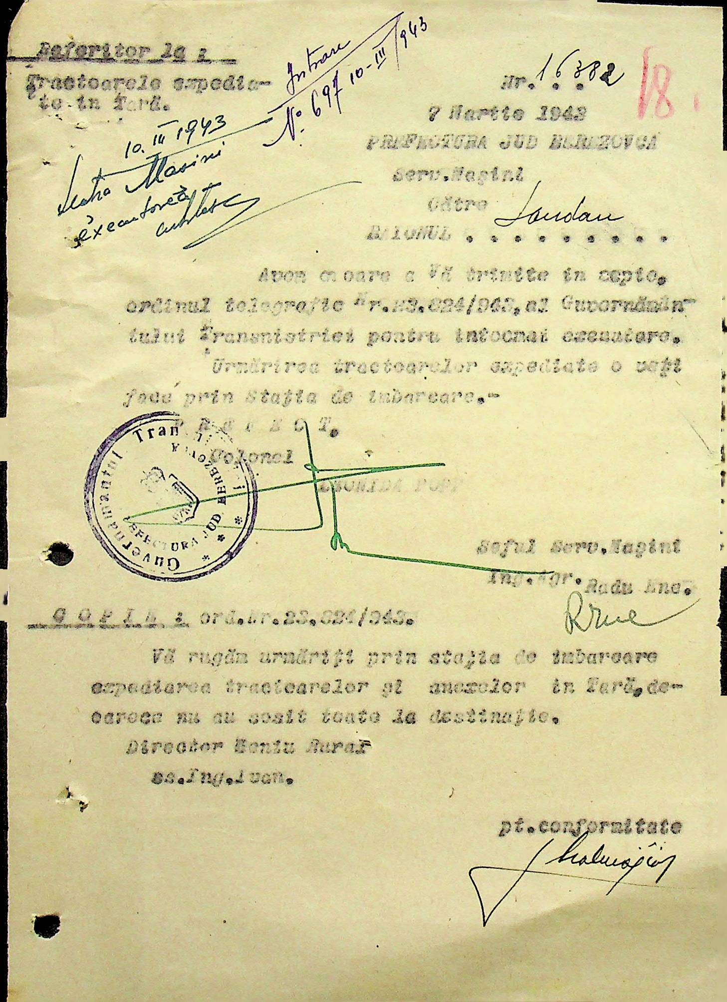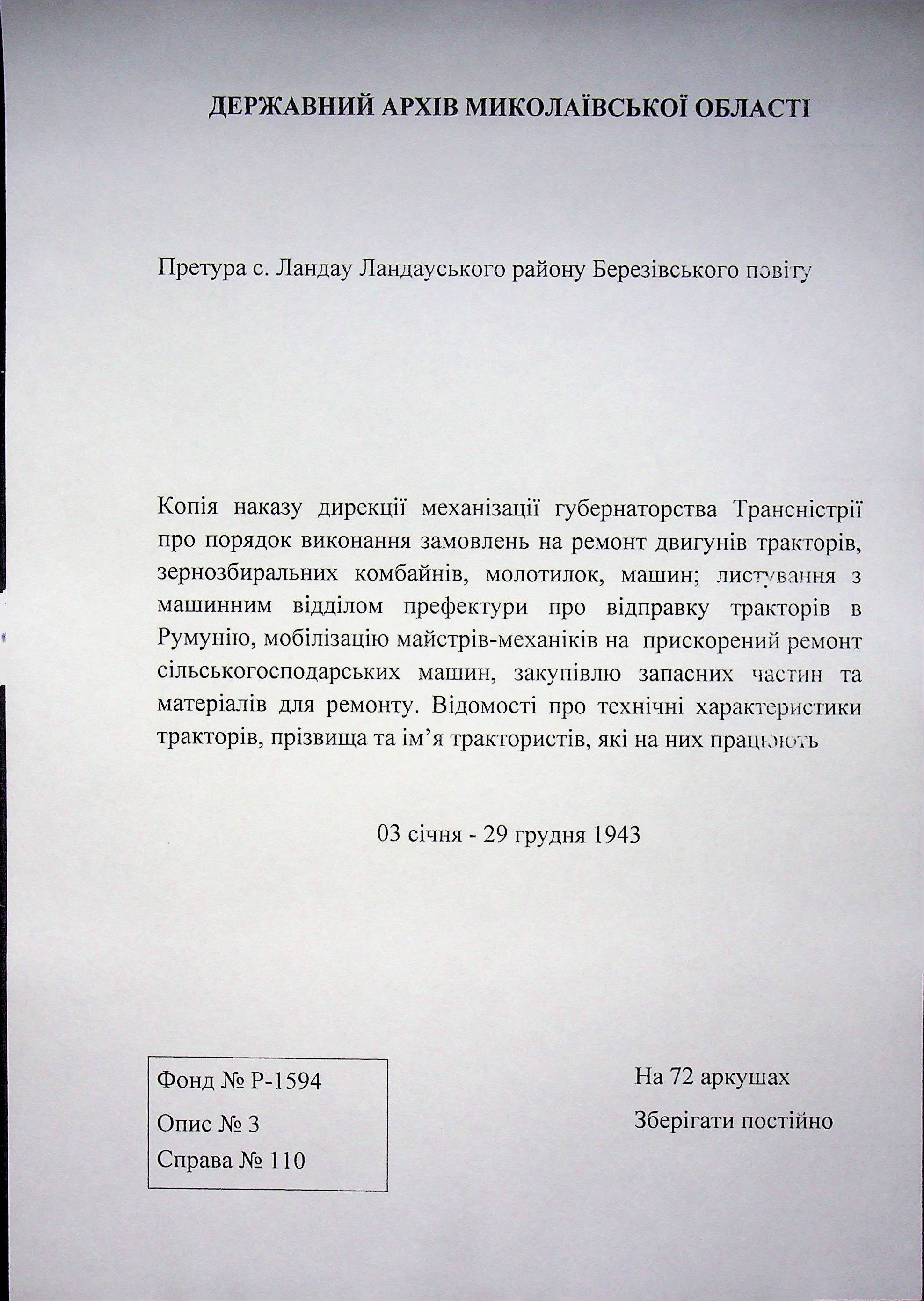 • • • • Справа № 110 Копія наказу дирекції механізації губернаторства Трансністрії про порядок виконання замовлень на ремонт двигунів тракторів, зернозбиральних комбайнів, молотилок, машин; листування з машинним відділом префектури про відправку тракторів в Румунію, мобілізацію майстрів-механіків на прискорений ремонт сільськогосподарських машин, закупівлю запасних частин та матеріалів для ремонту. Відомості про технічні характеристики тракторів, прізвища та ім’я трактористів, які на них працюють