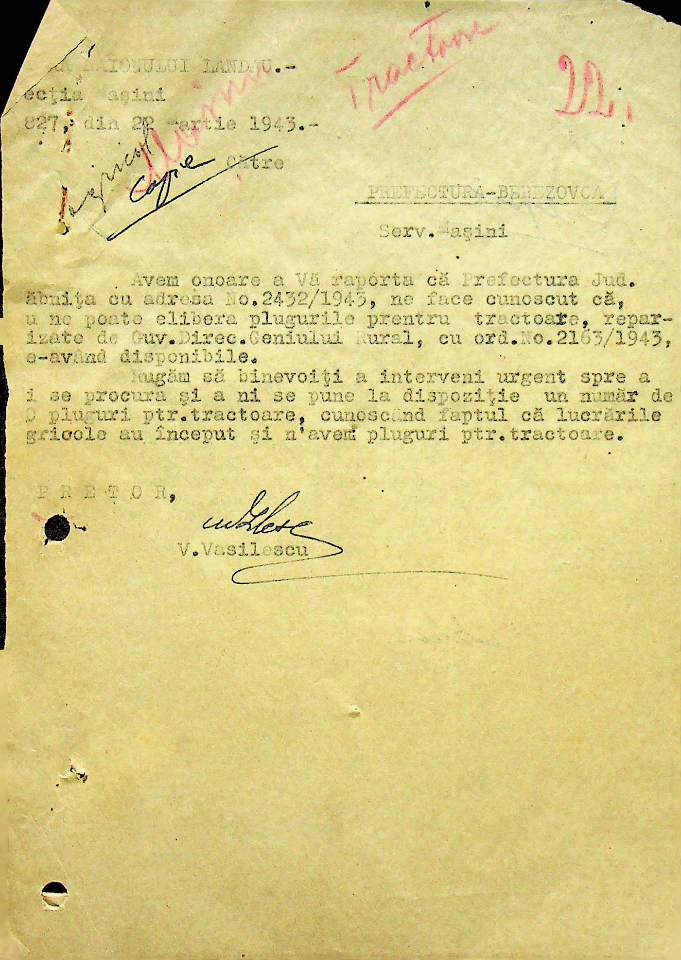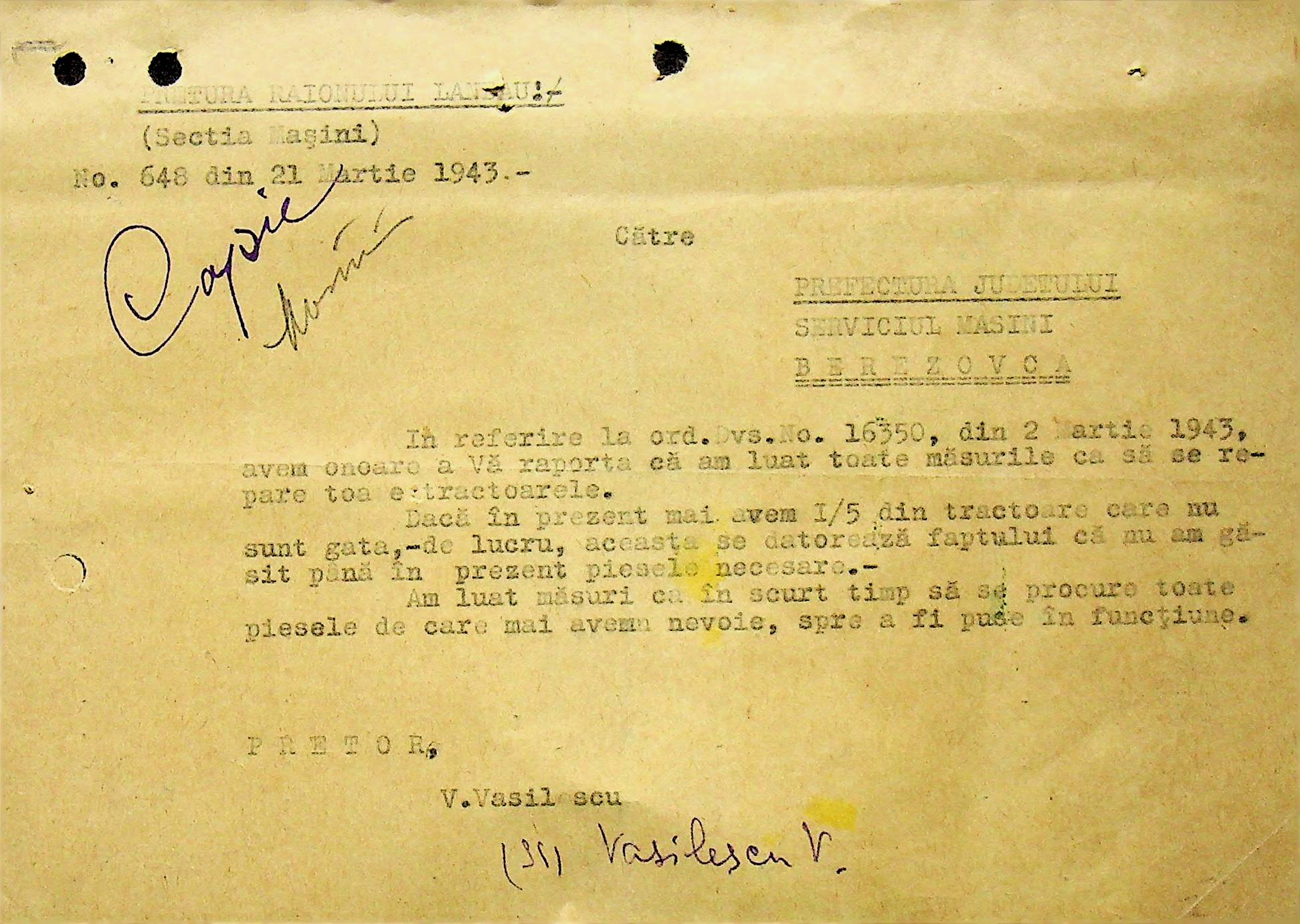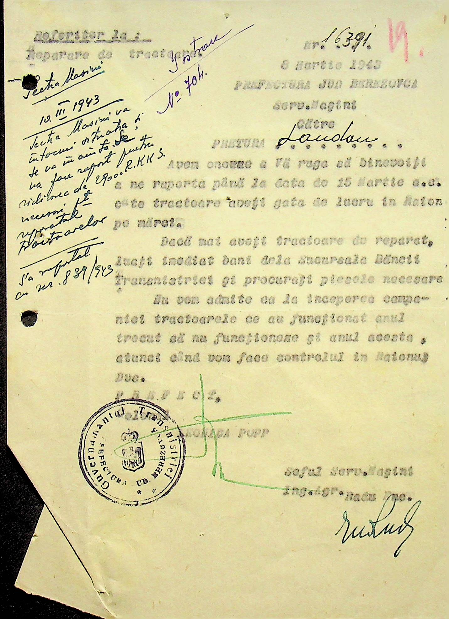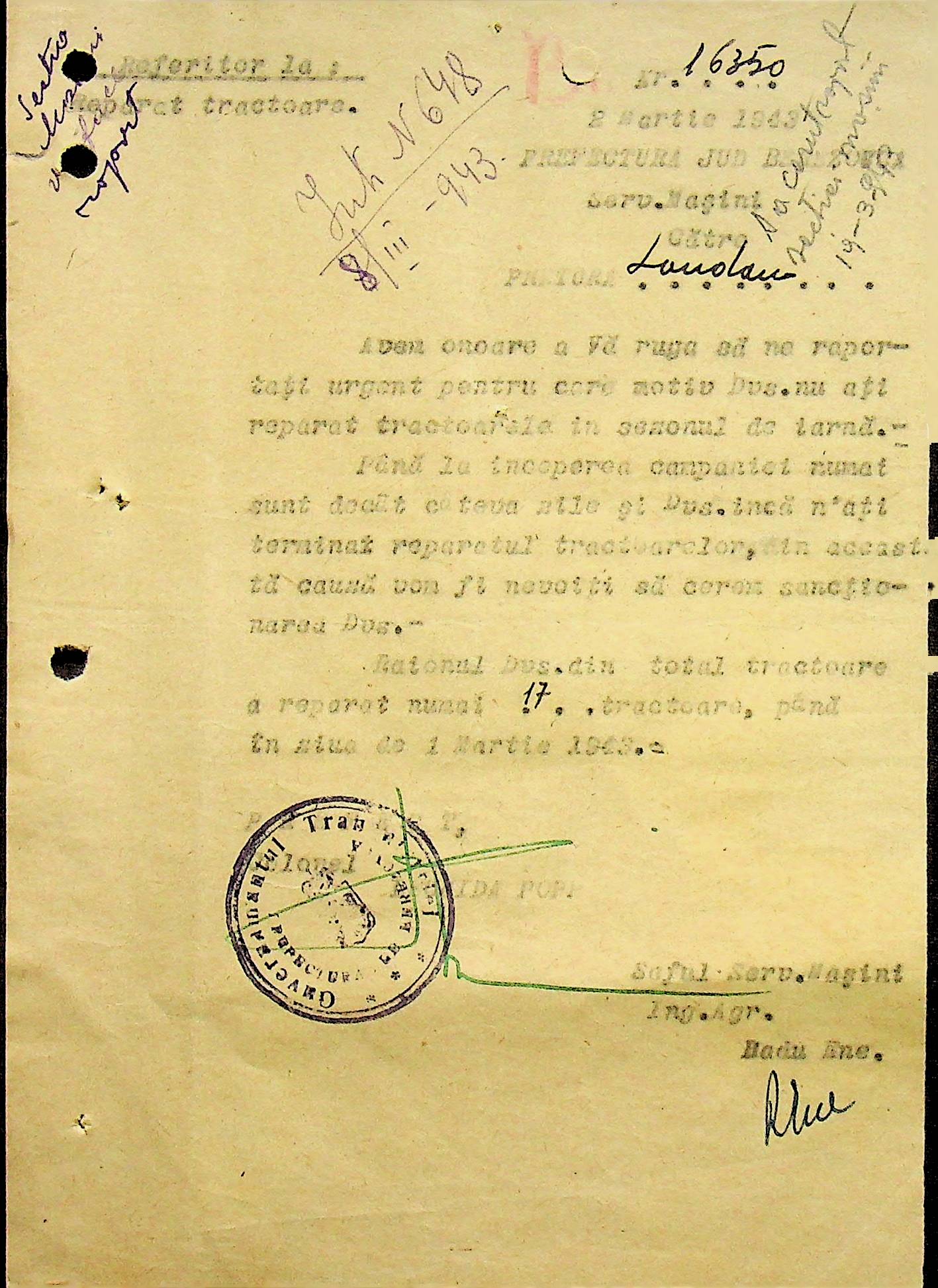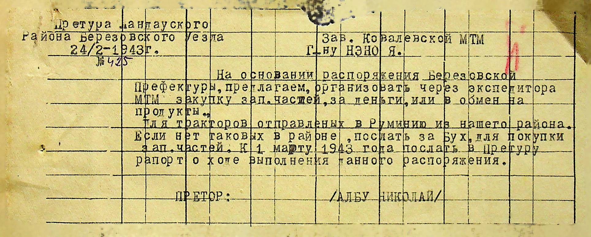 • • • • Справа № 110 Копія наказу дирекції механізації губернаторства Трансністрії про порядок виконання замовлень на ремонт двигунів тракторів, зернозбиральних комбайнів, молотилок, машин; листування з машинним відділом префектури про відправку тракторів в Румунію, мобілізацію майстрів-механіків на прискорений ремонт сільськогосподарських машин, закупівлю запасних частин та матеріалів для ремонту. Відомості про технічні характеристики тракторів, прізвища та ім’я трактористів, які на них працюють