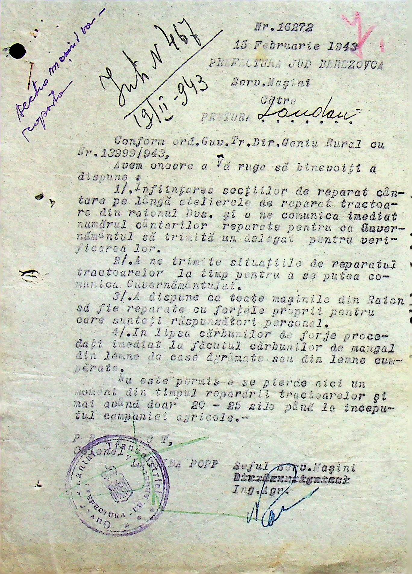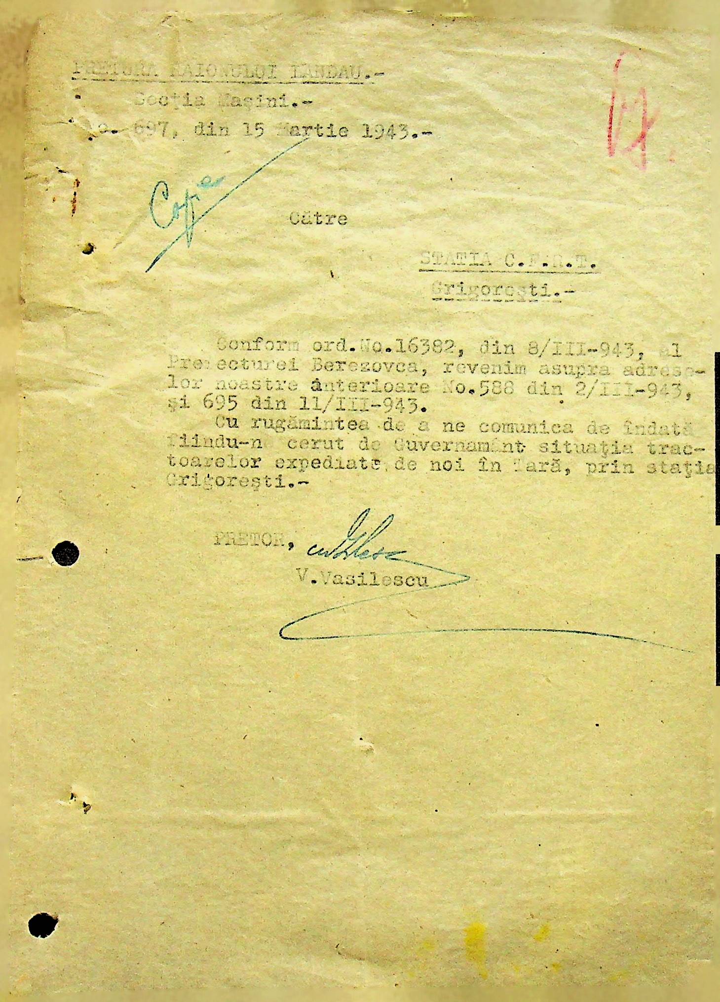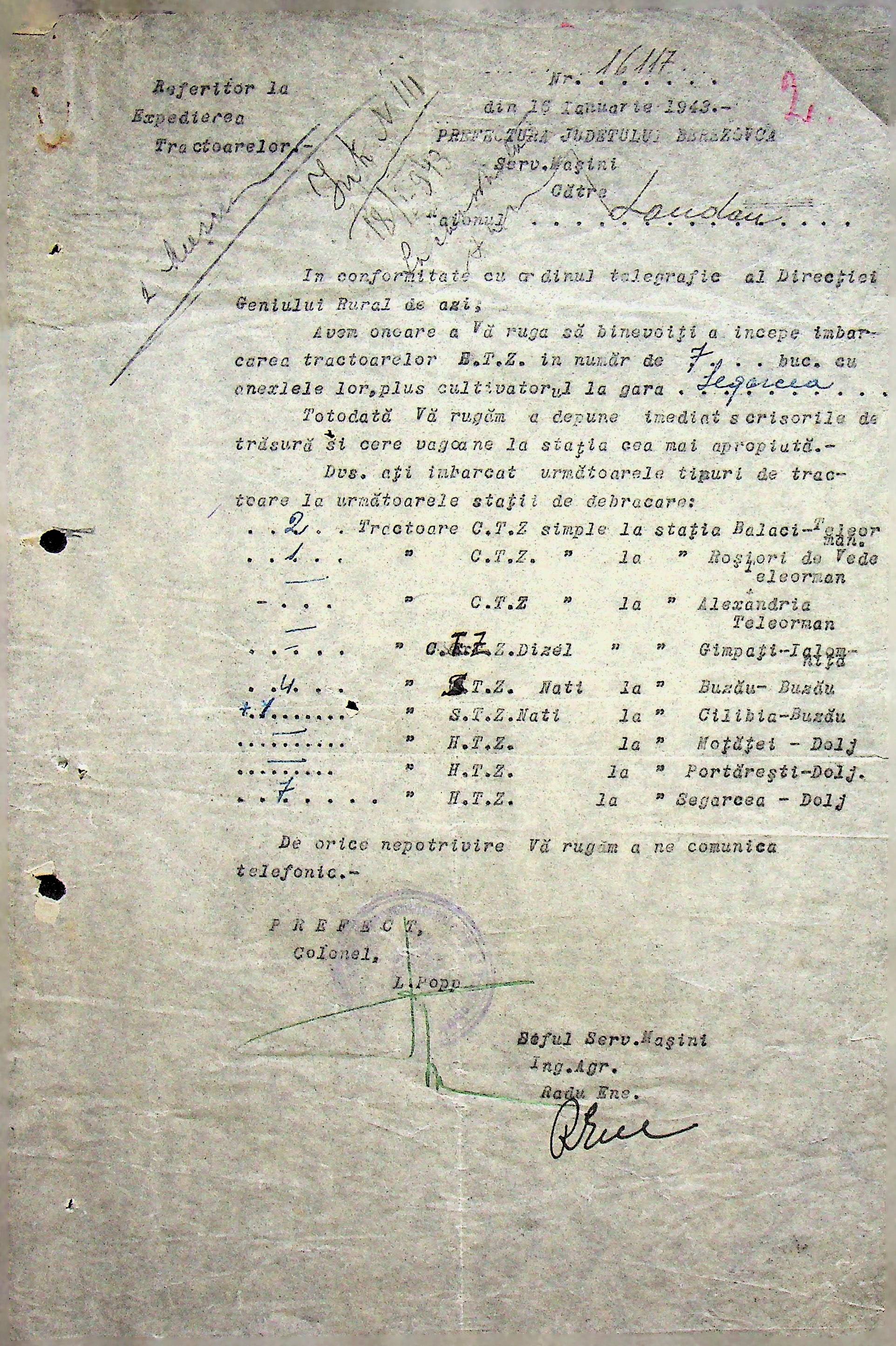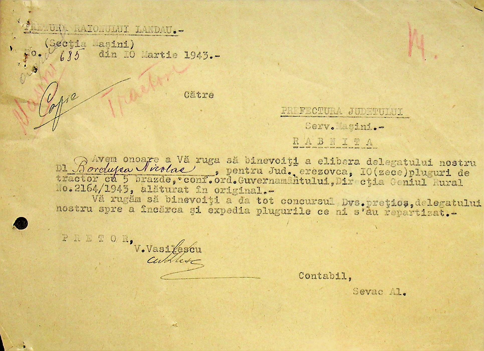• • • • Справа № 110 Копія наказу дирекції механізації губернаторства Трансністрії про порядок виконання замовлень на ремонт двигунів тракторів, зернозбиральних комбайнів, молотилок, машин; листування з машинним відділом префектури про відправку тракторів в Румунію, мобілізацію майстрів-механіків на прискорений ремонт сільськогосподарських машин, закупівлю запасних частин та матеріалів для ремонту. Відомості про технічні характеристики тракторів, прізвища та ім’я трактористів, які на них працюють