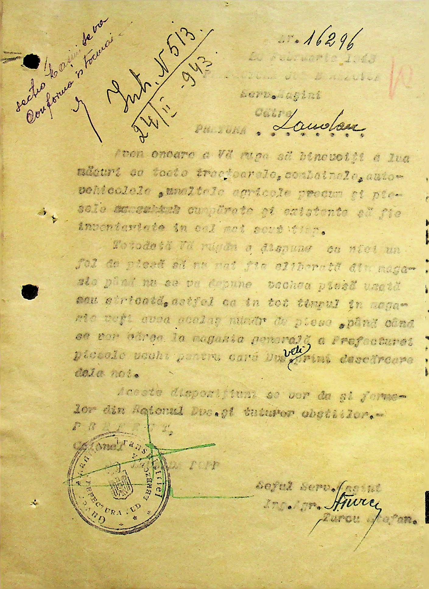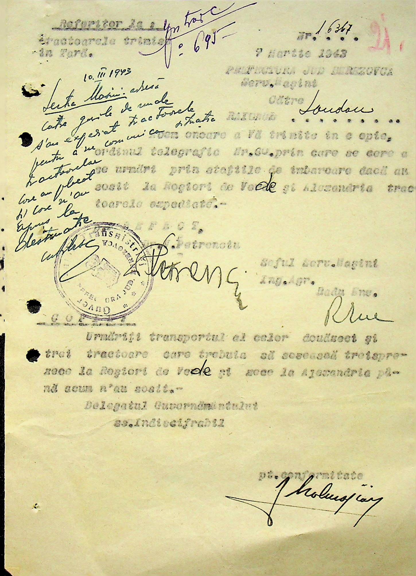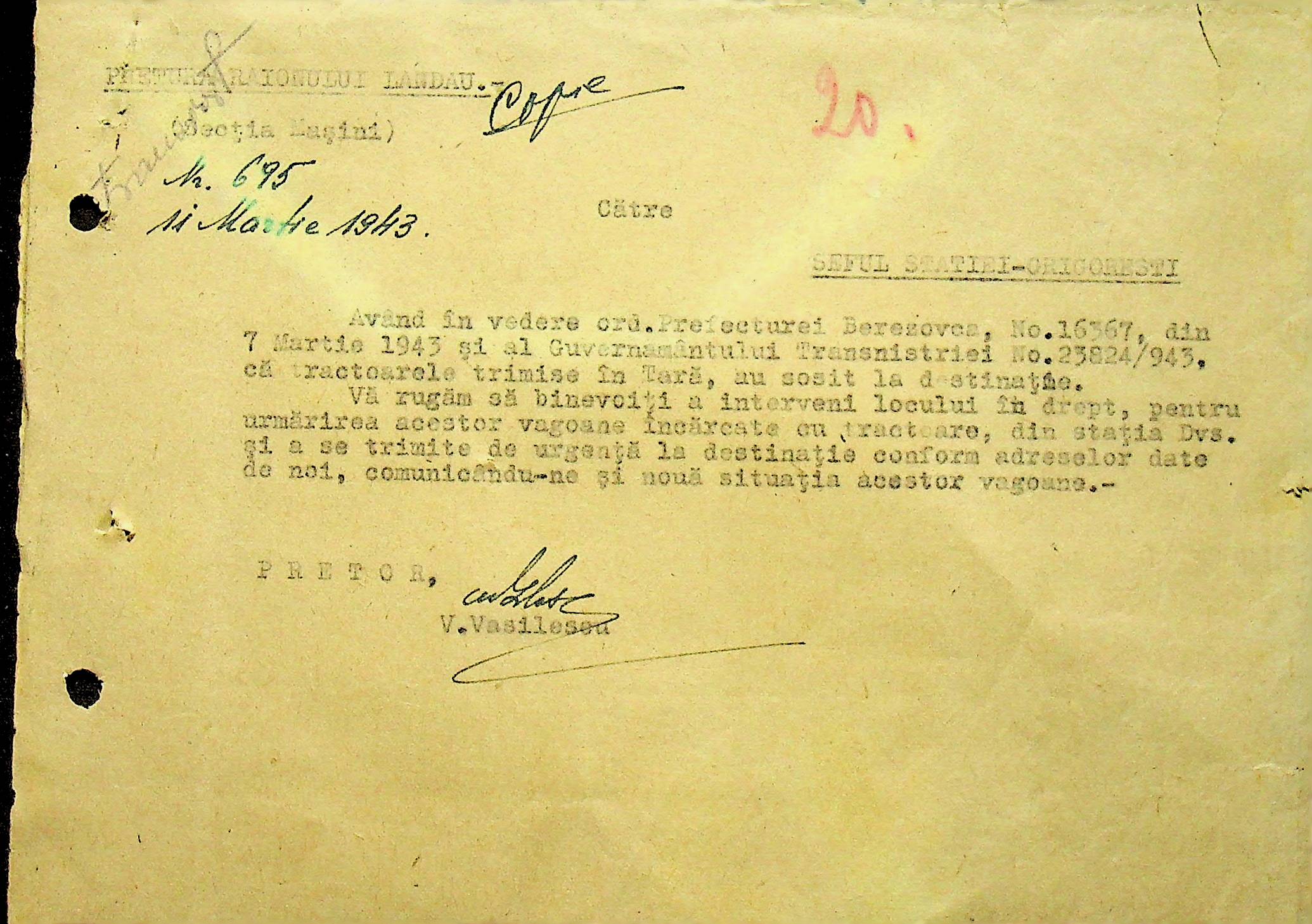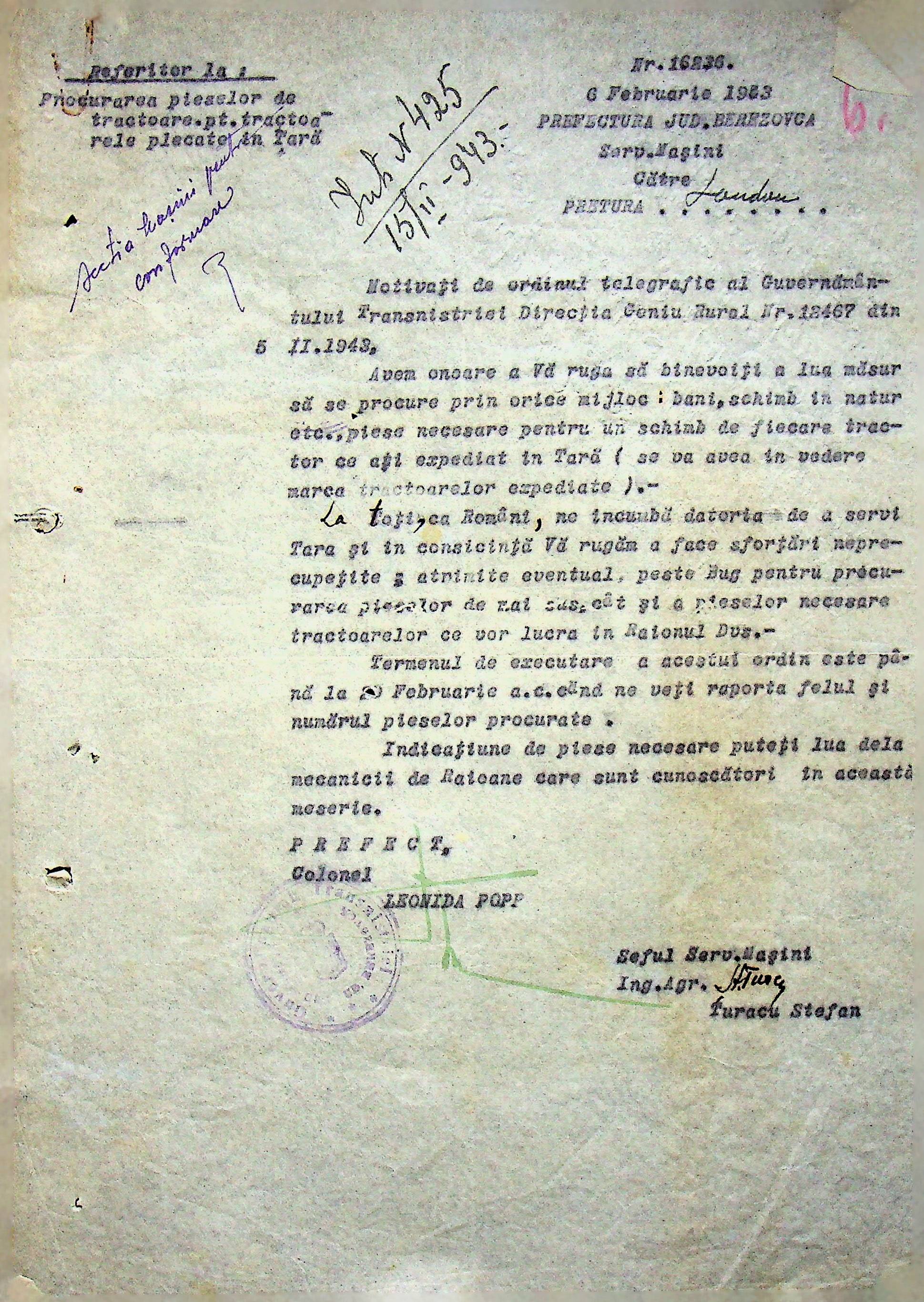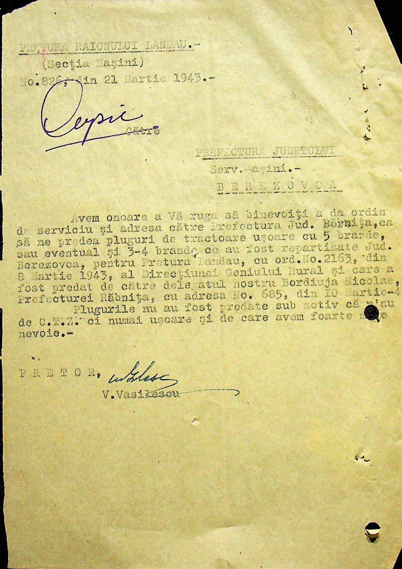 • • • • Справа № 110 Копія наказу дирекції механізації губернаторства Трансністрії про порядок виконання замовлень на ремонт двигунів тракторів, зернозбиральних комбайнів, молотилок, машин; листування з машинним відділом префектури про відправку тракторів в Румунію, мобілізацію майстрів-механіків на прискорений ремонт сільськогосподарських машин, закупівлю запасних частин та матеріалів для ремонту. Відомості про технічні характеристики тракторів, прізвища та ім’я трактористів, які на них працюють