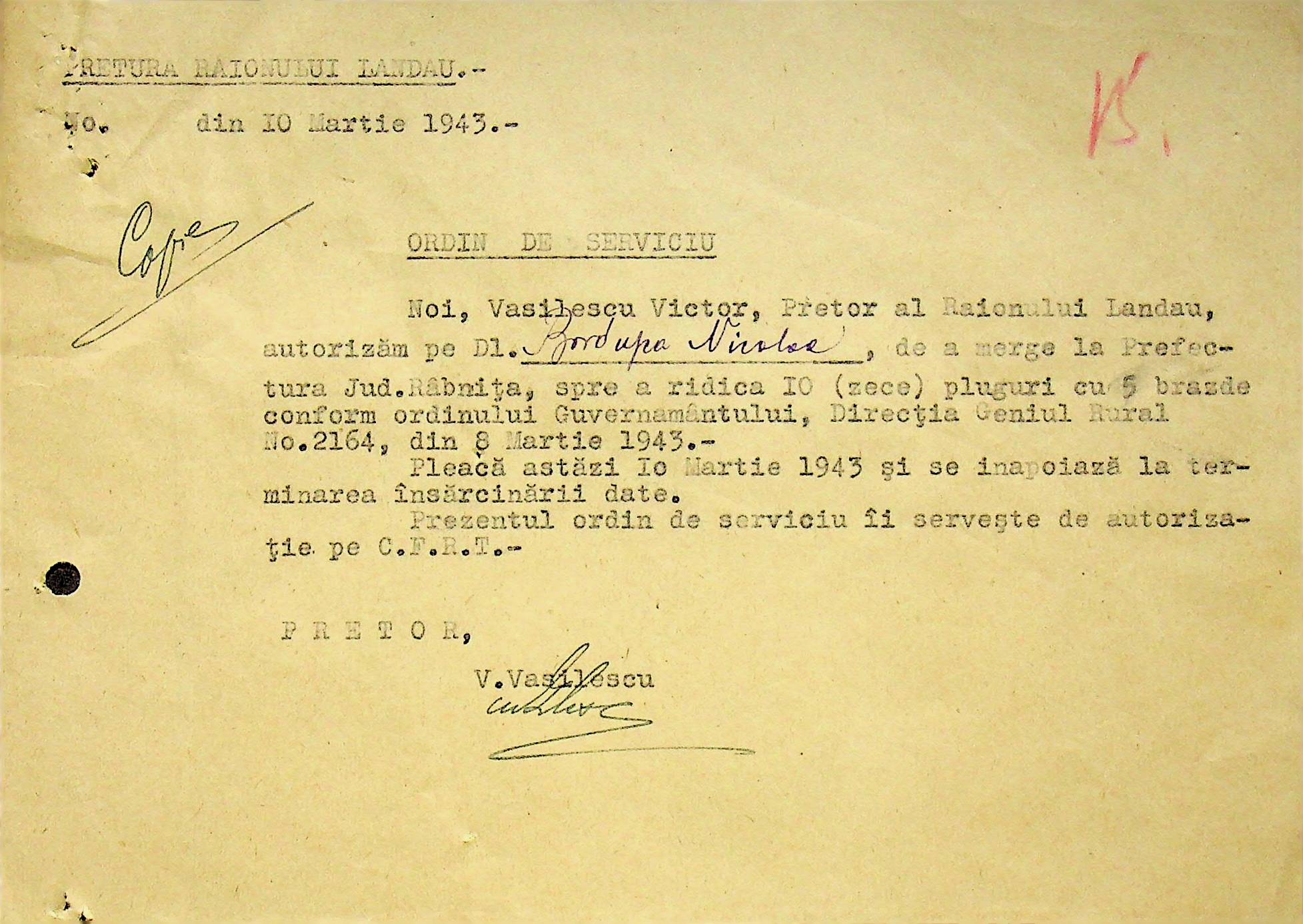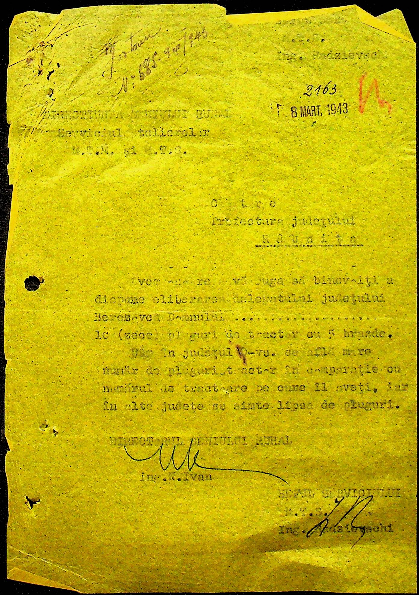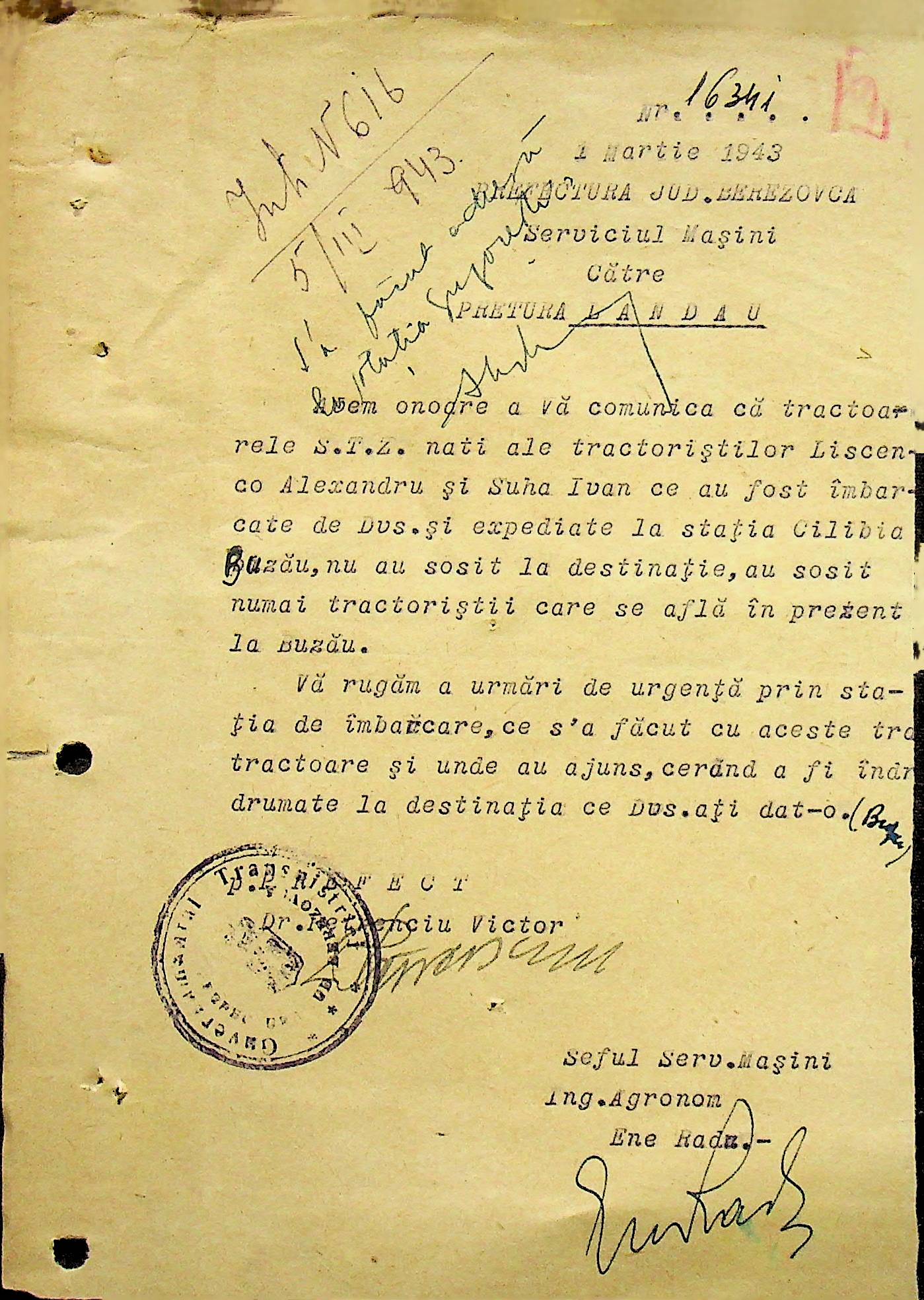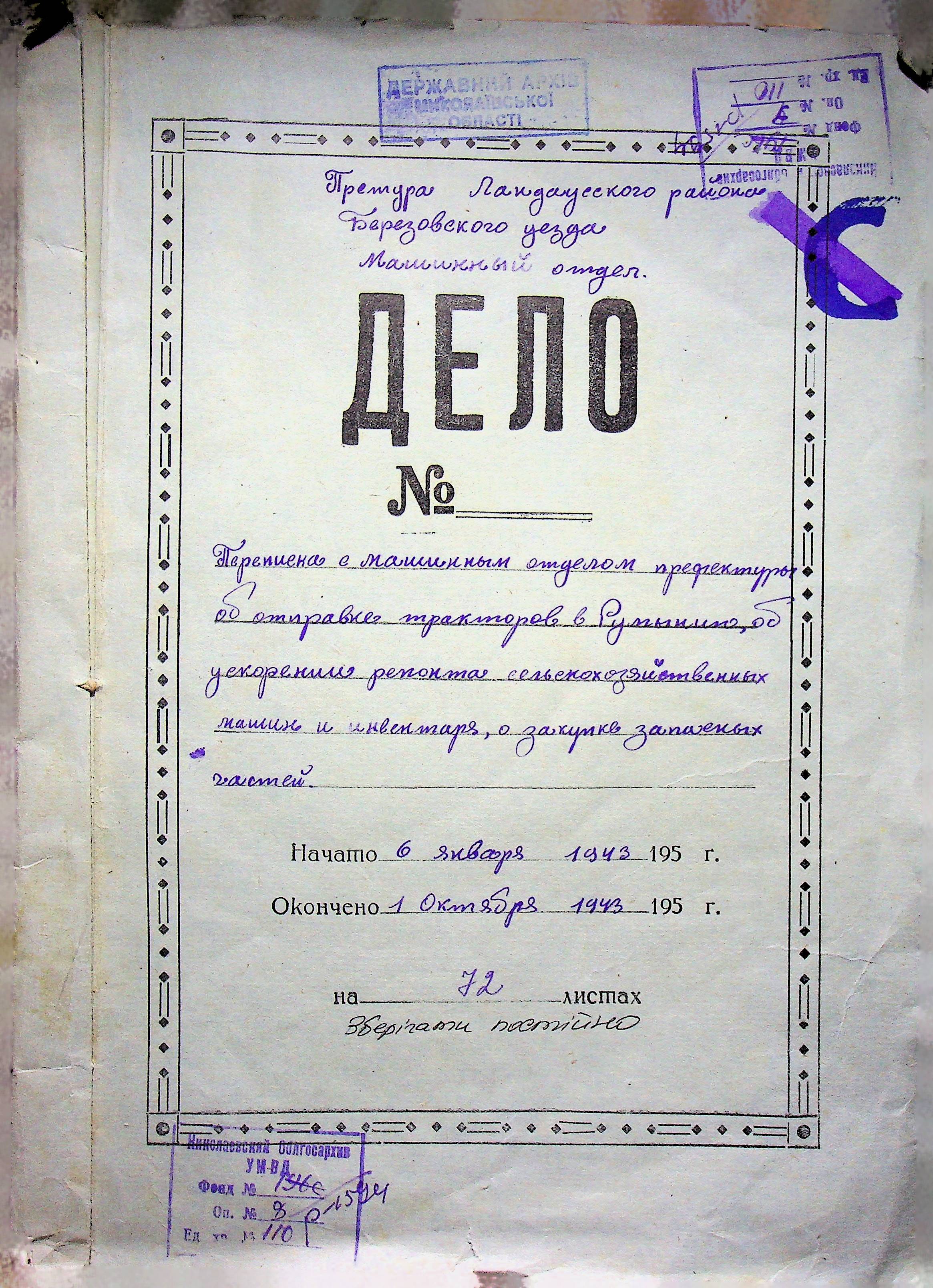 • • • • Справа № 110 Копія наказу дирекції механізації губернаторства Трансністрії про порядок виконання замовлень на ремонт двигунів тракторів, зернозбиральних комбайнів, молотилок, машин; листування з машинним відділом префектури про відправку тракторів в Румунію, мобілізацію майстрів-механіків на прискорений ремонт сільськогосподарських машин, закупівлю запасних частин та матеріалів для ремонту. Відомості про технічні характеристики тракторів, прізвища та ім’я трактористів, які на них працюють