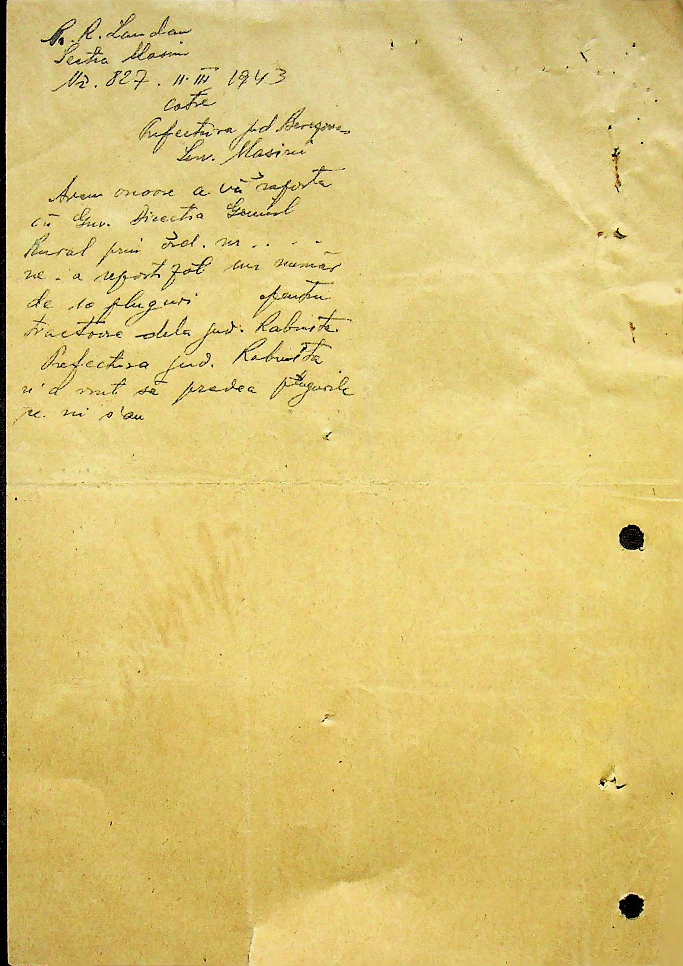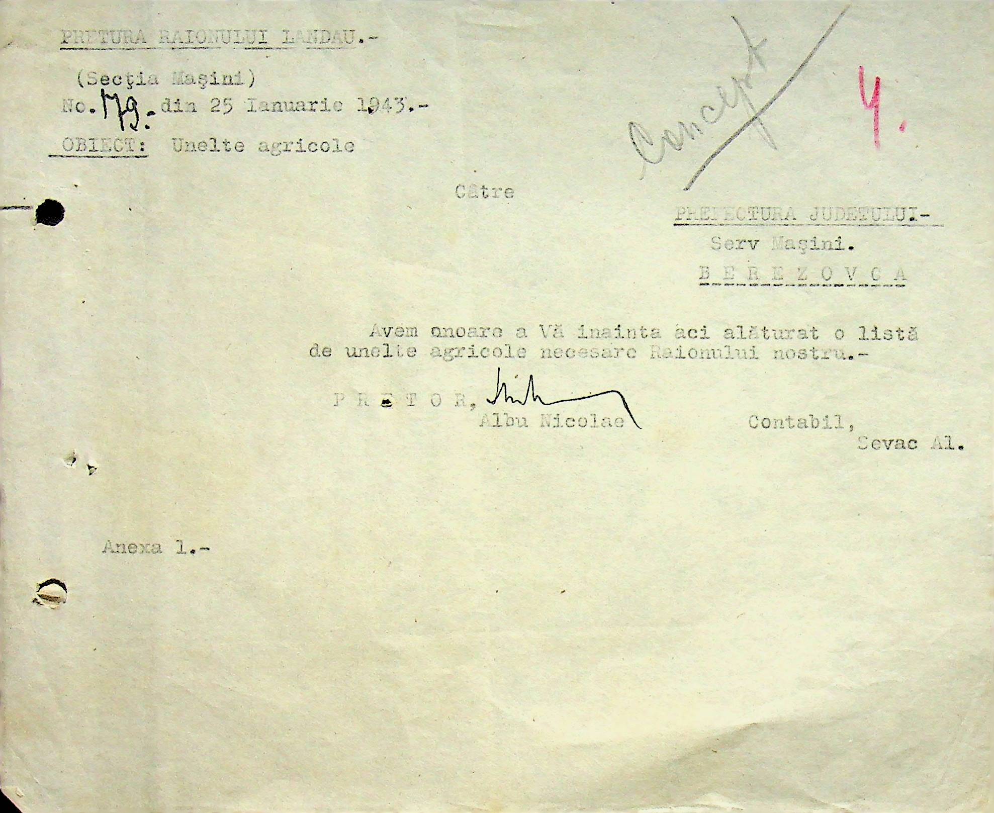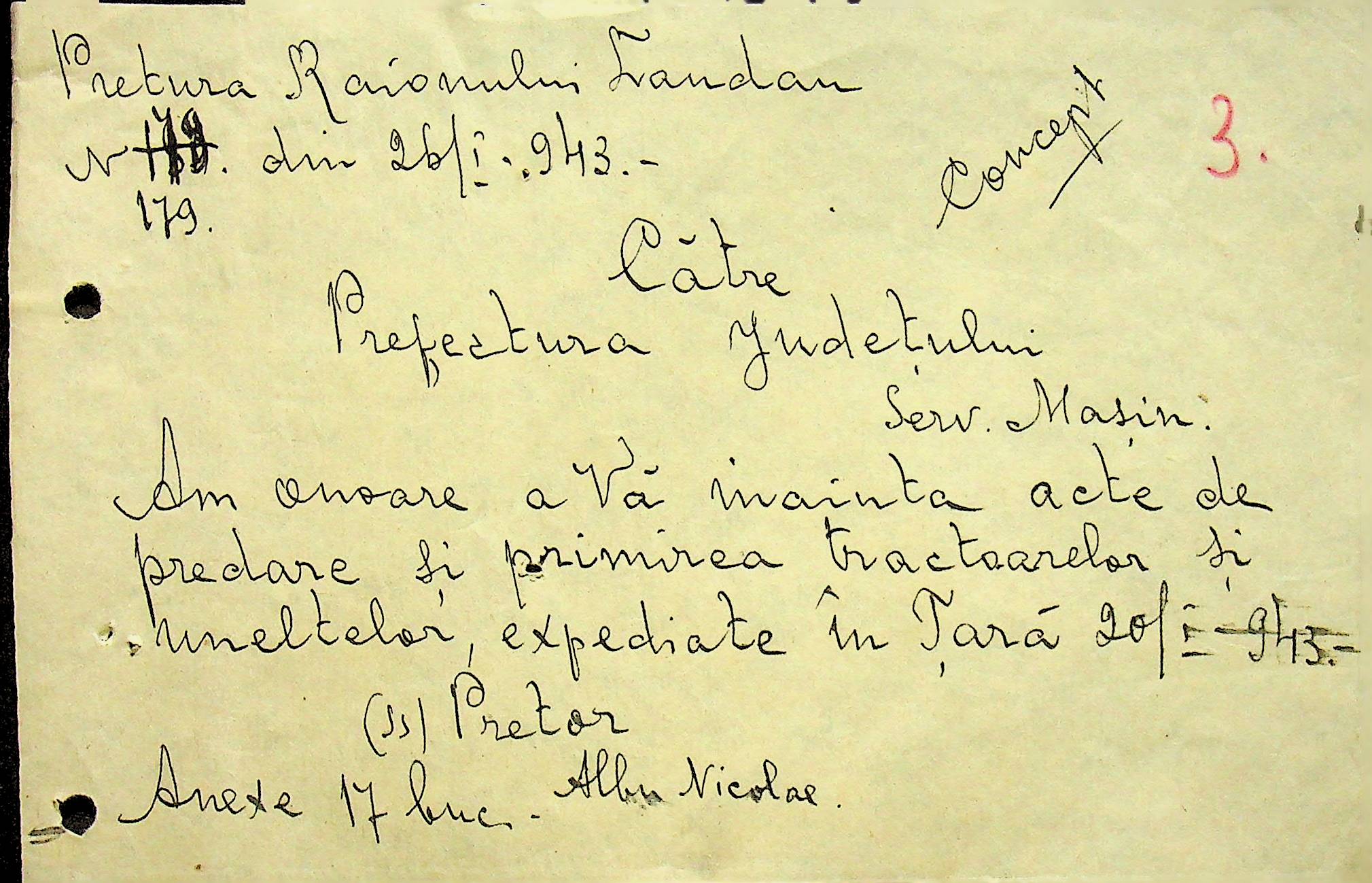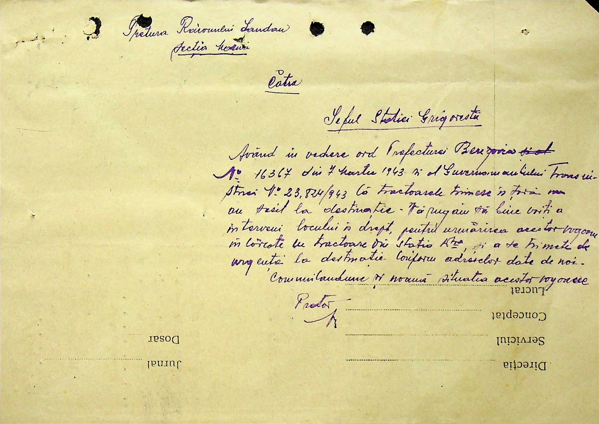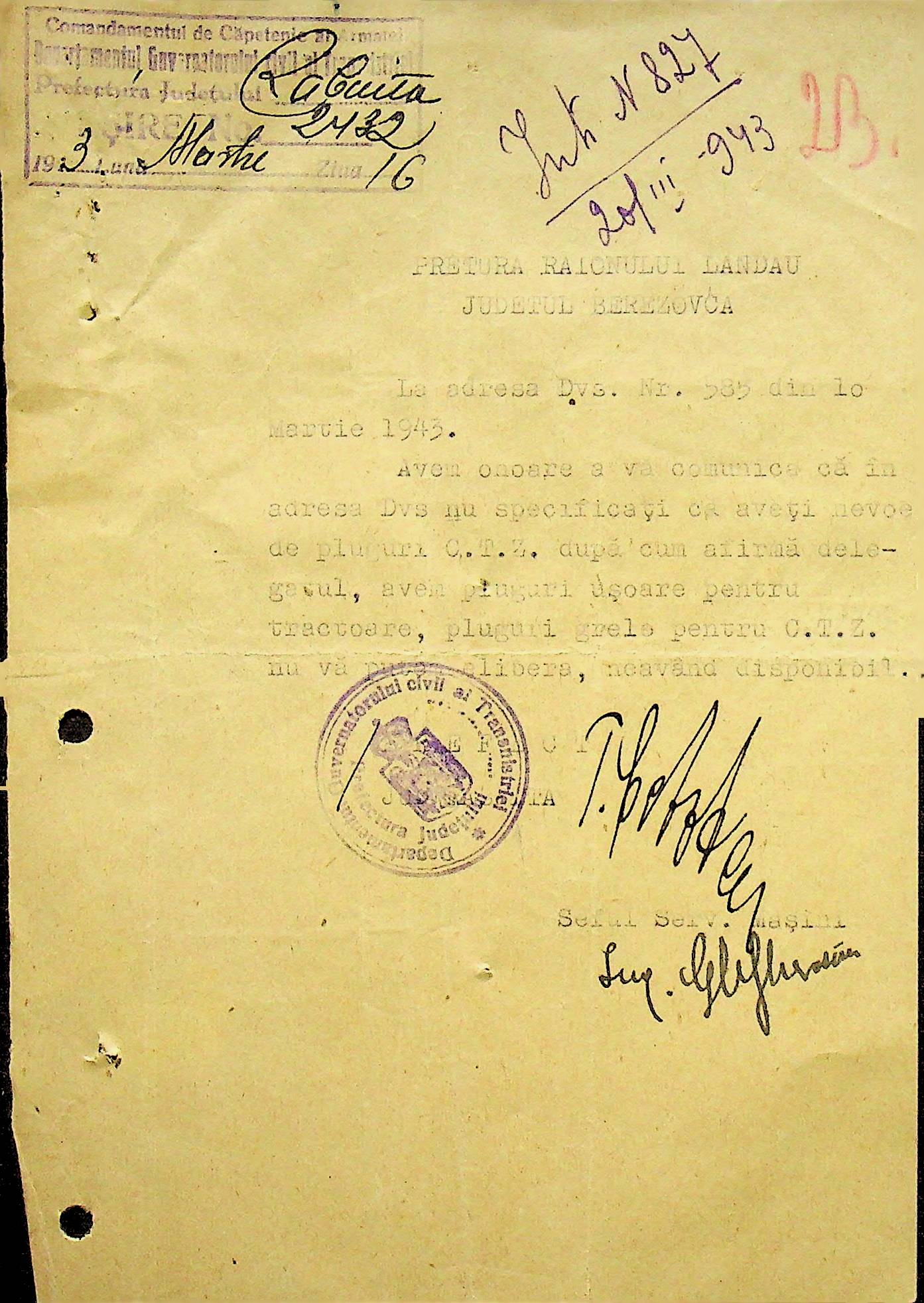 • • • • Справа № 110 Копія наказу дирекції механізації губернаторства Трансністрії про порядок виконання замовлень на ремонт двигунів тракторів, зернозбиральних комбайнів, молотилок, машин; листування з машинним відділом префектури про відправку тракторів в Румунію, мобілізацію майстрів-механіків на прискорений ремонт сільськогосподарських машин, закупівлю запасних частин та матеріалів для ремонту. Відомості про технічні характеристики тракторів, прізвища та ім’я трактористів, які на них працюють