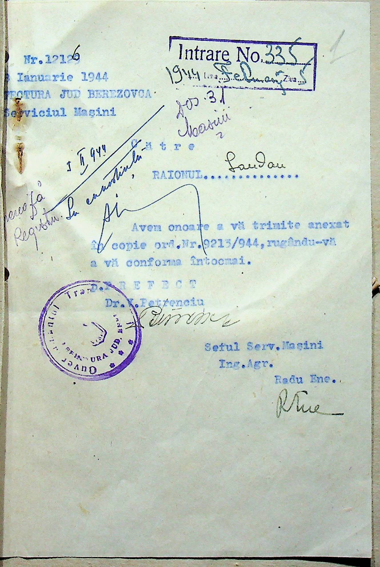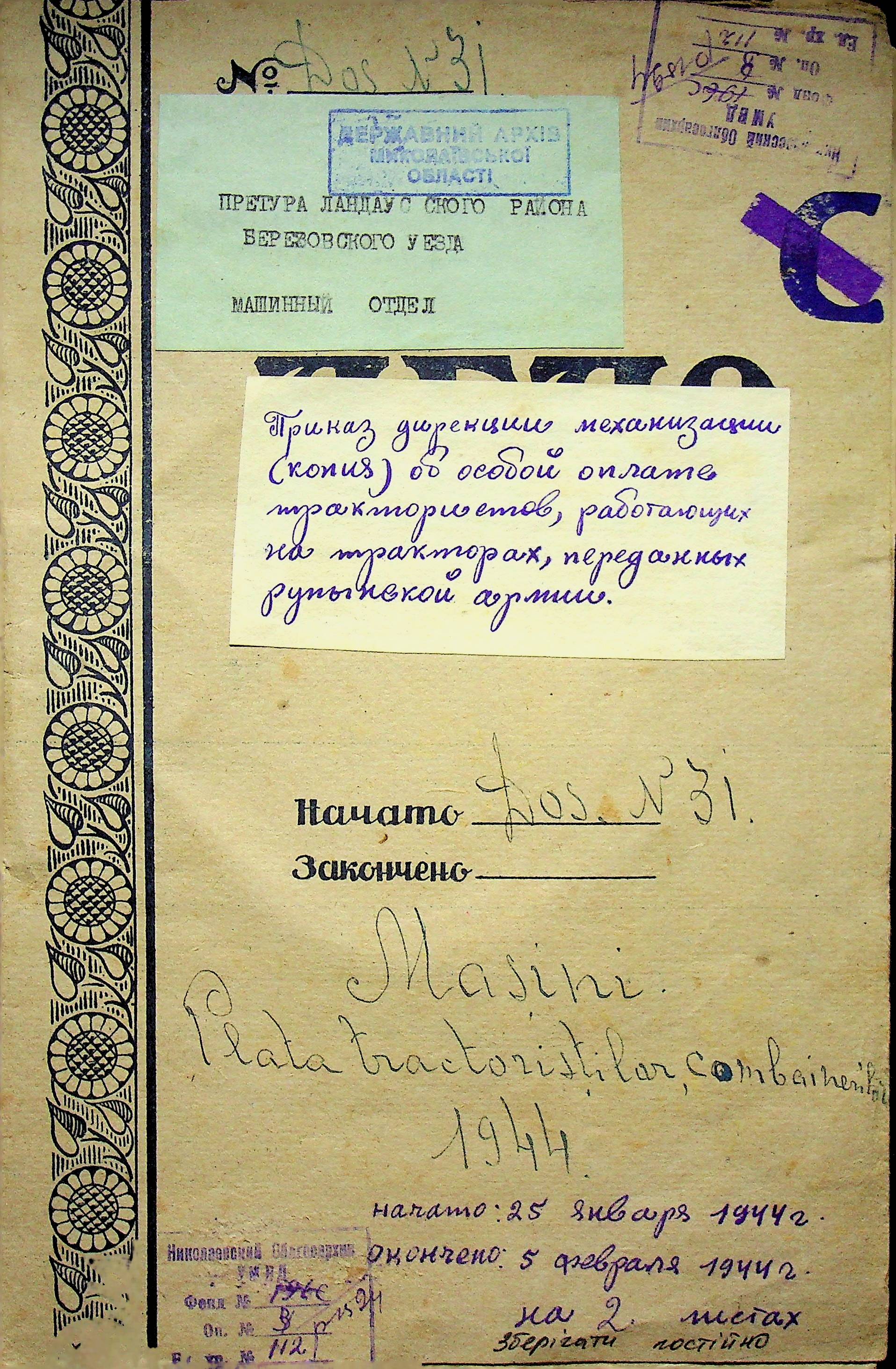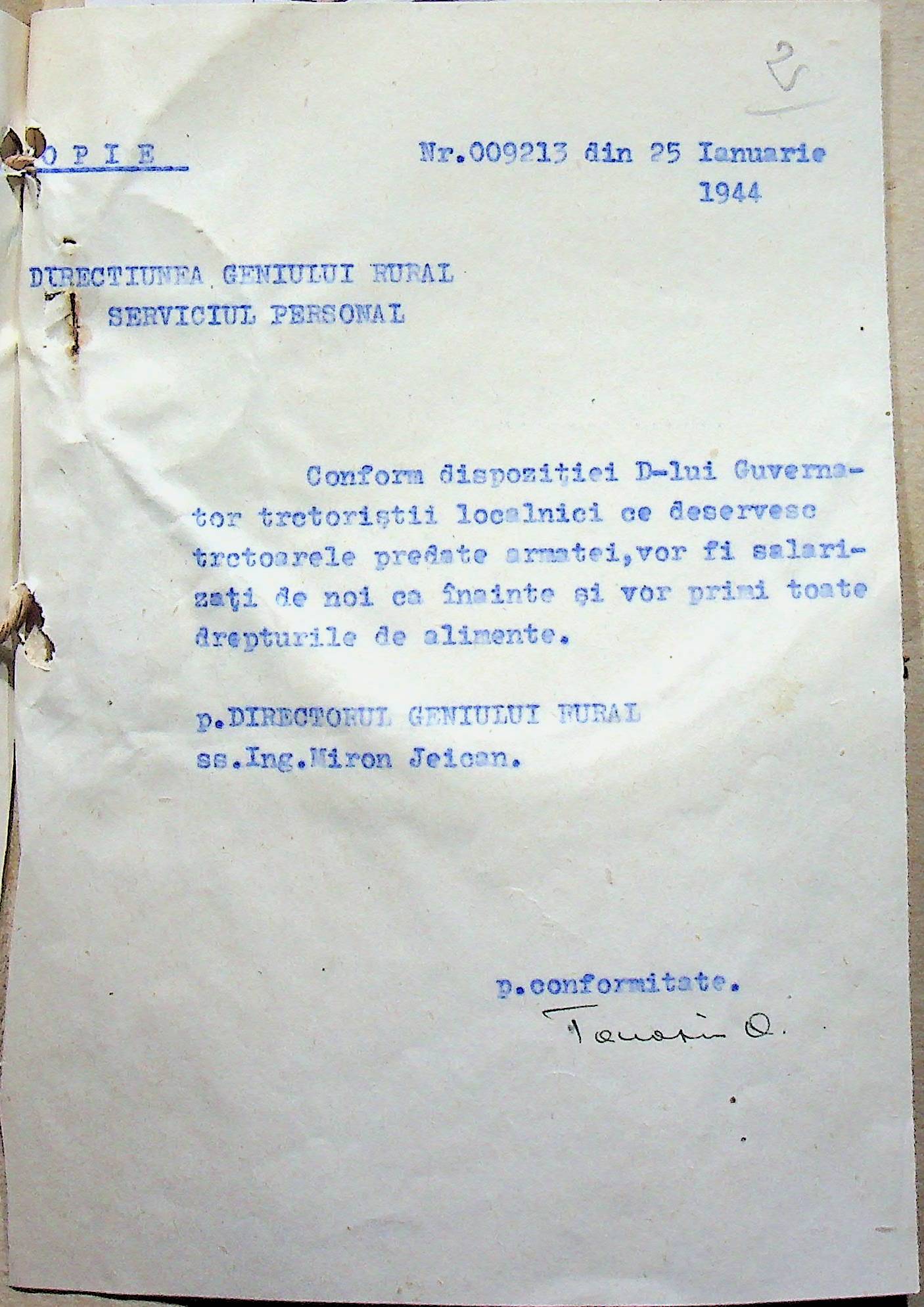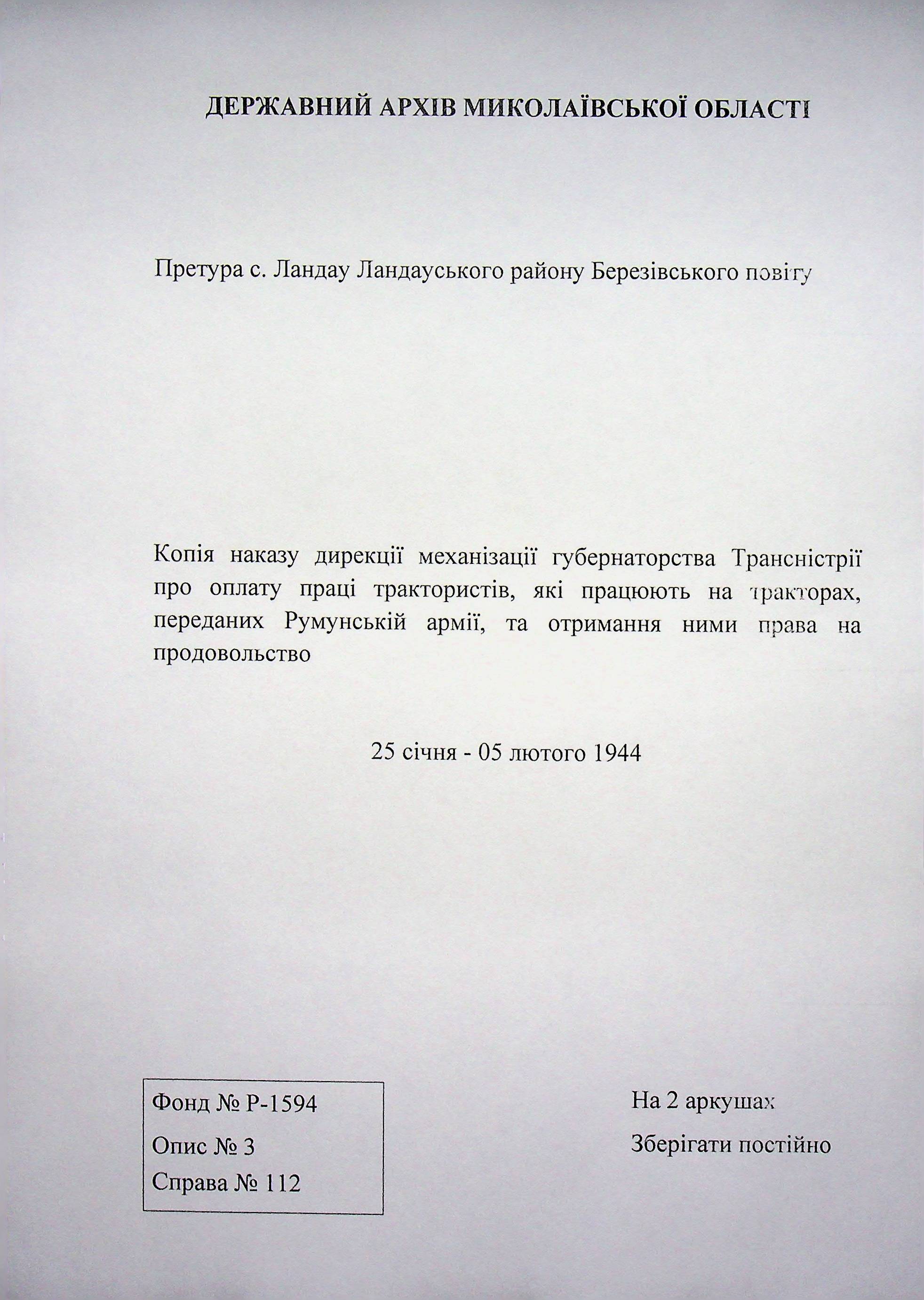 • • • • Справа № 112 Копія наказу дирекції механізації губернаторства Трансністрії про оплату праці трактористів, які працюють на тракторах, переданих Румунській армії, та отримання ними права на продовольство