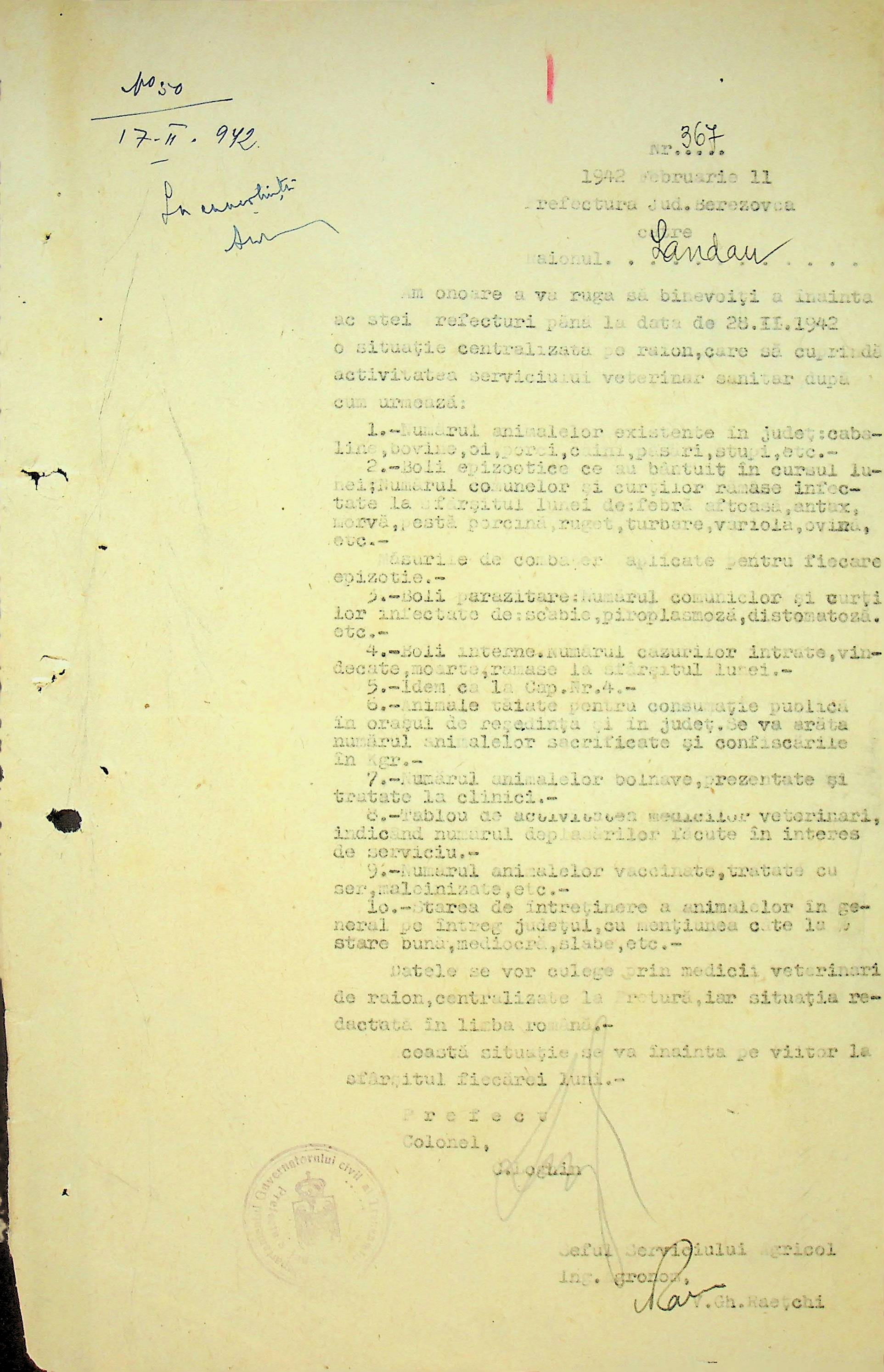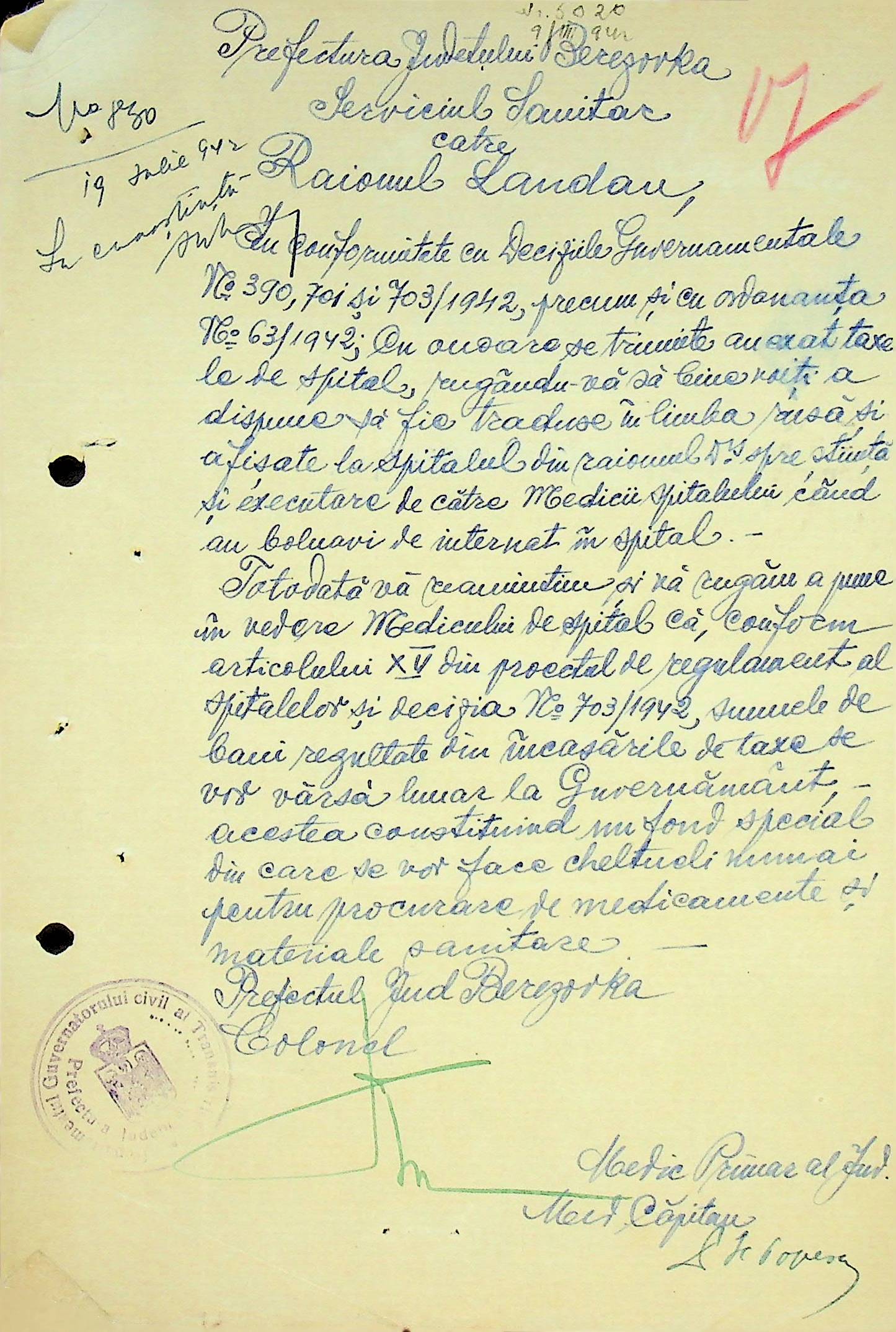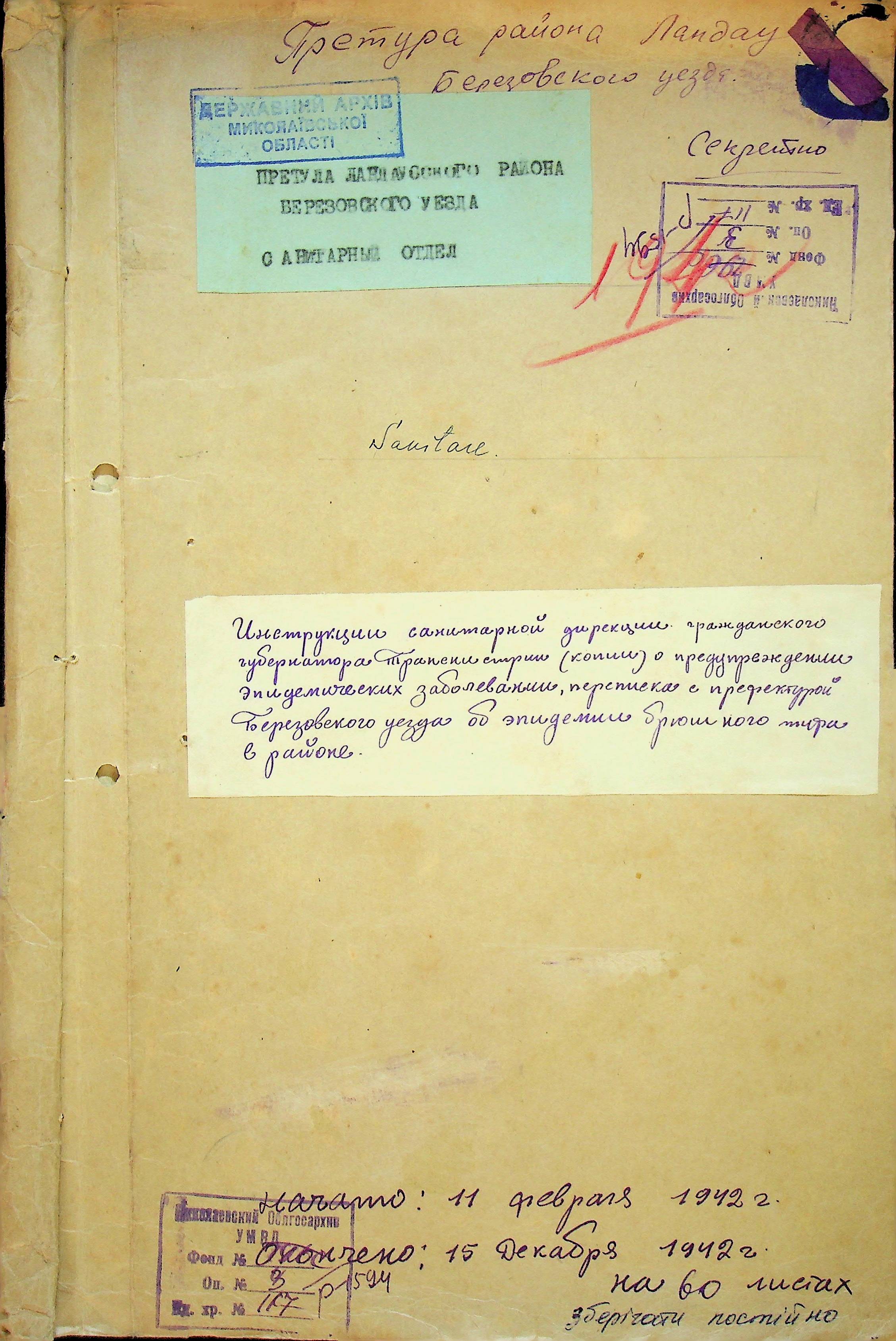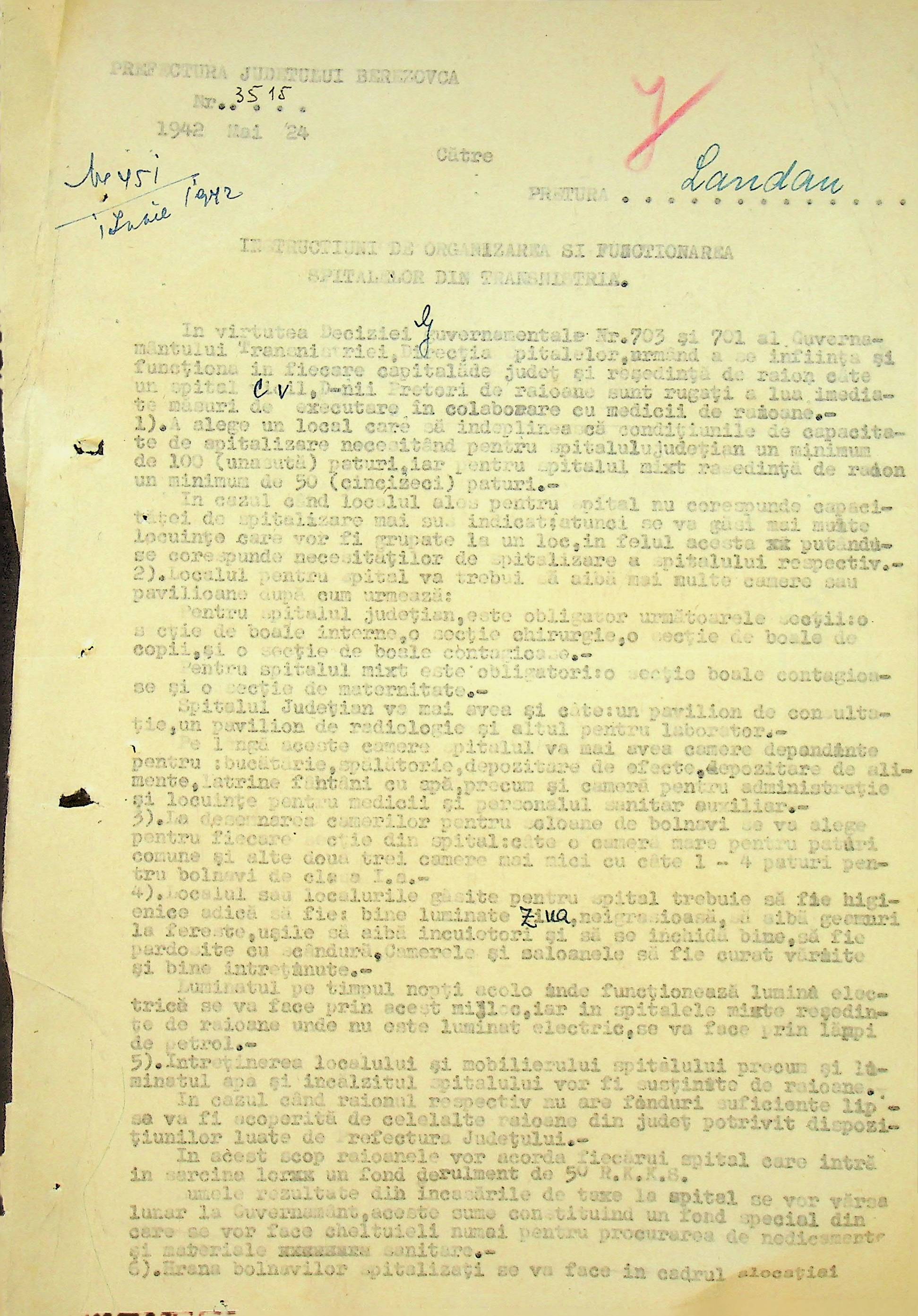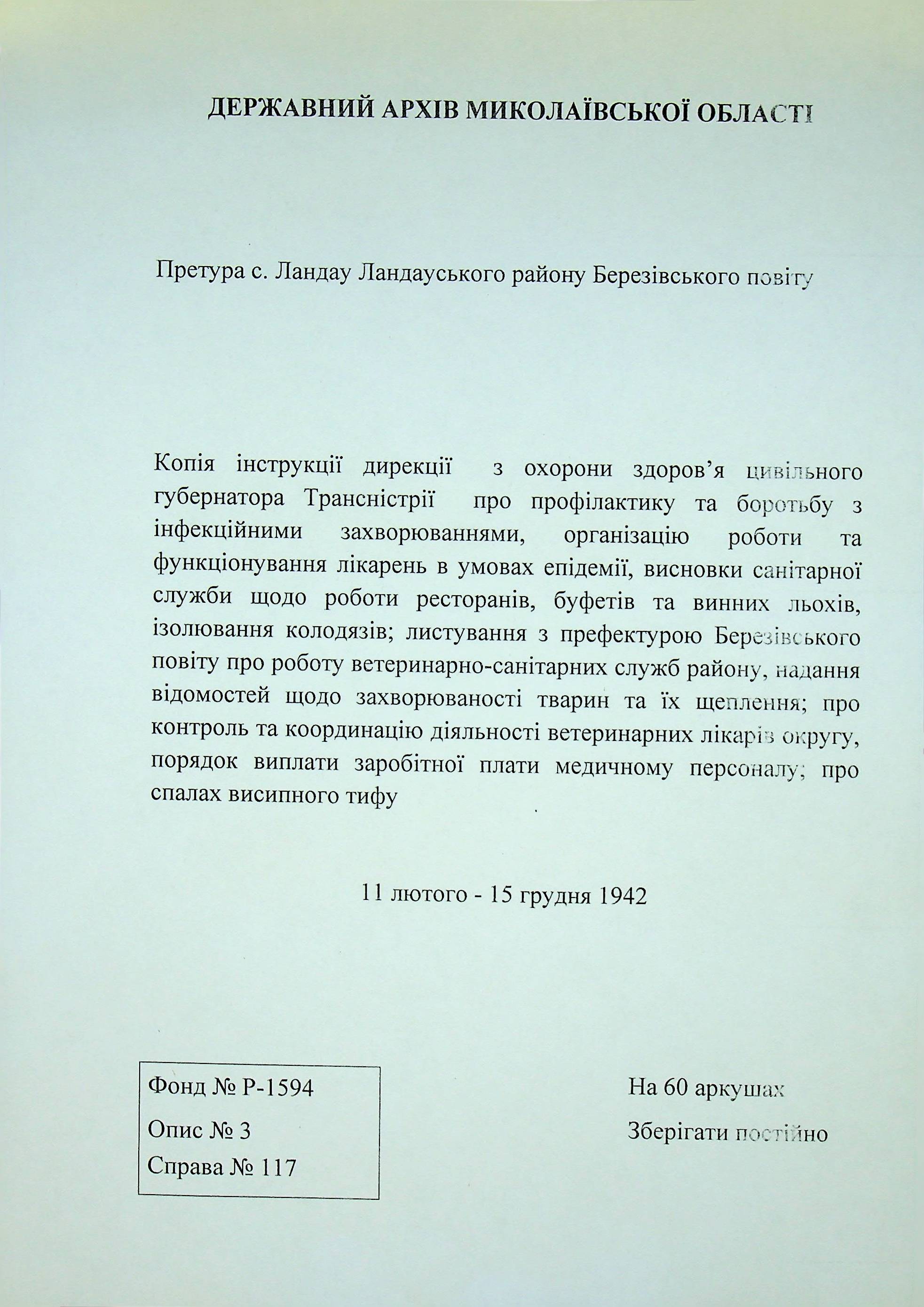 • • • • Справа № 117 Копія інструкції дирекції з охорони здоров’я цивільного губернатора Трансністрії про профілактику та боротьбу з інфекційними захворюваннями, організацію роботи та функціонування лікарень в умовах епідемії, висновки санітарної служби щодо роботи ресторанів, буфетів та винних льохів, ізолювання колодязів; листування з префектурою Березівського повіту про роботу ветеринарно-санітарних служб району, надання відомостей щодо захворюваності тварин та їх щеплення; про контроль та координацію діяльності ветеринарних лікарів округу, порядок виплати заробітної плати медичному персоналу; про спалах висипного тифу
