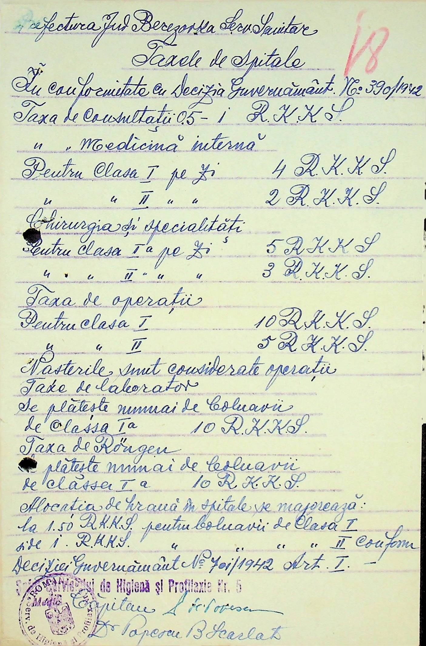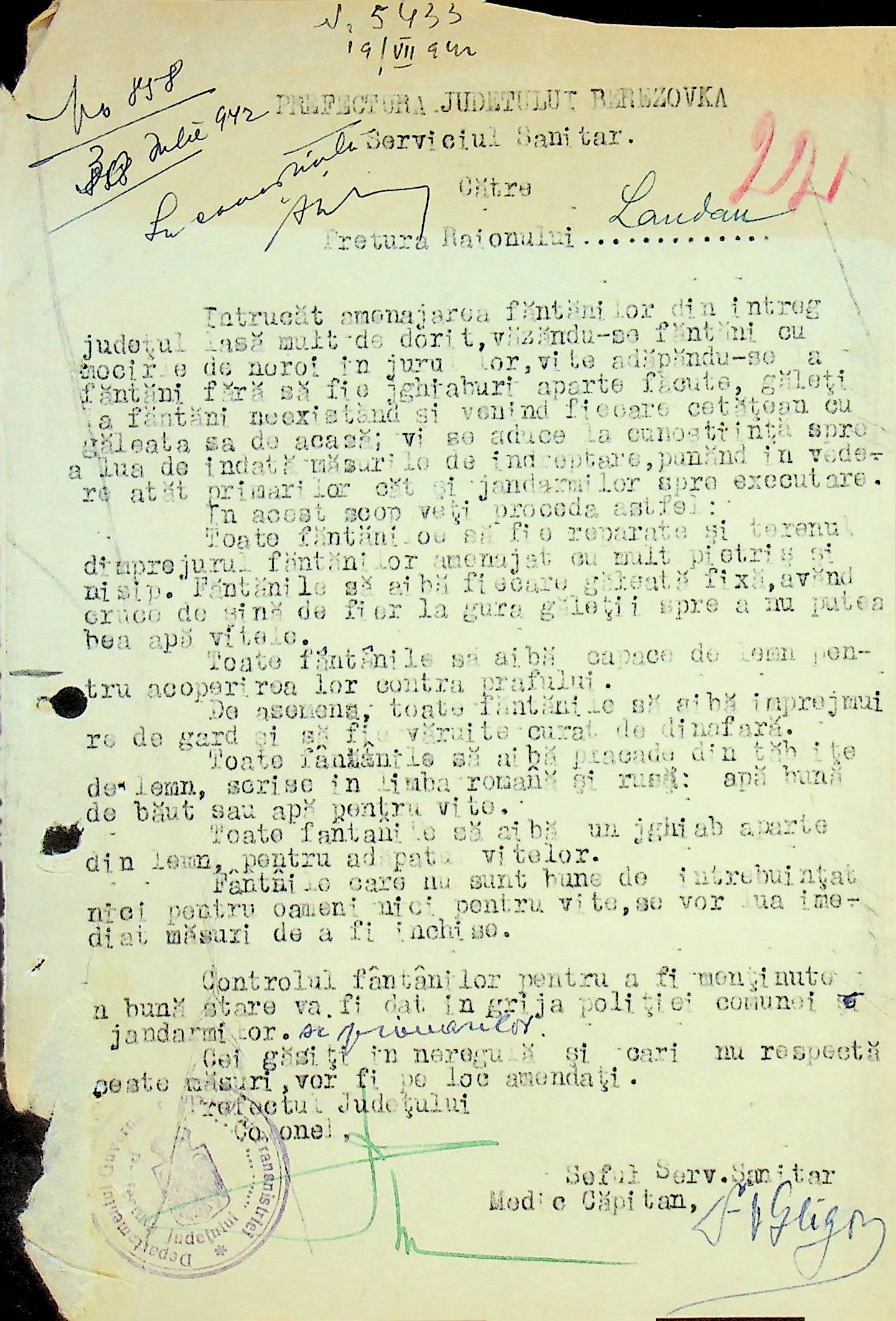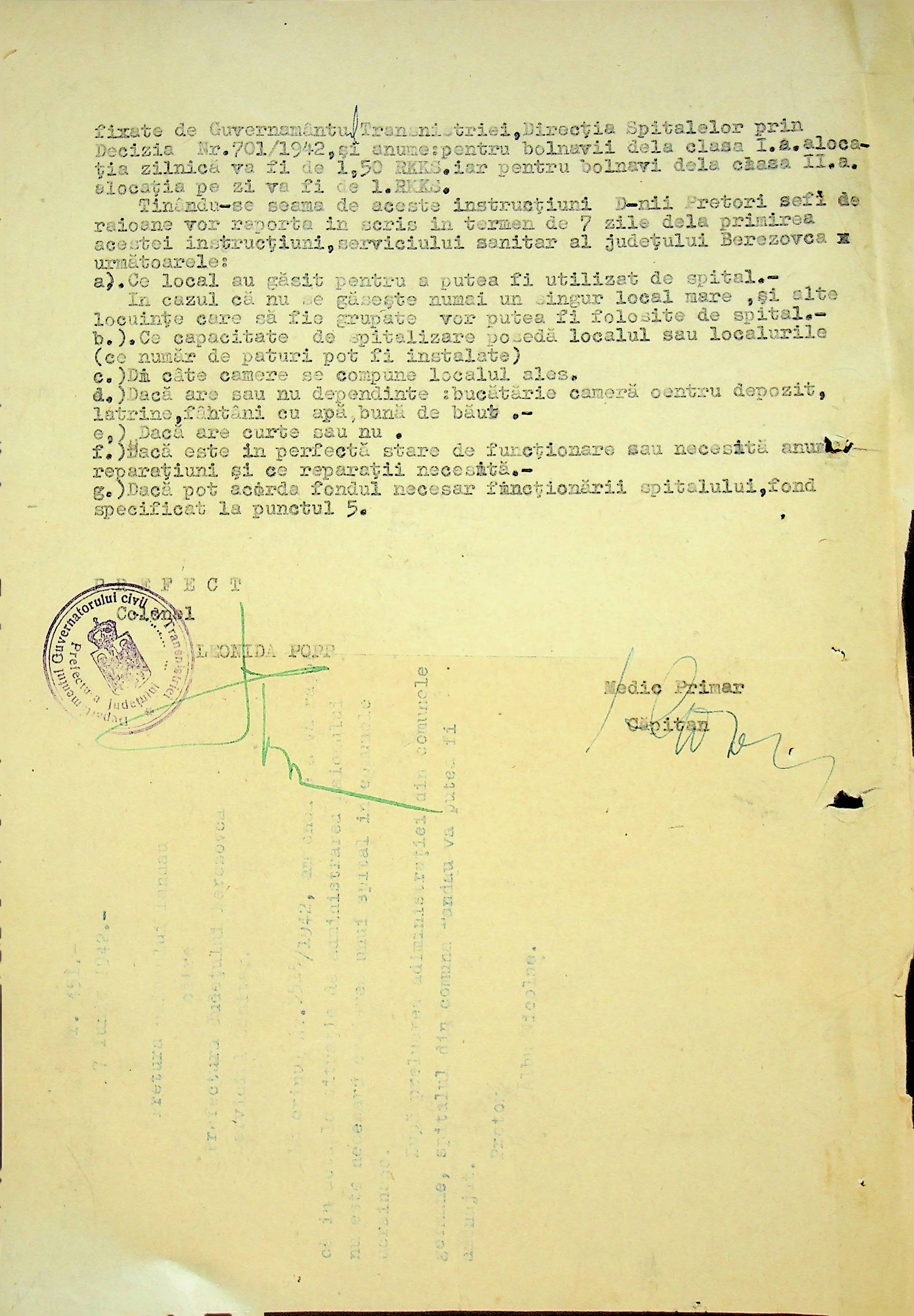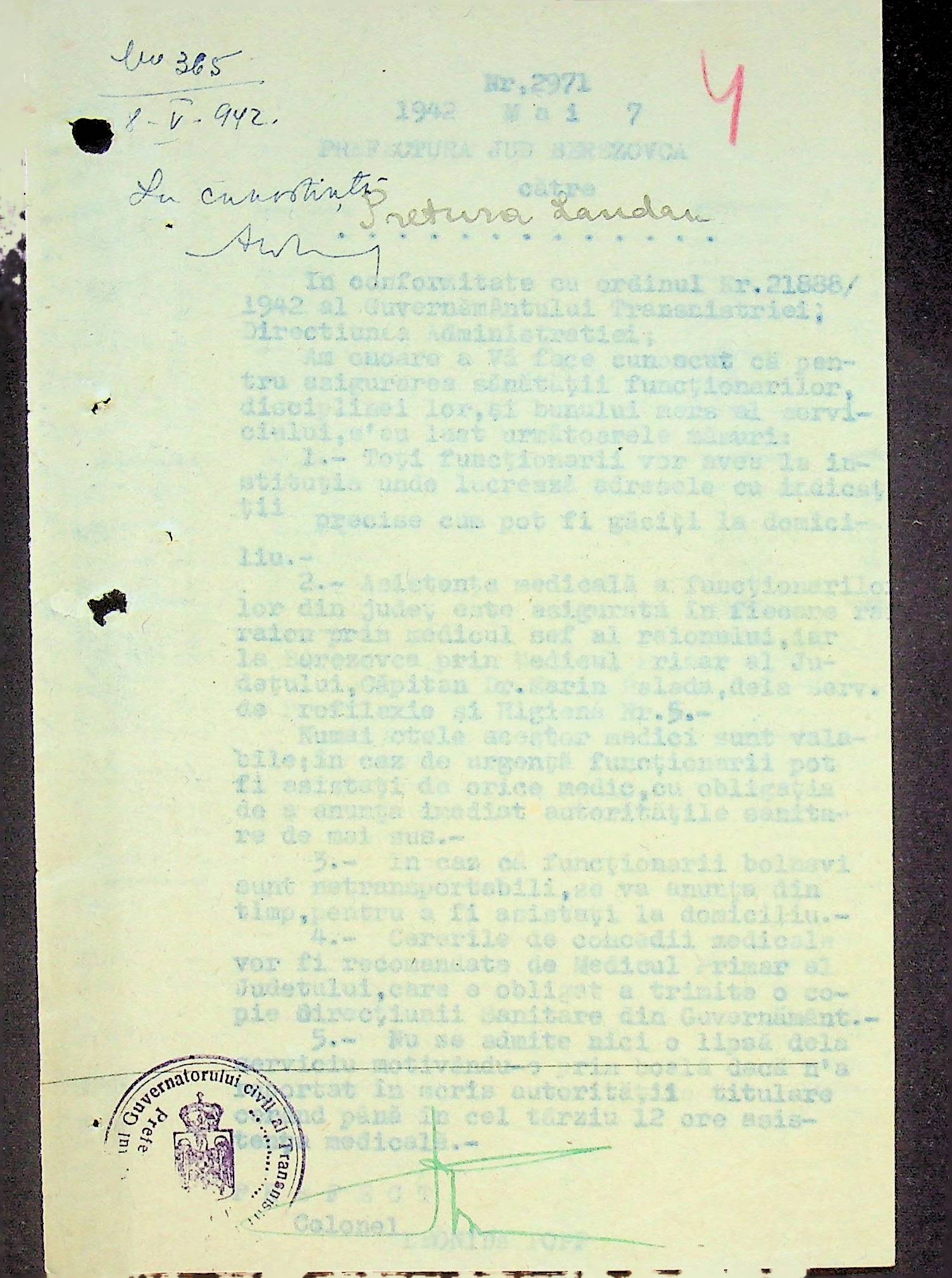 • • • • Справа № 117 Копія інструкції дирекції з охорони здоров’я цивільного губернатора Трансністрії про профілактику та боротьбу з інфекційними захворюваннями, організацію роботи та функціонування лікарень в умовах епідемії, висновки санітарної служби щодо роботи ресторанів, буфетів та винних льохів, ізолювання колодязів; листування з префектурою Березівського повіту про роботу ветеринарно-санітарних служб району, надання відомостей щодо захворюваності тварин та їх щеплення; про контроль та координацію діяльності ветеринарних лікарів округу, порядок виплати заробітної плати медичному персоналу; про спалах висипного тифу